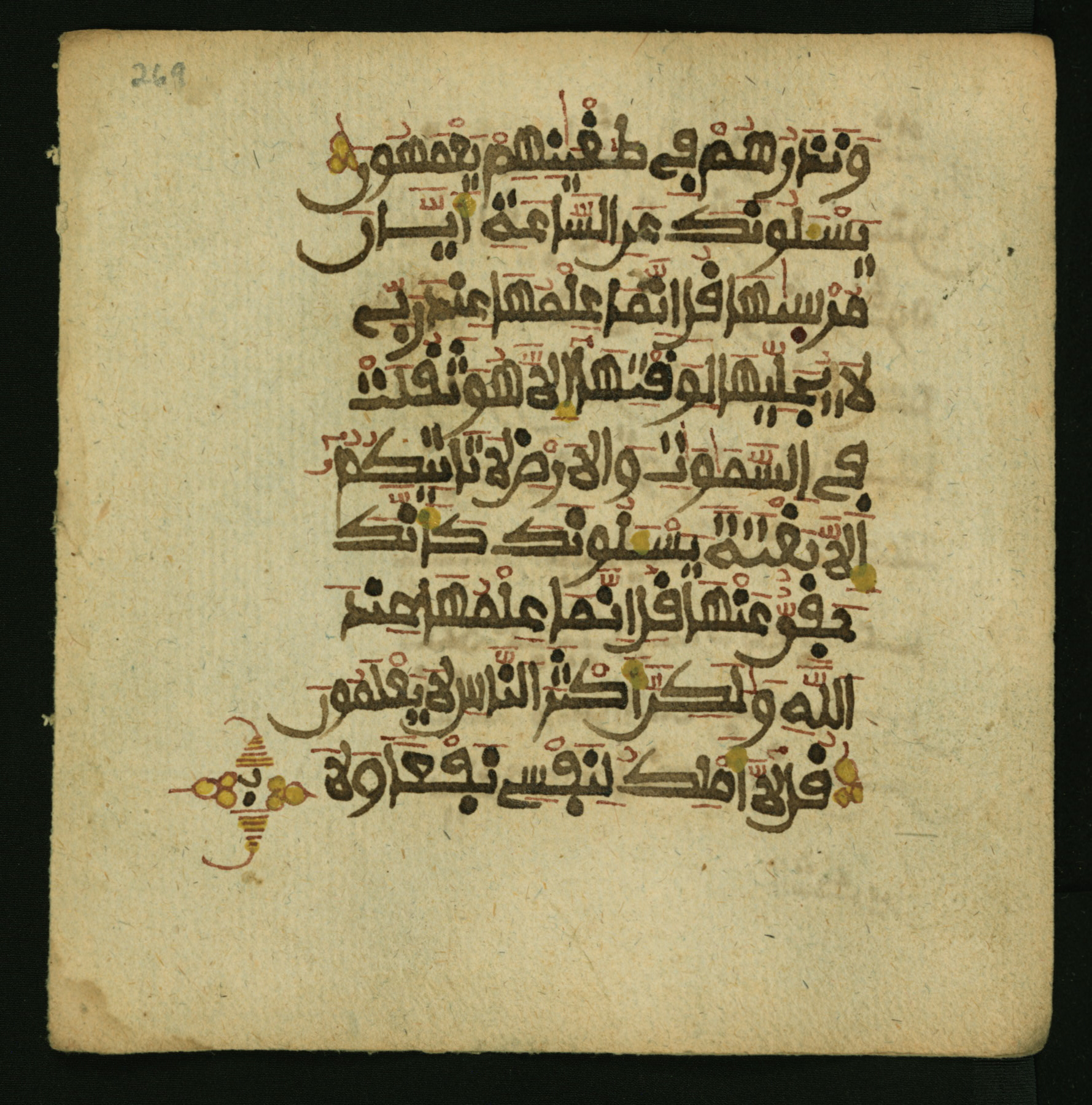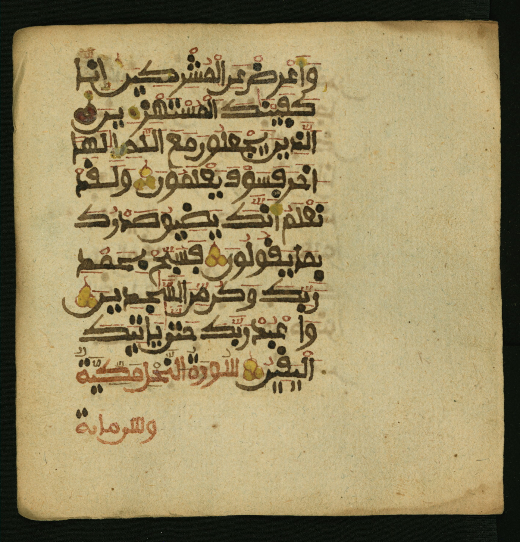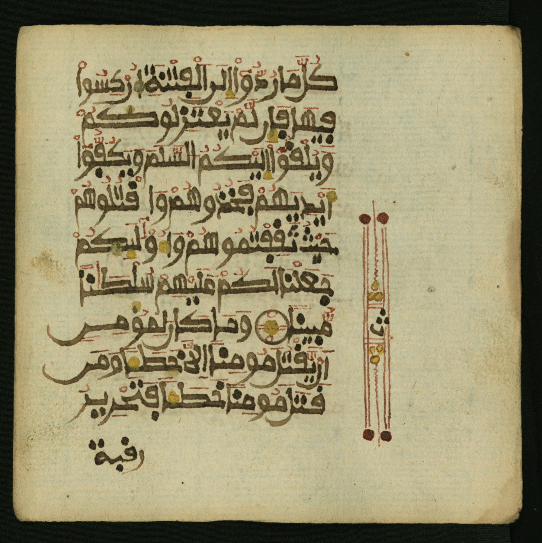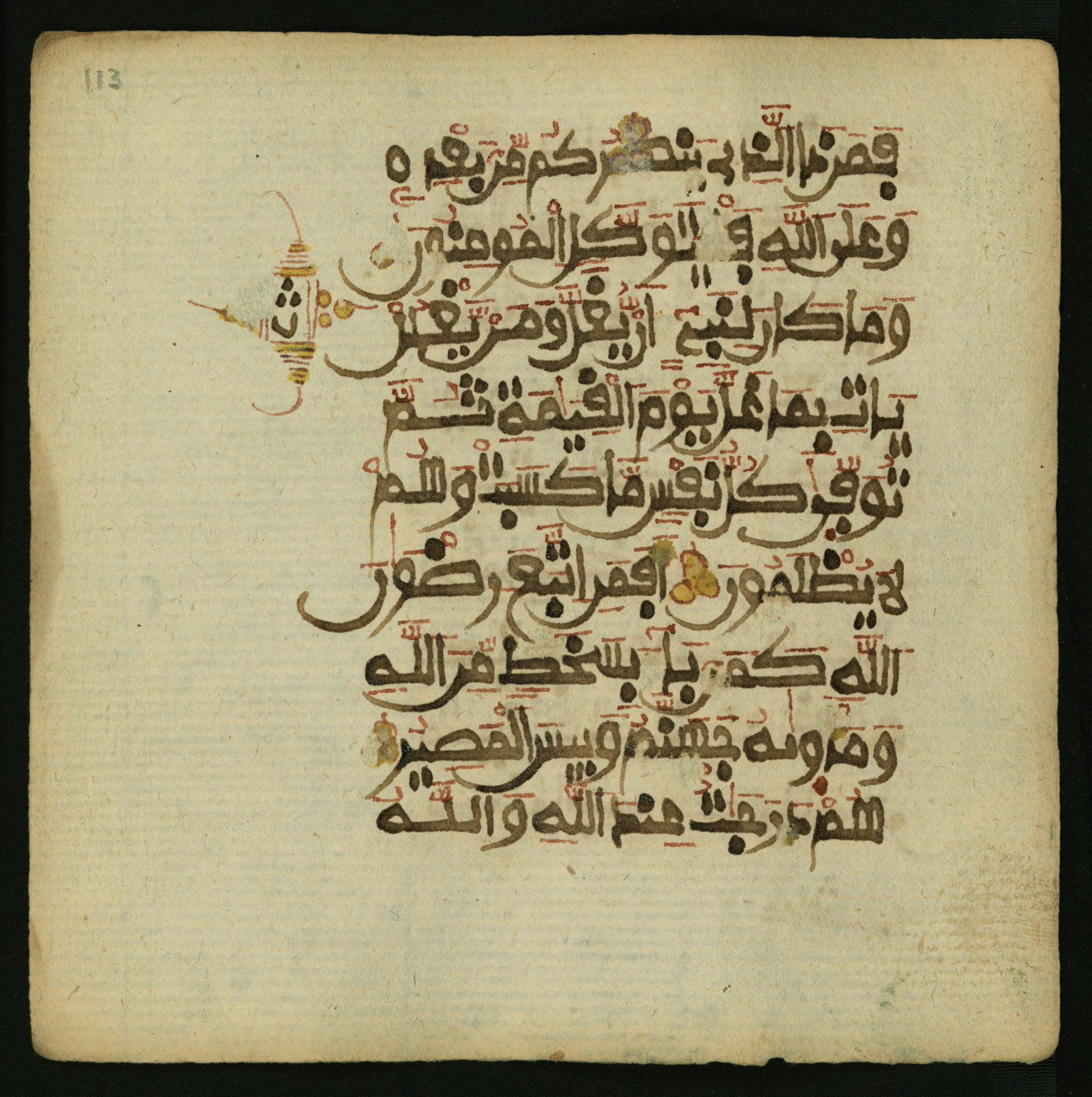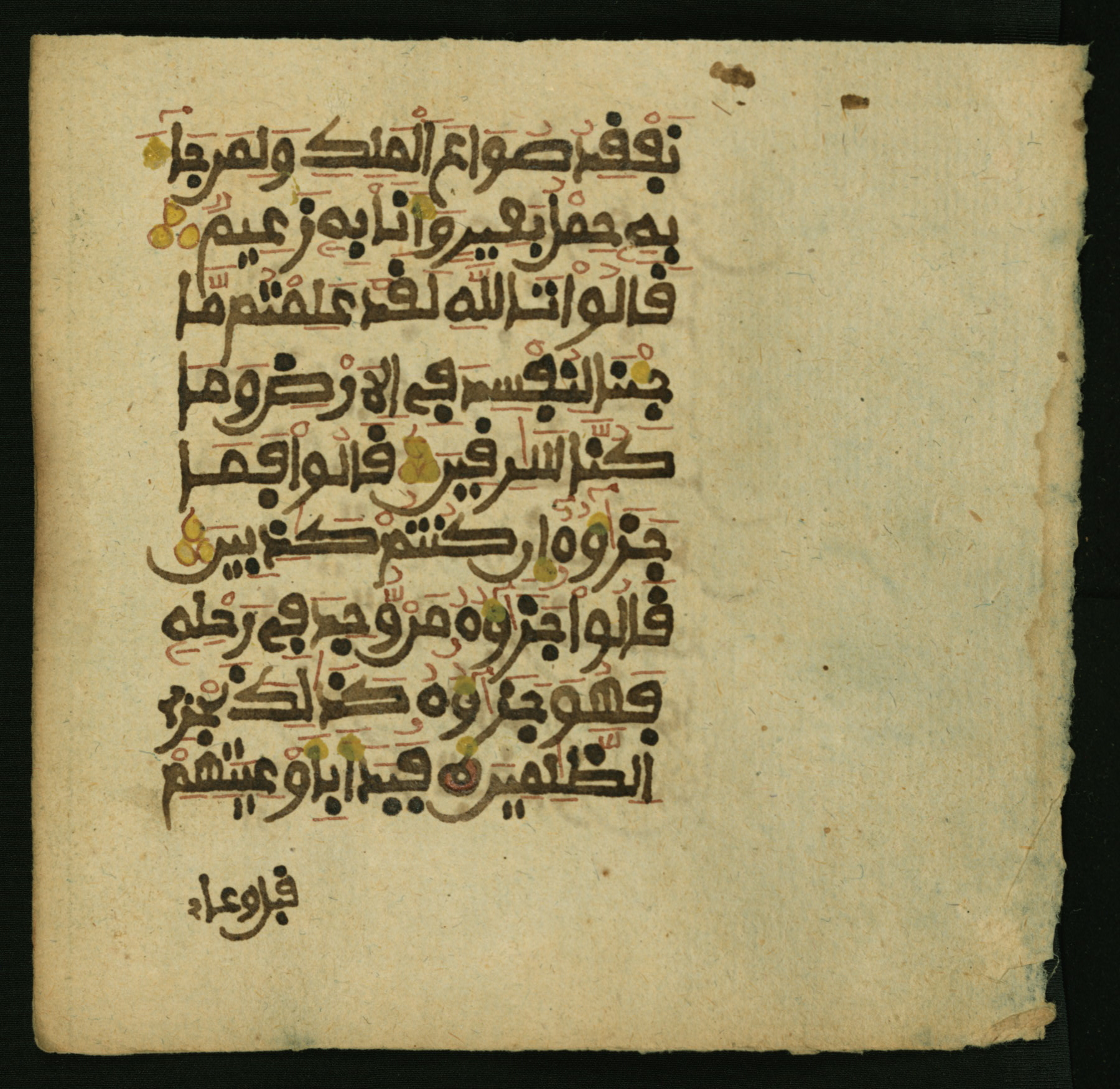 This square-format manuscript is volume 1, containing chapters 1-18 (Sūrat al-fātiḥah through Sūrat al-kahf), of an illuminated two-volume Qur'an produced in Sub-Saharan (West) Africa in the thirteenth century AH / nineteenth CE. The text is written in Sūdānī script in dark brown ink with vocalization in red on loose leaves. Chapter headings are in reddish-brown ink. Three yellow dots outlined in red arranged in a triangular form separate verses. Polychrome circular medallions as well as square and rectangular devices in a variety of patterns and colors mark textual divisions. The leaves of the text are organized between two decorated boards with geometric compositions. The pages and boards are housed in a leather pouch (satchel).