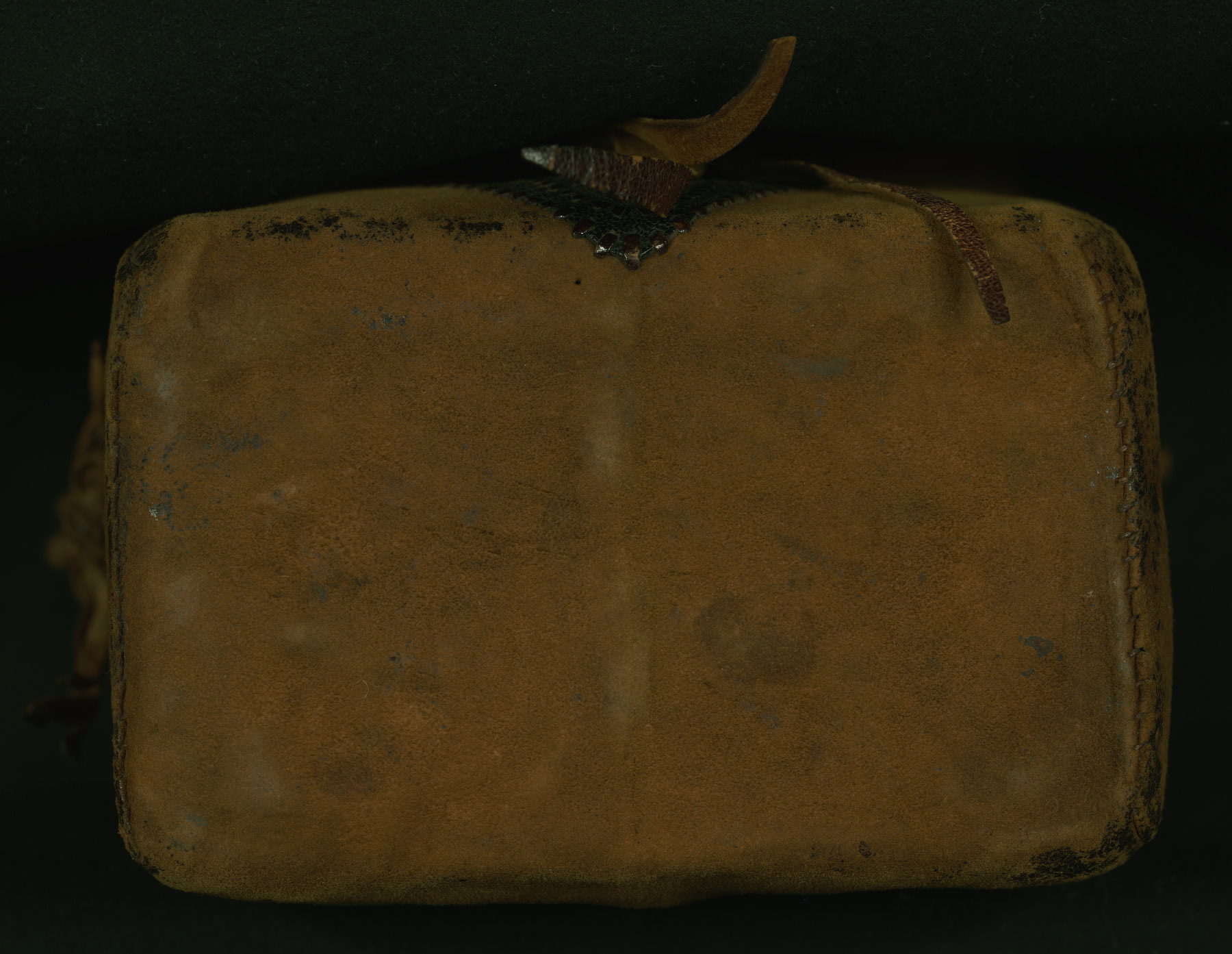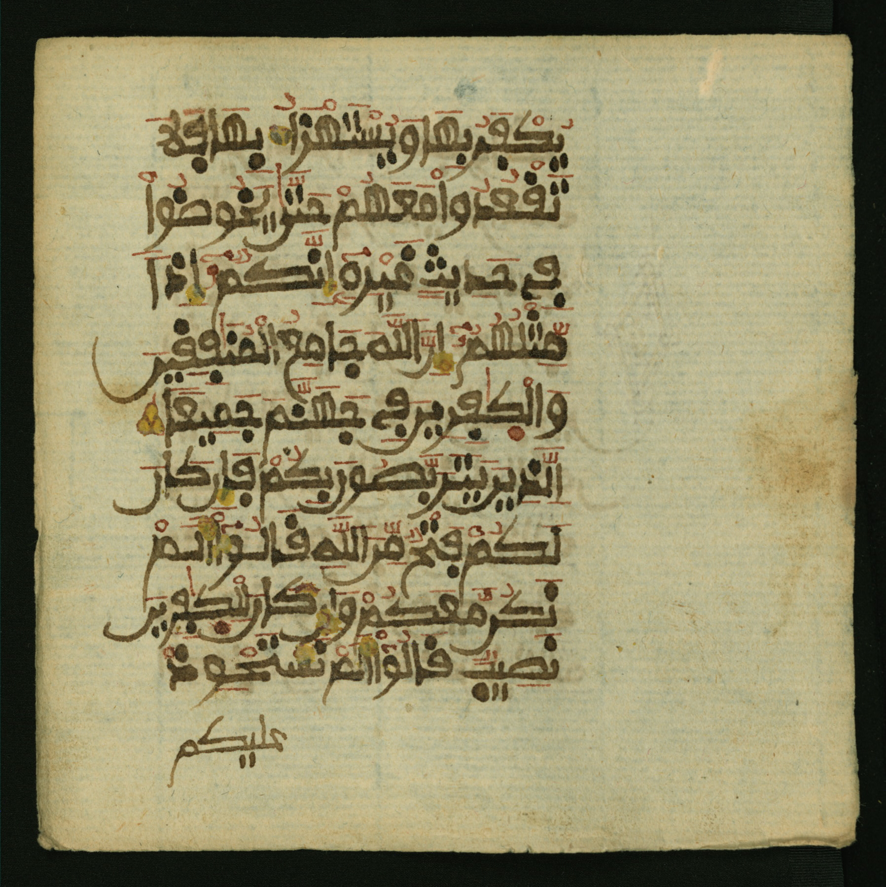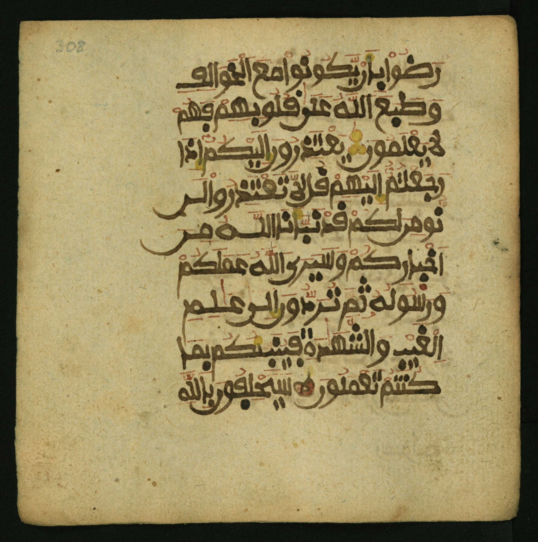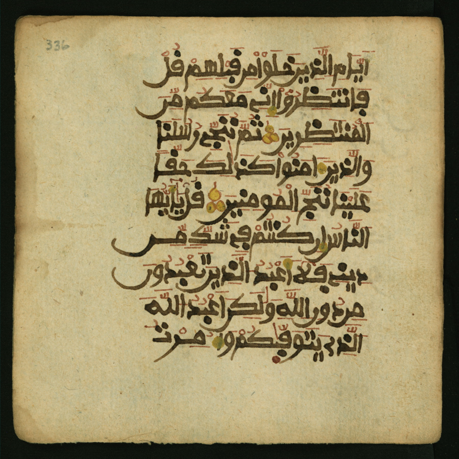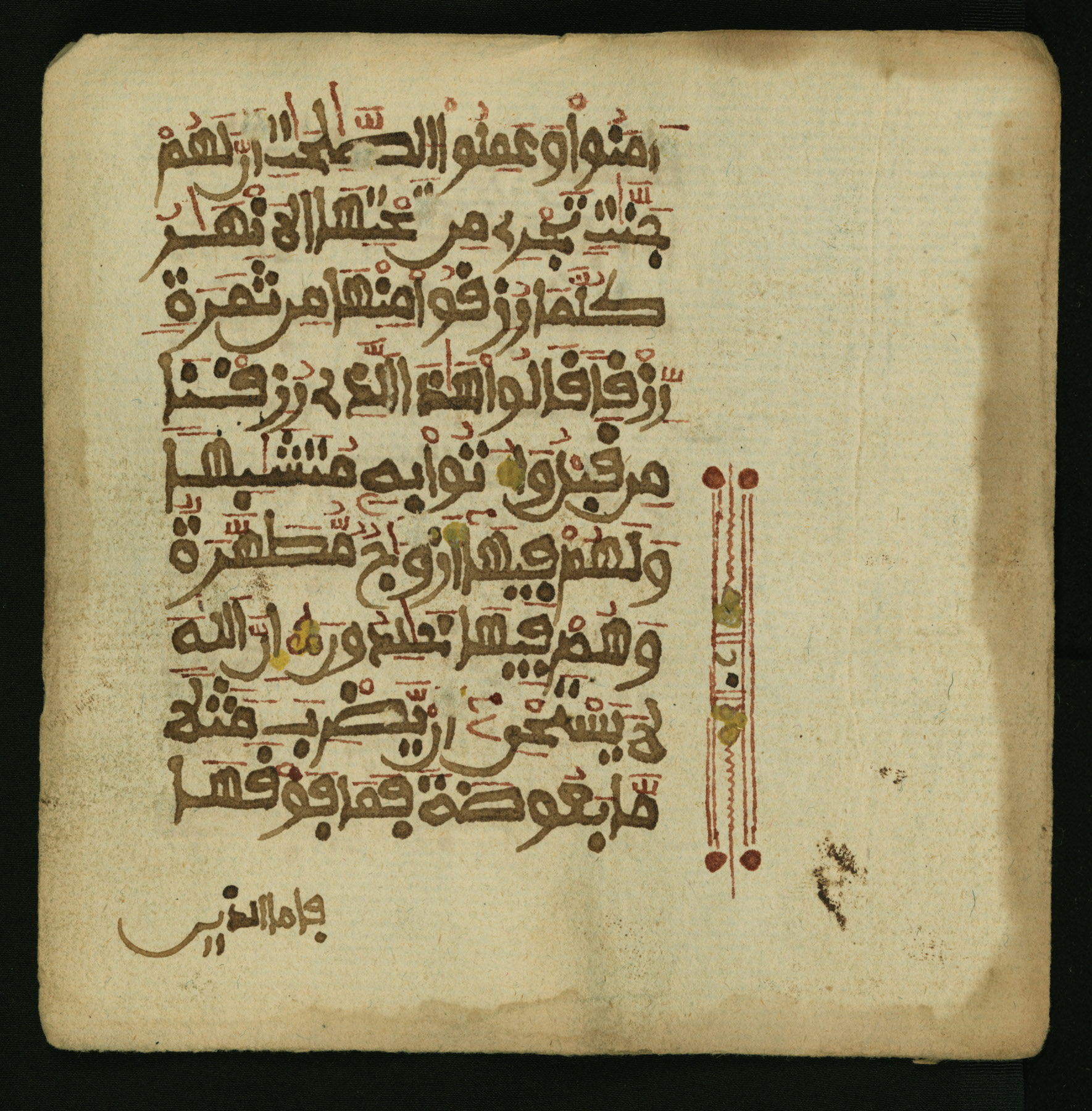 This square-format manuscript is volume 1, containing chapters 1-18 (Sūrat al-fātiḥah through Sūrat al-kahf), of an illuminated two-volume Qur'an produced in Sub-Saharan (West) Africa in the thirteenth century AH / nineteenth CE. The text is written in Sūdānī script in dark brown ink with vocalization in red on loose leaves. Chapter headings are in reddish-brown ink. Three yellow dots outlined in red arranged in a triangular form separate verses. Polychrome circular medallions as well as square and rectangular devices in a variety of patterns and colors mark textual divisions. The leaves of the text are organized between two decorated boards with geometric compositions. The pages and boards are housed in a leather pouch (satchel).