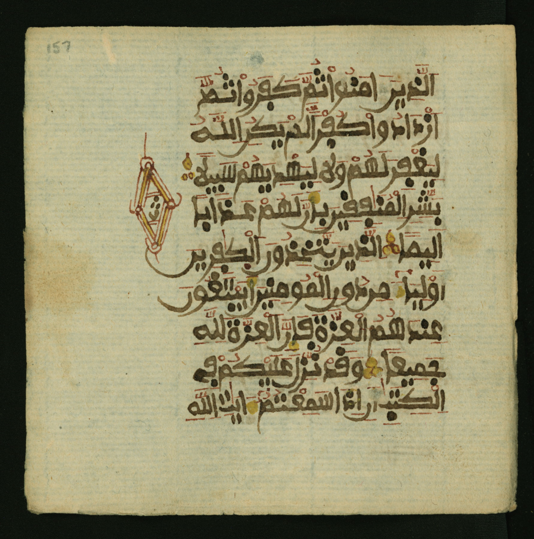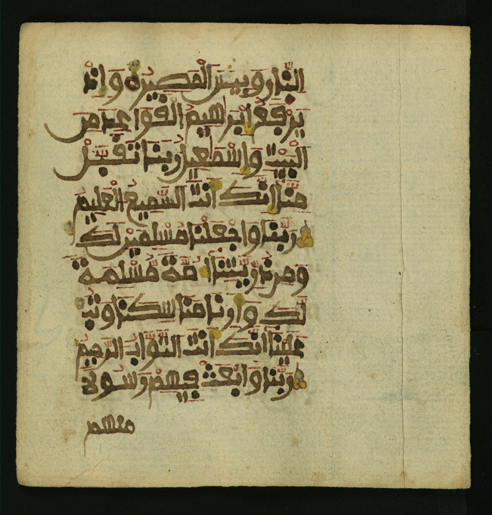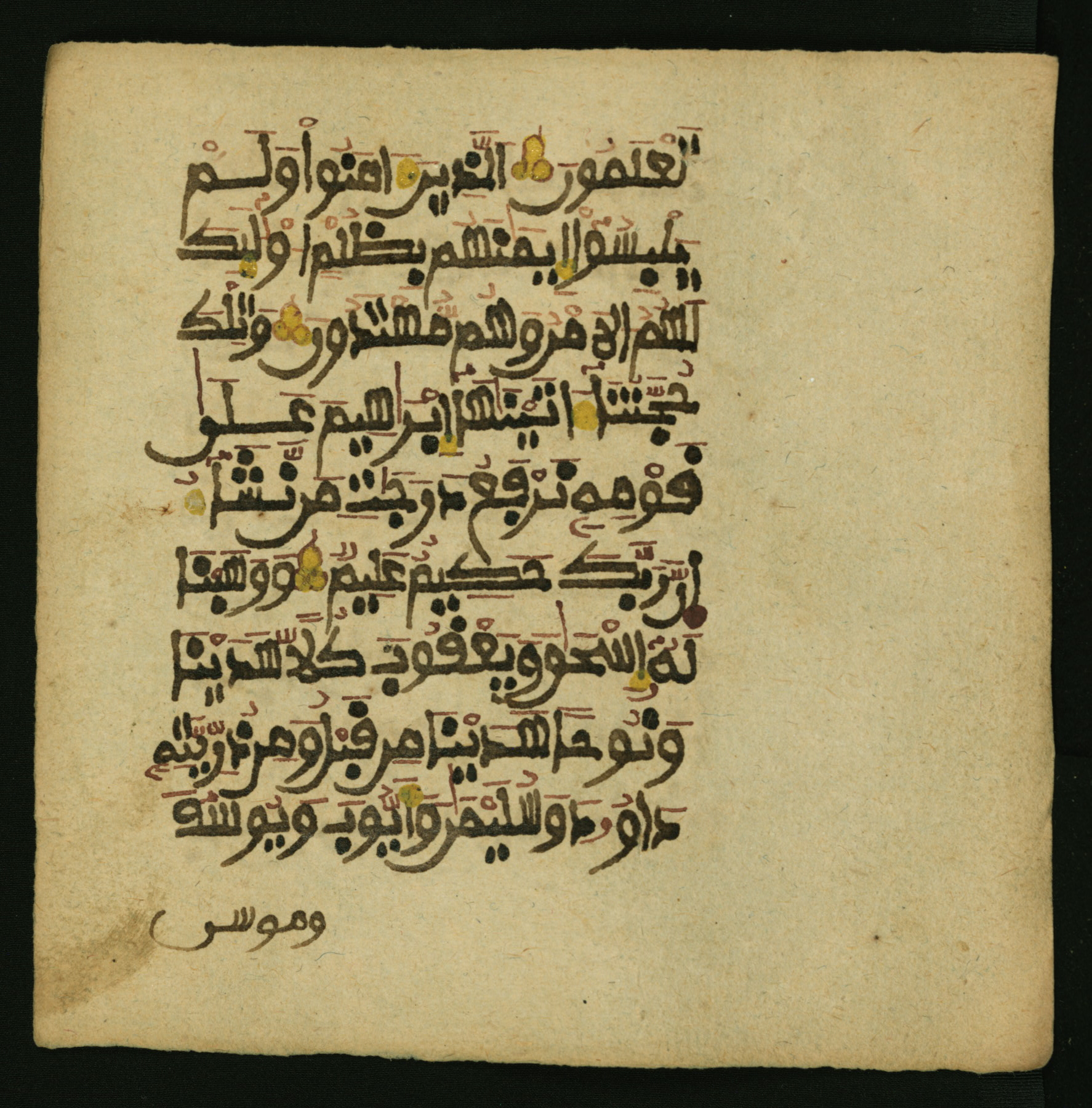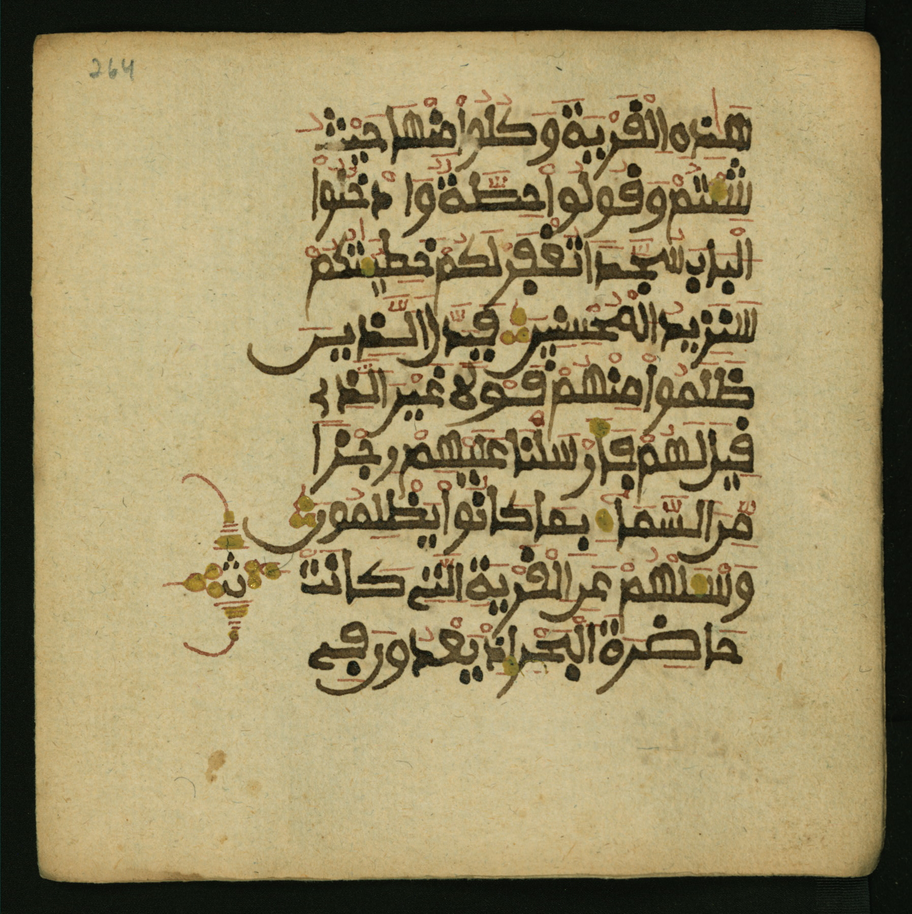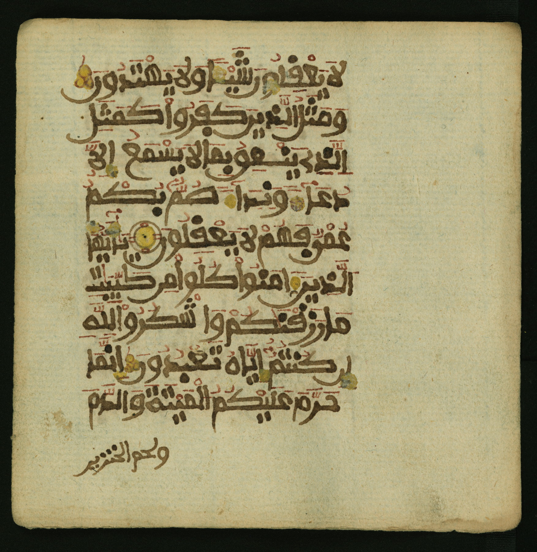 This square-format manuscript is volume 1, containing chapters 1-18 (Sūrat al-fātiḥah through Sūrat al-kahf), of an illuminated two-volume Qur'an produced in Sub-Saharan (West) Africa in the thirteenth century AH / nineteenth CE. The text is written in Sūdānī script in dark brown ink with vocalization in red on loose leaves. Chapter headings are in reddish-brown ink. Three yellow dots outlined in red arranged in a triangular form separate verses. Polychrome circular medallions as well as square and rectangular devices in a variety of patterns and colors mark textual divisions. The leaves of the text are organized between two decorated boards with geometric compositions. The pages and boards are housed in a leather pouch (satchel).