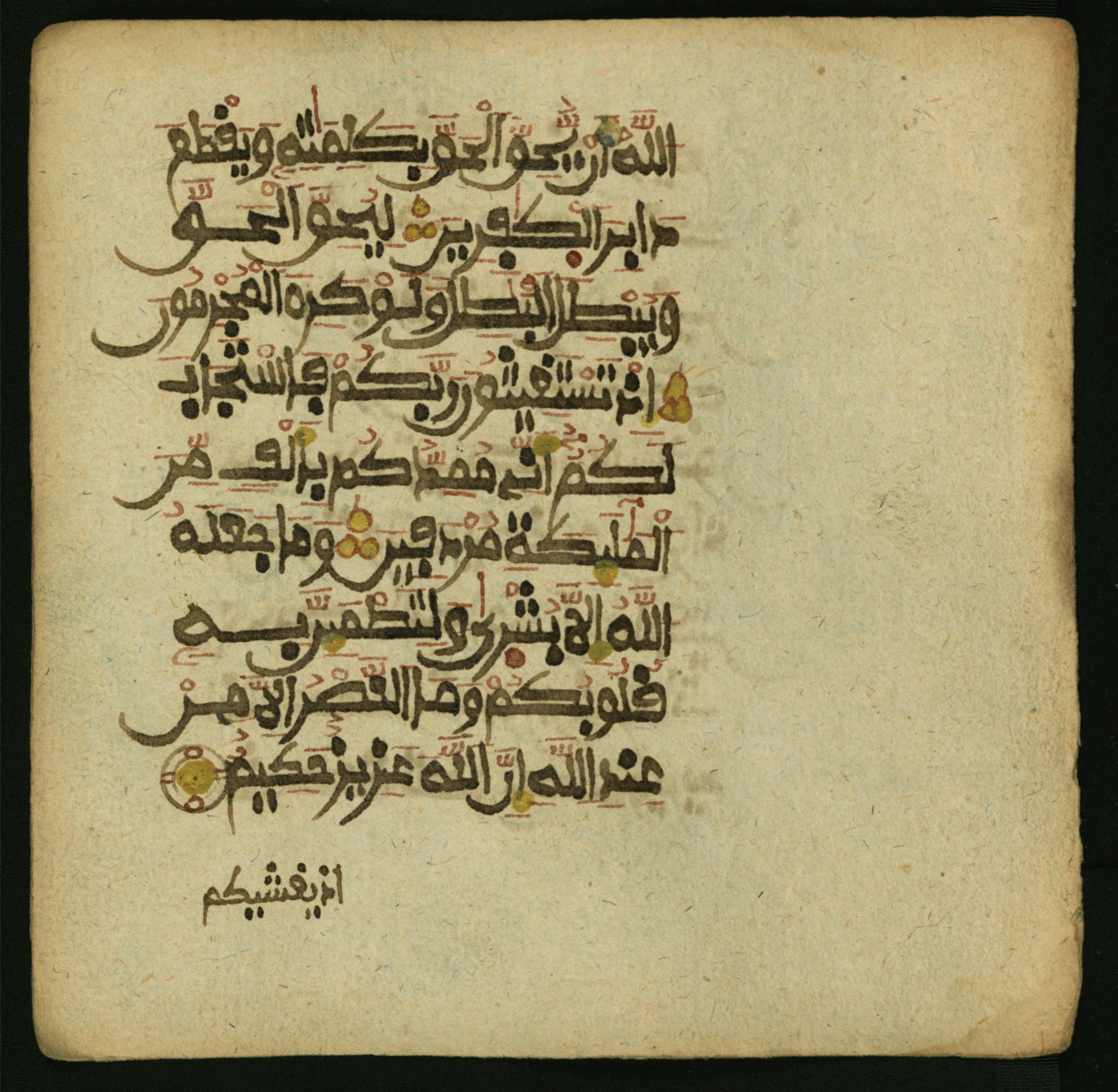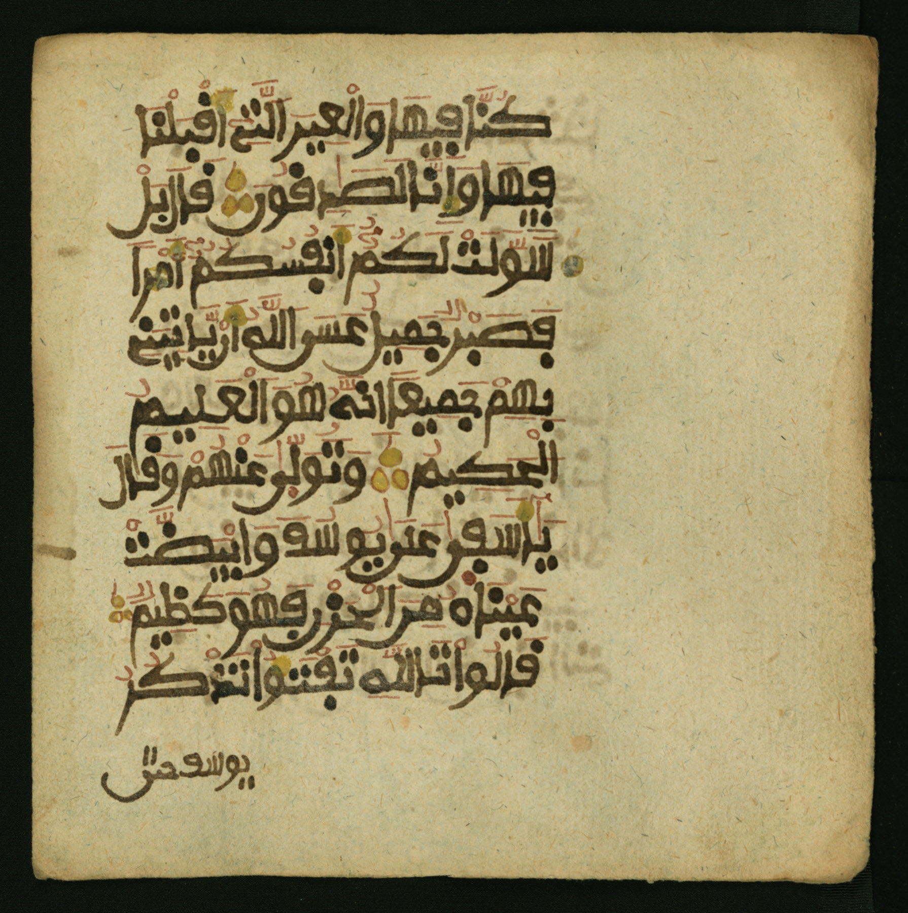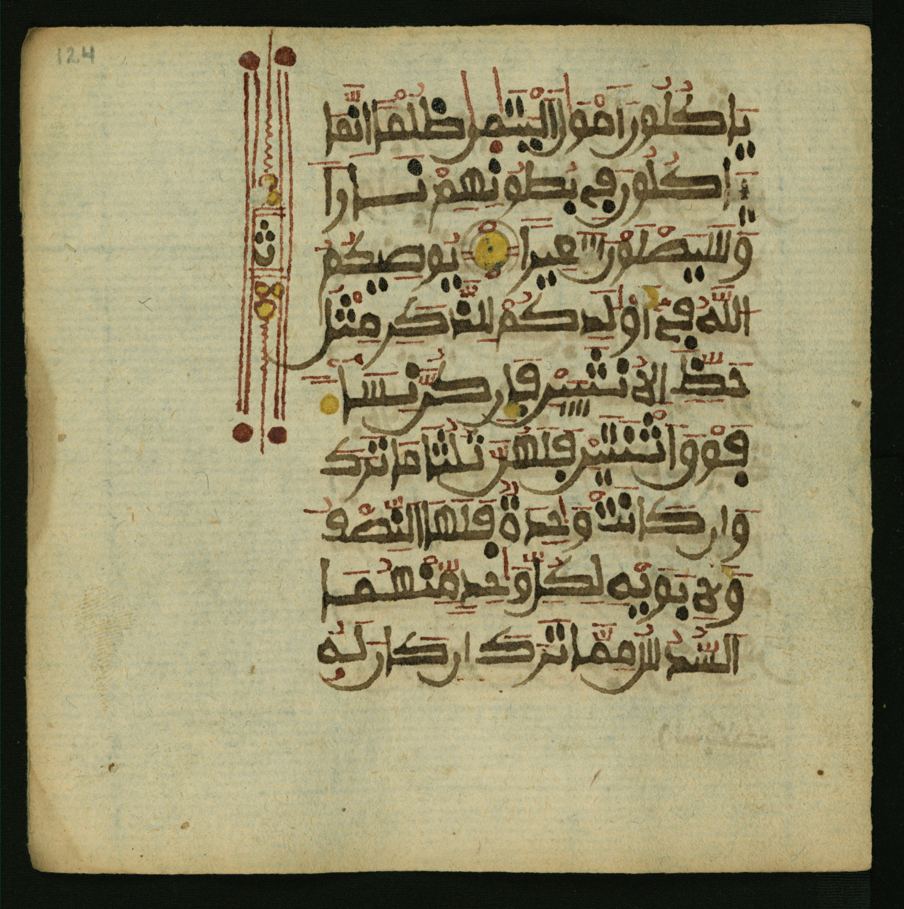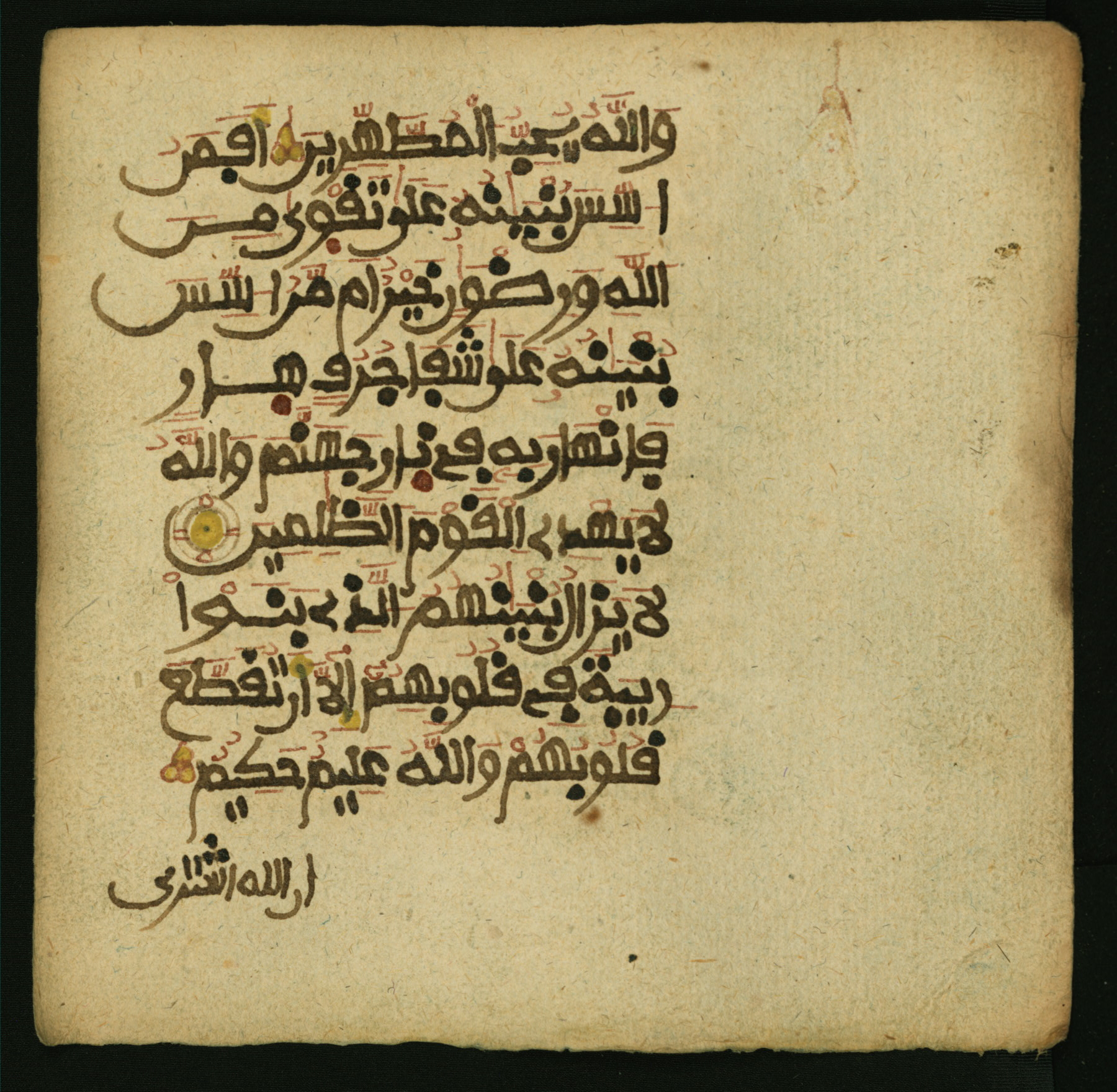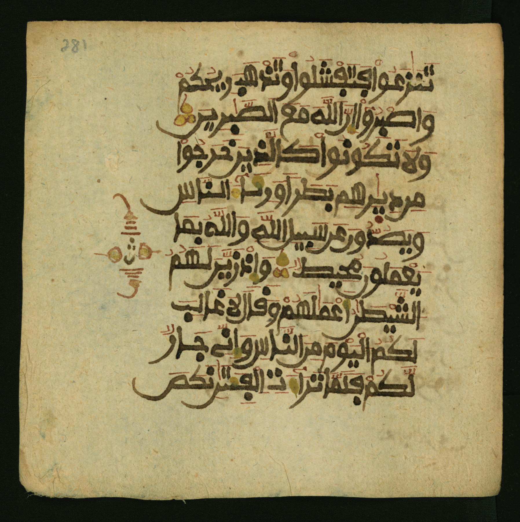 This square-format manuscript is volume 1, containing chapters 1-18 (Sūrat al-fātiḥah through Sūrat al-kahf), of an illuminated two-volume Qur'an produced in Sub-Saharan (West) Africa in the thirteenth century AH / nineteenth CE. The text is written in Sūdānī script in dark brown ink with vocalization in red on loose leaves. Chapter headings are in reddish-brown ink. Three yellow dots outlined in red arranged in a triangular form separate verses. Polychrome circular medallions as well as square and rectangular devices in a variety of patterns and colors mark textual divisions. The leaves of the text are organized between two decorated boards with geometric compositions. The pages and boards are housed in a leather pouch (satchel).