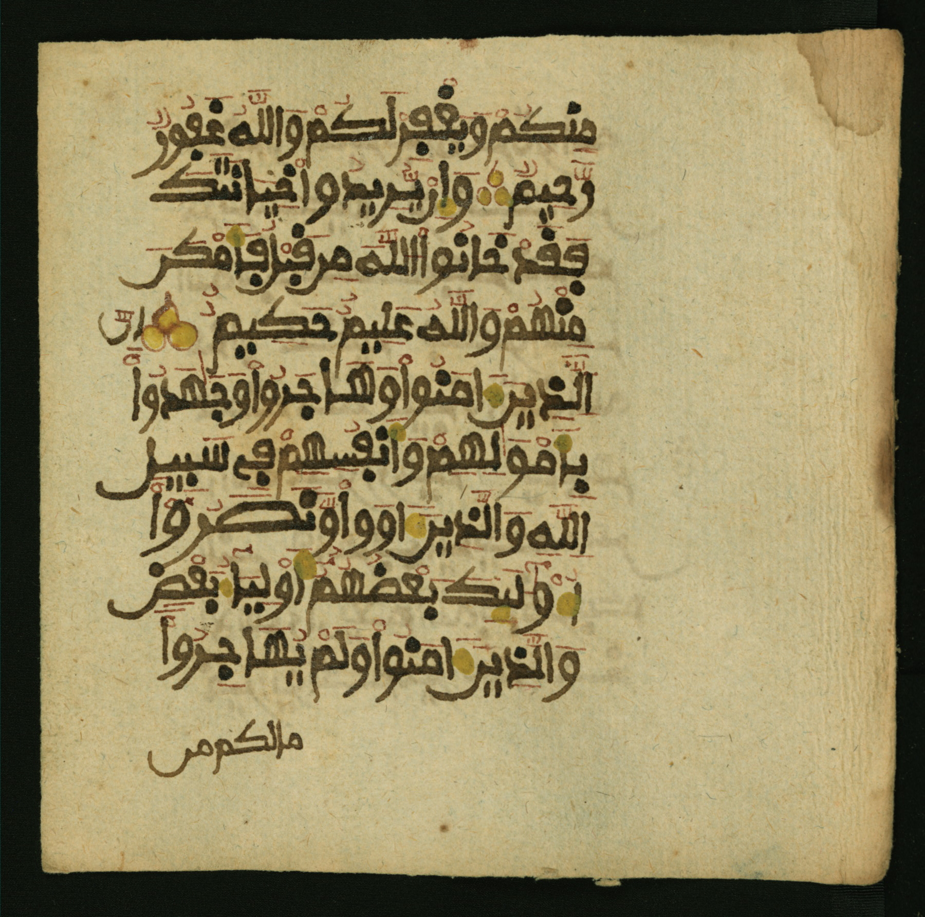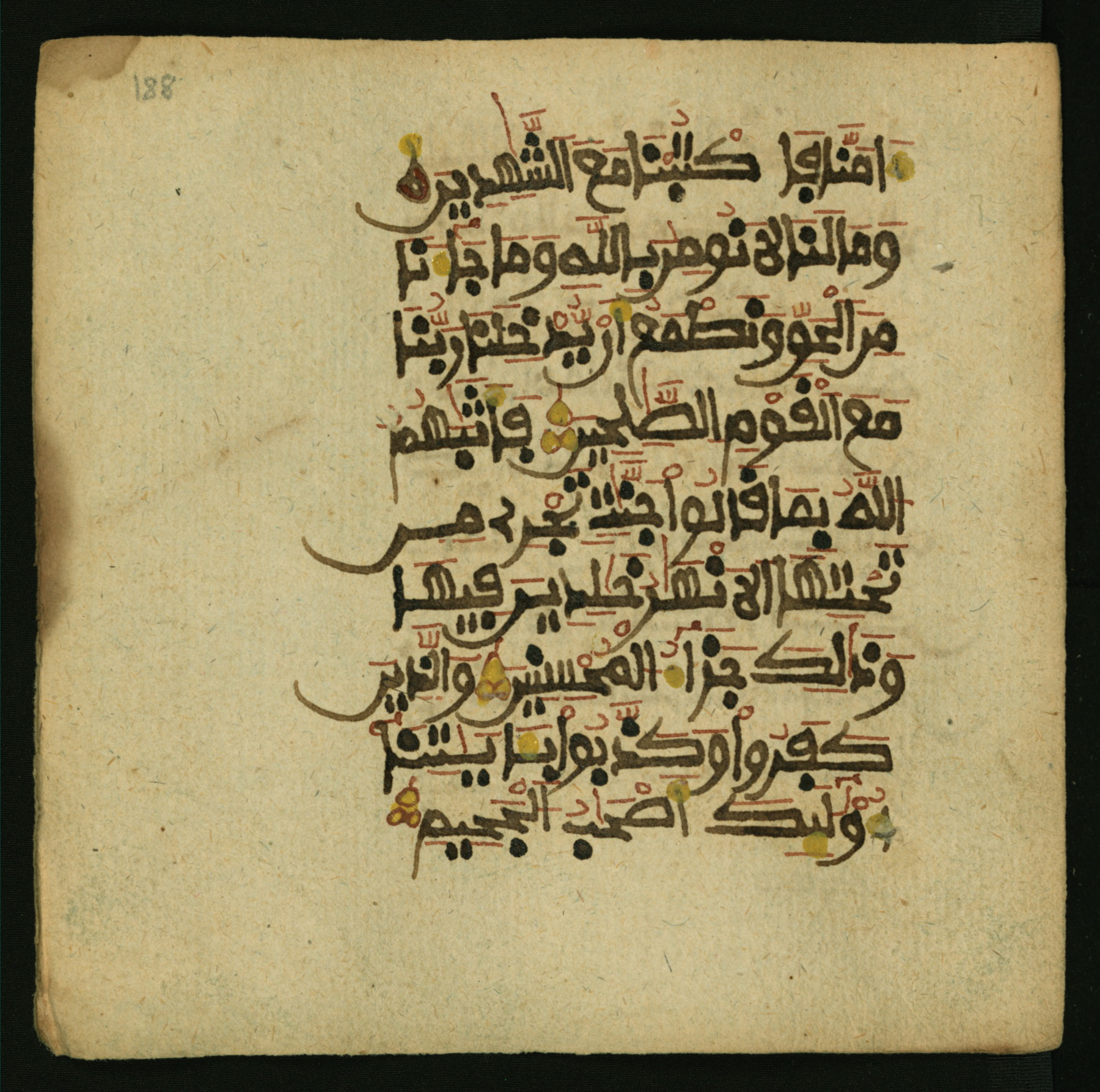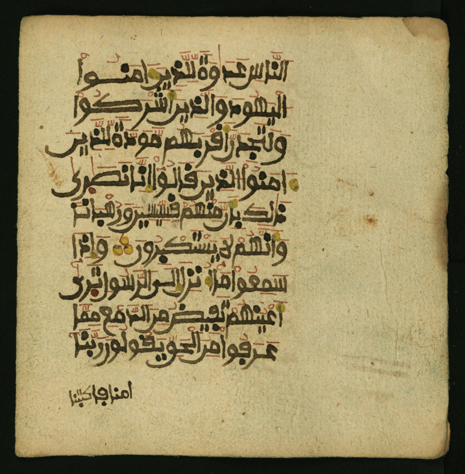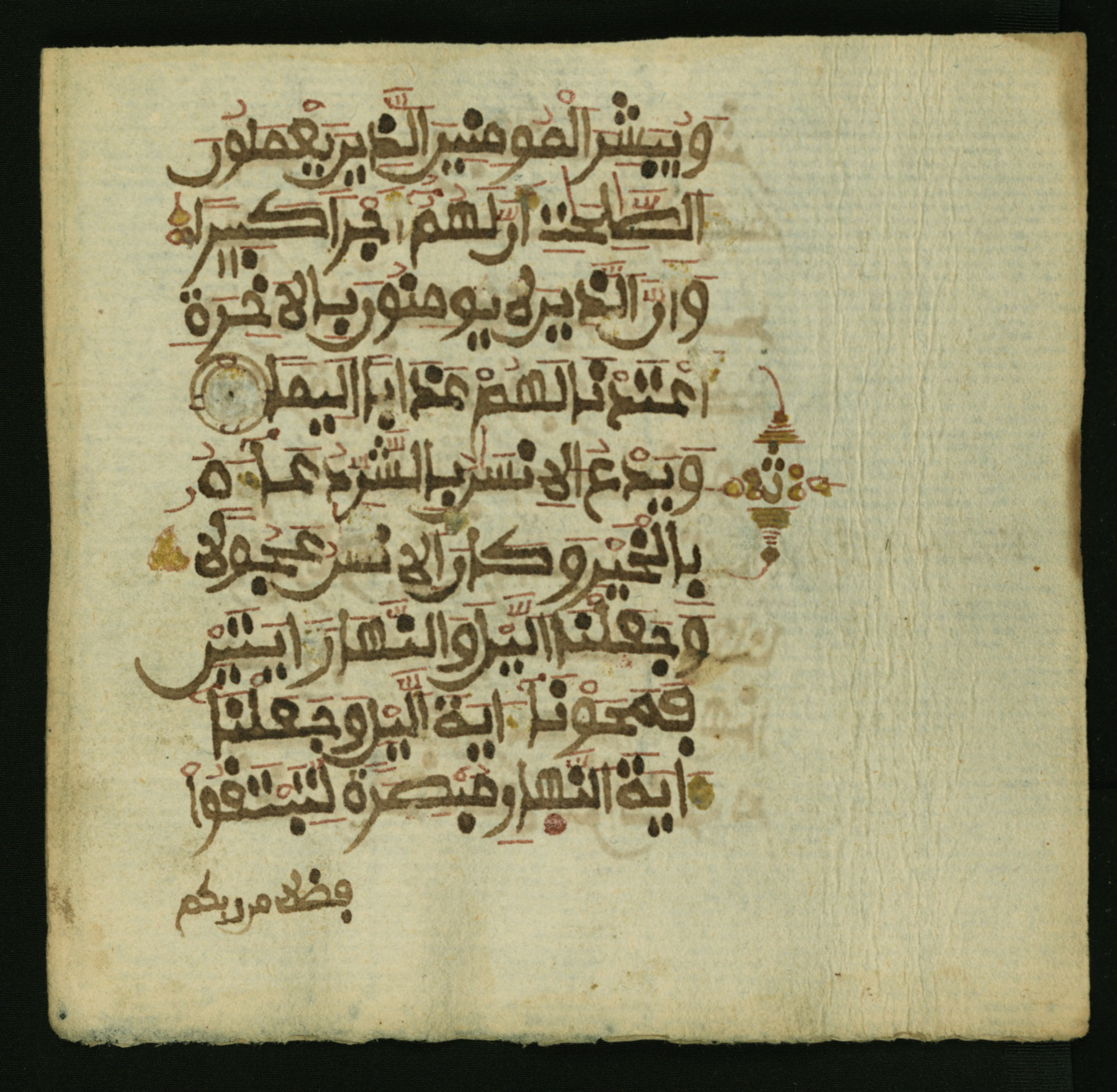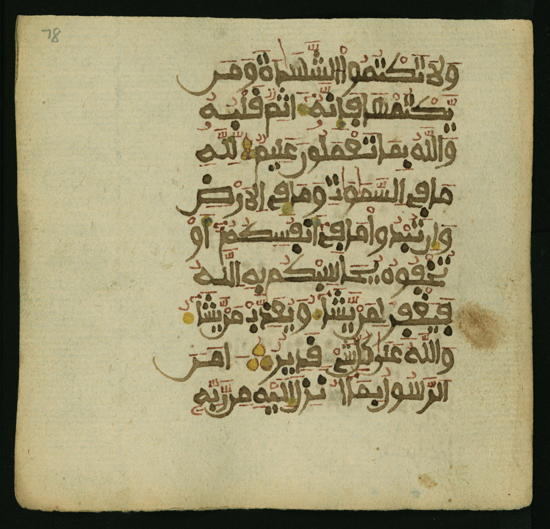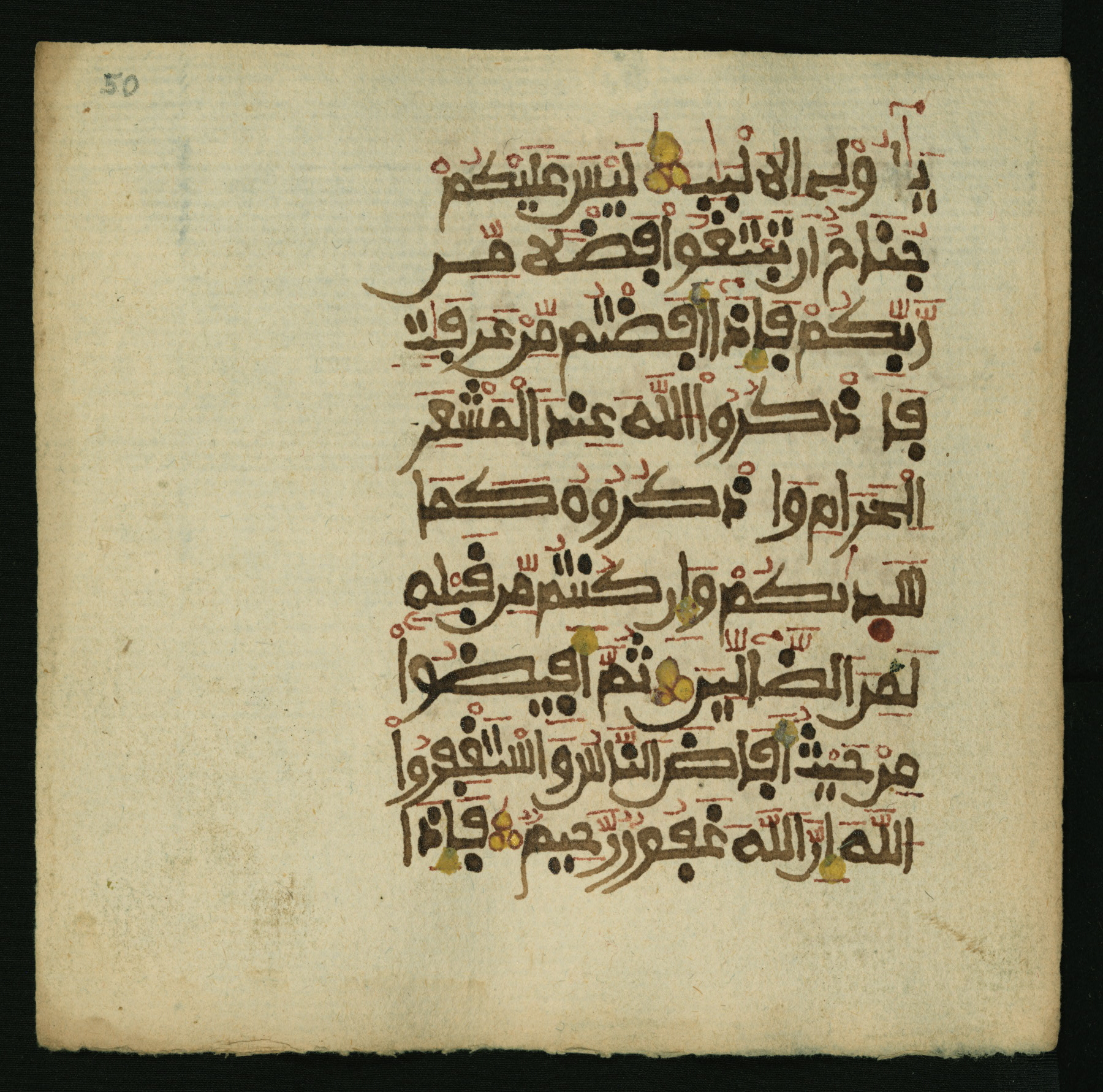 This square-format manuscript is volume 1, containing chapters 1-18 (Sūrat al-fātiḥah through Sūrat al-kahf), of an illuminated two-volume Qur'an produced in Sub-Saharan (West) Africa in the thirteenth century AH / nineteenth CE. The text is written in Sūdānī script in dark brown ink with vocalization in red on loose leaves. Chapter headings are in reddish-brown ink. Three yellow dots outlined in red arranged in a triangular form separate verses. Polychrome circular medallions as well as square and rectangular devices in a variety of patterns and colors mark textual divisions. The leaves of the text are organized between two decorated boards with geometric compositions. The pages and boards are housed in a leather pouch (satchel).