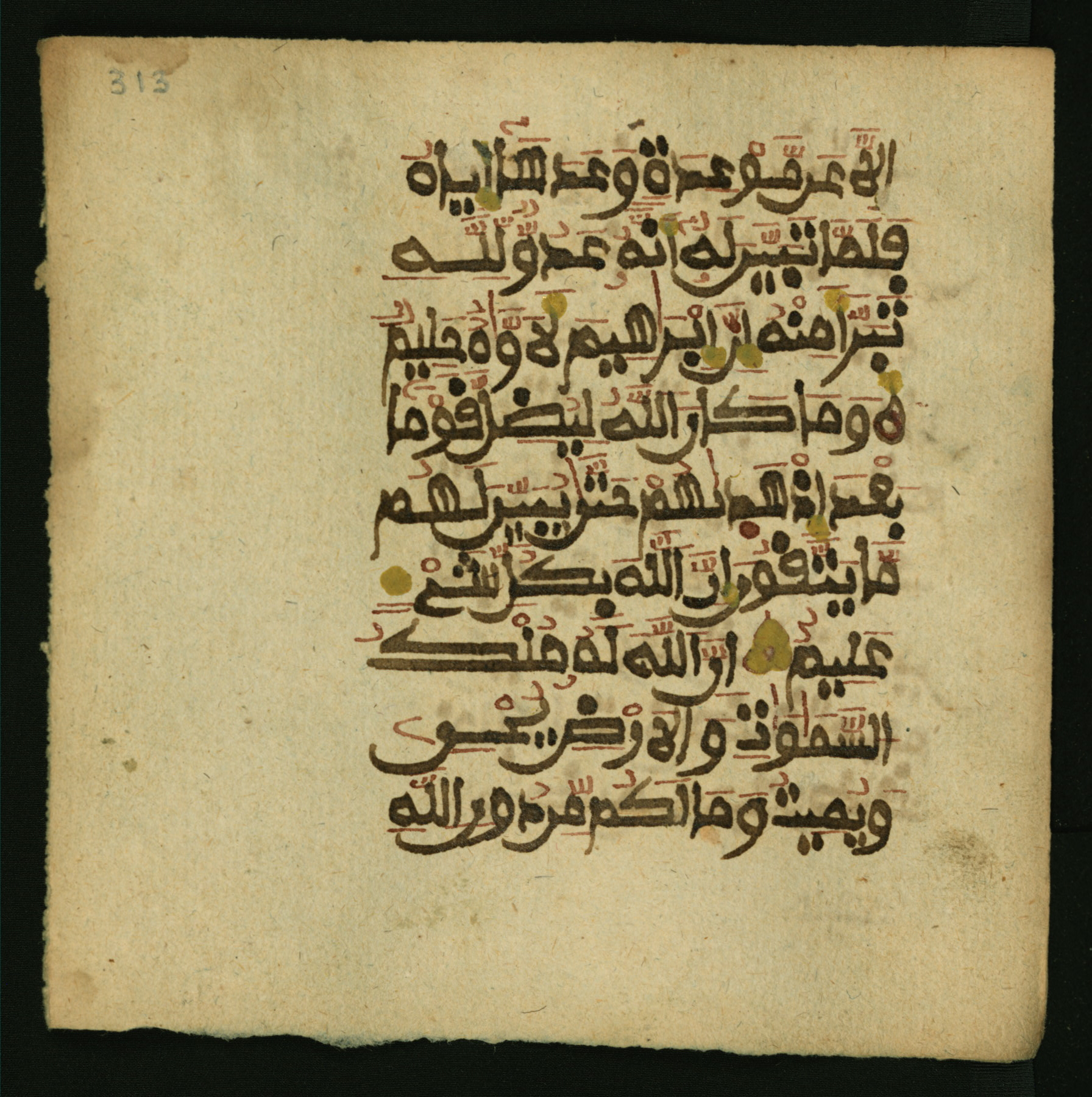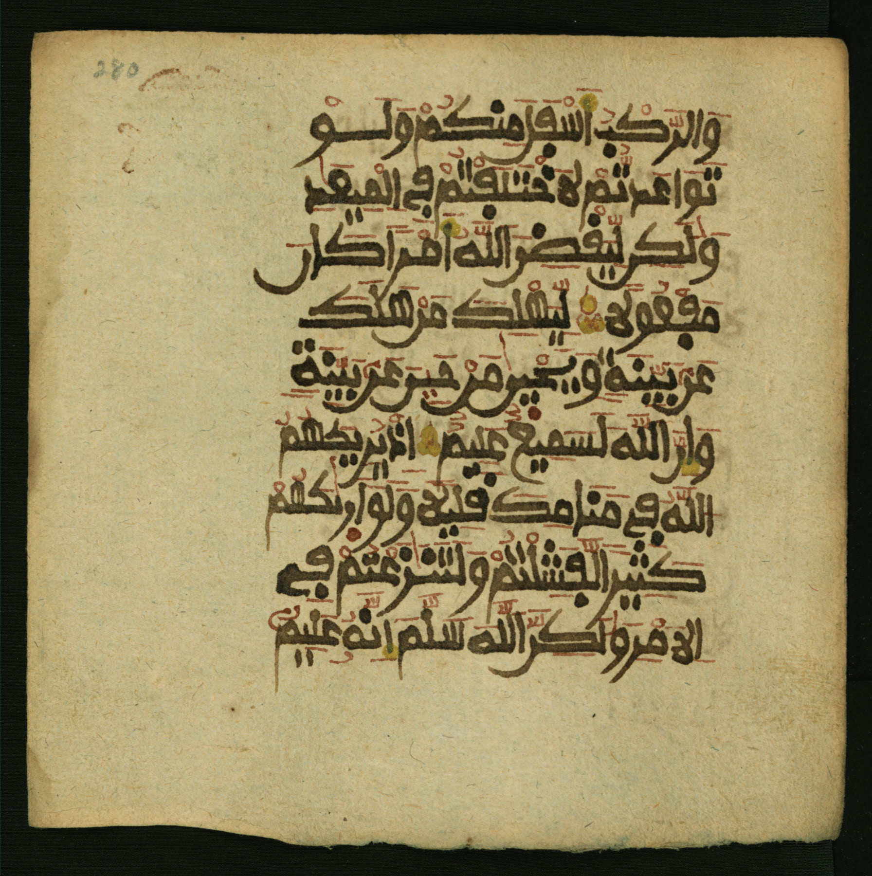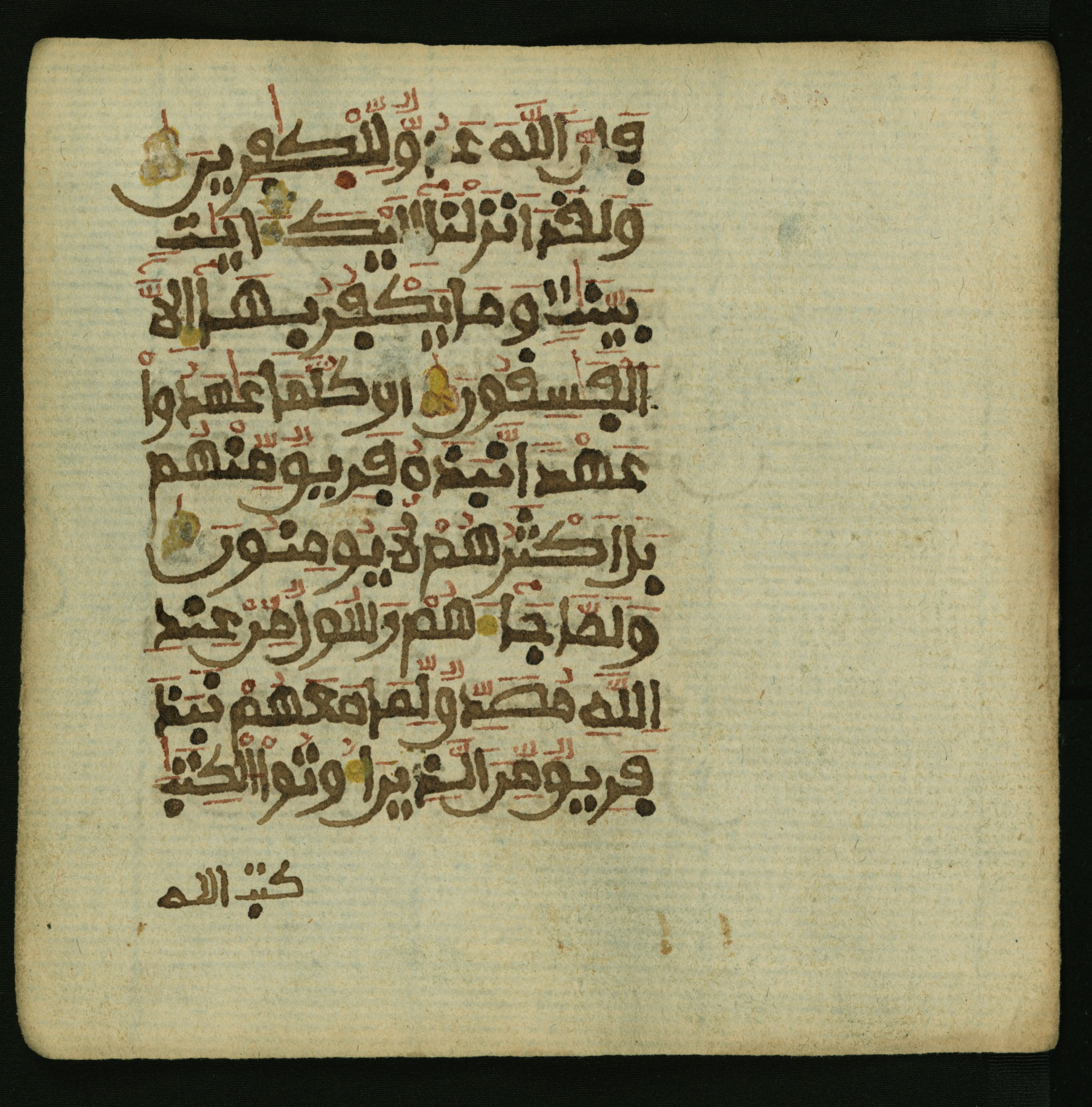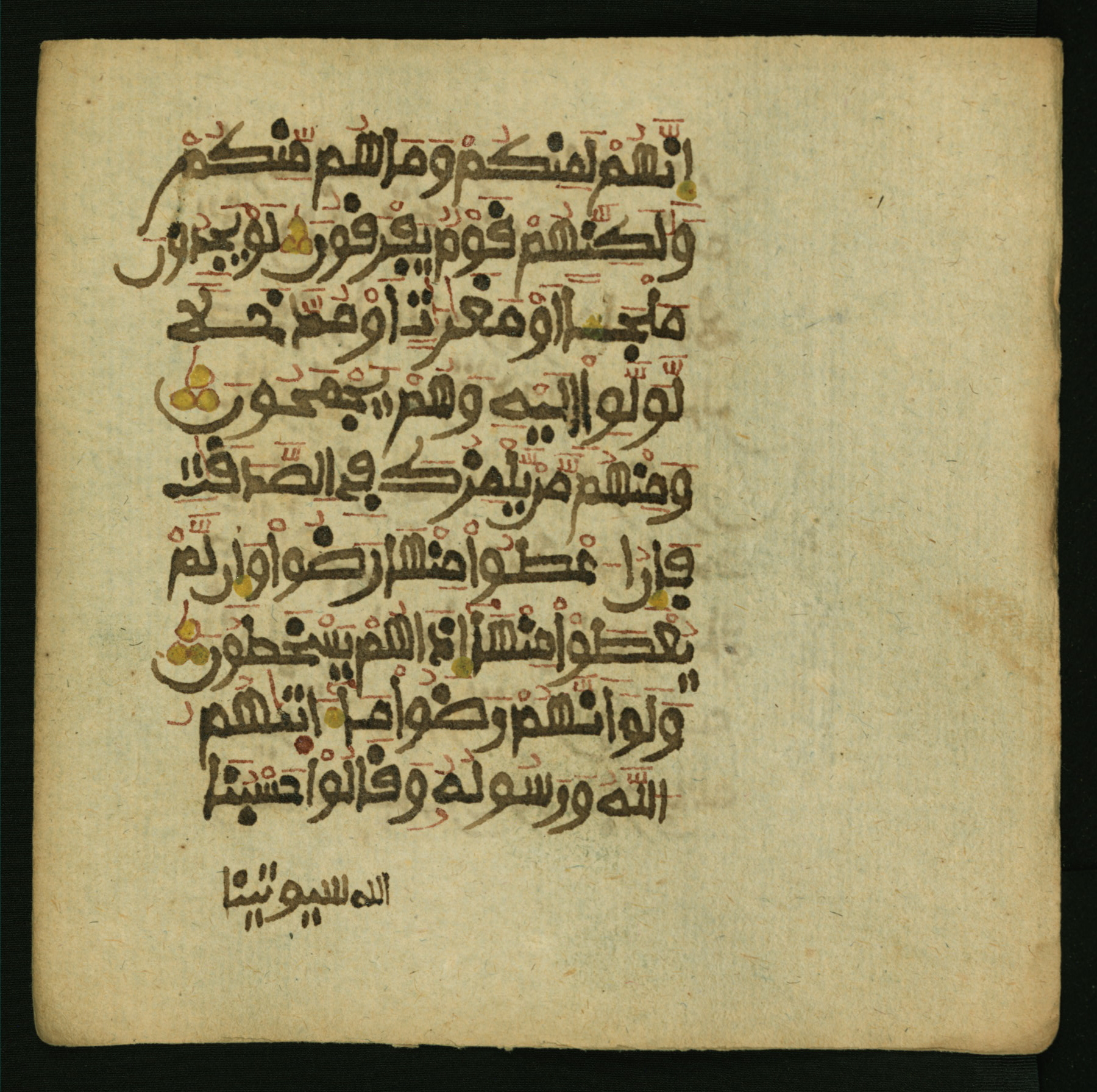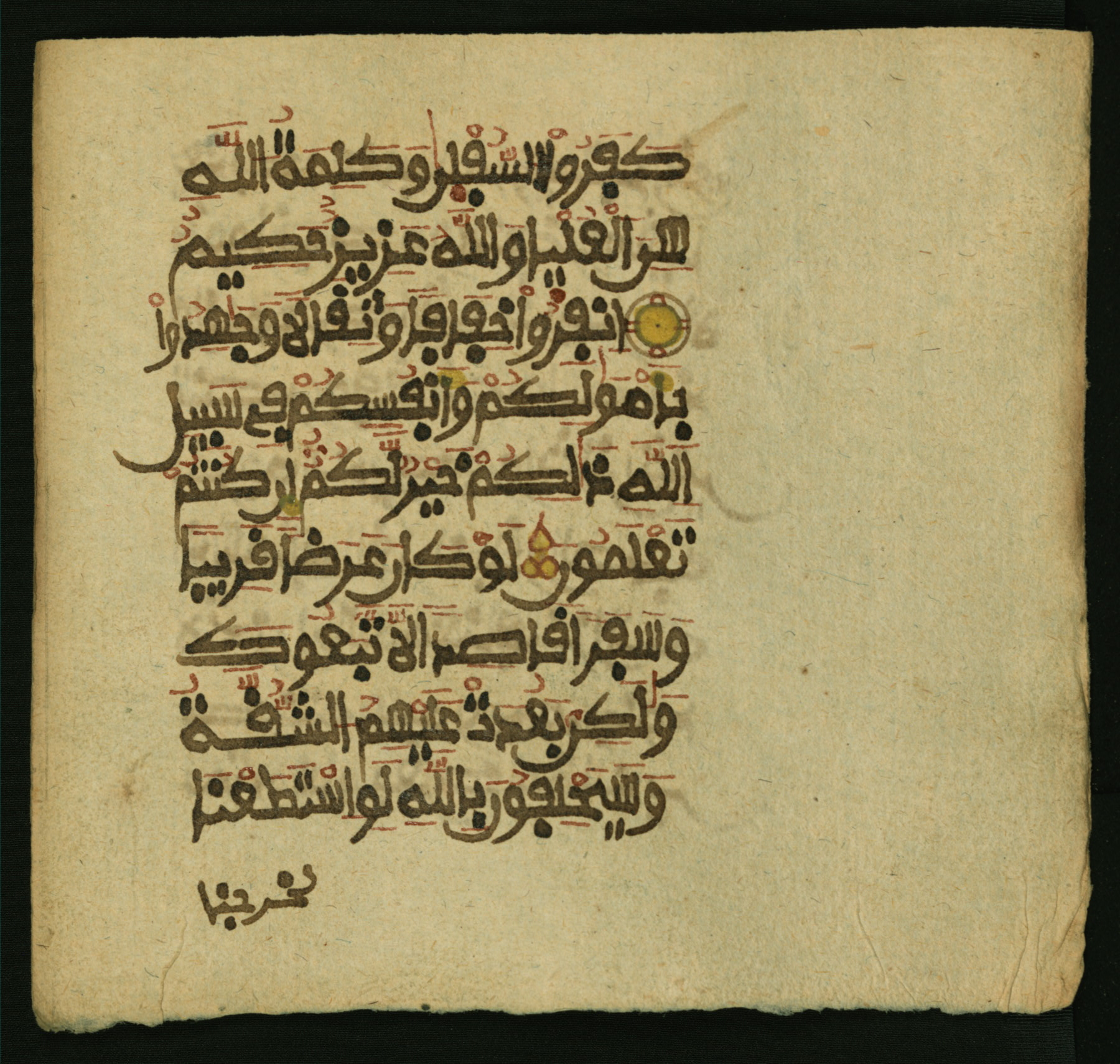 This square-format manuscript is volume 1, containing chapters 1-18 (Sūrat al-fātiḥah through Sūrat al-kahf), of an illuminated two-volume Qur'an produced in Sub-Saharan (West) Africa in the thirteenth century AH / nineteenth CE. The text is written in Sūdānī script in dark brown ink with vocalization in red on loose leaves. Chapter headings are in reddish-brown ink. Three yellow dots outlined in red arranged in a triangular form separate verses. Polychrome circular medallions as well as square and rectangular devices in a variety of patterns and colors mark textual divisions. The leaves of the text are organized between two decorated boards with geometric compositions. The pages and boards are housed in a leather pouch (satchel).