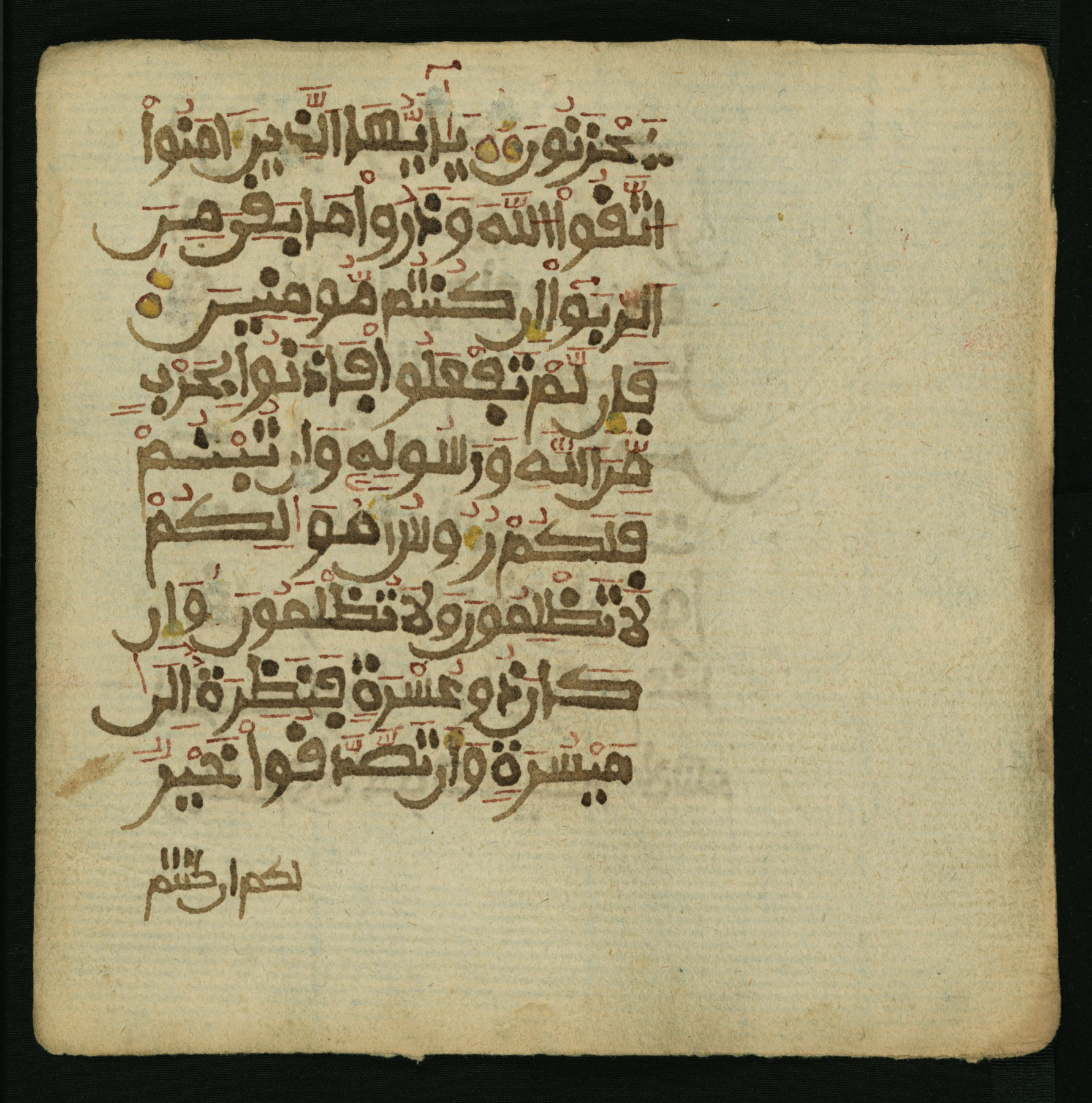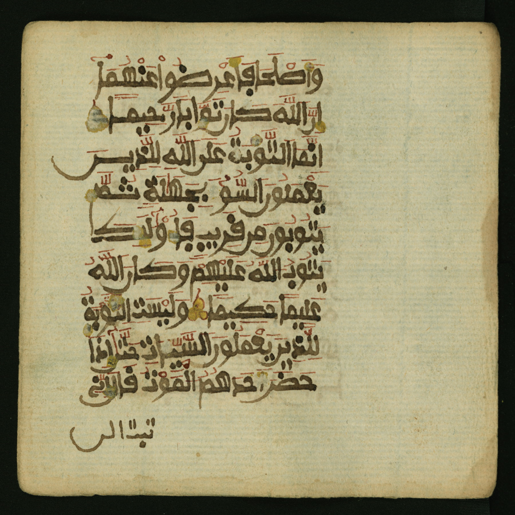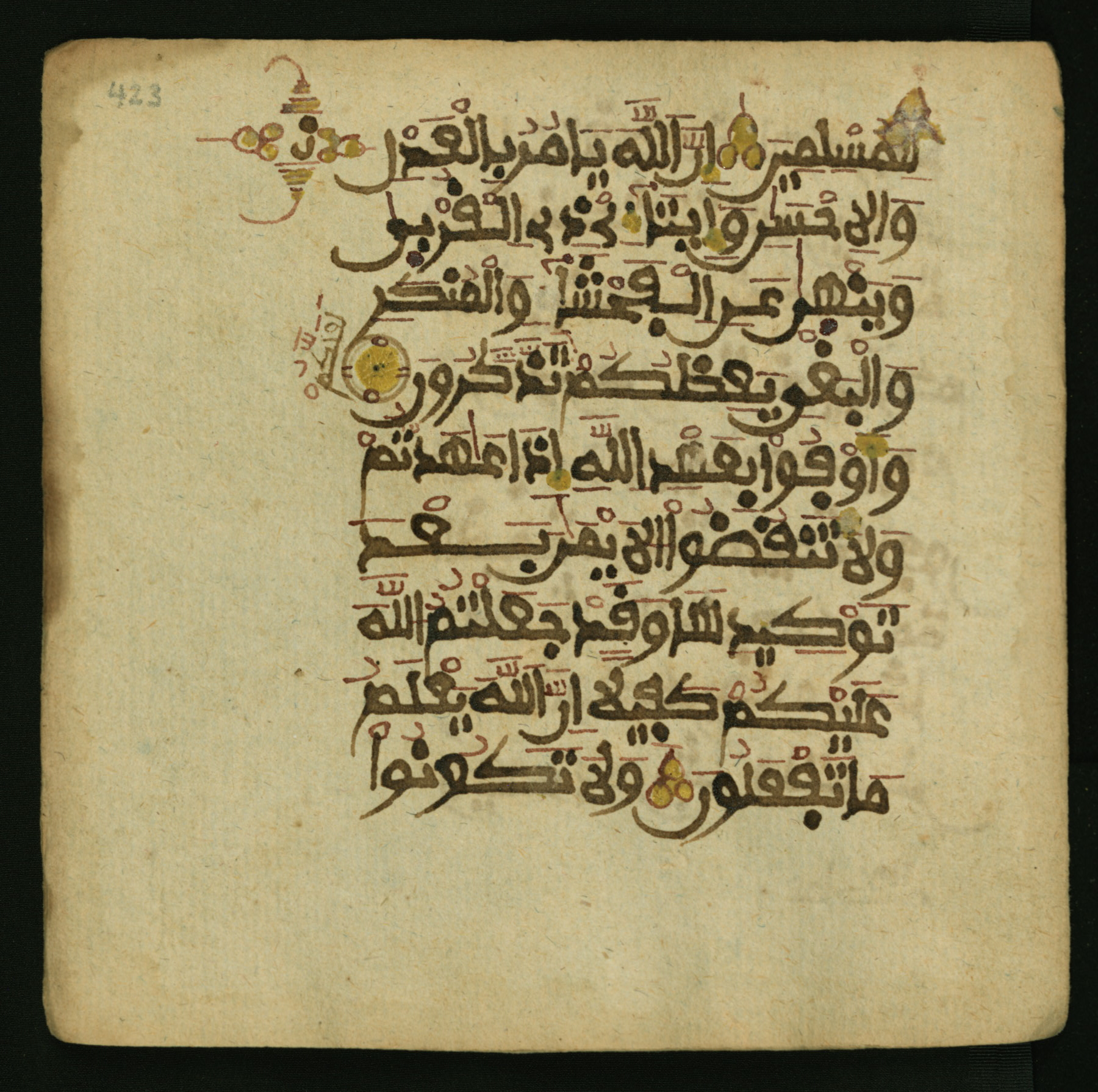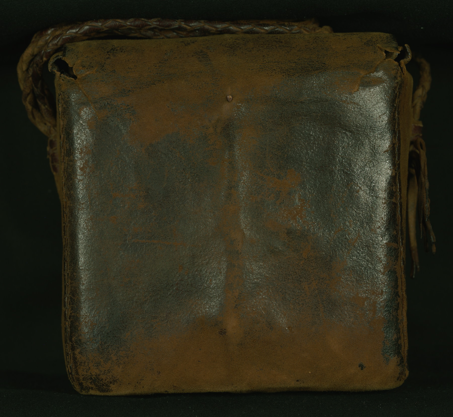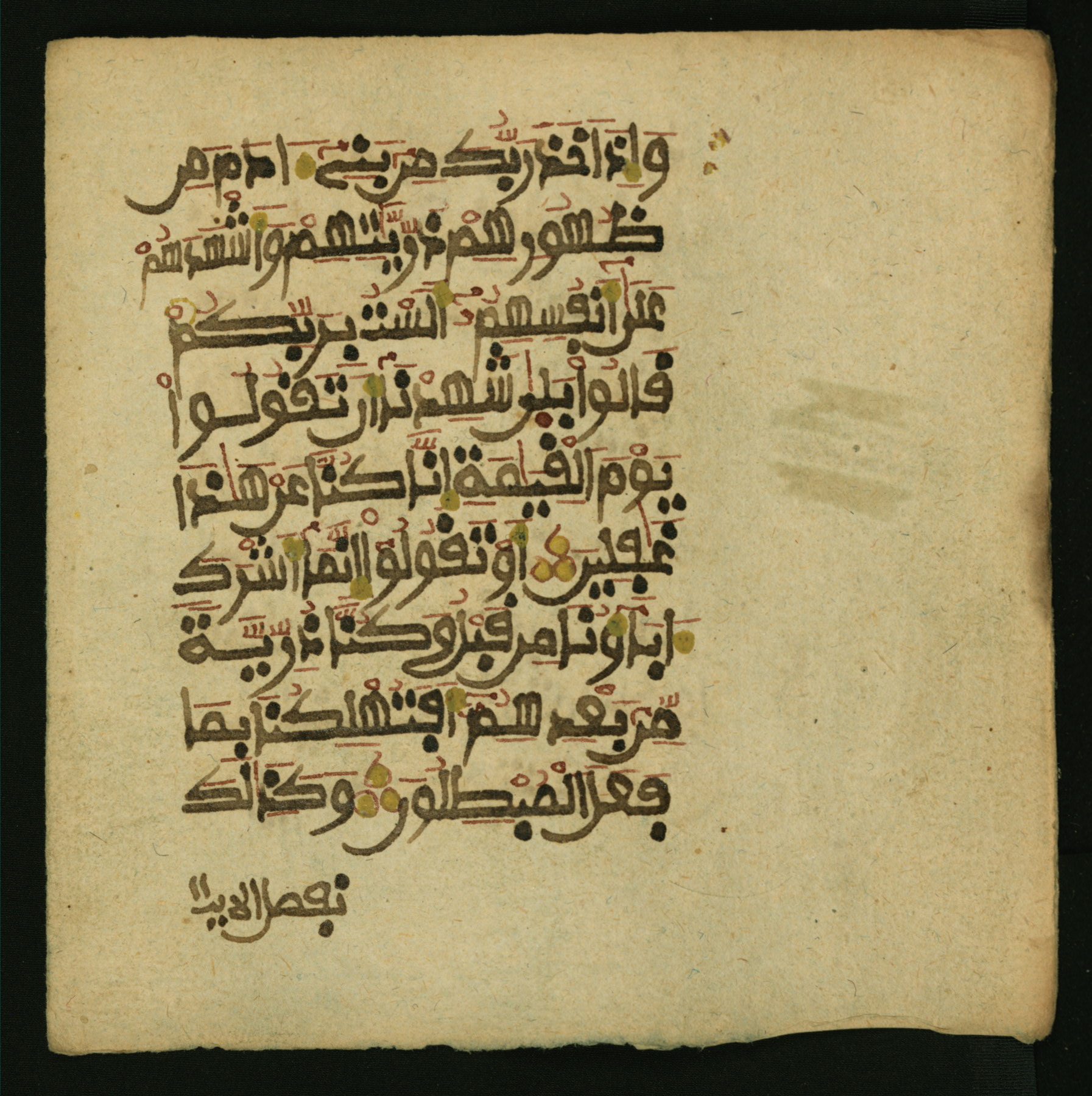 This square-format manuscript is volume 1, containing chapters 1-18 (Sūrat al-fātiḥah through Sūrat al-kahf), of an illuminated two-volume Qur'an produced in Sub-Saharan (West) Africa in the thirteenth century AH / nineteenth CE. The text is written in Sūdānī script in dark brown ink with vocalization in red on loose leaves. Chapter headings are in reddish-brown ink. Three yellow dots outlined in red arranged in a triangular form separate verses. Polychrome circular medallions as well as square and rectangular devices in a variety of patterns and colors mark textual divisions. The leaves of the text are organized between two decorated boards with geometric compositions. The pages and boards are housed in a leather pouch (satchel).