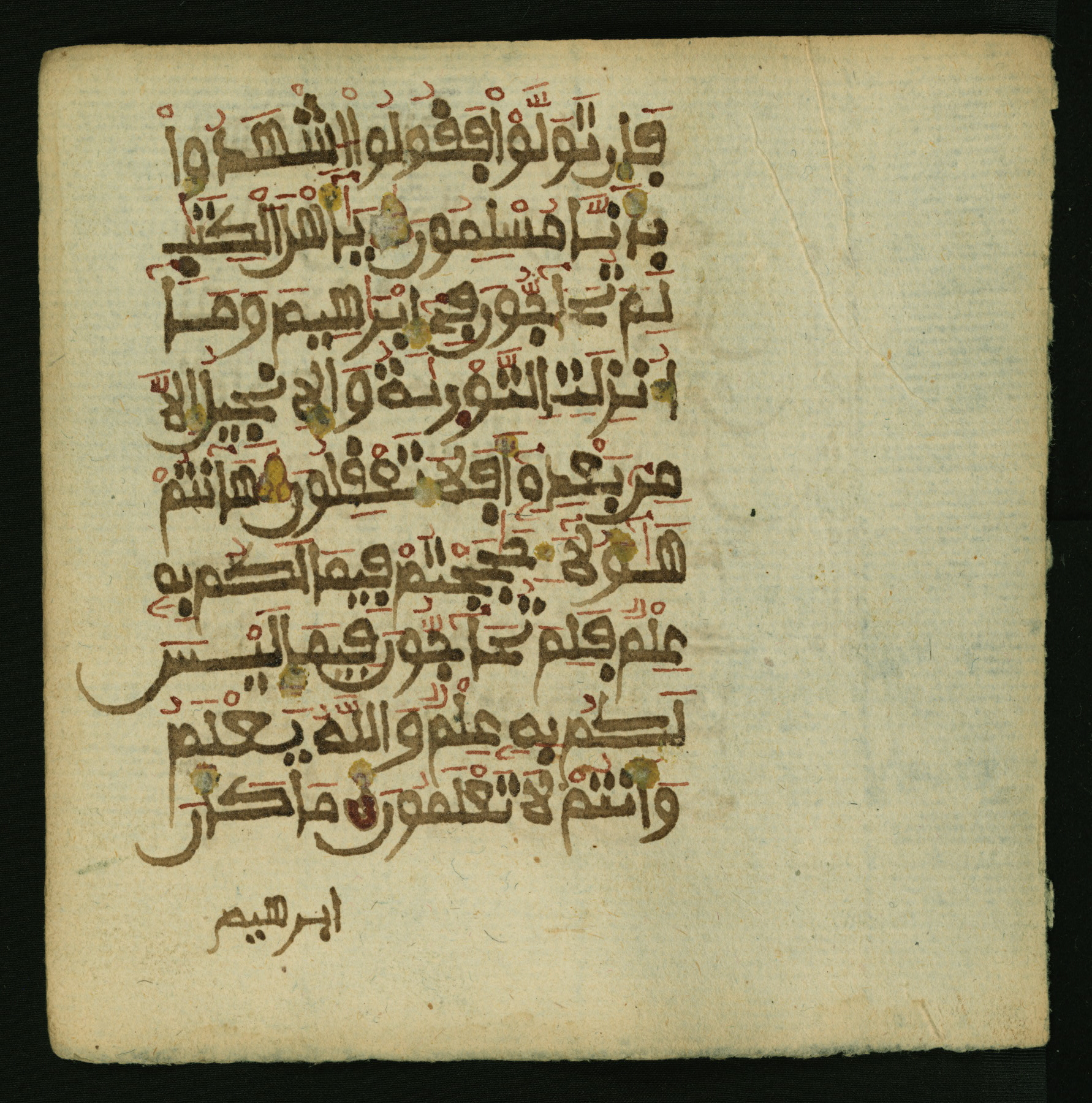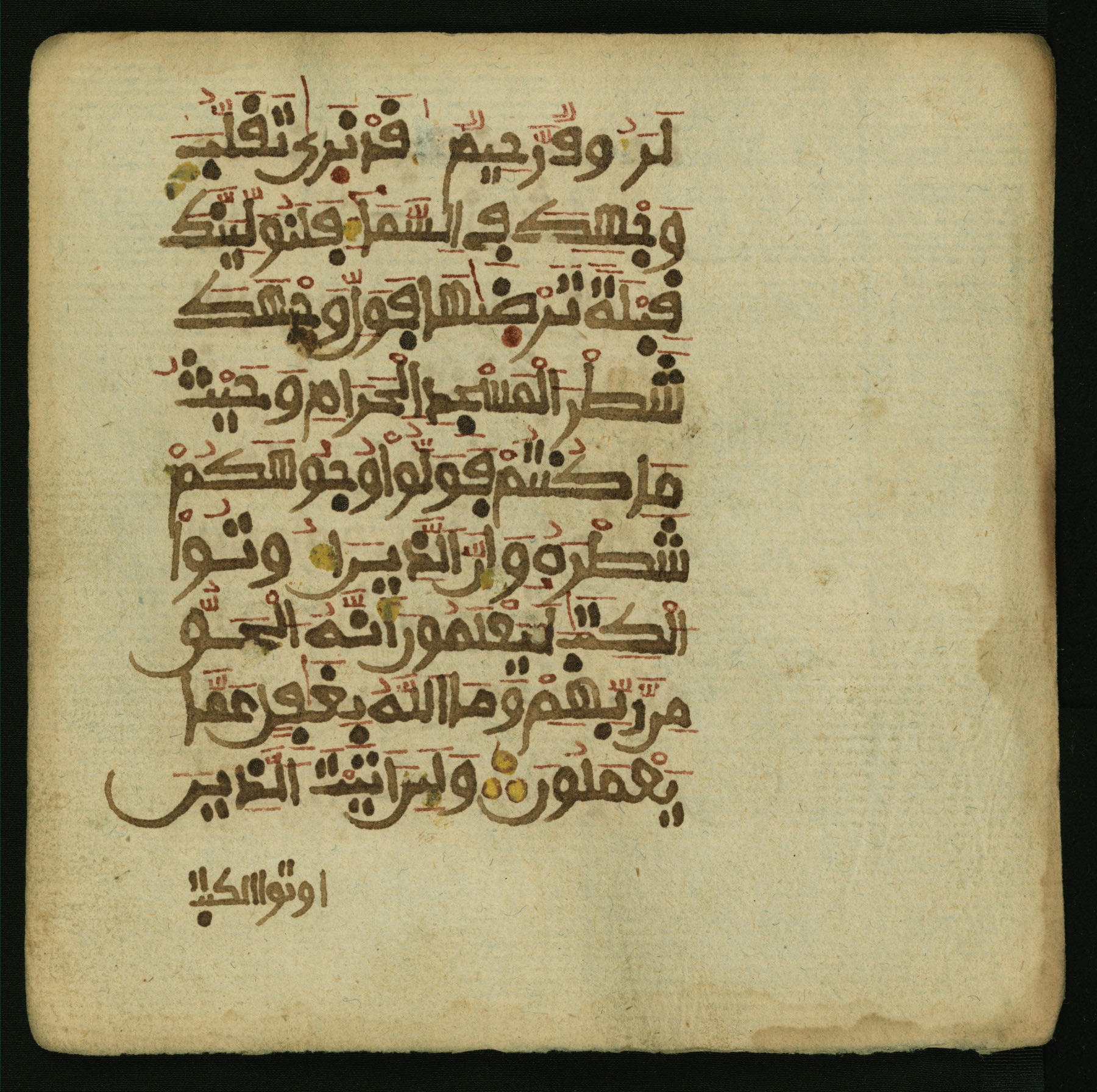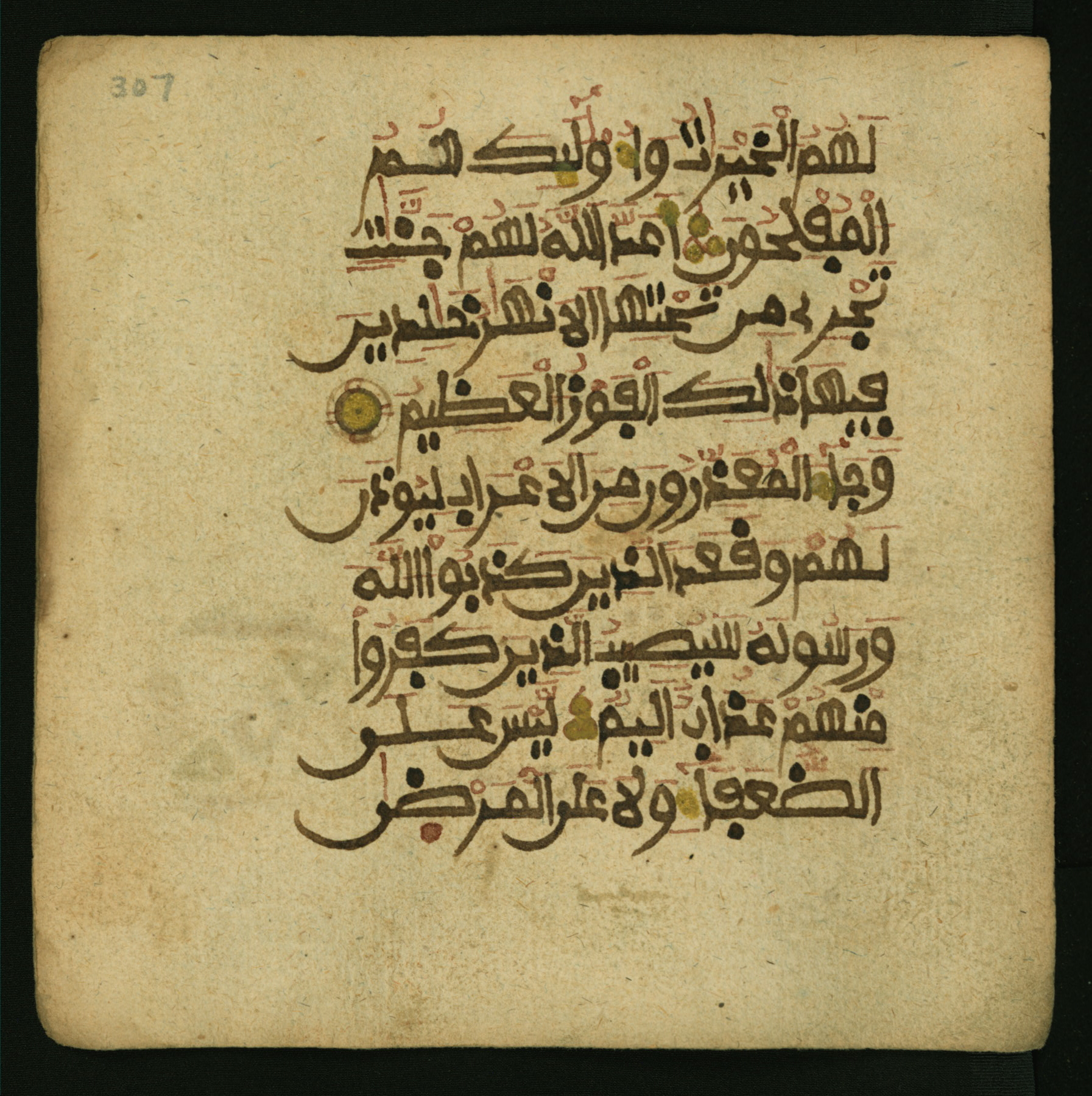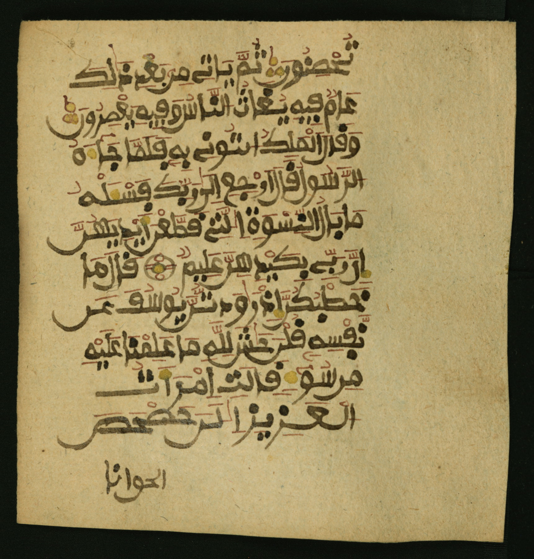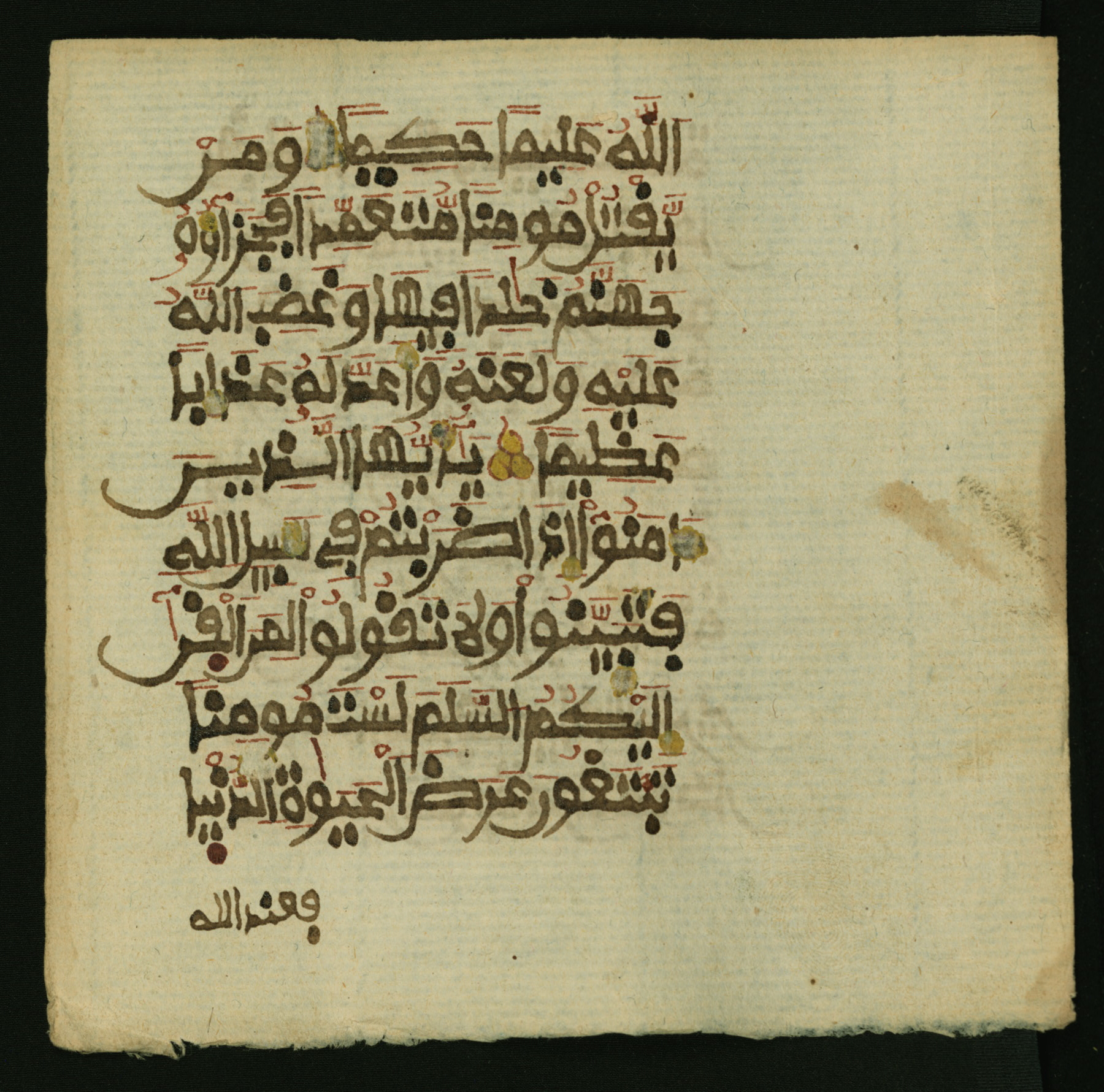 This square-format manuscript is volume 1, containing chapters 1-18 (Sūrat al-fātiḥah through Sūrat al-kahf), of an illuminated two-volume Qur'an produced in Sub-Saharan (West) Africa in the thirteenth century AH / nineteenth CE. The text is written in Sūdānī script in dark brown ink with vocalization in red on loose leaves. Chapter headings are in reddish-brown ink. Three yellow dots outlined in red arranged in a triangular form separate verses. Polychrome circular medallions as well as square and rectangular devices in a variety of patterns and colors mark textual divisions. The leaves of the text are organized between two decorated boards with geometric compositions. The pages and boards are housed in a leather pouch (satchel).