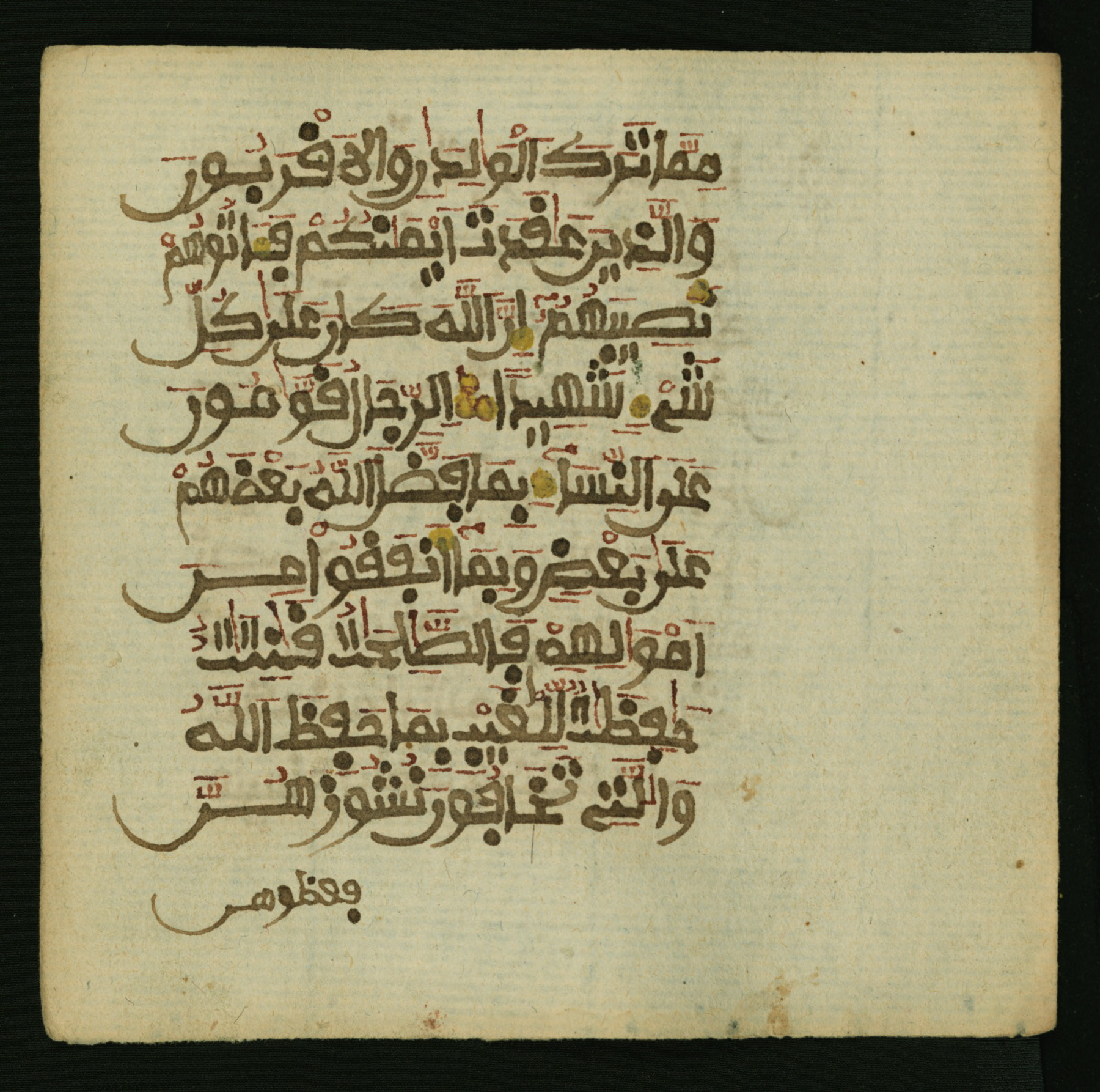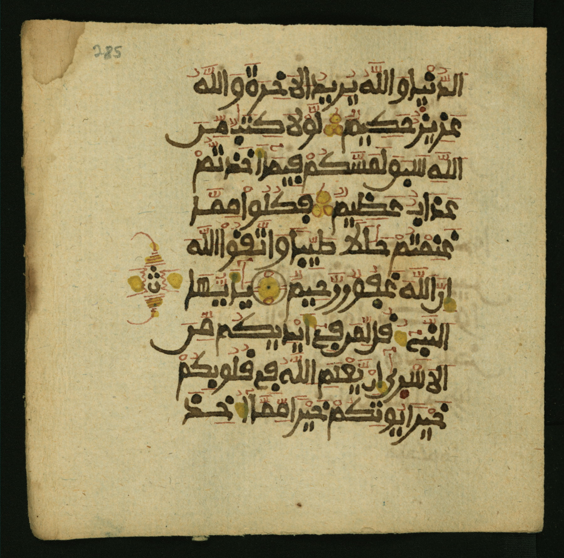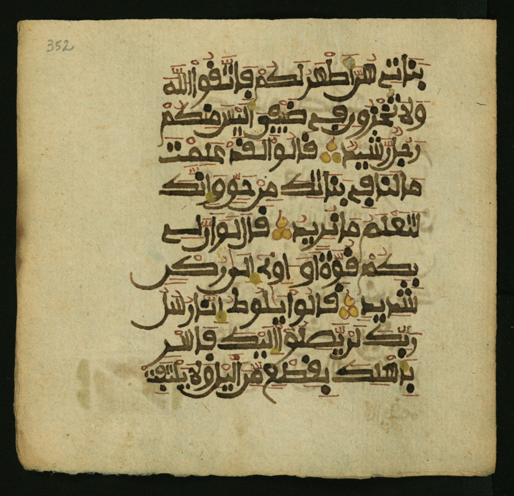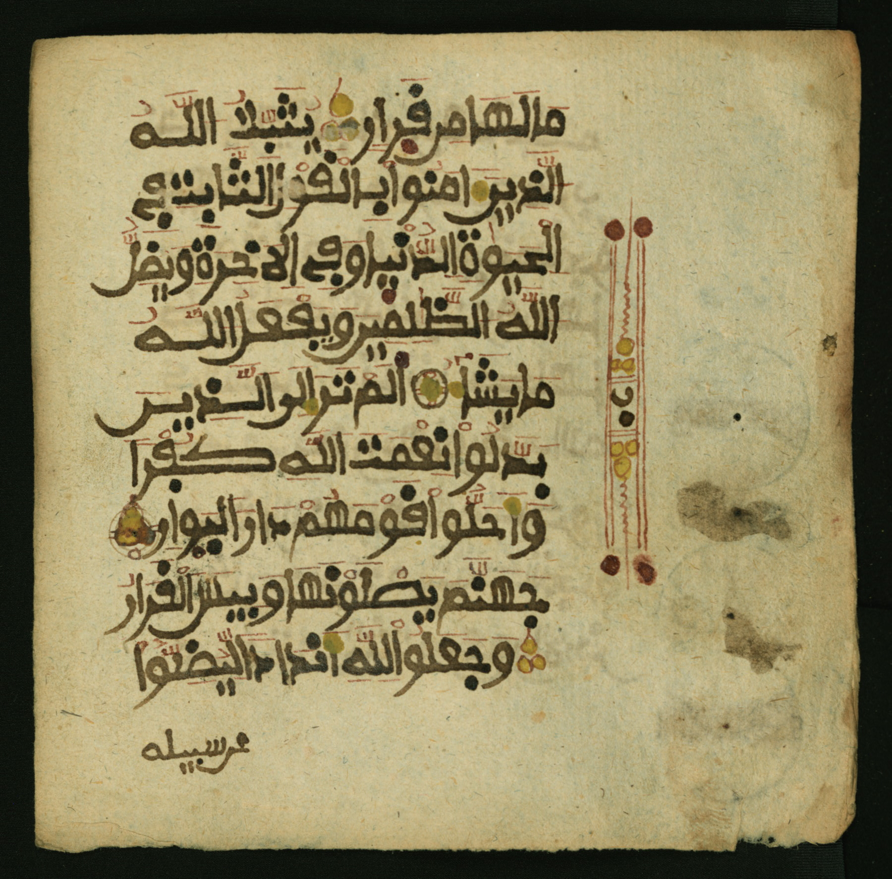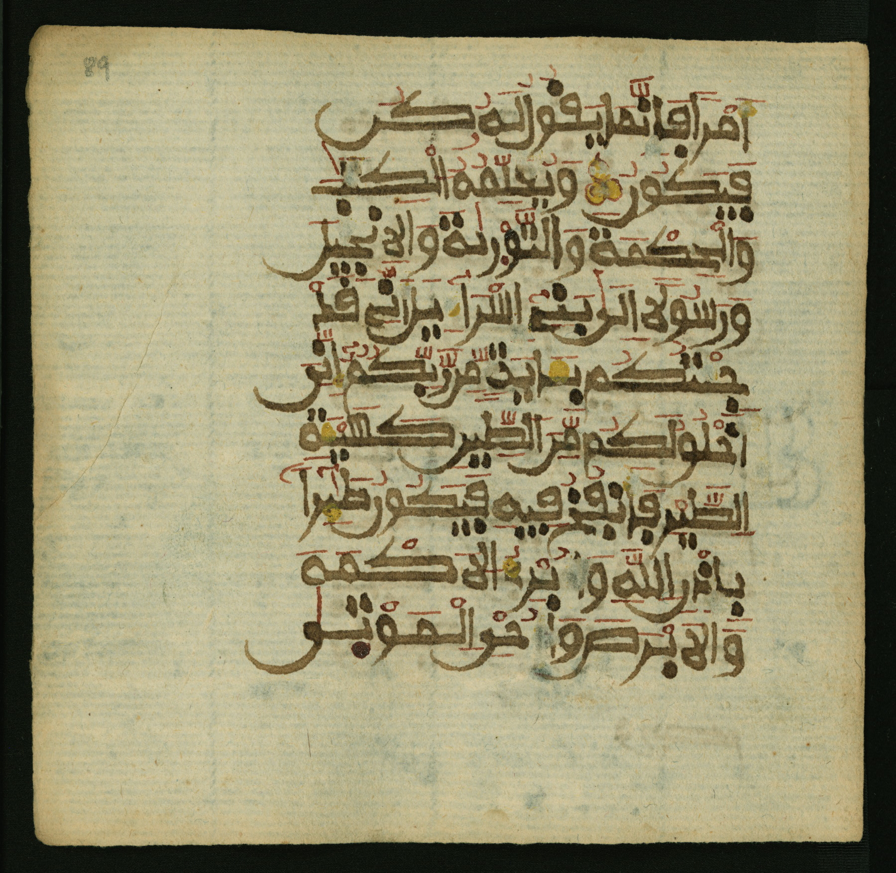 This square-format manuscript is volume 1, containing chapters 1-18 (Sūrat al-fātiḥah through Sūrat al-kahf), of an illuminated two-volume Qur'an produced in Sub-Saharan (West) Africa in the thirteenth century AH / nineteenth CE. The text is written in Sūdānī script in dark brown ink with vocalization in red on loose leaves. Chapter headings are in reddish-brown ink. Three yellow dots outlined in red arranged in a triangular form separate verses. Polychrome circular medallions as well as square and rectangular devices in a variety of patterns and colors mark textual divisions. The leaves of the text are organized between two decorated boards with geometric compositions. The pages and boards are housed in a leather pouch (satchel).