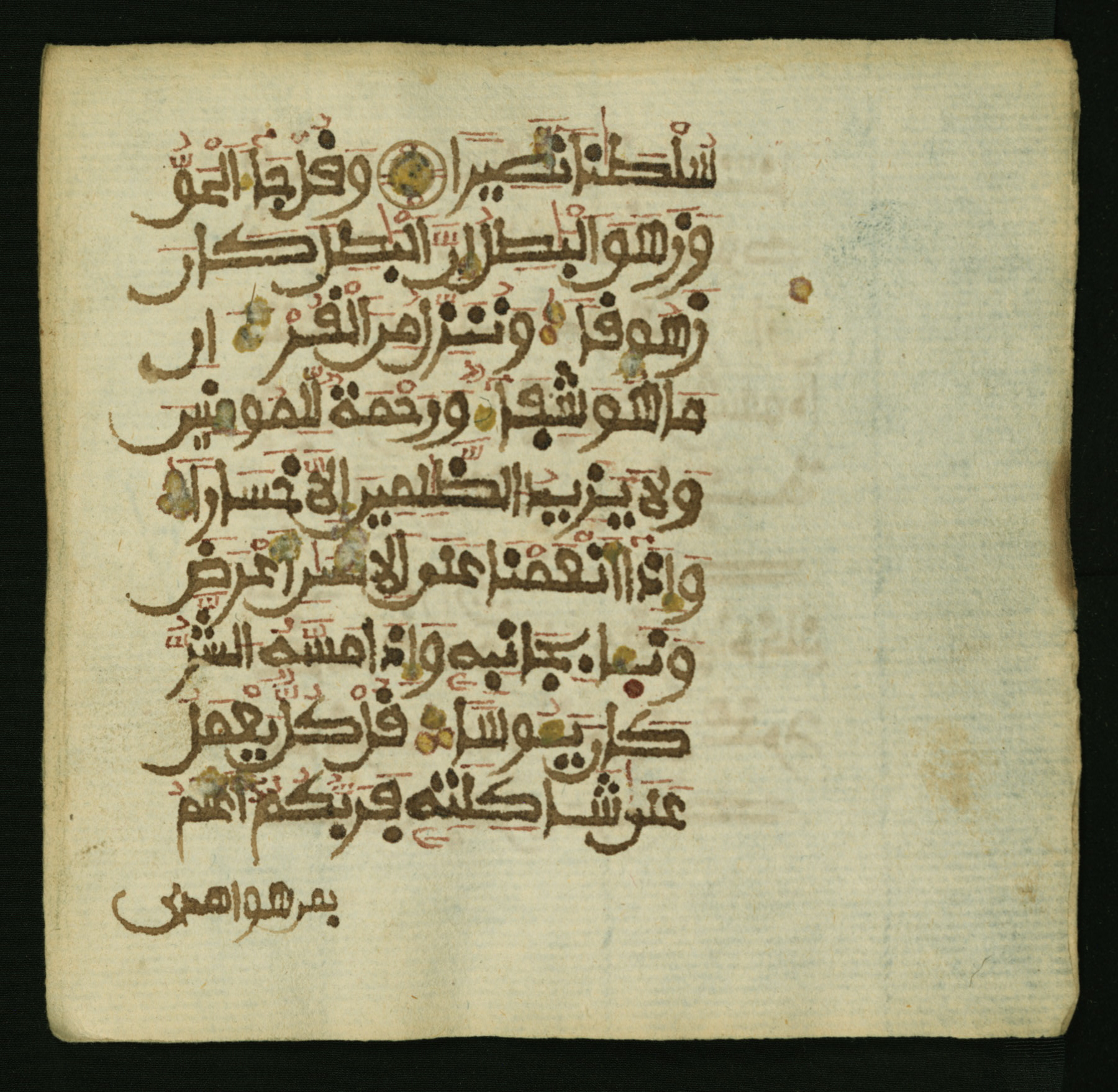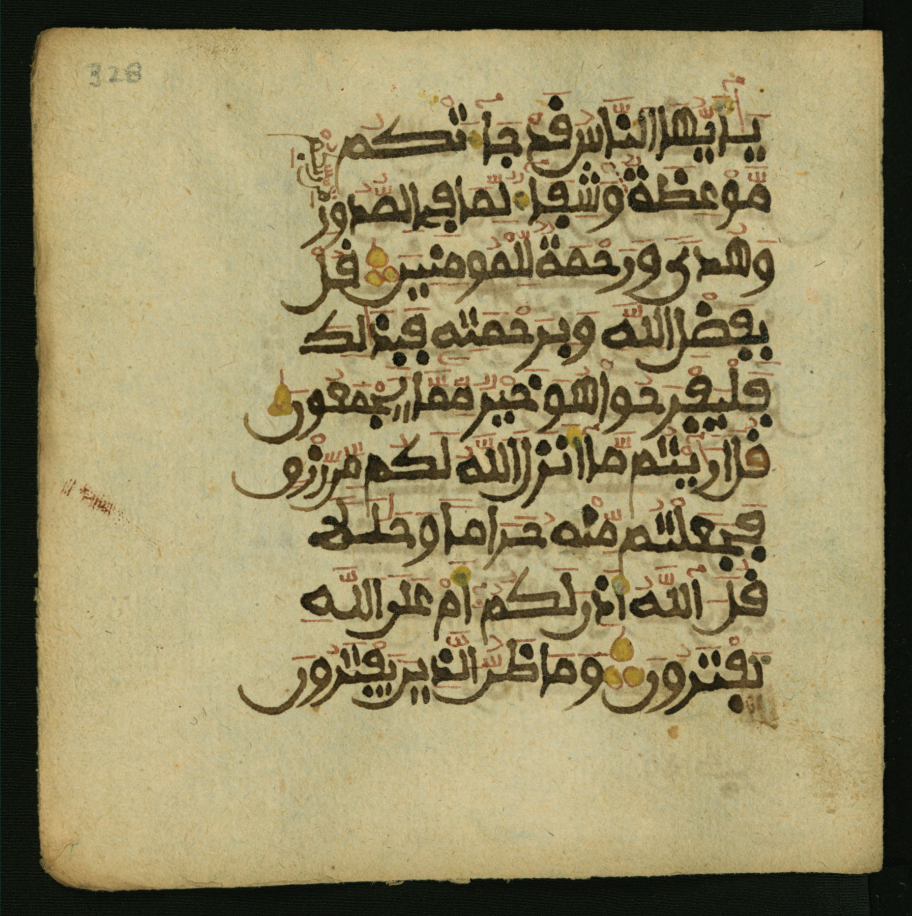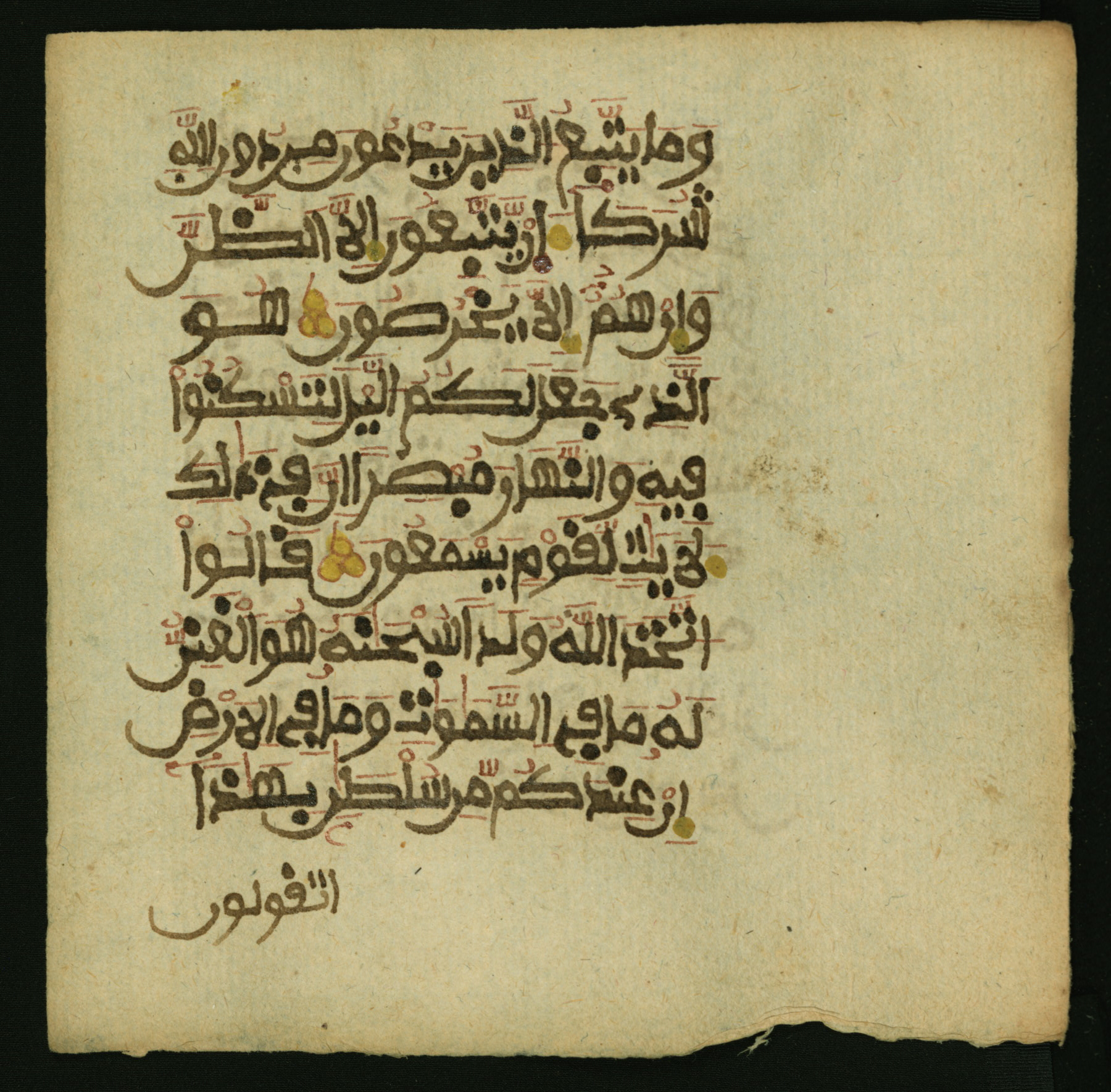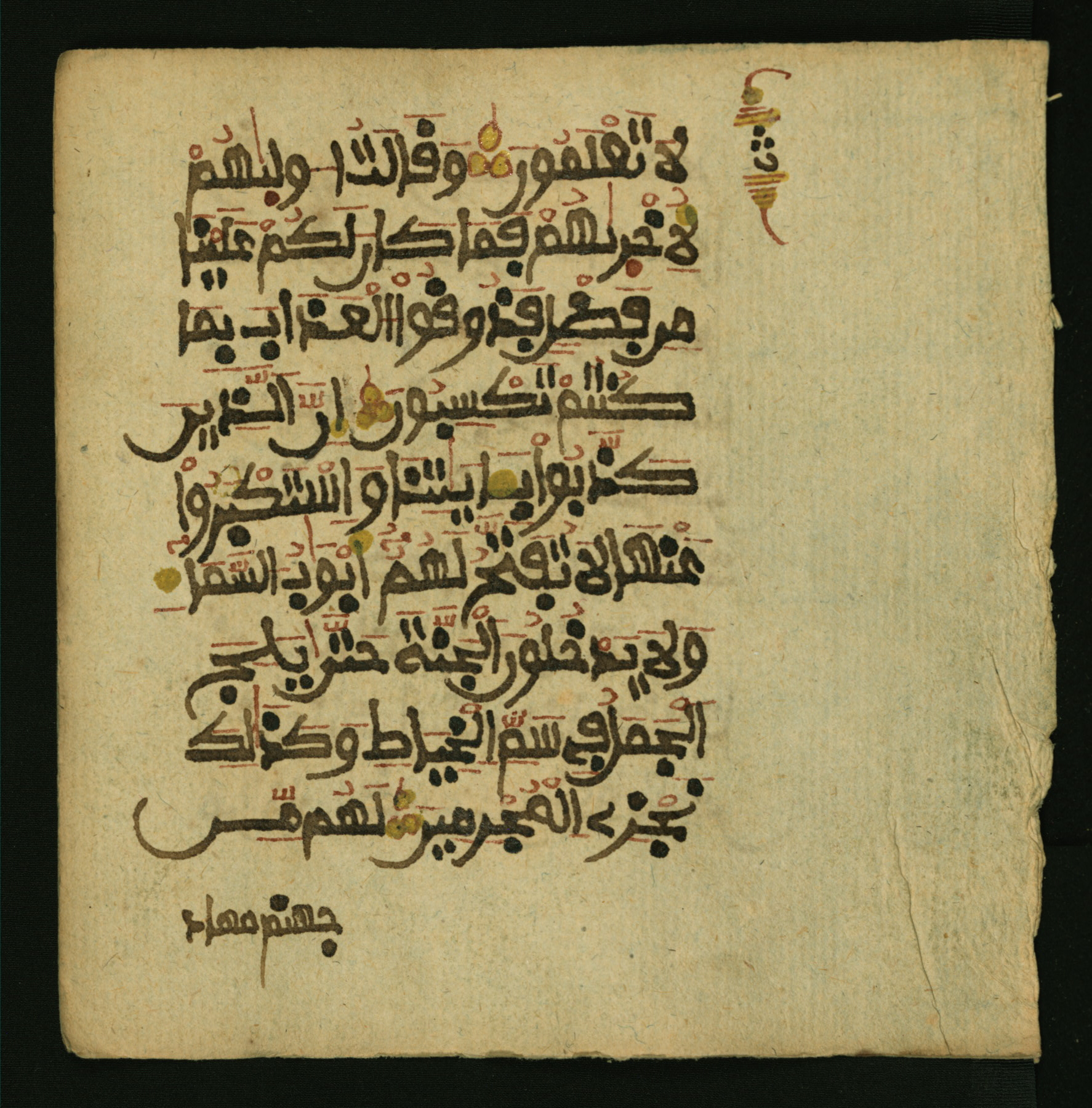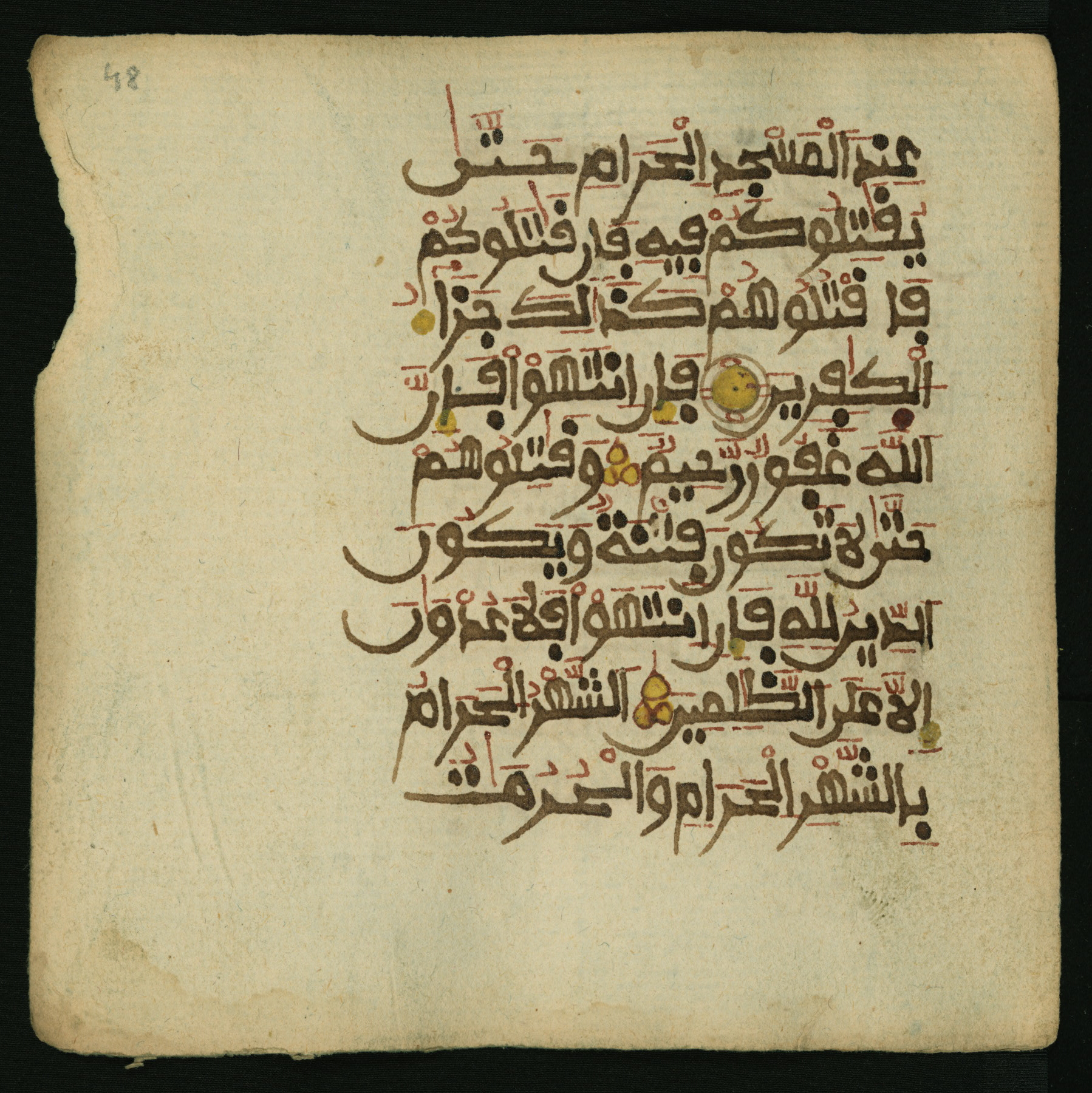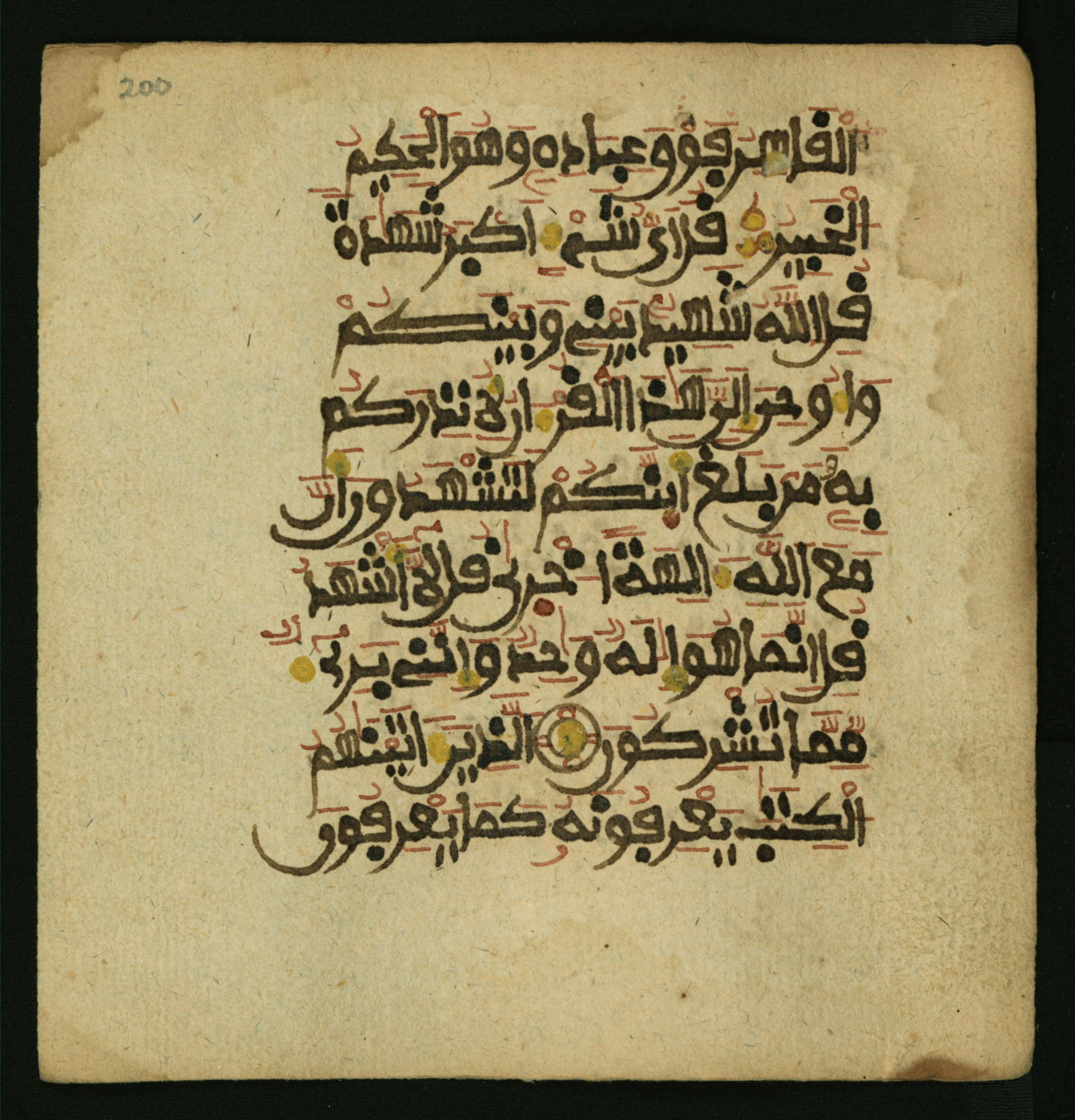 This square-format manuscript is volume 1, containing chapters 1-18 (Sūrat al-fātiḥah through Sūrat al-kahf), of an illuminated two-volume Qur'an produced in Sub-Saharan (West) Africa in the thirteenth century AH / nineteenth CE. The text is written in Sūdānī script in dark brown ink with vocalization in red on loose leaves. Chapter headings are in reddish-brown ink. Three yellow dots outlined in red arranged in a triangular form separate verses. Polychrome circular medallions as well as square and rectangular devices in a variety of patterns and colors mark textual divisions. The leaves of the text are organized between two decorated boards with geometric compositions. The pages and boards are housed in a leather pouch (satchel).