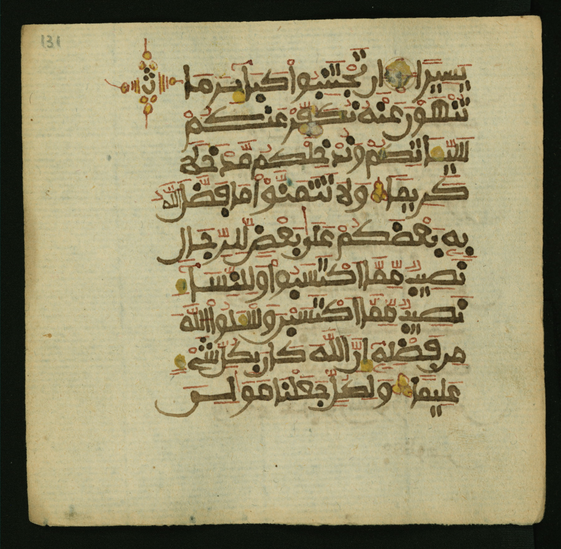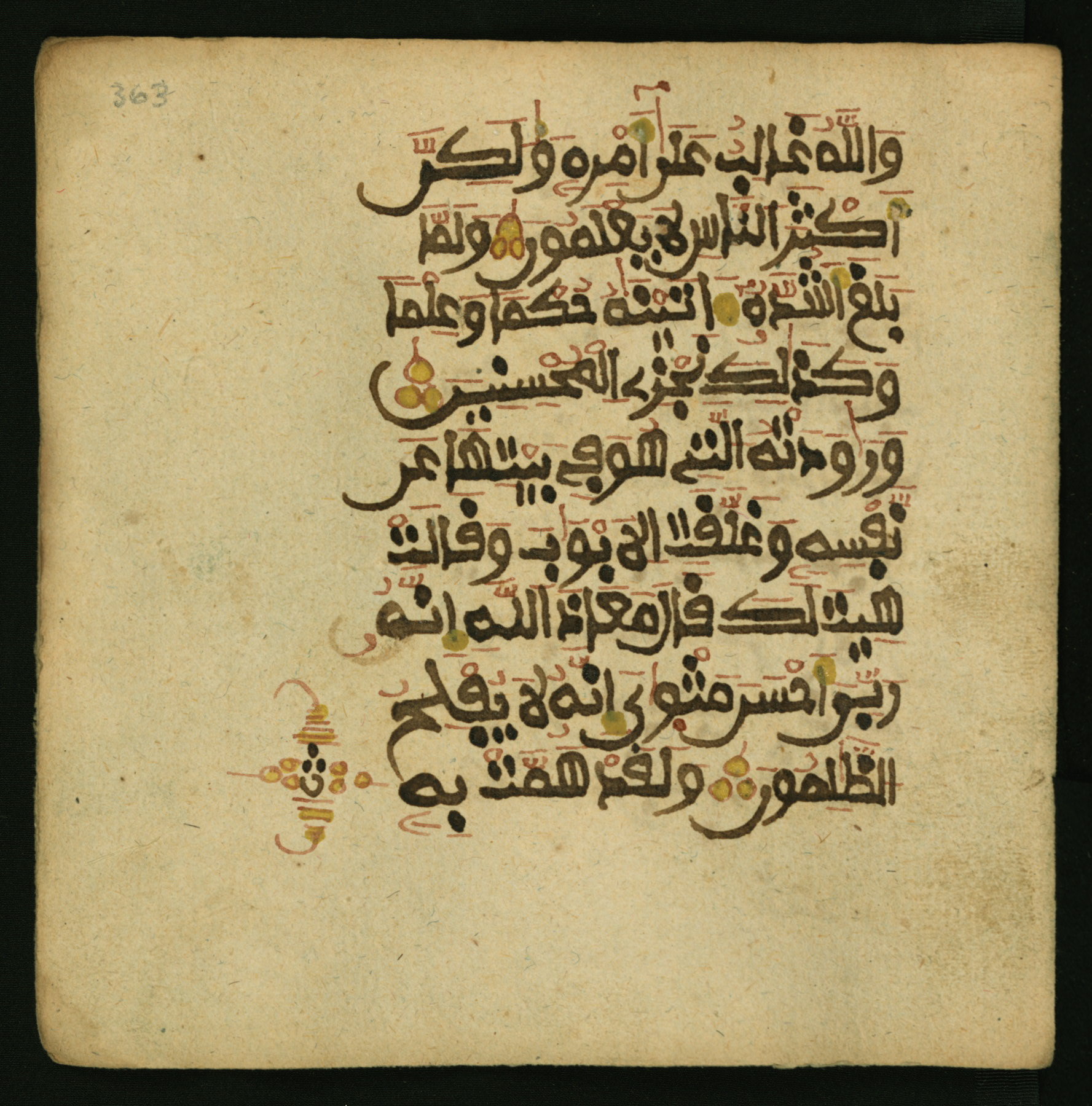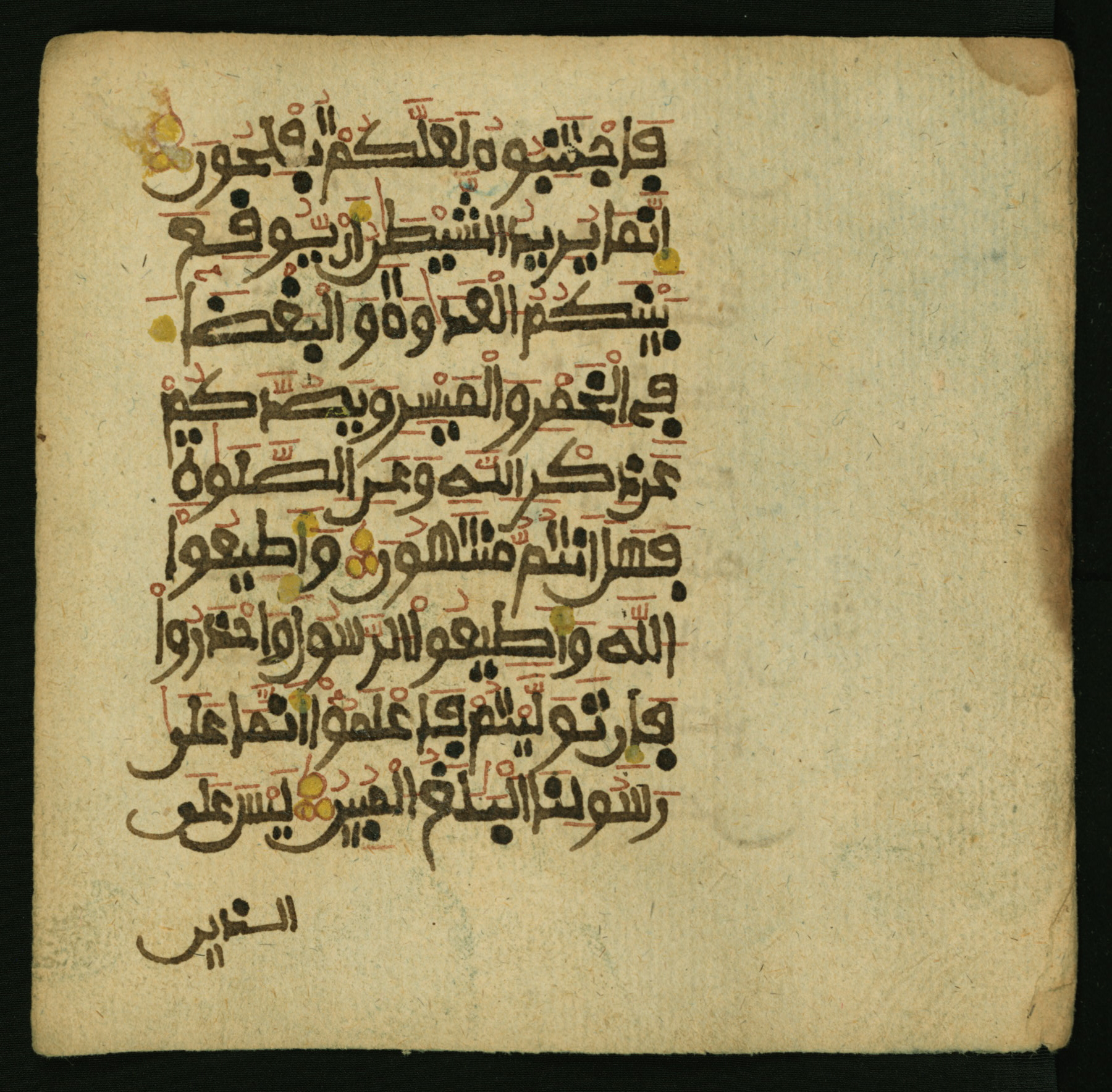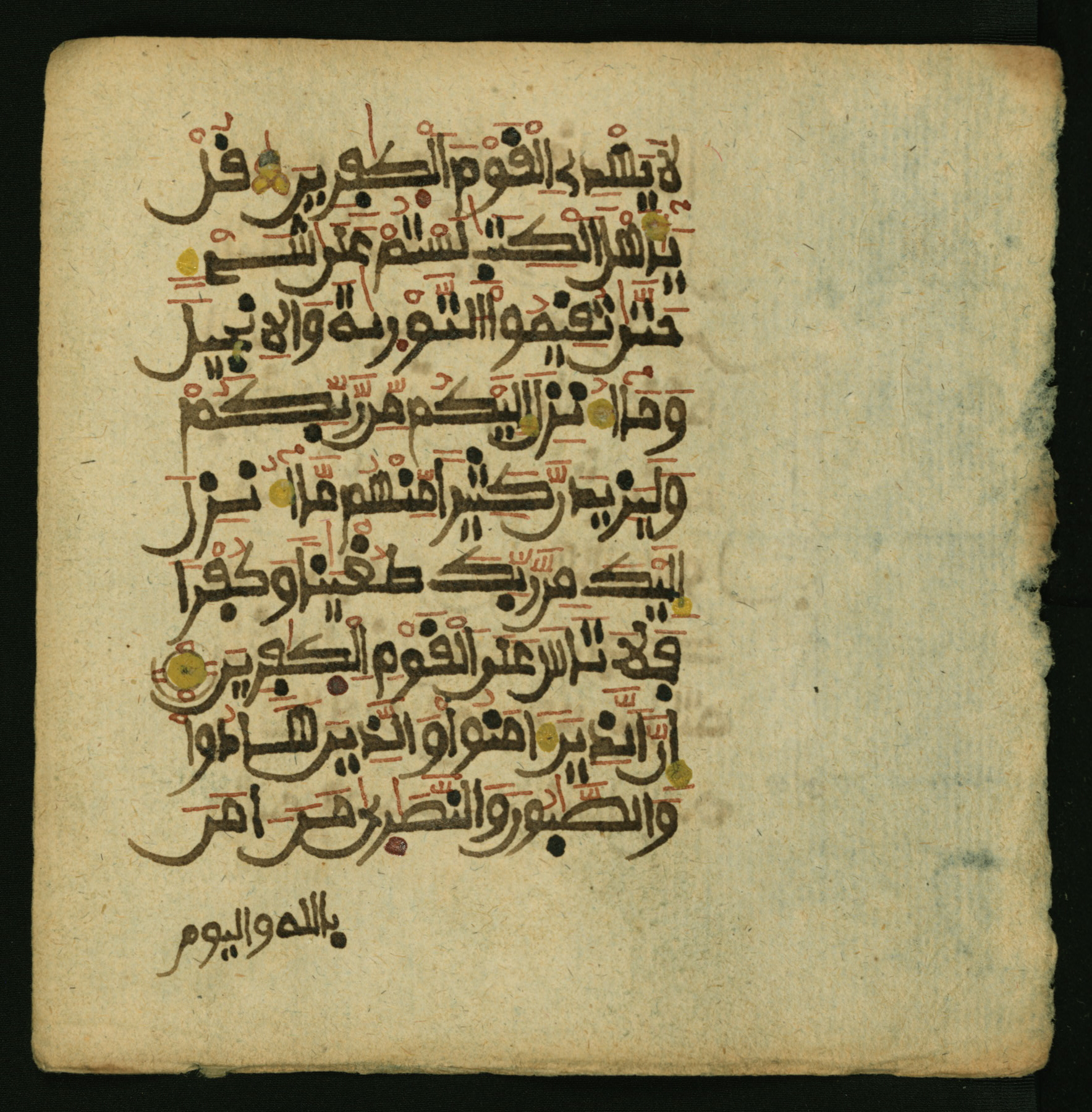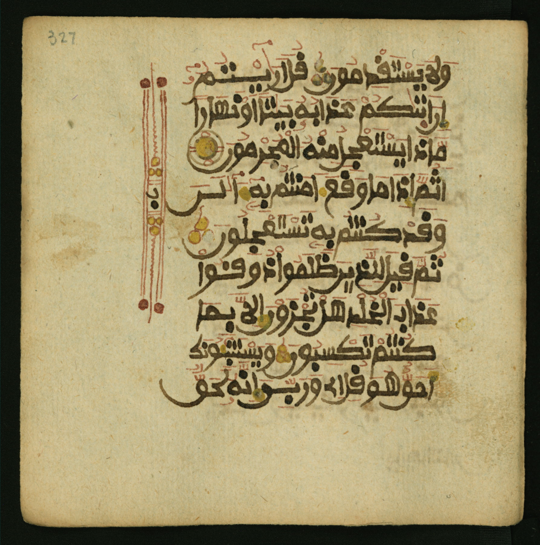 This square-format manuscript is volume 1, containing chapters 1-18 (Sūrat al-fātiḥah through Sūrat al-kahf), of an illuminated two-volume Qur'an produced in Sub-Saharan (West) Africa in the thirteenth century AH / nineteenth CE. The text is written in Sūdānī script in dark brown ink with vocalization in red on loose leaves. Chapter headings are in reddish-brown ink. Three yellow dots outlined in red arranged in a triangular form separate verses. Polychrome circular medallions as well as square and rectangular devices in a variety of patterns and colors mark textual divisions. The leaves of the text are organized between two decorated boards with geometric compositions. The pages and boards are housed in a leather pouch (satchel).