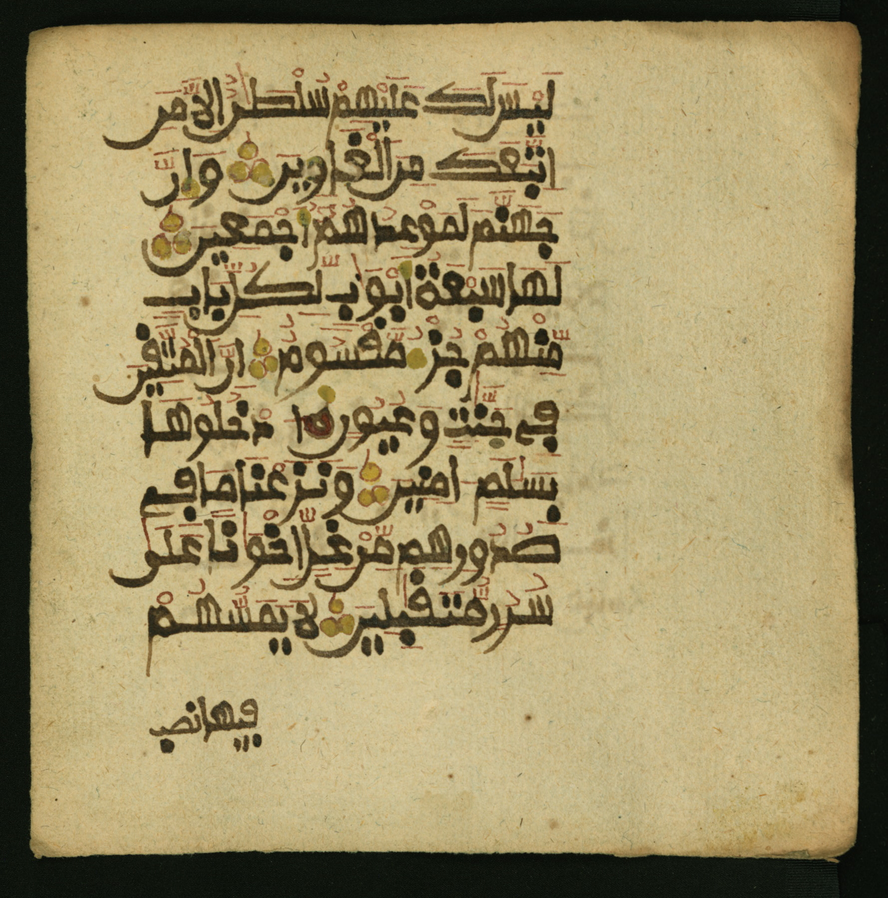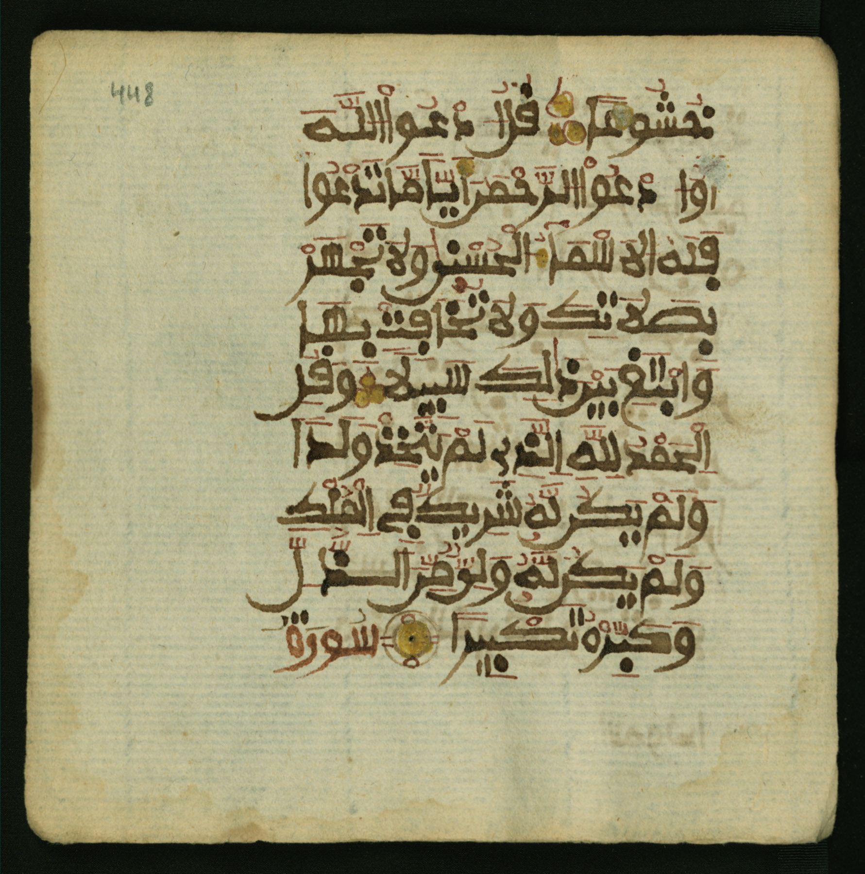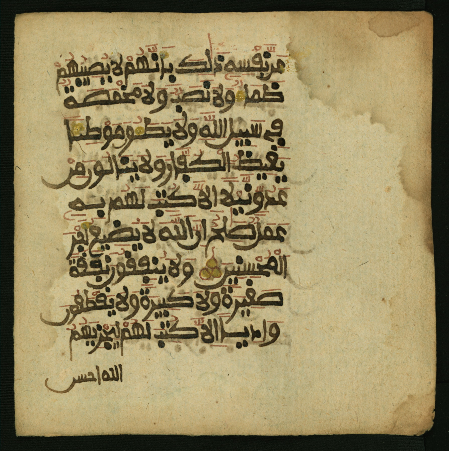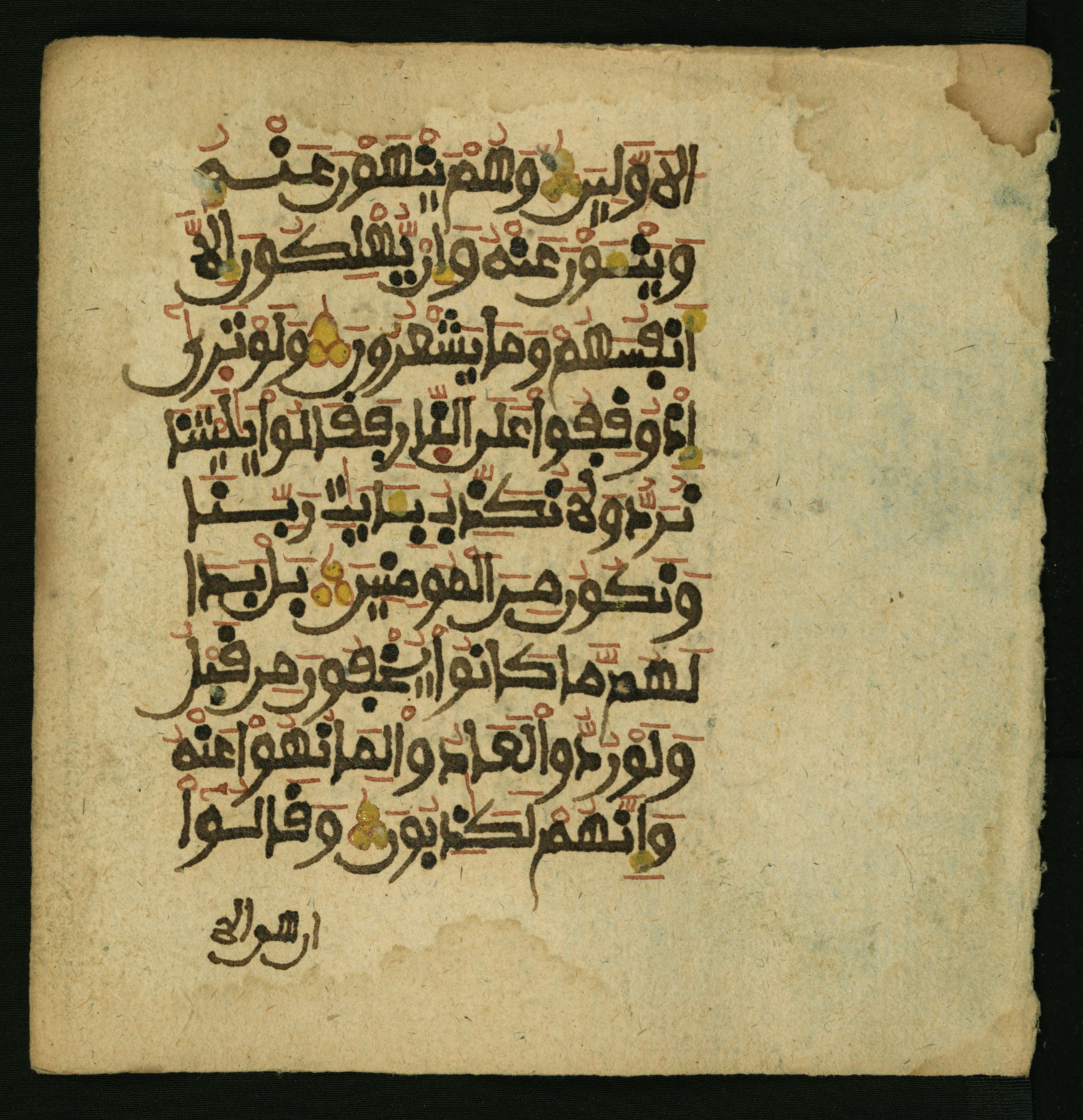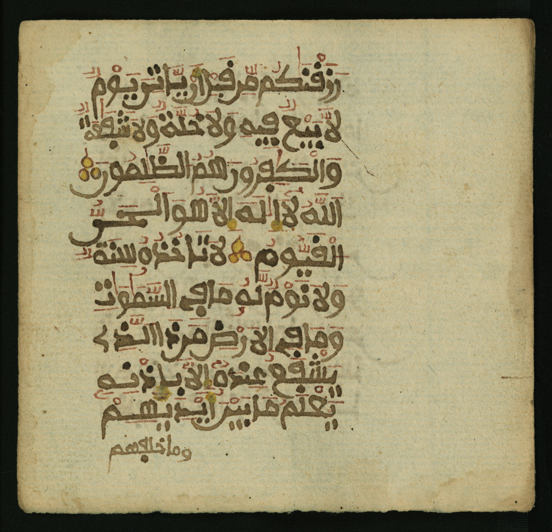 This square-format manuscript is volume 1, containing chapters 1-18 (Sūrat al-fātiḥah through Sūrat al-kahf), of an illuminated two-volume Qur'an produced in Sub-Saharan (West) Africa in the thirteenth century AH / nineteenth CE. The text is written in Sūdānī script in dark brown ink with vocalization in red on loose leaves. Chapter headings are in reddish-brown ink. Three yellow dots outlined in red arranged in a triangular form separate verses. Polychrome circular medallions as well as square and rectangular devices in a variety of patterns and colors mark textual divisions. The leaves of the text are organized between two decorated boards with geometric compositions. The pages and boards are housed in a leather pouch (satchel).