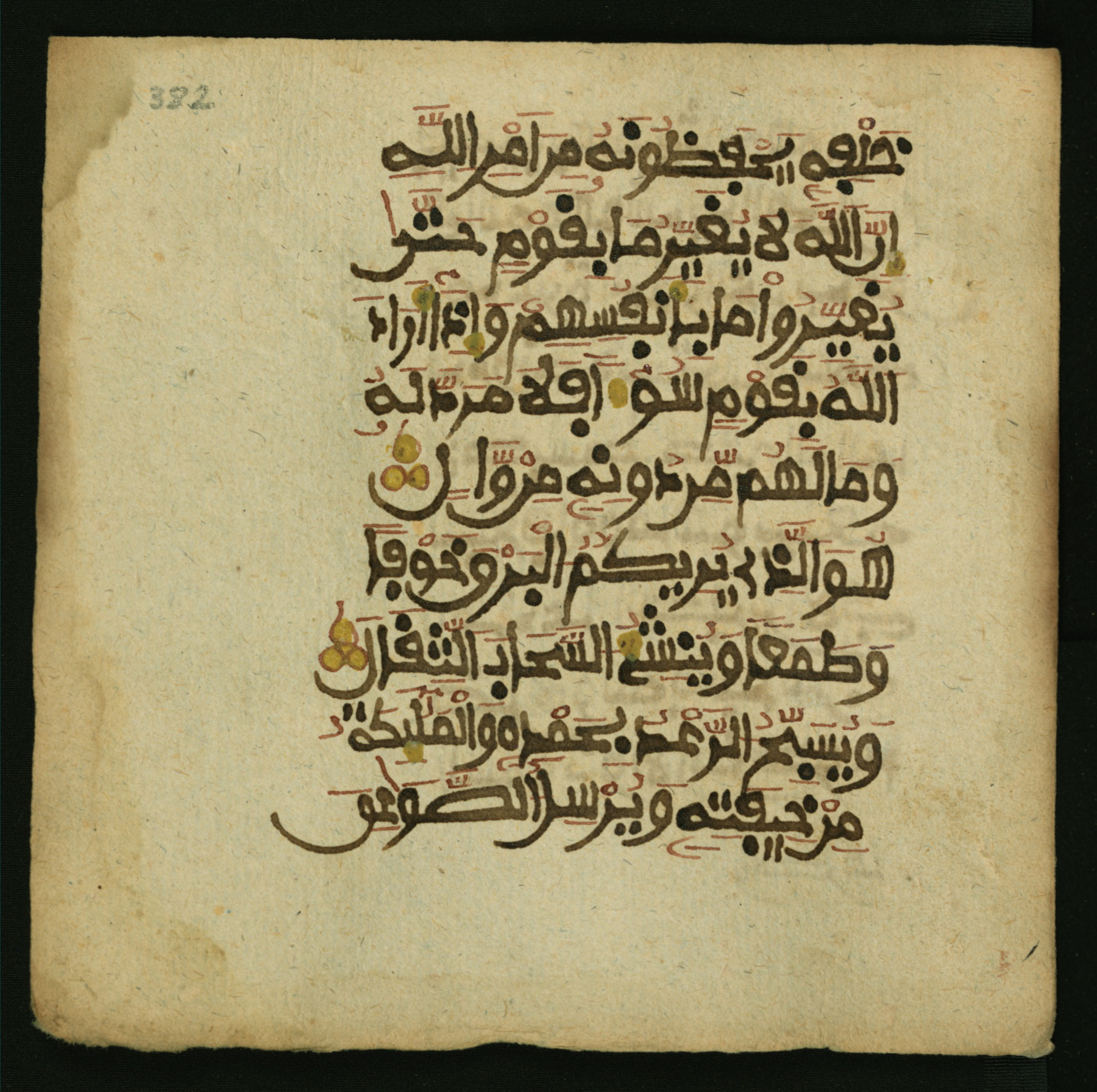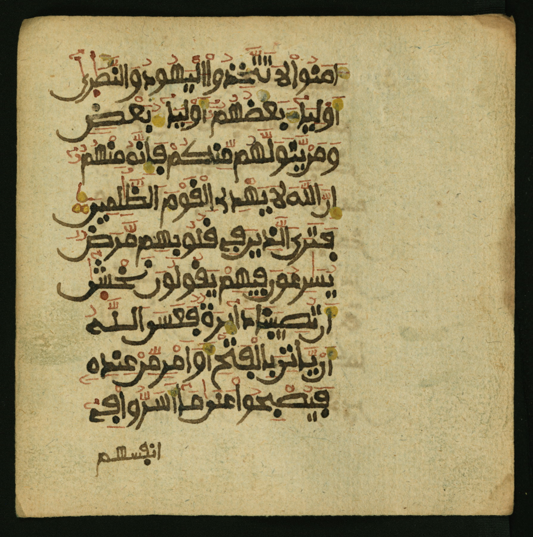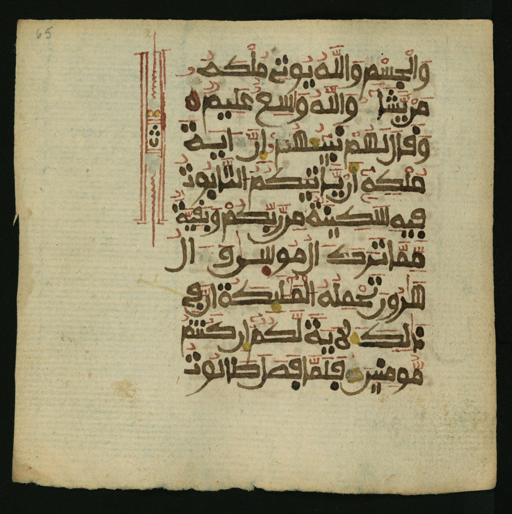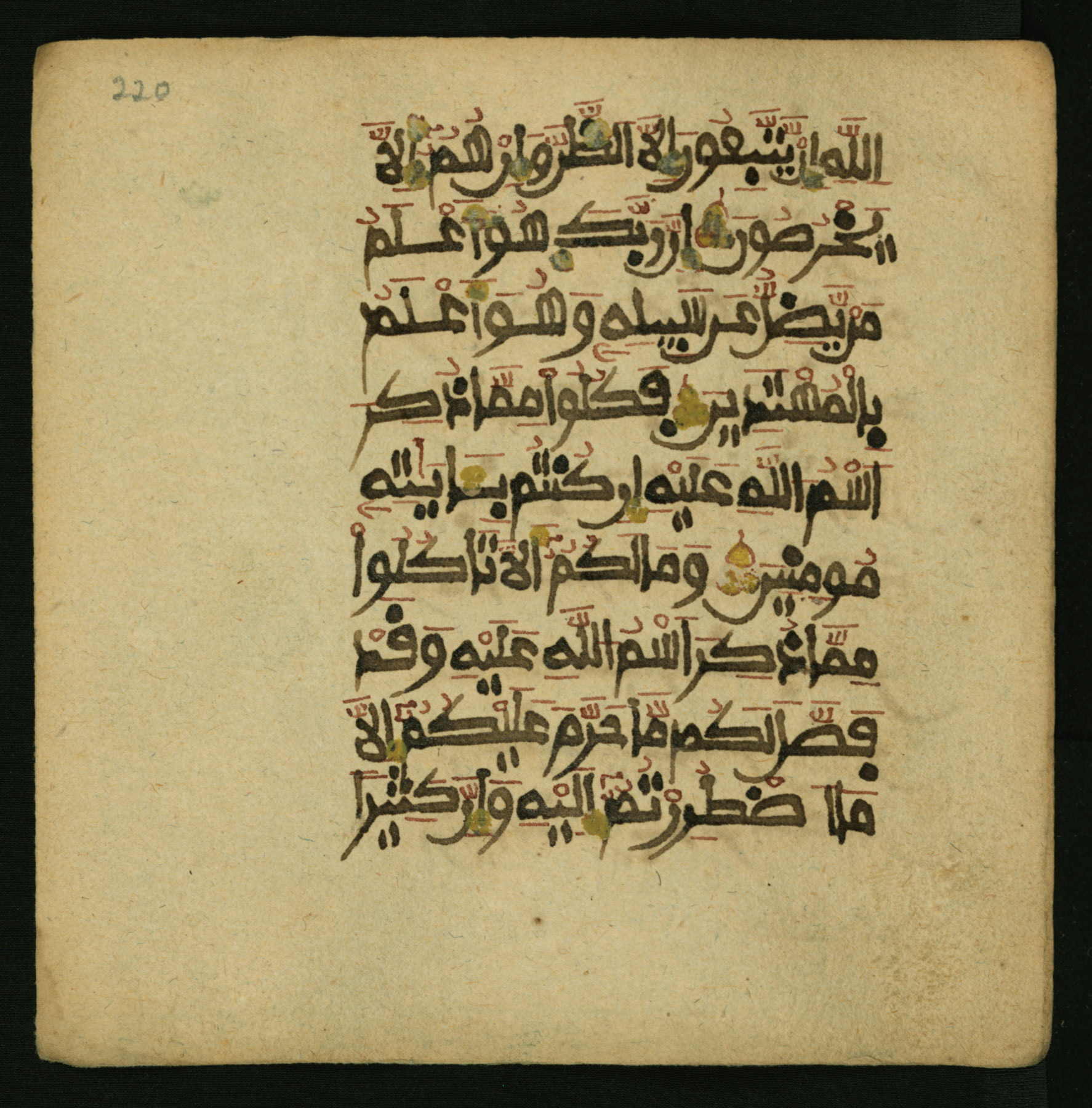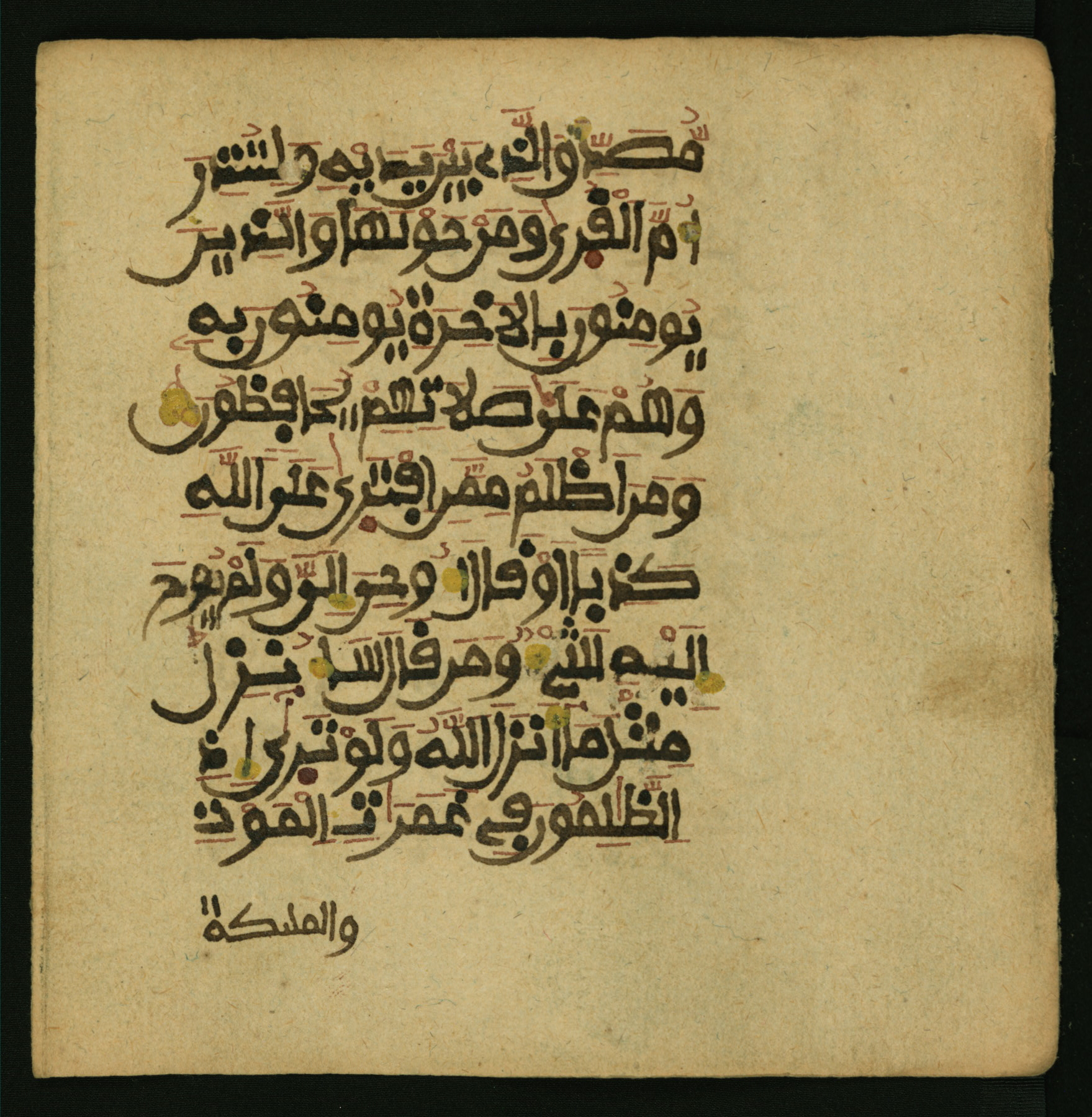 This square-format manuscript is volume 1, containing chapters 1-18 (Sūrat al-fātiḥah through Sūrat al-kahf), of an illuminated two-volume Qur'an produced in Sub-Saharan (West) Africa in the thirteenth century AH / nineteenth CE. The text is written in Sūdānī script in dark brown ink with vocalization in red on loose leaves. Chapter headings are in reddish-brown ink. Three yellow dots outlined in red arranged in a triangular form separate verses. Polychrome circular medallions as well as square and rectangular devices in a variety of patterns and colors mark textual divisions. The leaves of the text are organized between two decorated boards with geometric compositions. The pages and boards are housed in a leather pouch (satchel).
