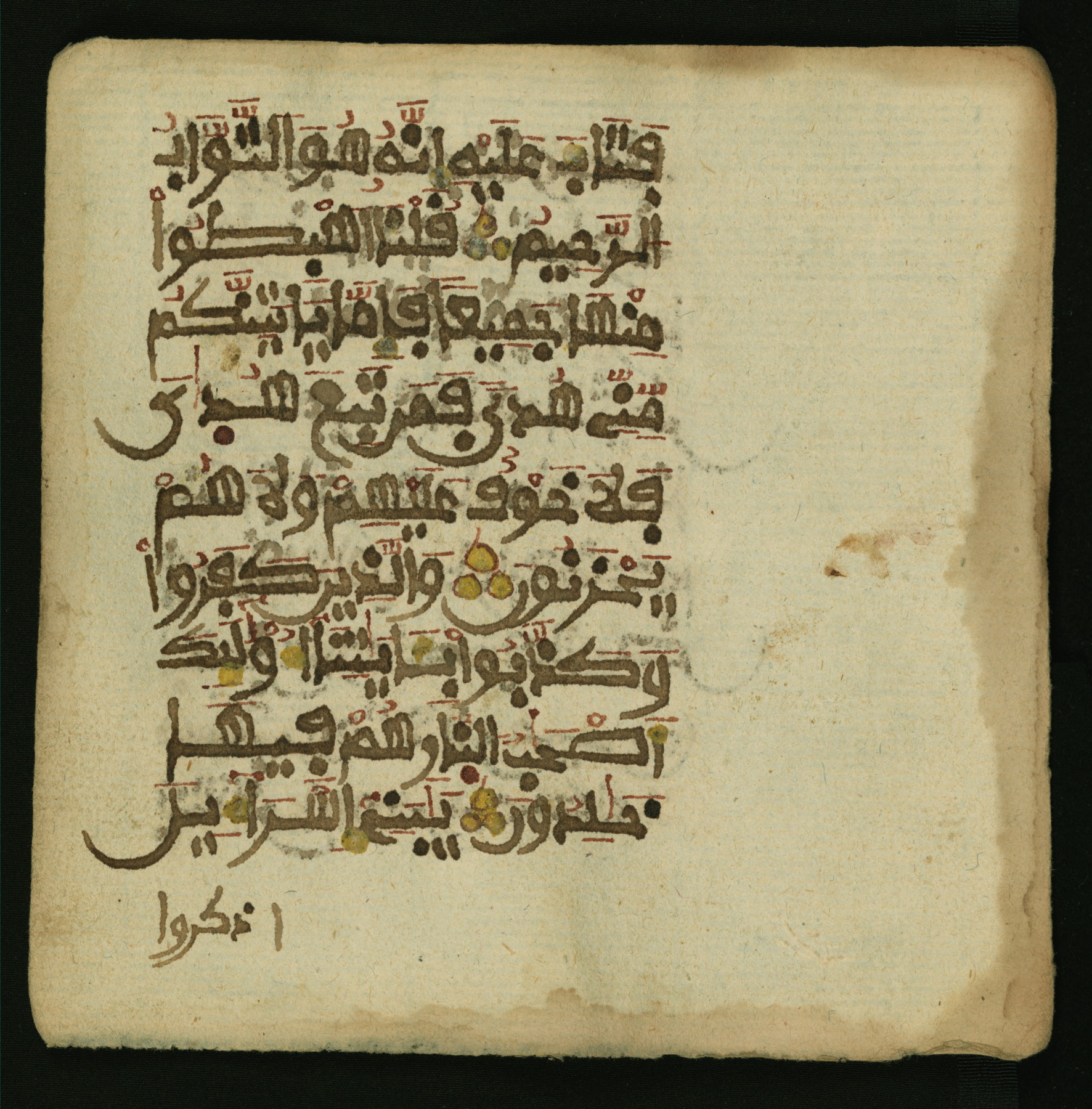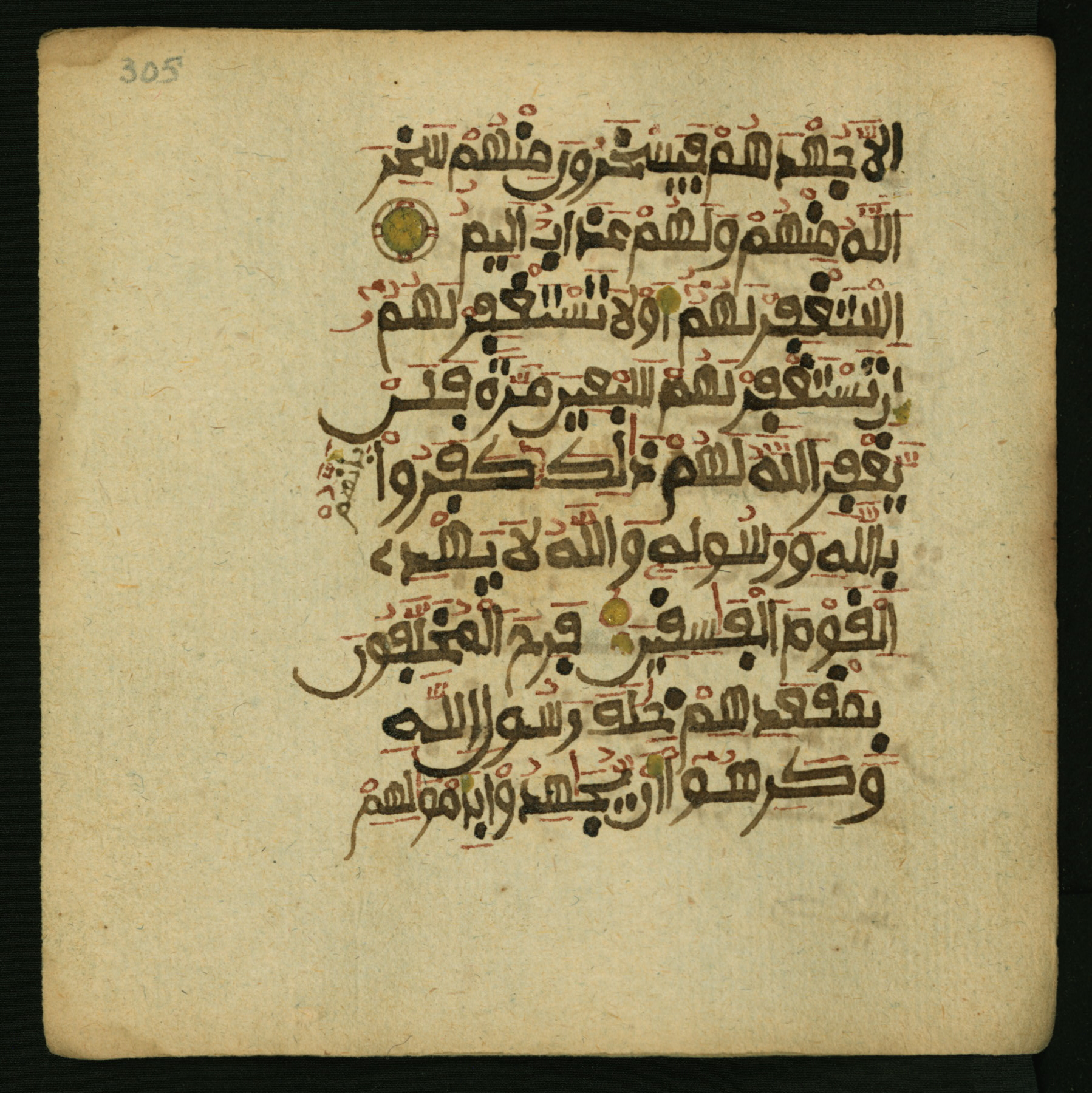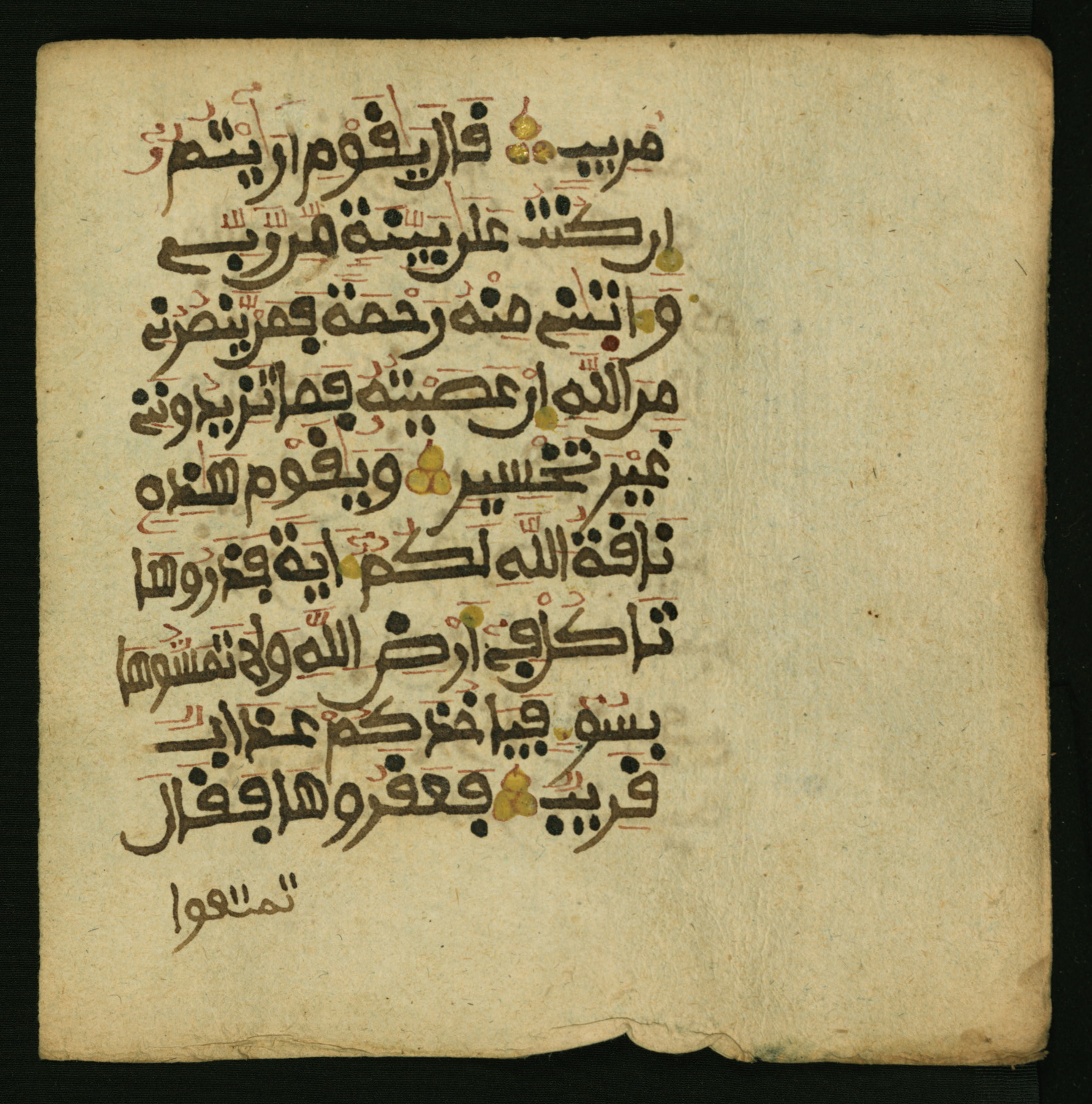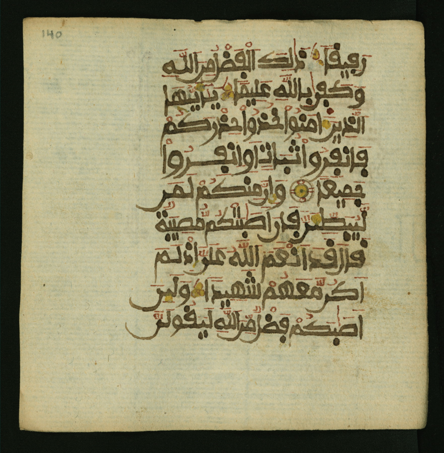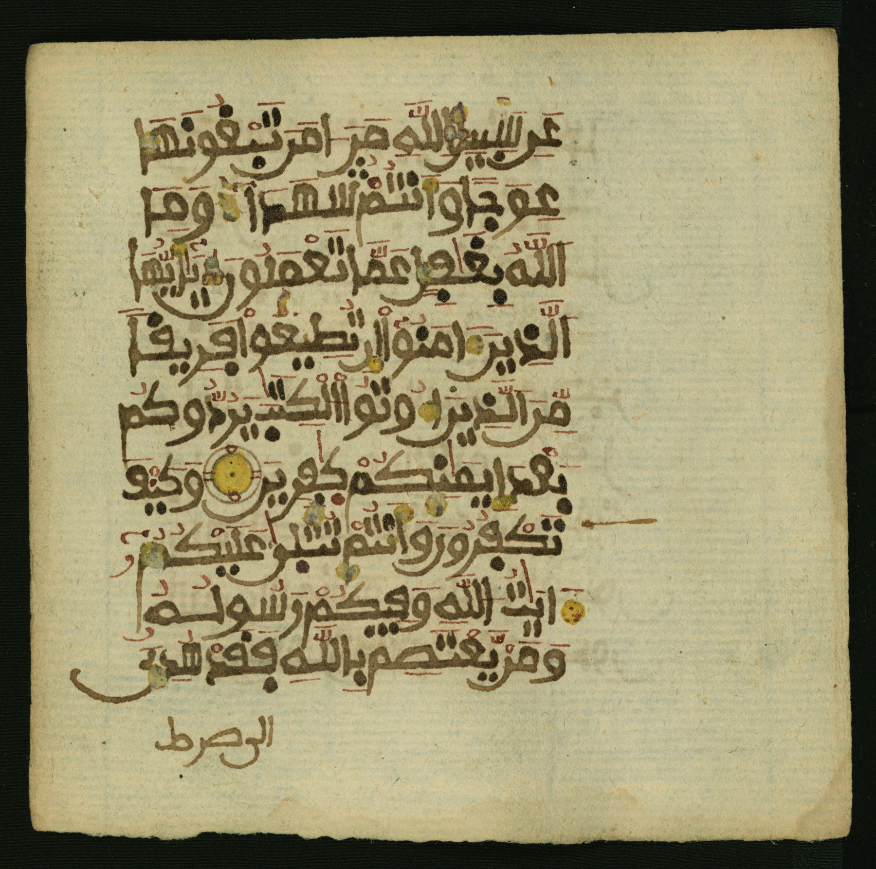 This square-format manuscript is volume 1, containing chapters 1-18 (Sūrat al-fātiḥah through Sūrat al-kahf), of an illuminated two-volume Qur'an produced in Sub-Saharan (West) Africa in the thirteenth century AH / nineteenth CE. The text is written in Sūdānī script in dark brown ink with vocalization in red on loose leaves. Chapter headings are in reddish-brown ink. Three yellow dots outlined in red arranged in a triangular form separate verses. Polychrome circular medallions as well as square and rectangular devices in a variety of patterns and colors mark textual divisions. The leaves of the text are organized between two decorated boards with geometric compositions. The pages and boards are housed in a leather pouch (satchel).