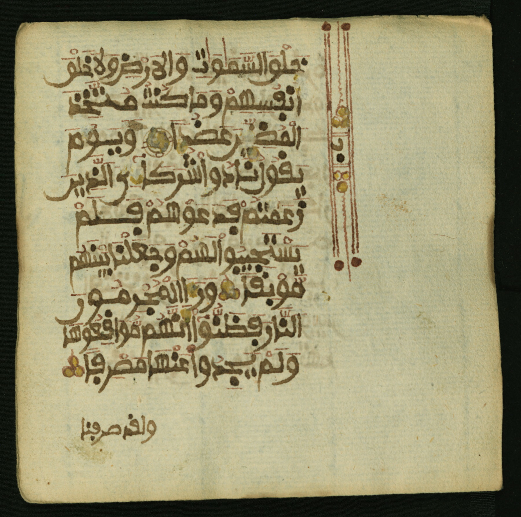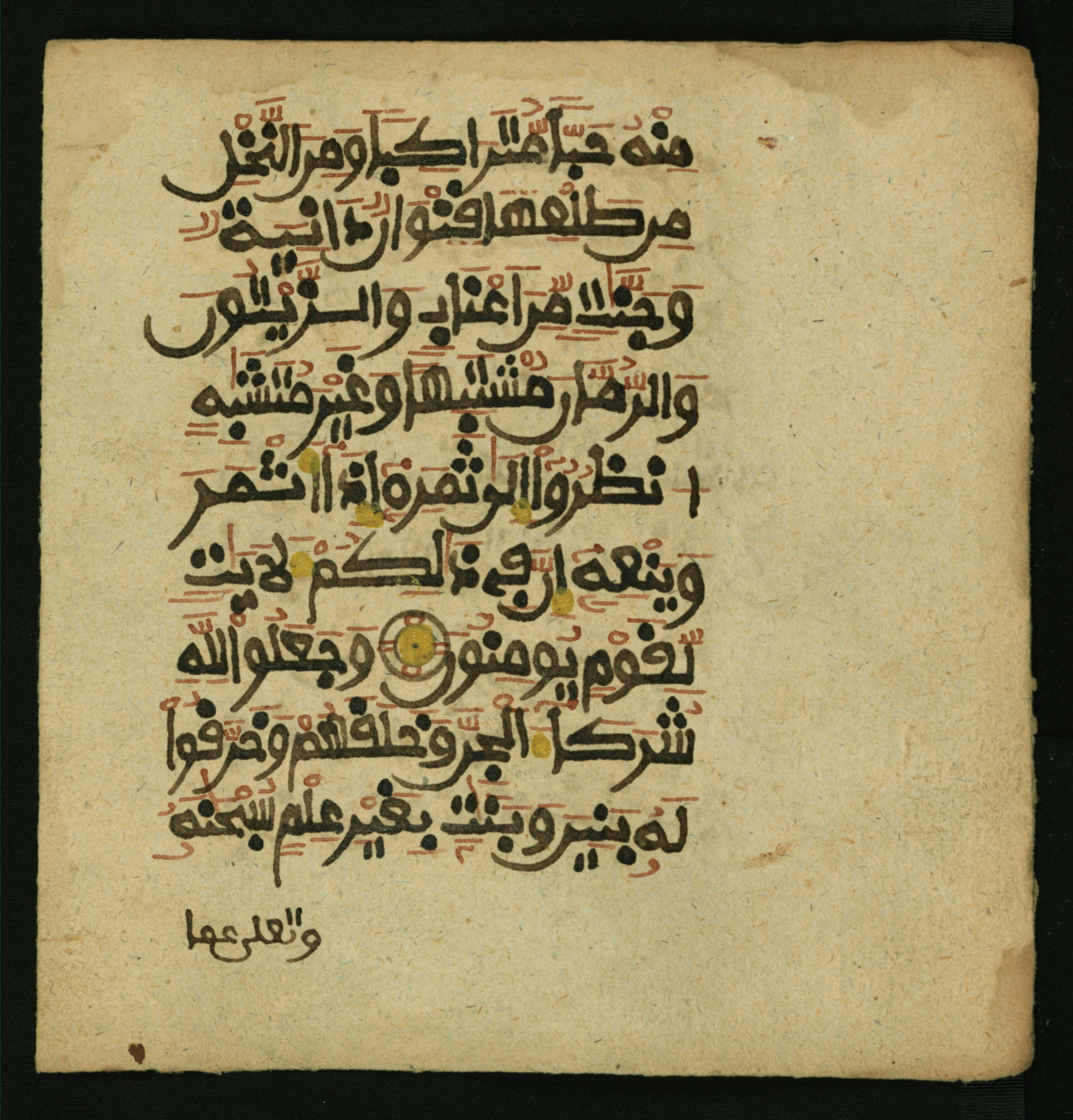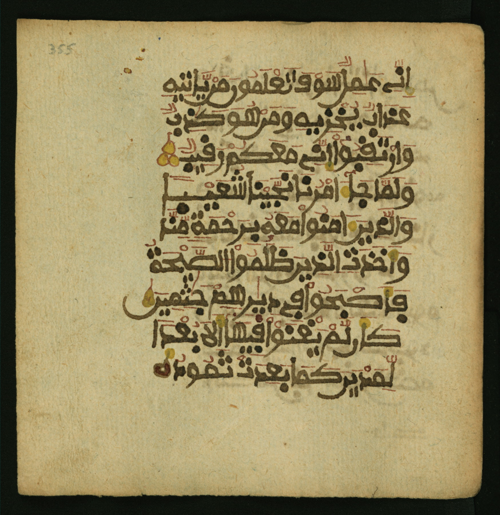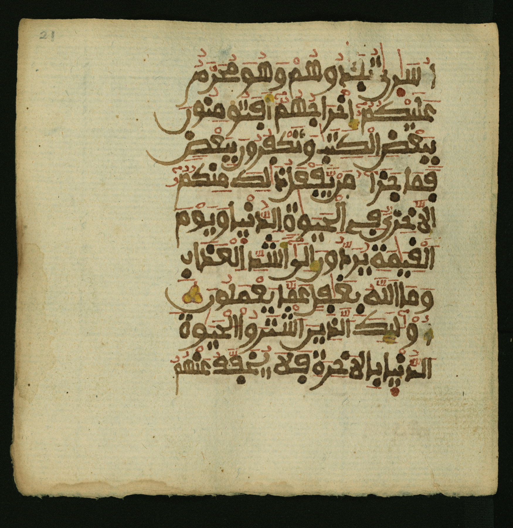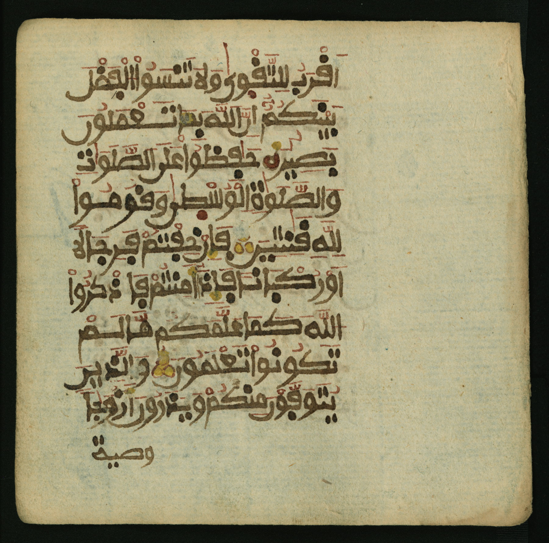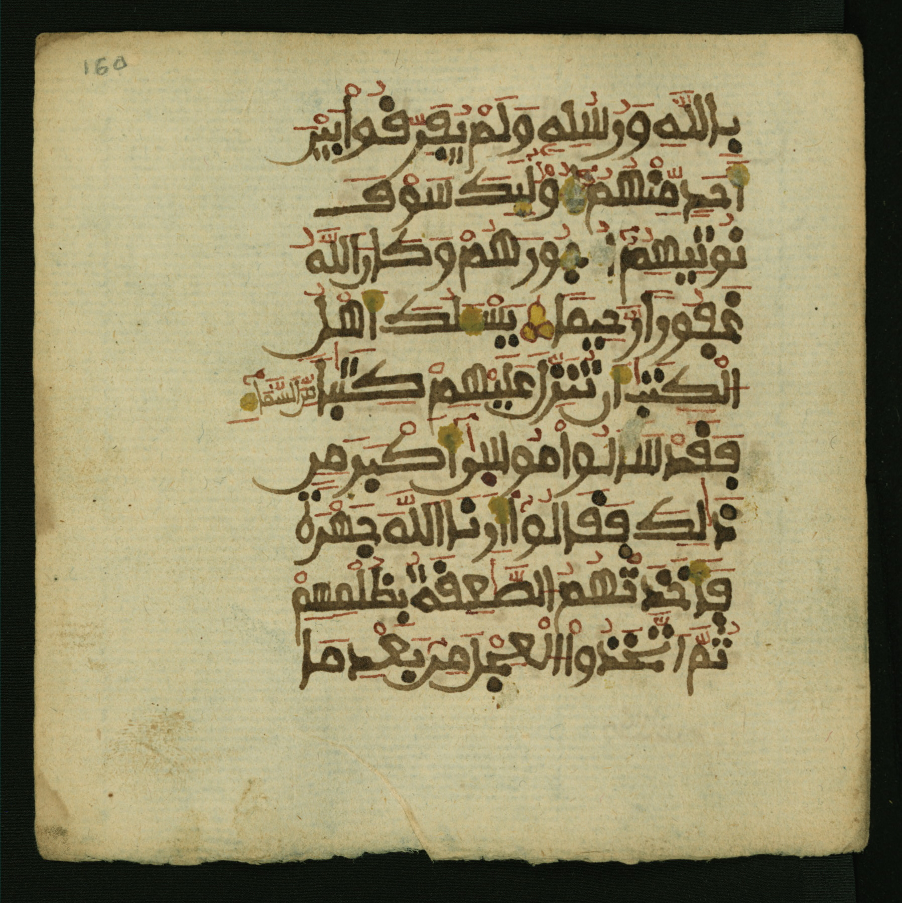 This square-format manuscript is volume 1, containing chapters 1-18 (Sūrat al-fātiḥah through Sūrat al-kahf), of an illuminated two-volume Qur'an produced in Sub-Saharan (West) Africa in the thirteenth century AH / nineteenth CE. The text is written in Sūdānī script in dark brown ink with vocalization in red on loose leaves. Chapter headings are in reddish-brown ink. Three yellow dots outlined in red arranged in a triangular form separate verses. Polychrome circular medallions as well as square and rectangular devices in a variety of patterns and colors mark textual divisions. The leaves of the text are organized between two decorated boards with geometric compositions. The pages and boards are housed in a leather pouch (satchel).