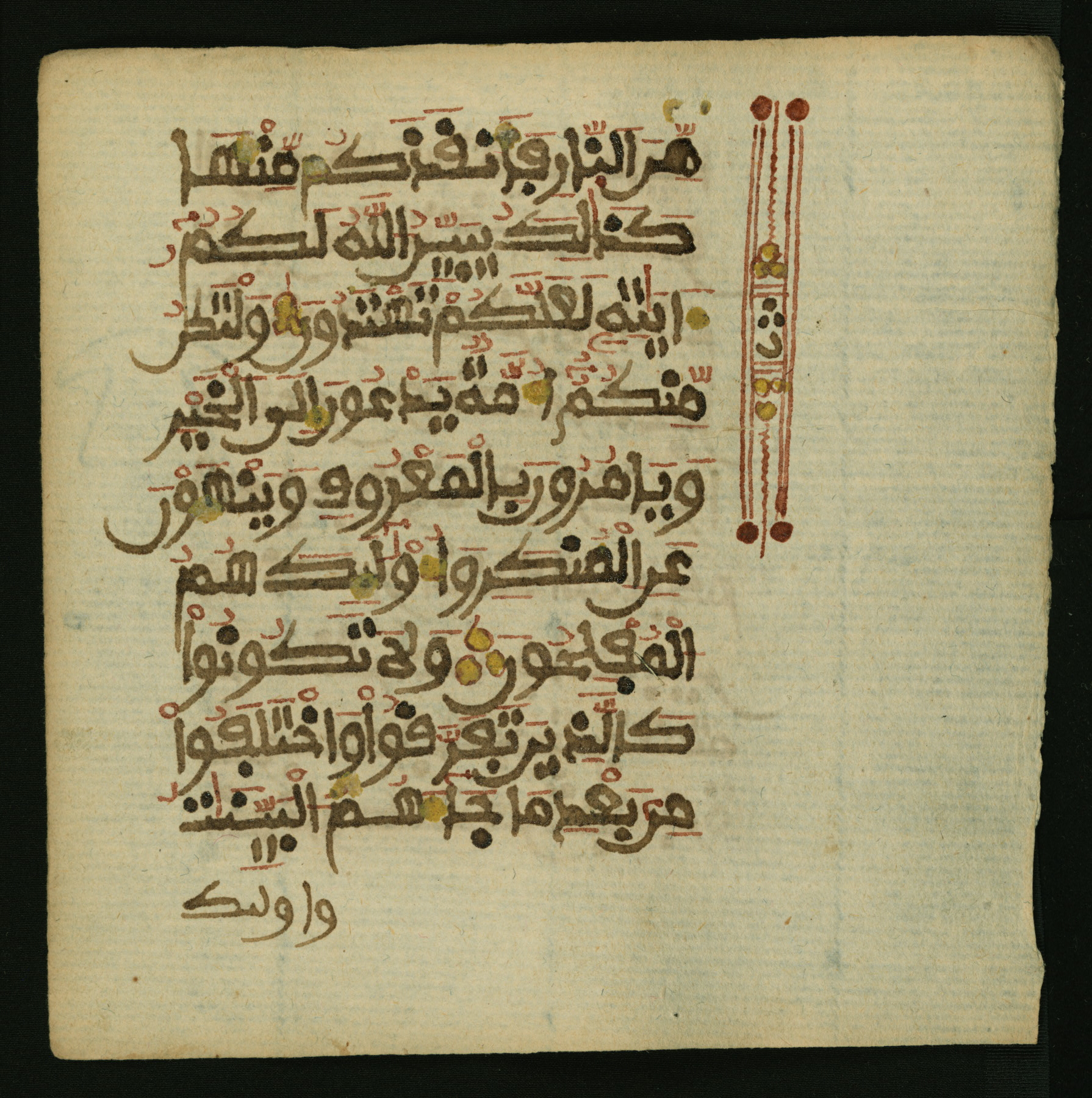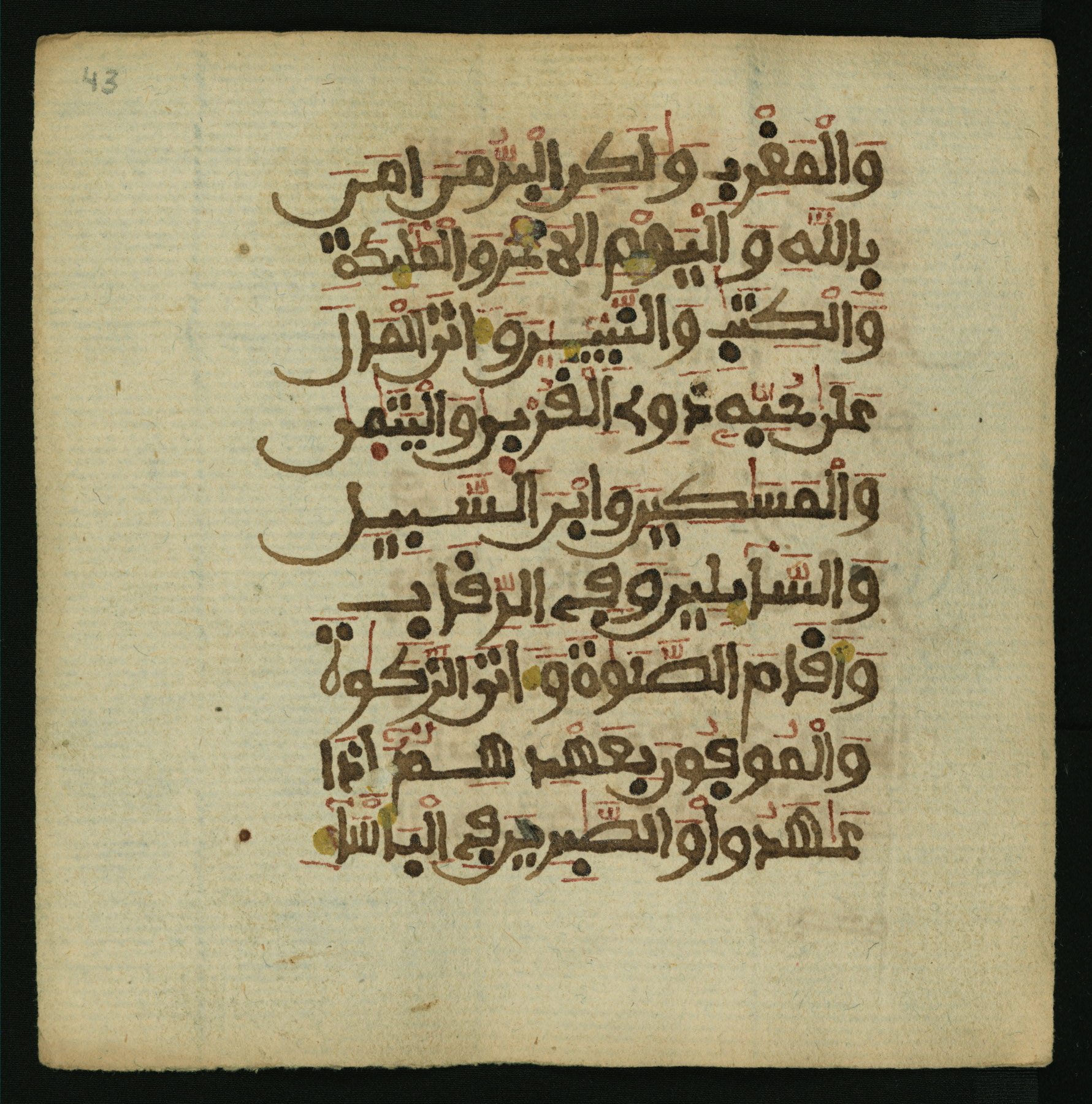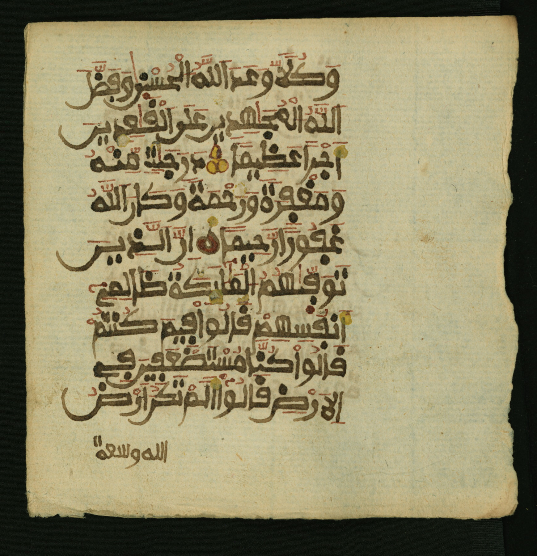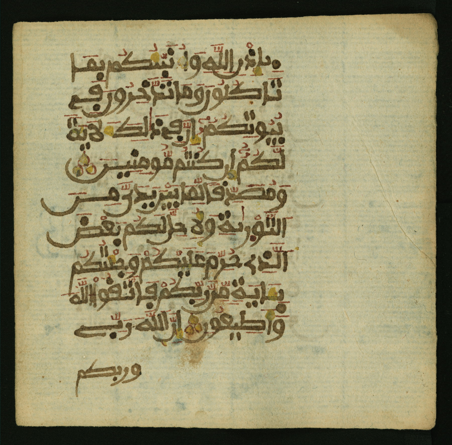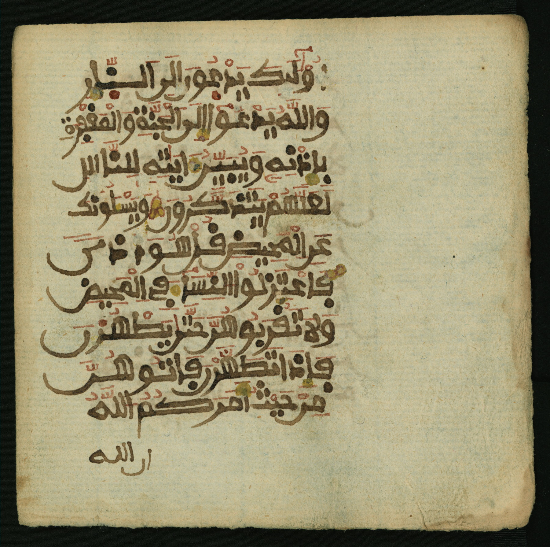 This square-format manuscript is volume 1, containing chapters 1-18 (Sūrat al-fātiḥah through Sūrat al-kahf), of an illuminated two-volume Qur'an produced in Sub-Saharan (West) Africa in the thirteenth century AH / nineteenth CE. The text is written in Sūdānī script in dark brown ink with vocalization in red on loose leaves. Chapter headings are in reddish-brown ink. Three yellow dots outlined in red arranged in a triangular form separate verses. Polychrome circular medallions as well as square and rectangular devices in a variety of patterns and colors mark textual divisions. The leaves of the text are organized between two decorated boards with geometric compositions. The pages and boards are housed in a leather pouch (satchel).