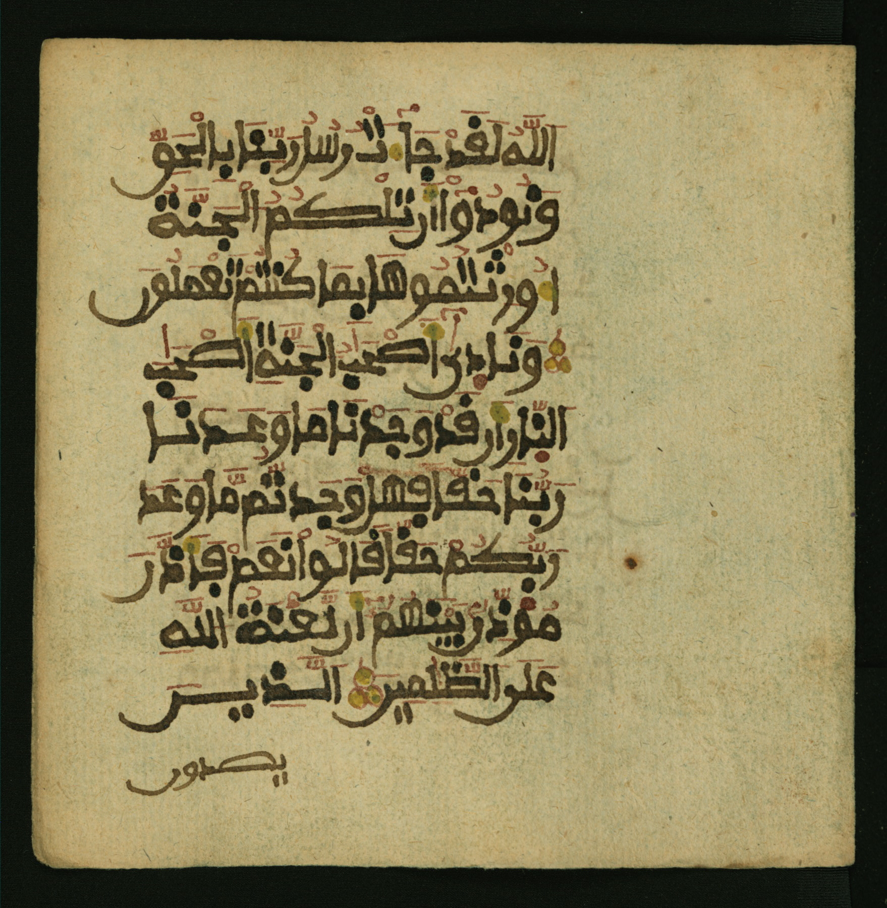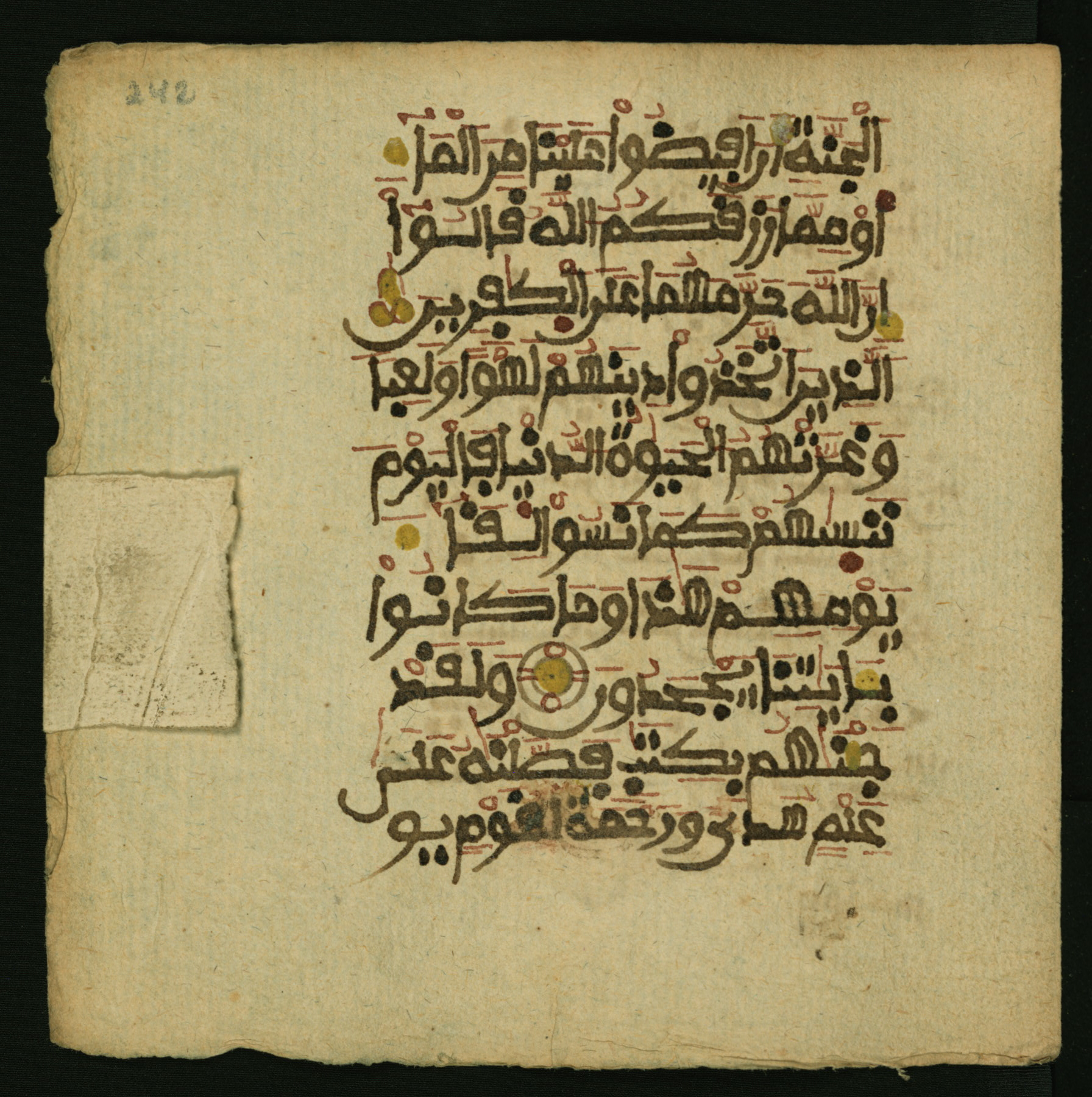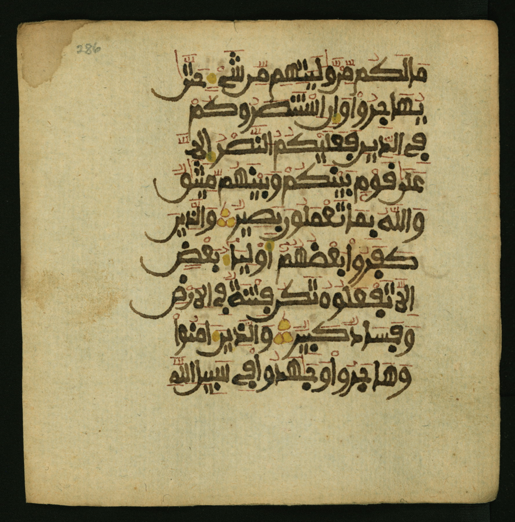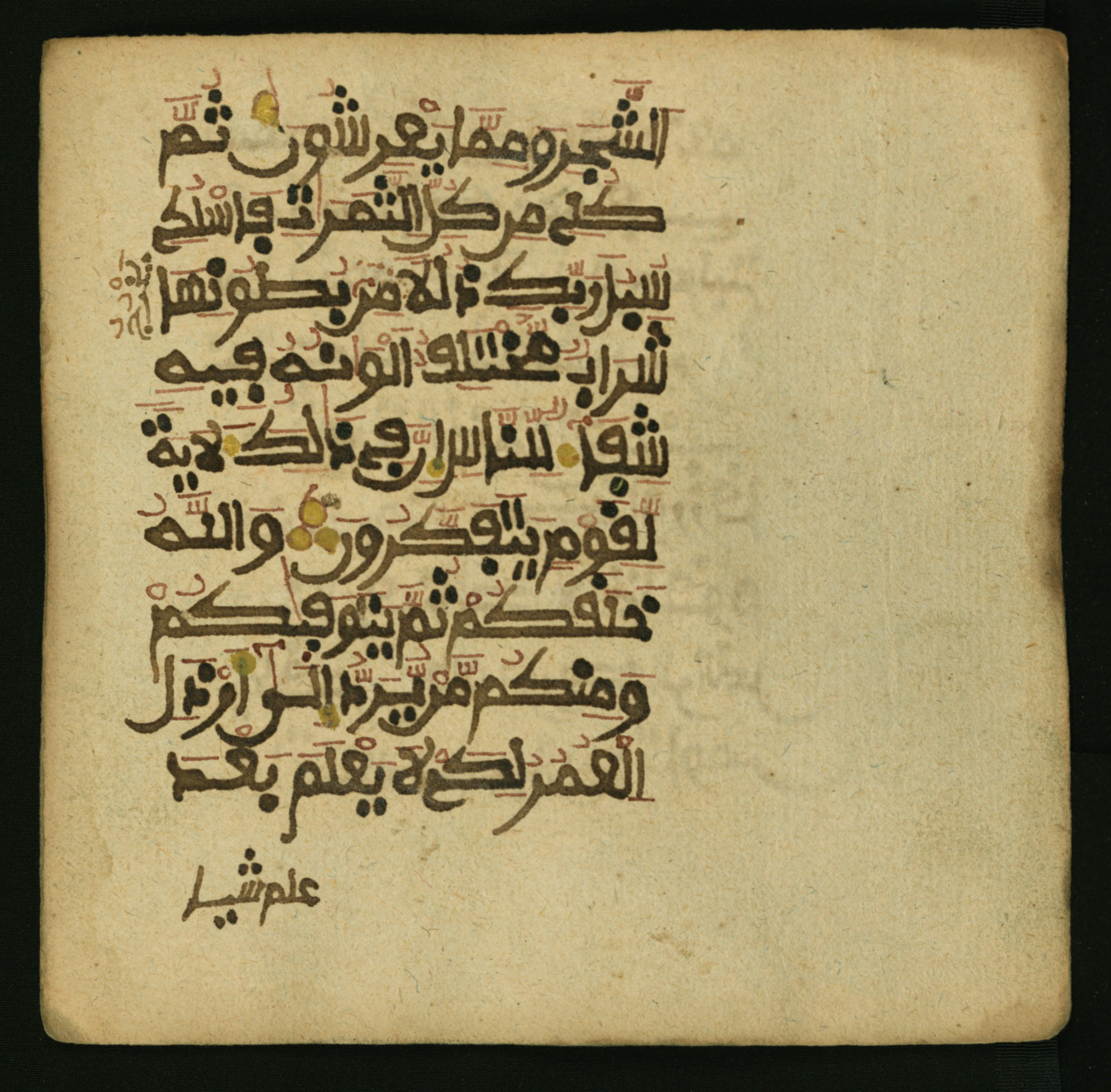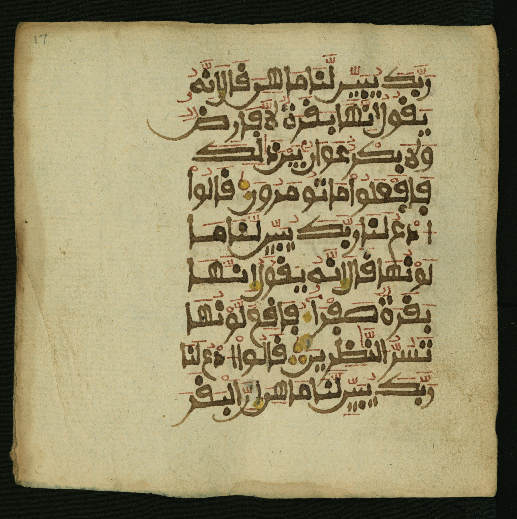 This square-format manuscript is volume 1, containing chapters 1-18 (Sūrat al-fātiḥah through Sūrat al-kahf), of an illuminated two-volume Qur'an produced in Sub-Saharan (West) Africa in the thirteenth century AH / nineteenth CE. The text is written in Sūdānī script in dark brown ink with vocalization in red on loose leaves. Chapter headings are in reddish-brown ink. Three yellow dots outlined in red arranged in a triangular form separate verses. Polychrome circular medallions as well as square and rectangular devices in a variety of patterns and colors mark textual divisions. The leaves of the text are organized between two decorated boards with geometric compositions. The pages and boards are housed in a leather pouch (satchel).