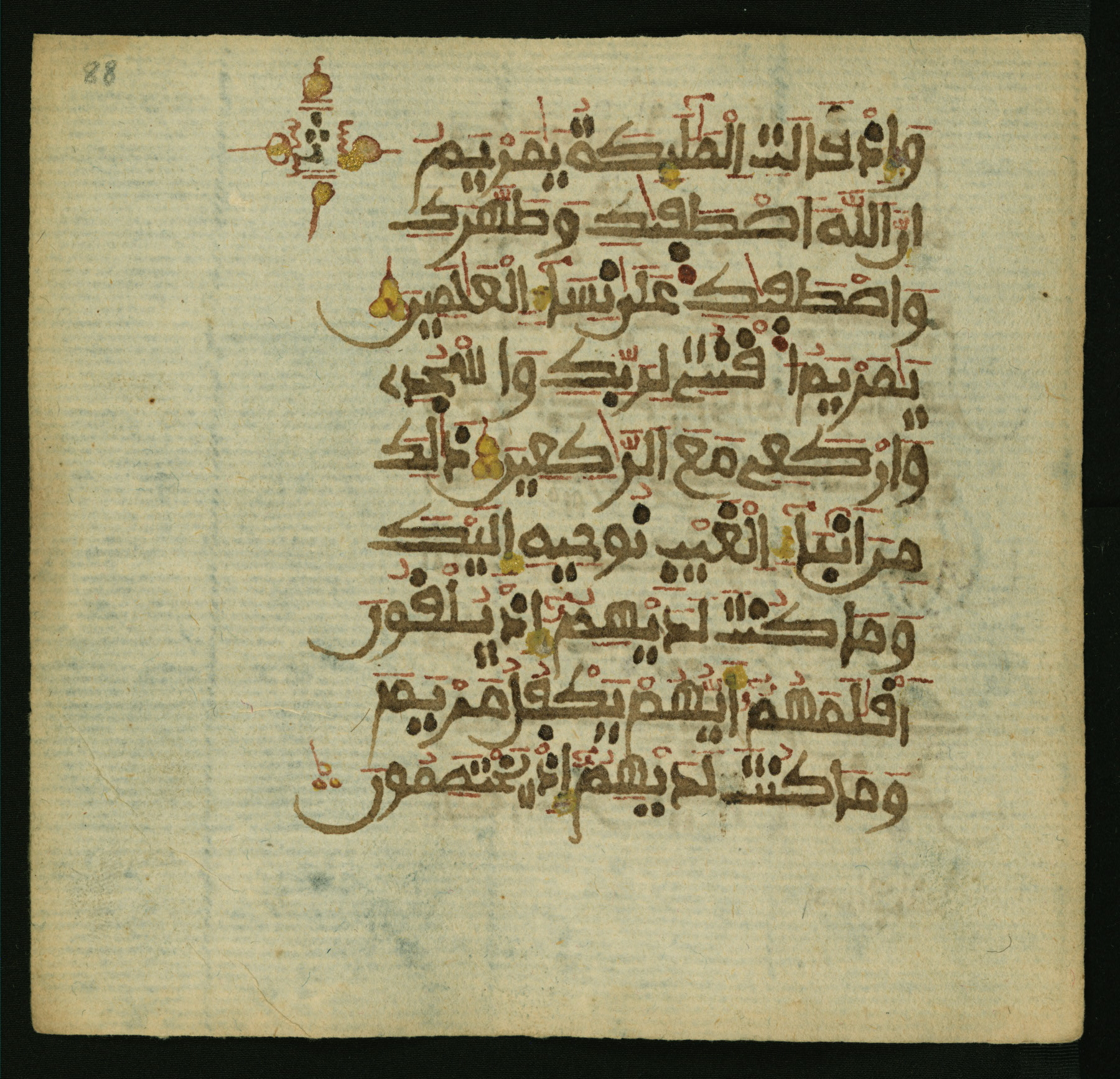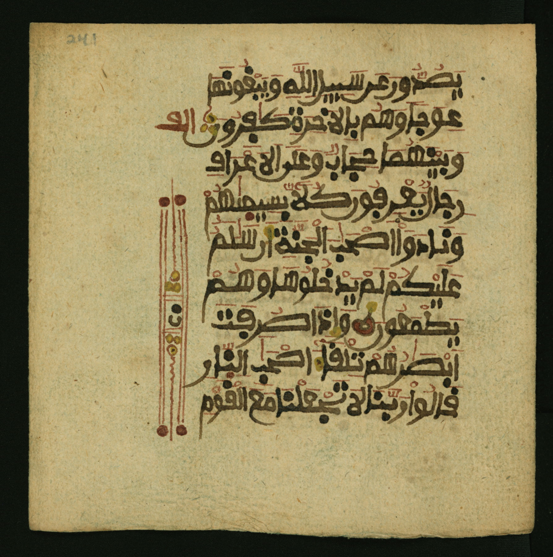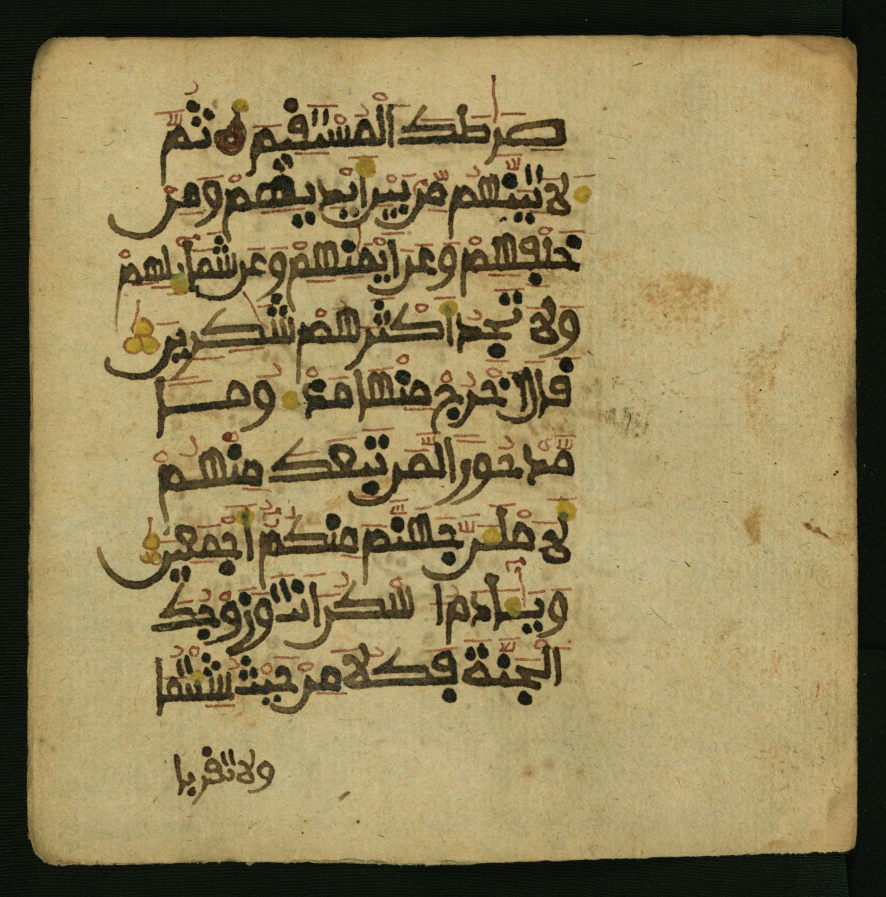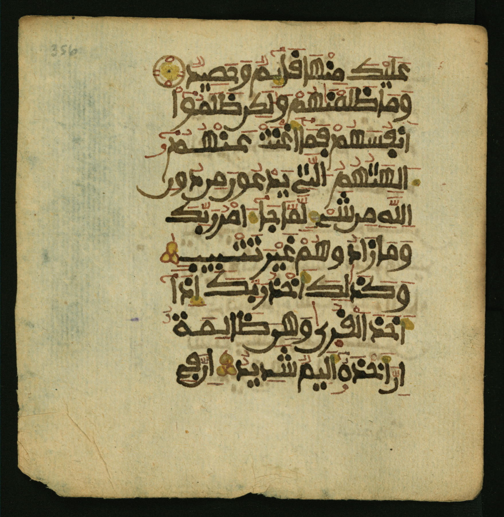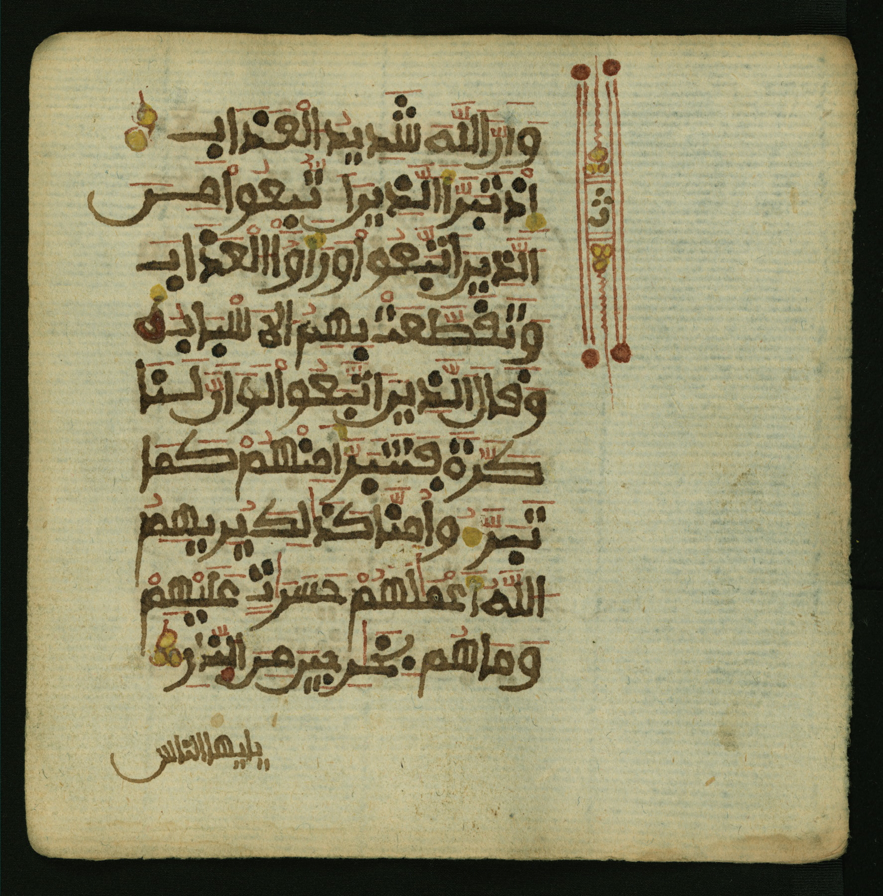 This square-format manuscript is volume 1, containing chapters 1-18 (Sūrat al-fātiḥah through Sūrat al-kahf), of an illuminated two-volume Qur'an produced in Sub-Saharan (West) Africa in the thirteenth century AH / nineteenth CE. The text is written in Sūdānī script in dark brown ink with vocalization in red on loose leaves. Chapter headings are in reddish-brown ink. Three yellow dots outlined in red arranged in a triangular form separate verses. Polychrome circular medallions as well as square and rectangular devices in a variety of patterns and colors mark textual divisions. The leaves of the text are organized between two decorated boards with geometric compositions. The pages and boards are housed in a leather pouch (satchel).