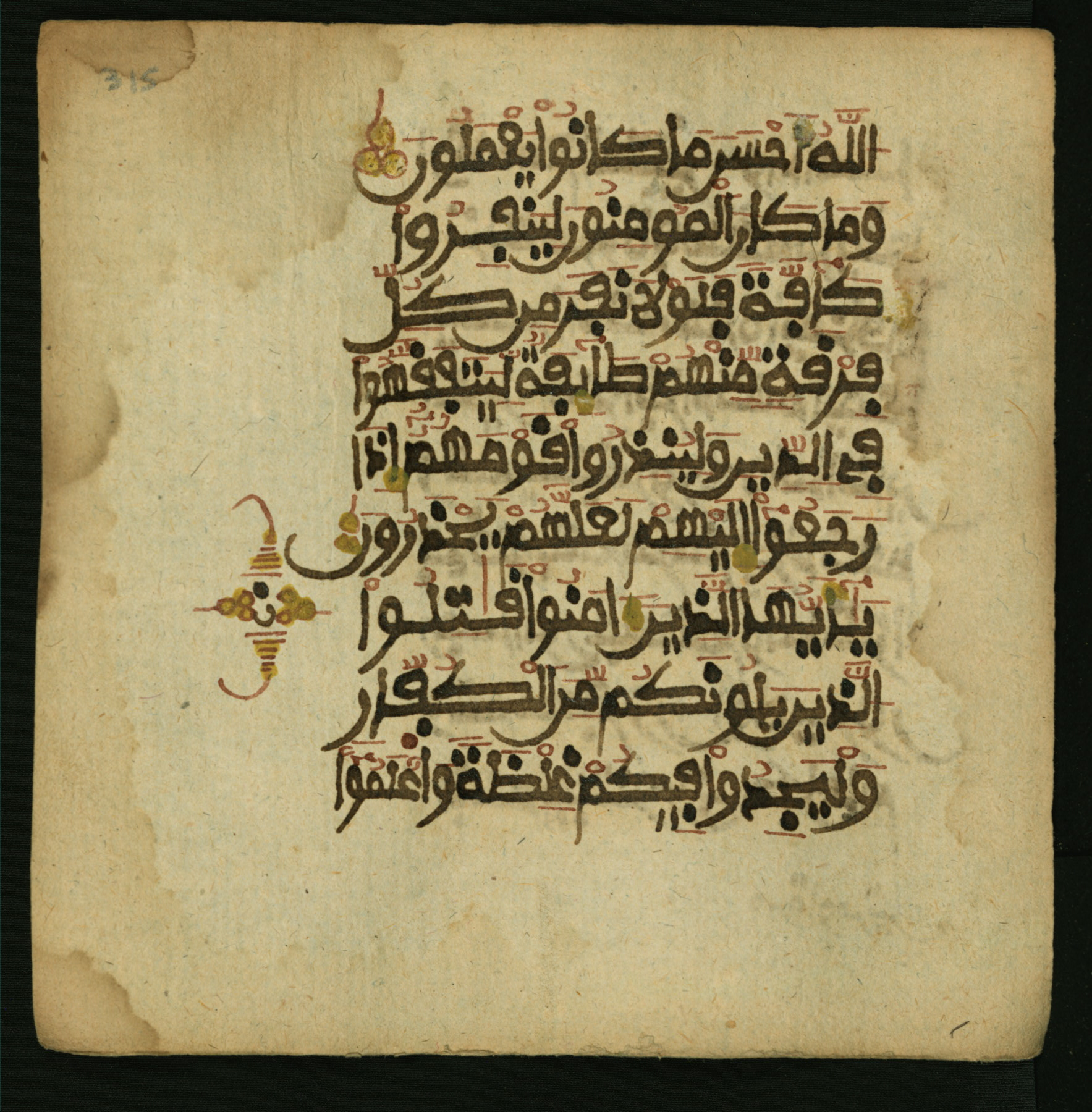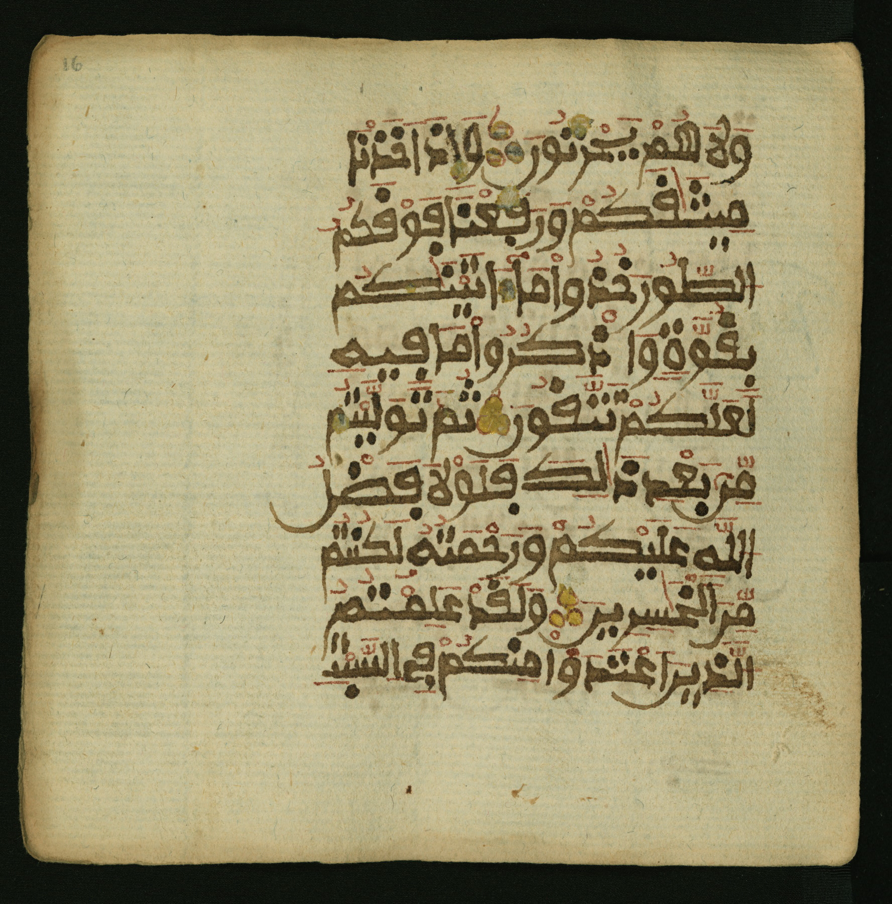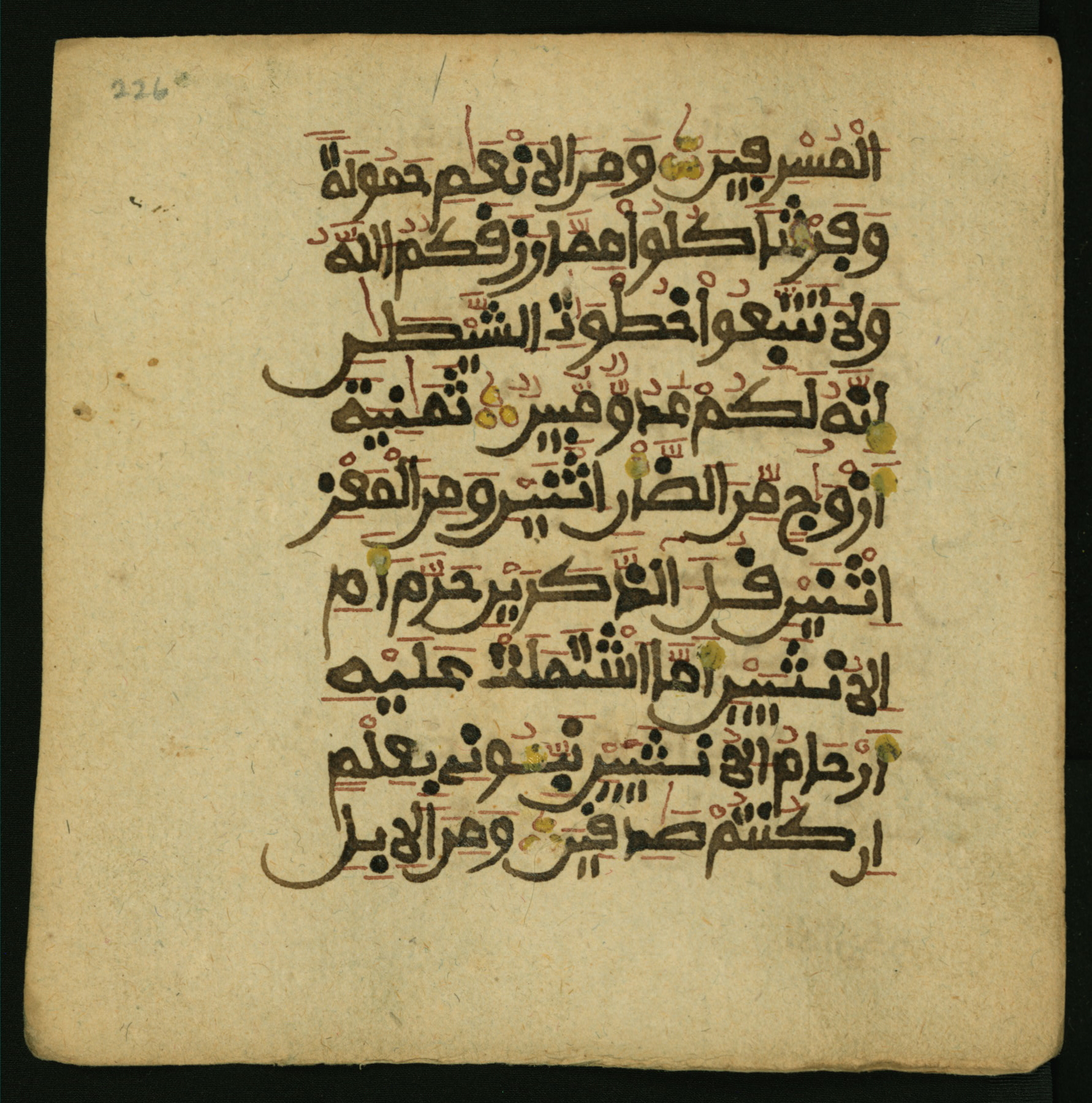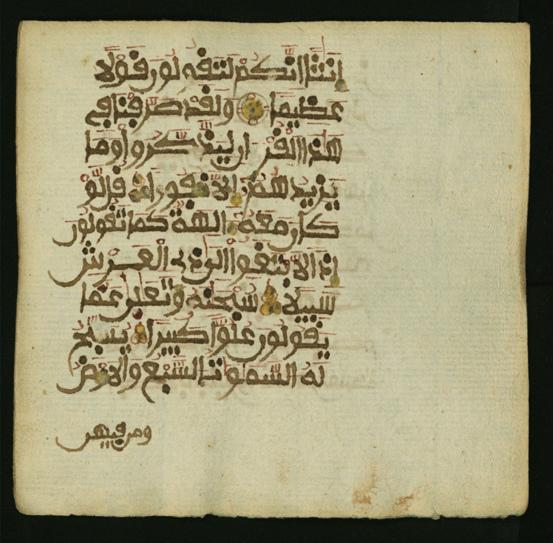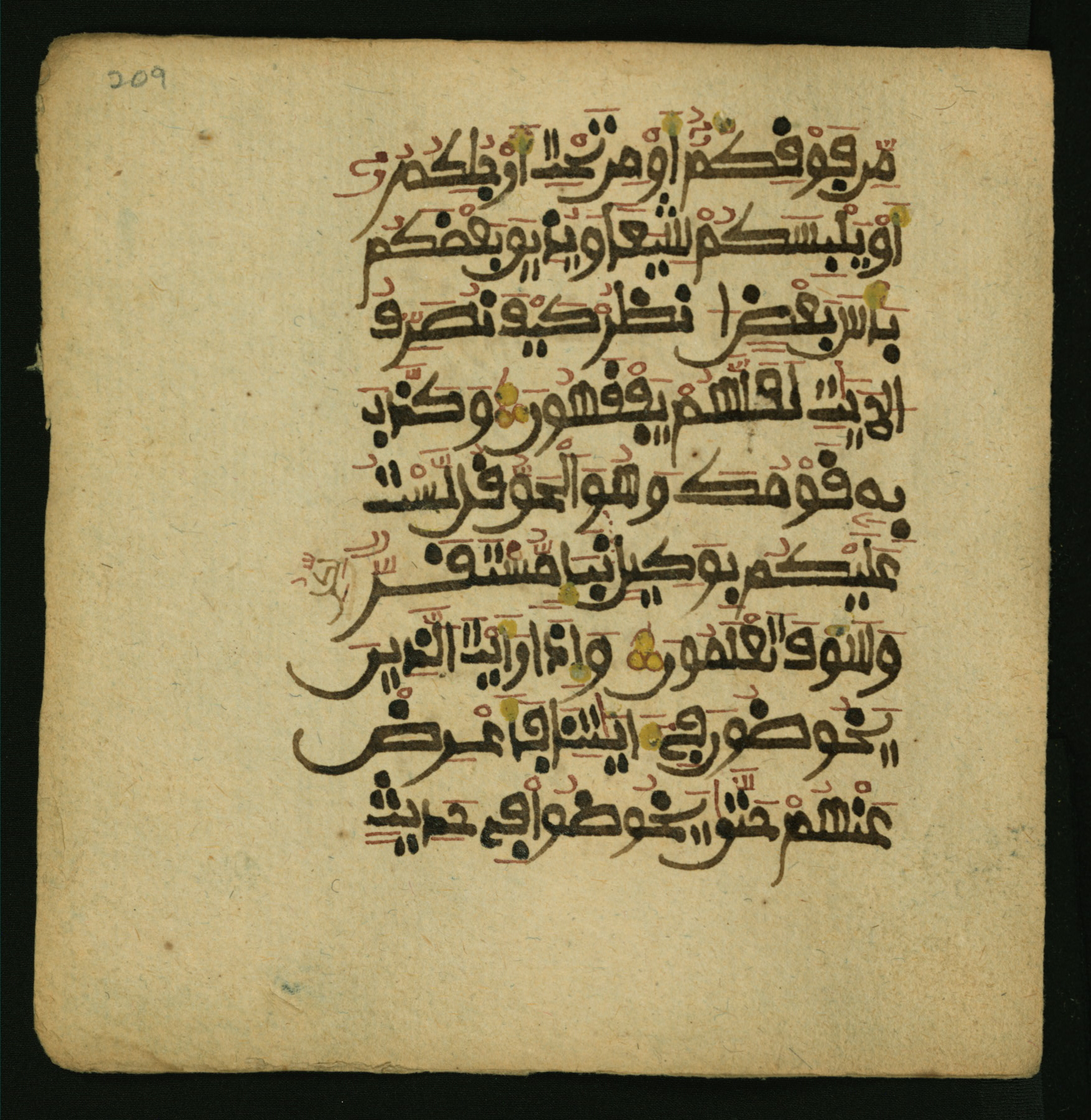 This square-format manuscript is volume 1, containing chapters 1-18 (Sūrat al-fātiḥah through Sūrat al-kahf), of an illuminated two-volume Qur'an produced in Sub-Saharan (West) Africa in the thirteenth century AH / nineteenth CE. The text is written in Sūdānī script in dark brown ink with vocalization in red on loose leaves. Chapter headings are in reddish-brown ink. Three yellow dots outlined in red arranged in a triangular form separate verses. Polychrome circular medallions as well as square and rectangular devices in a variety of patterns and colors mark textual divisions. The leaves of the text are organized between two decorated boards with geometric compositions. The pages and boards are housed in a leather pouch (satchel).
