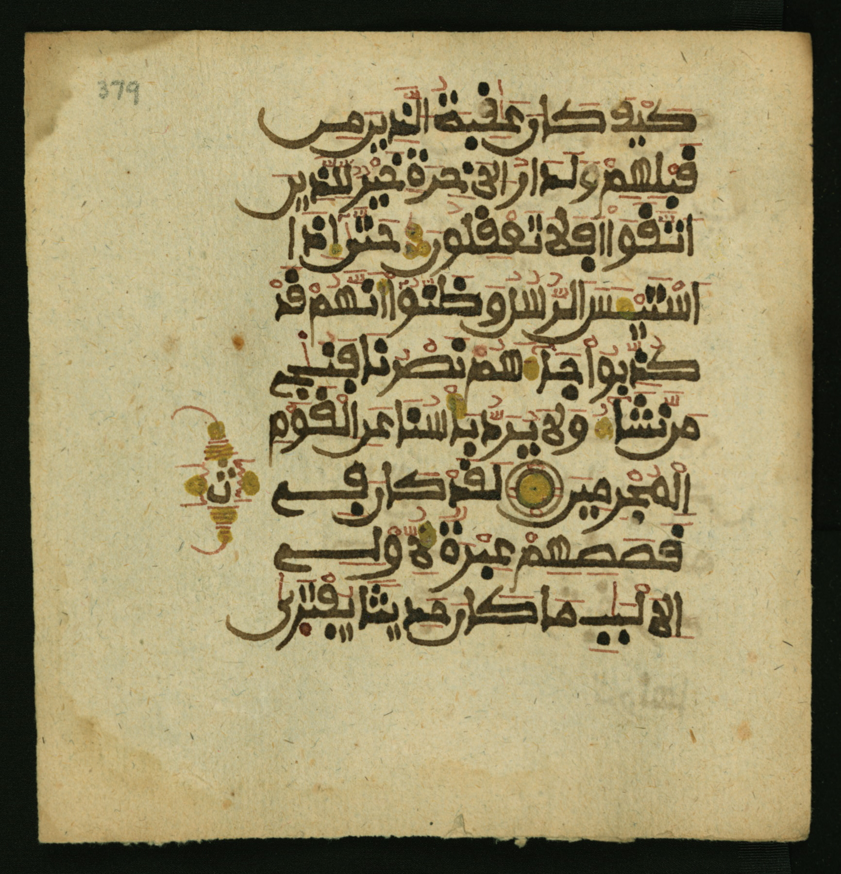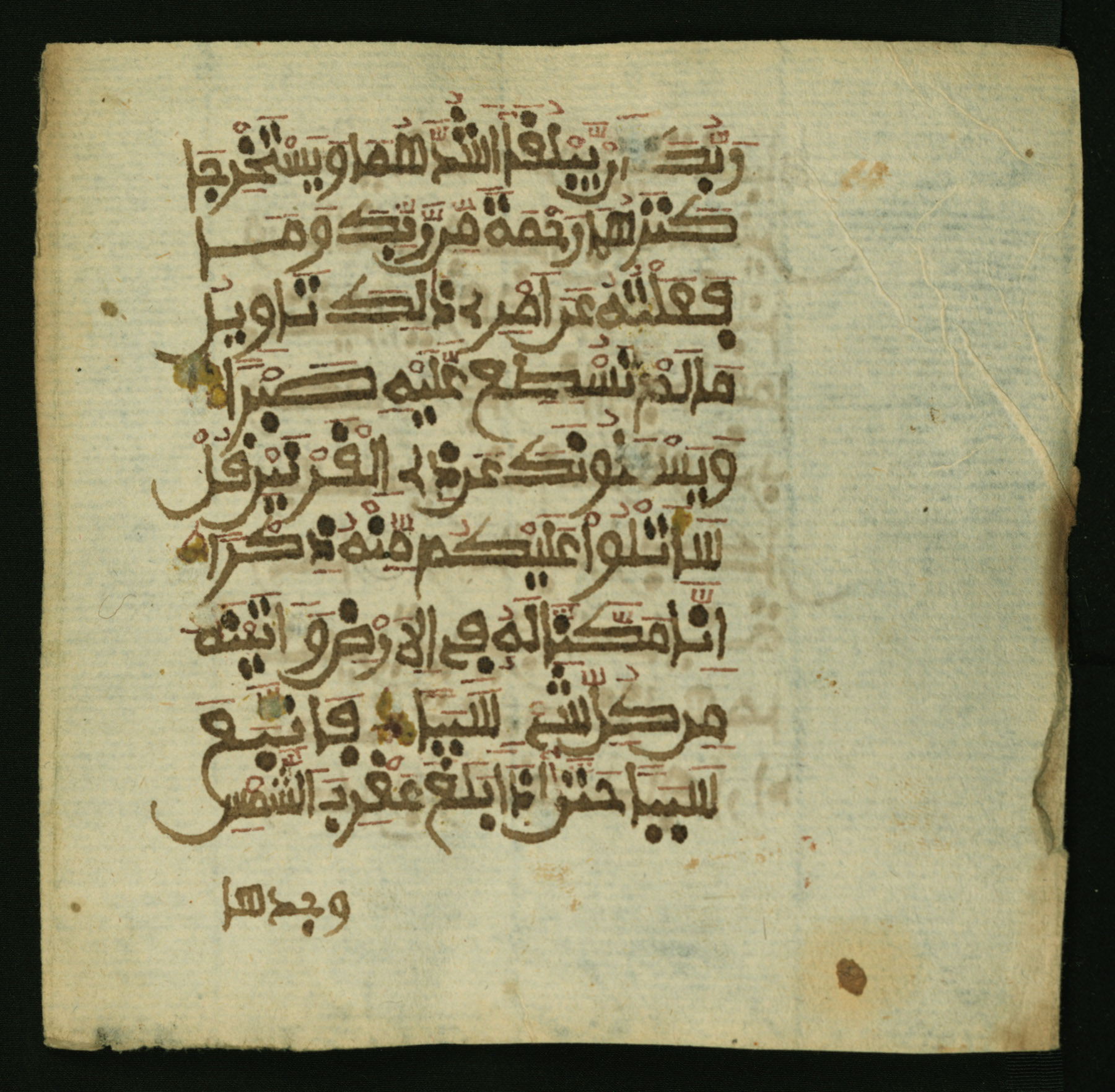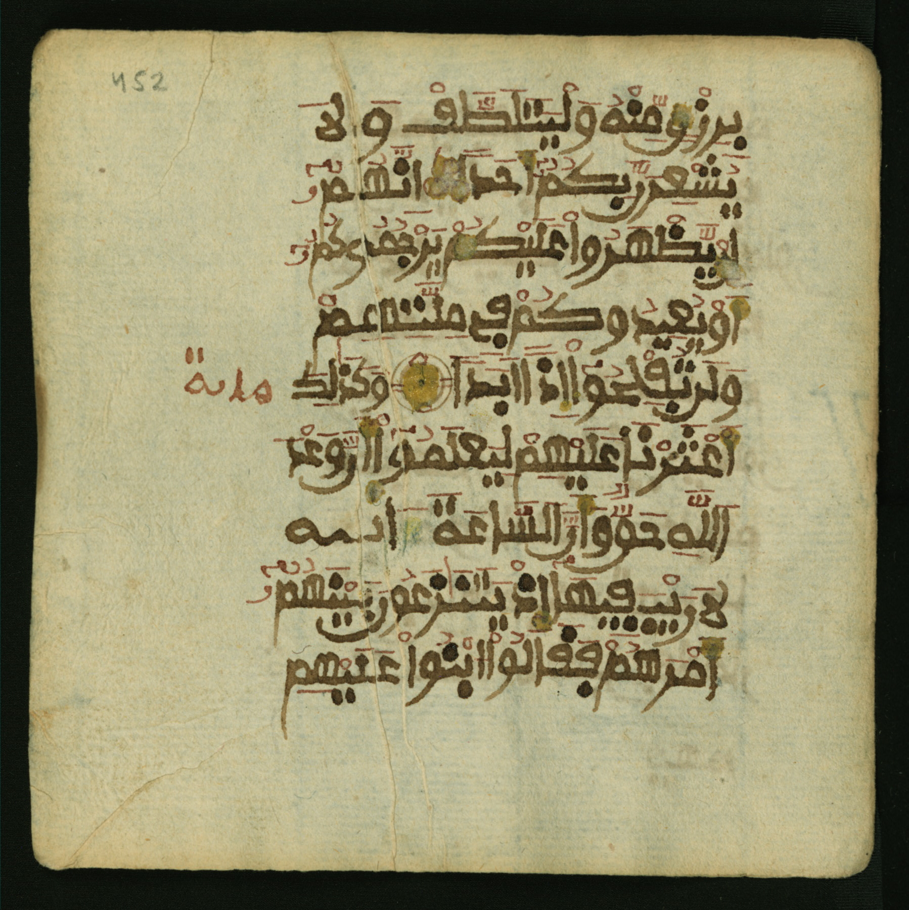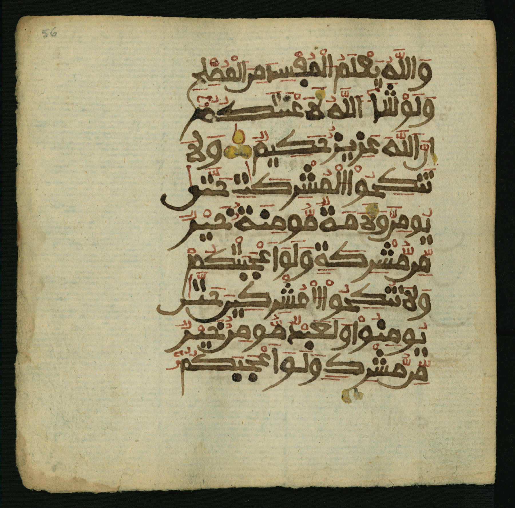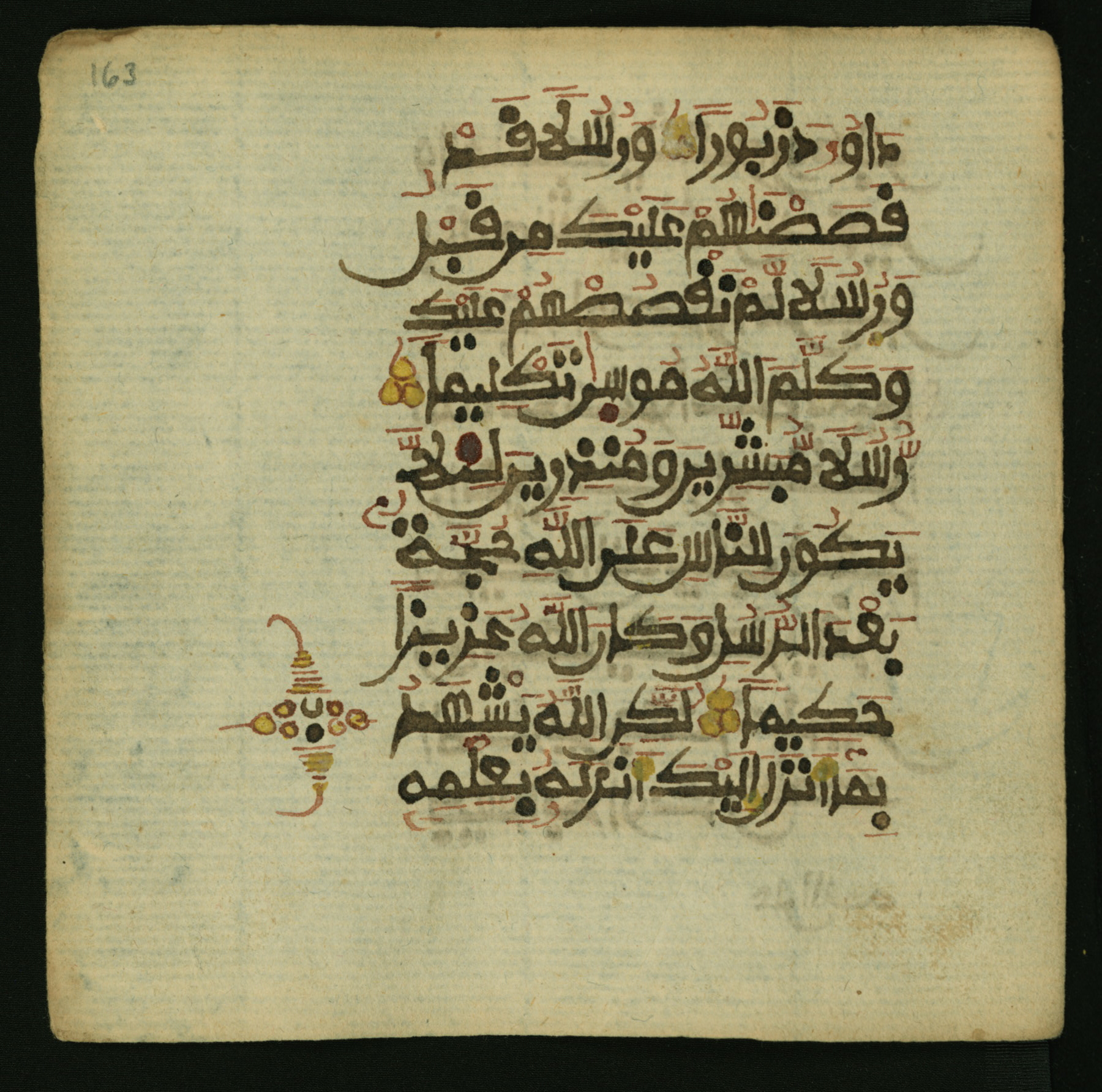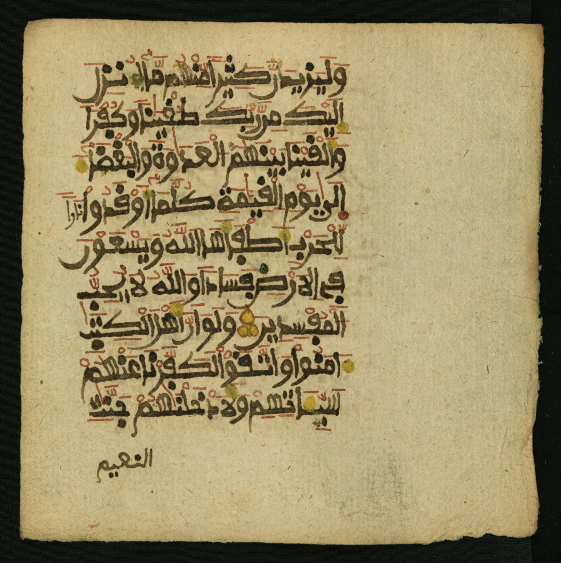 This square-format manuscript is volume 1, containing chapters 1-18 (Sūrat al-fātiḥah through Sūrat al-kahf), of an illuminated two-volume Qur'an produced in Sub-Saharan (West) Africa in the thirteenth century AH / nineteenth CE. The text is written in Sūdānī script in dark brown ink with vocalization in red on loose leaves. Chapter headings are in reddish-brown ink. Three yellow dots outlined in red arranged in a triangular form separate verses. Polychrome circular medallions as well as square and rectangular devices in a variety of patterns and colors mark textual divisions. The leaves of the text are organized between two decorated boards with geometric compositions. The pages and boards are housed in a leather pouch (satchel).