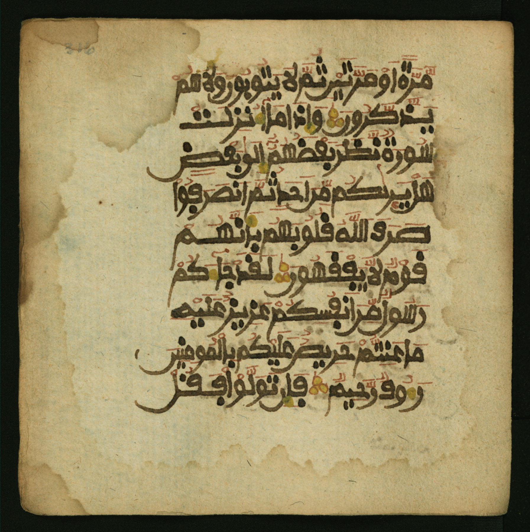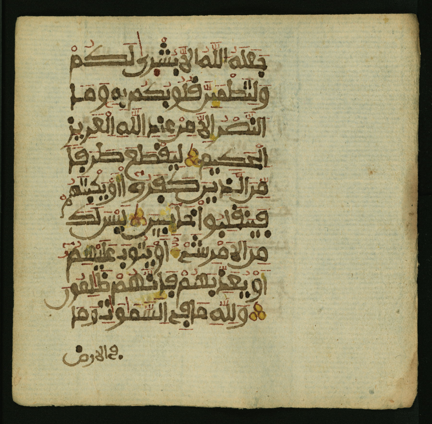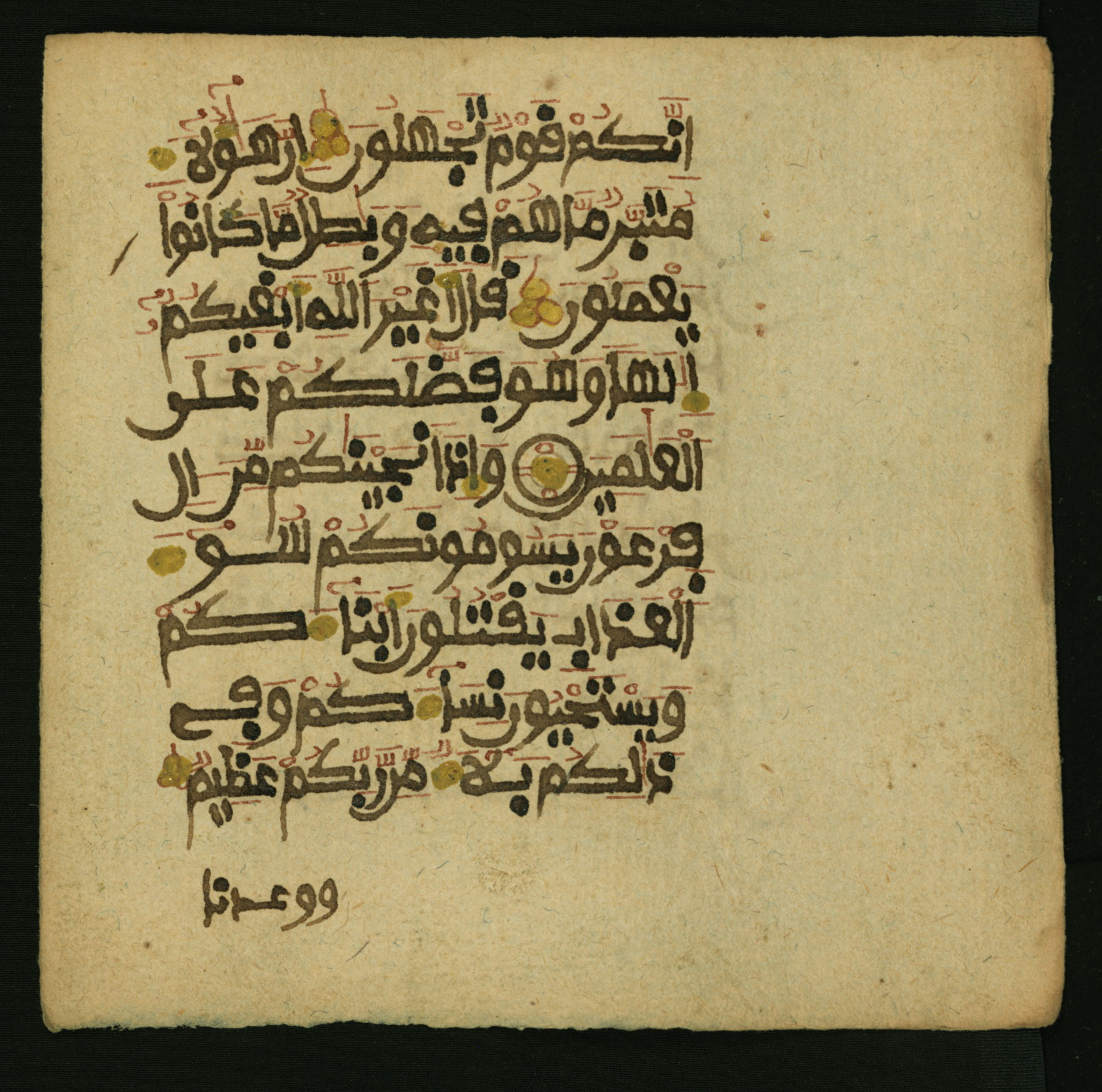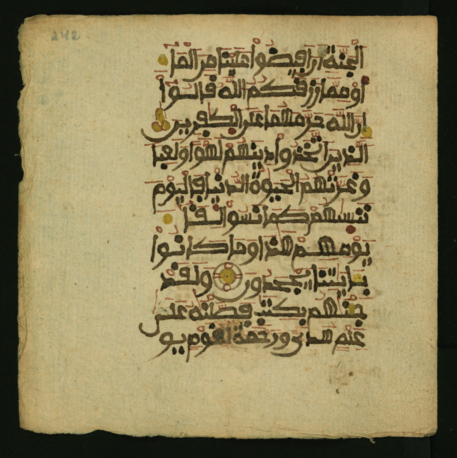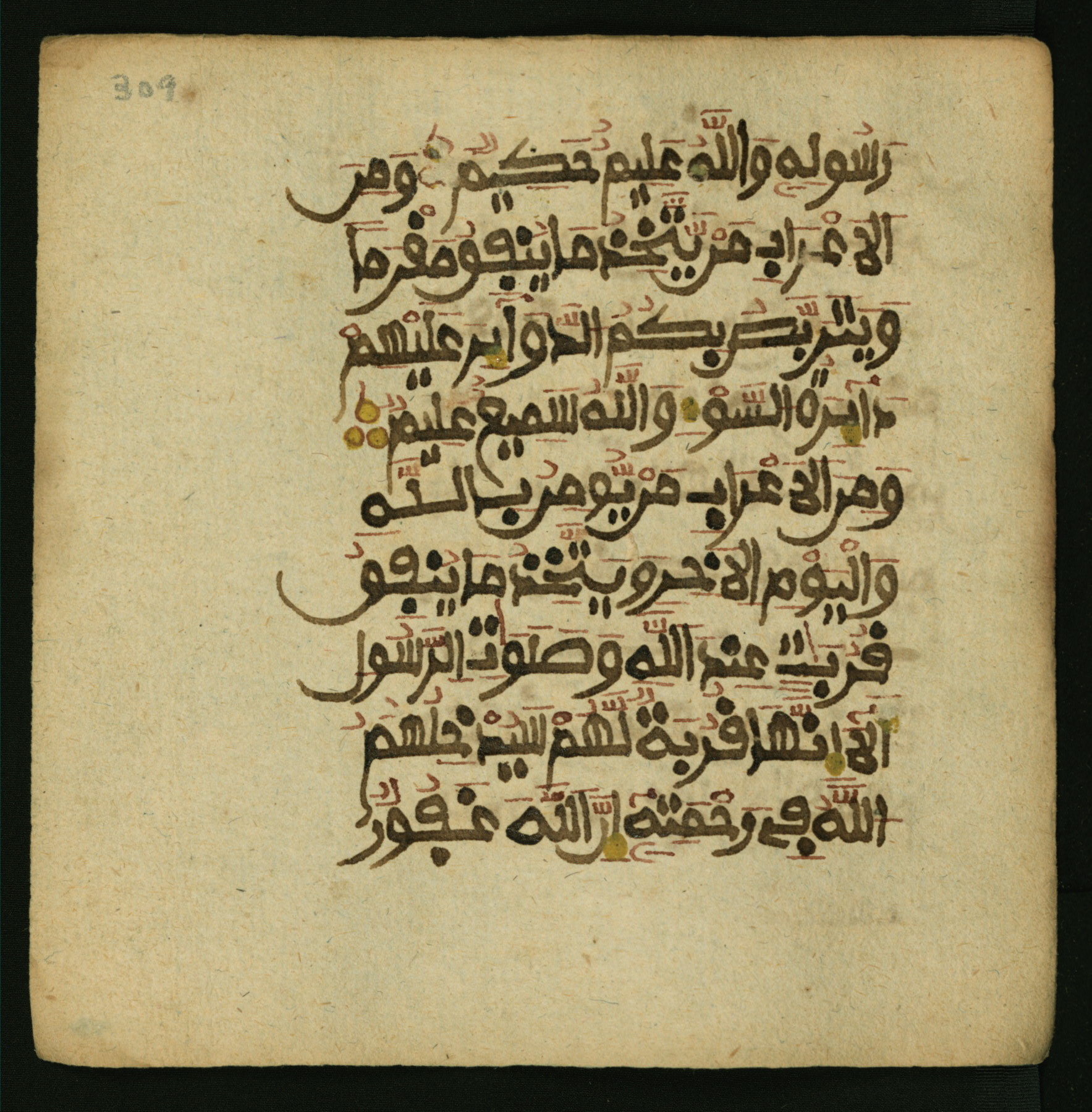 This square-format manuscript is volume 1, containing chapters 1-18 (Sūrat al-fātiḥah through Sūrat al-kahf), of an illuminated two-volume Qur'an produced in Sub-Saharan (West) Africa in the thirteenth century AH / nineteenth CE. The text is written in Sūdānī script in dark brown ink with vocalization in red on loose leaves. Chapter headings are in reddish-brown ink. Three yellow dots outlined in red arranged in a triangular form separate verses. Polychrome circular medallions as well as square and rectangular devices in a variety of patterns and colors mark textual divisions. The leaves of the text are organized between two decorated boards with geometric compositions. The pages and boards are housed in a leather pouch (satchel).