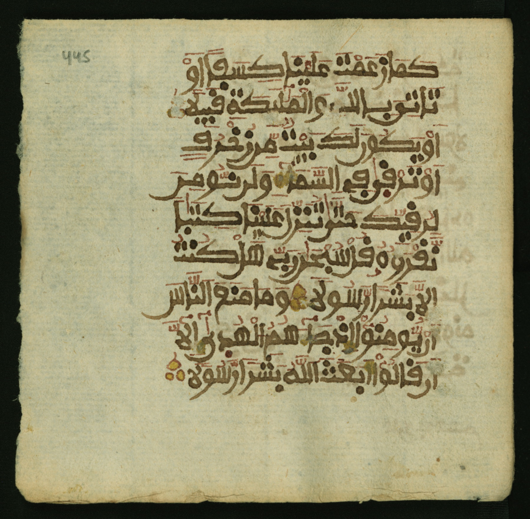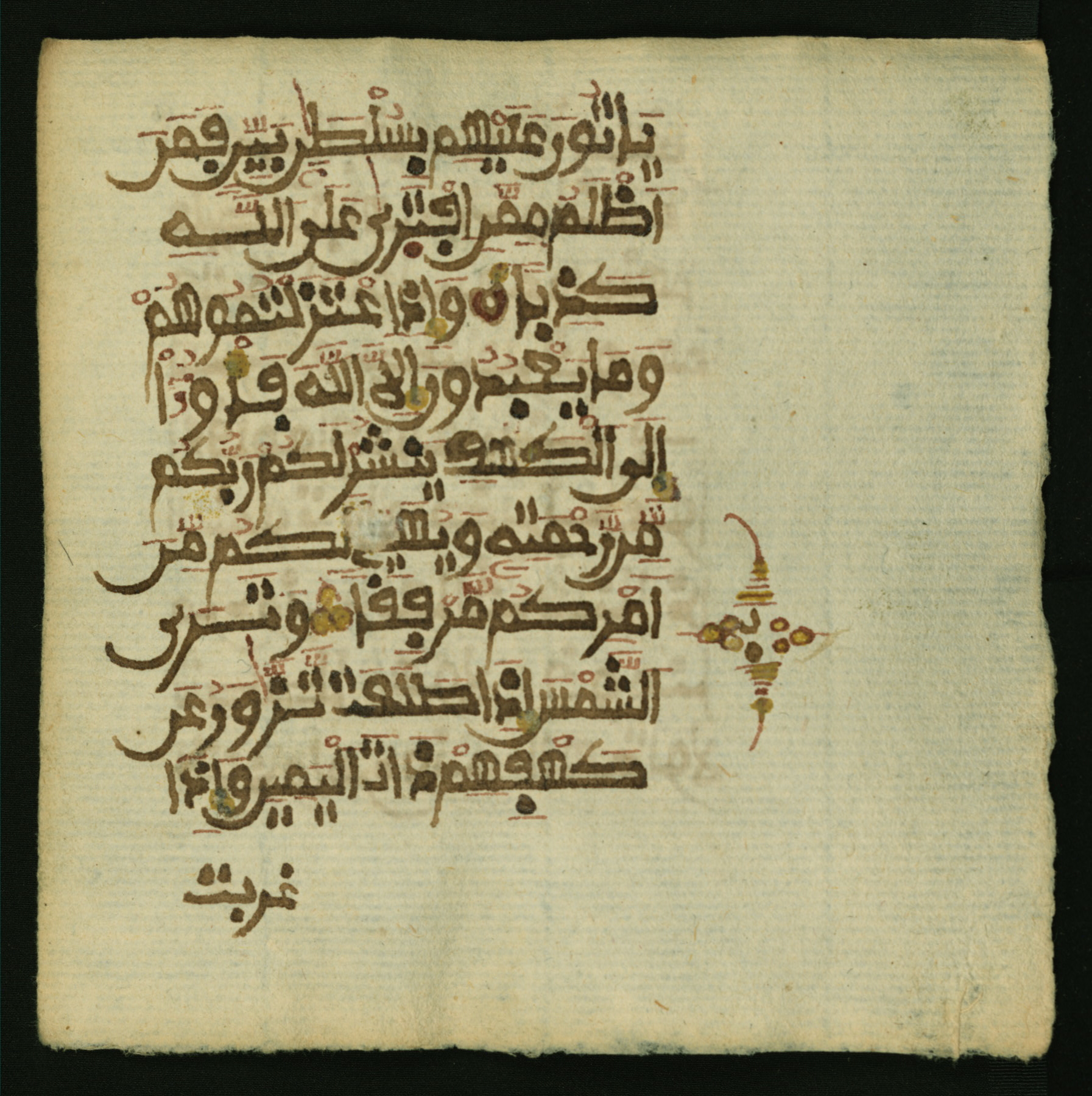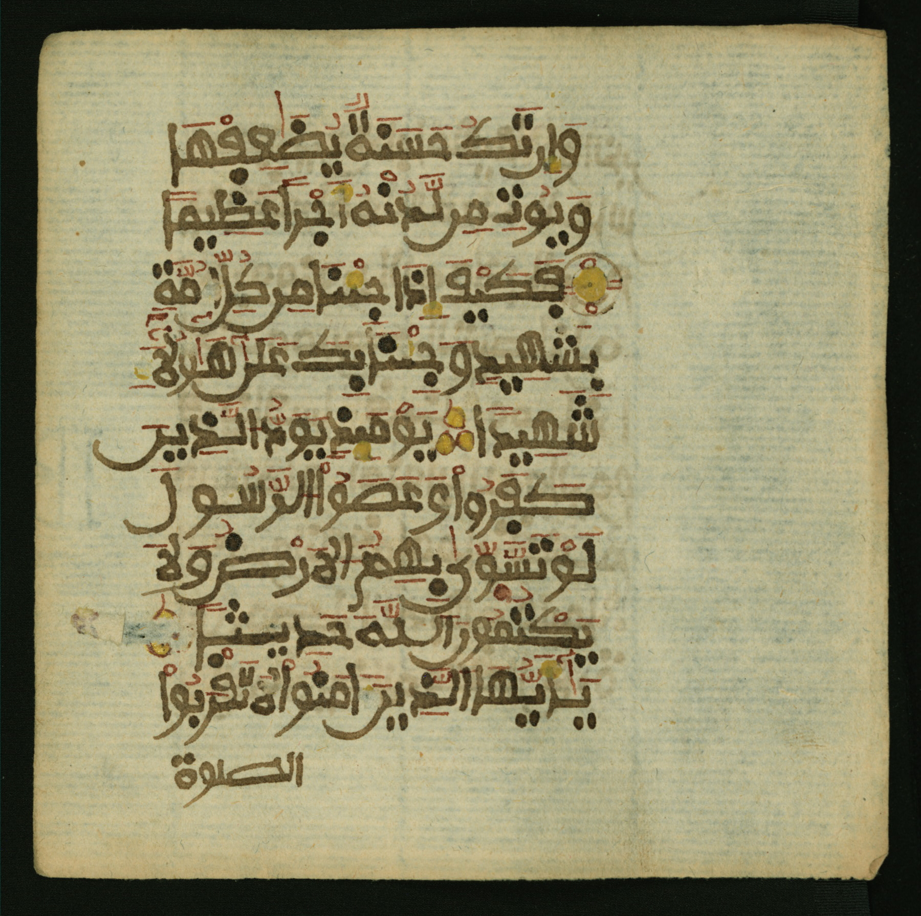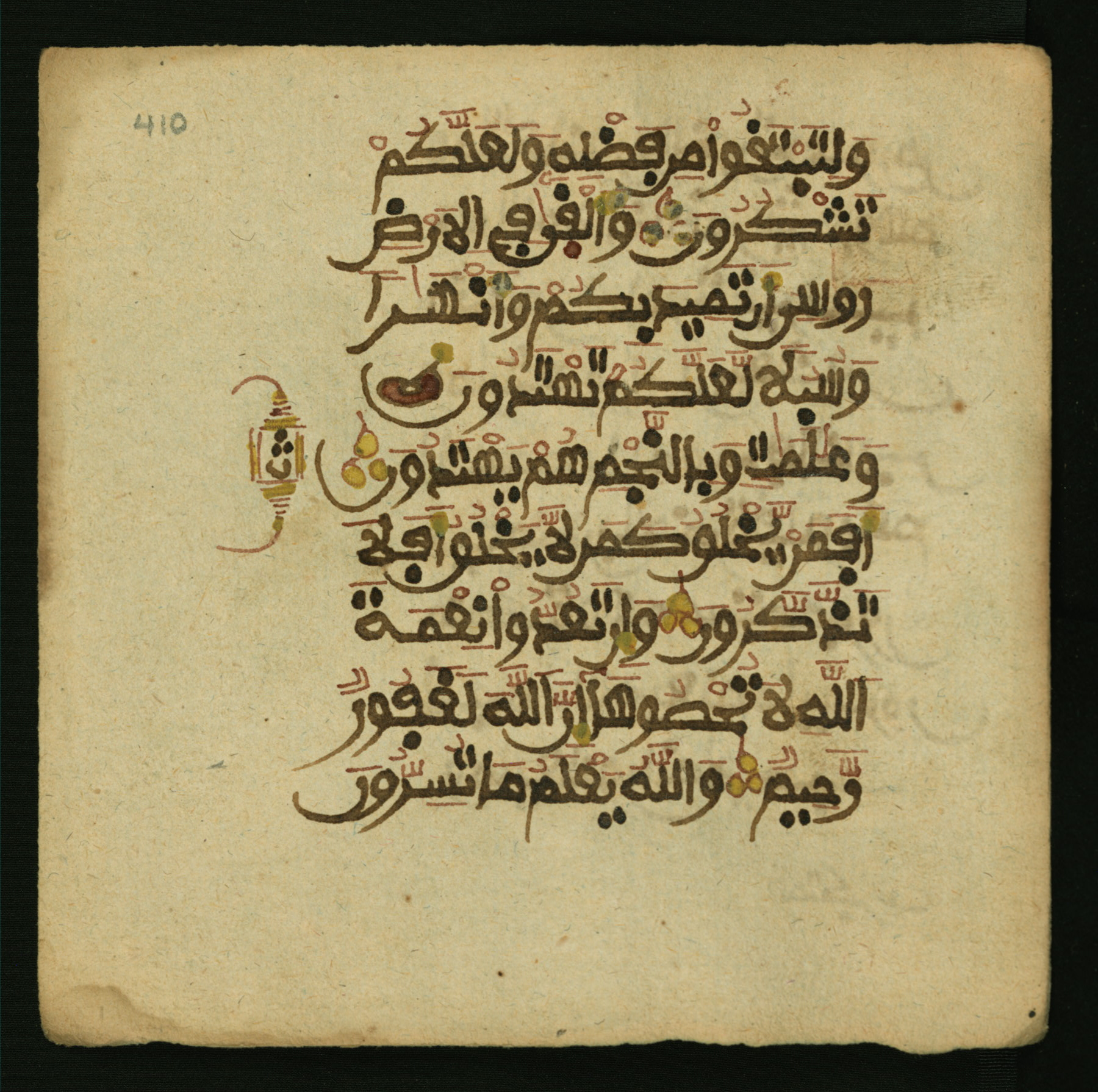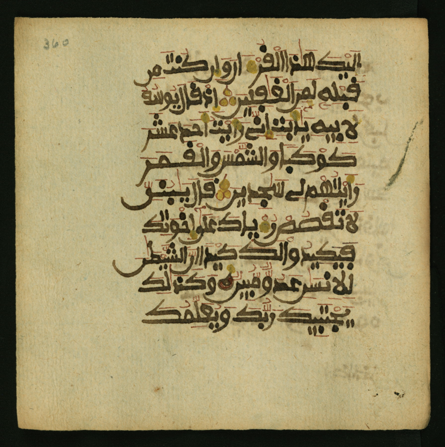 This square-format manuscript is volume 1, containing chapters 1-18 (Sūrat al-fātiḥah through Sūrat al-kahf), of an illuminated two-volume Qur'an produced in Sub-Saharan (West) Africa in the thirteenth century AH / nineteenth CE. The text is written in Sūdānī script in dark brown ink with vocalization in red on loose leaves. Chapter headings are in reddish-brown ink. Three yellow dots outlined in red arranged in a triangular form separate verses. Polychrome circular medallions as well as square and rectangular devices in a variety of patterns and colors mark textual divisions. The leaves of the text are organized between two decorated boards with geometric compositions. The pages and boards are housed in a leather pouch (satchel).