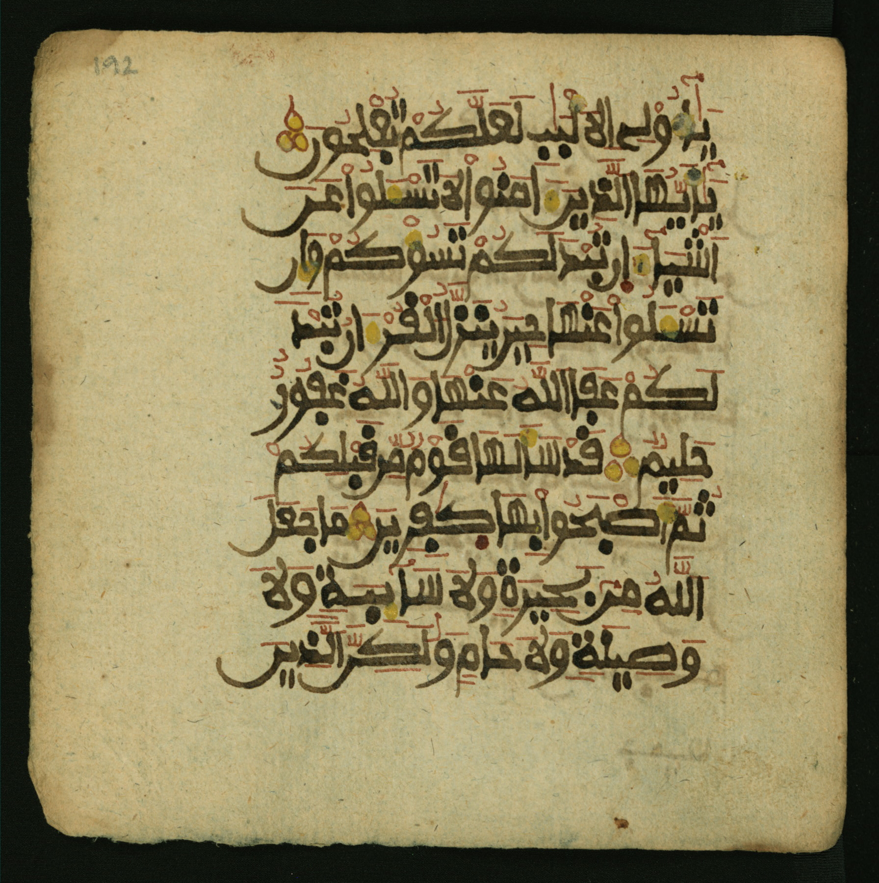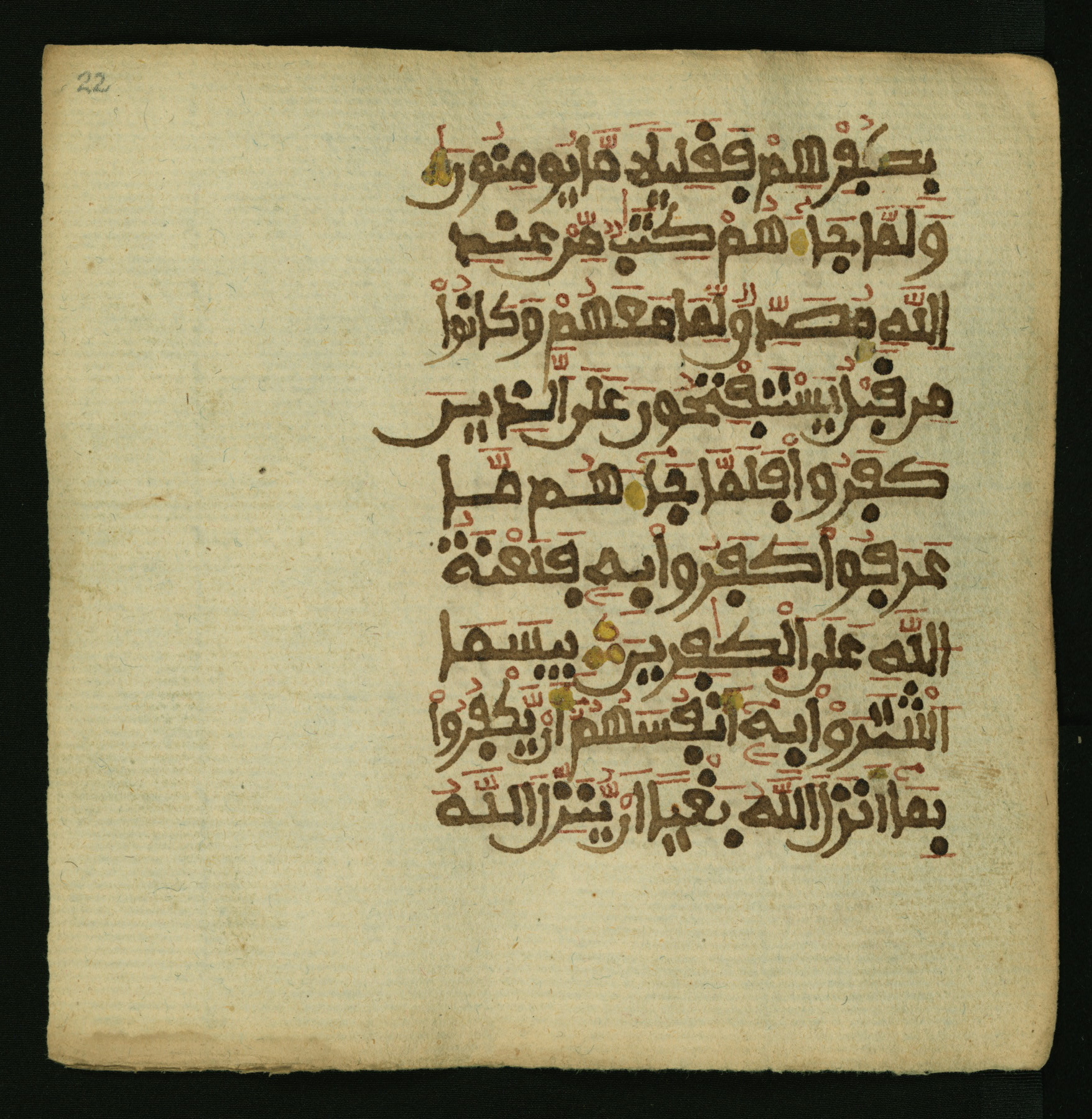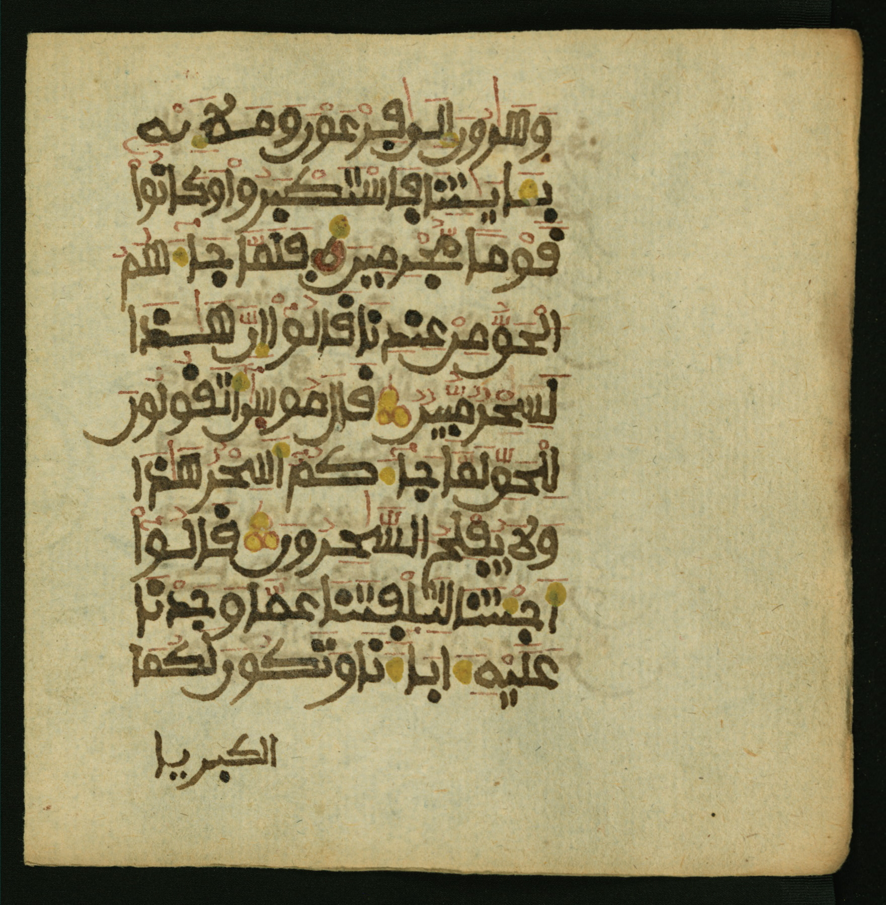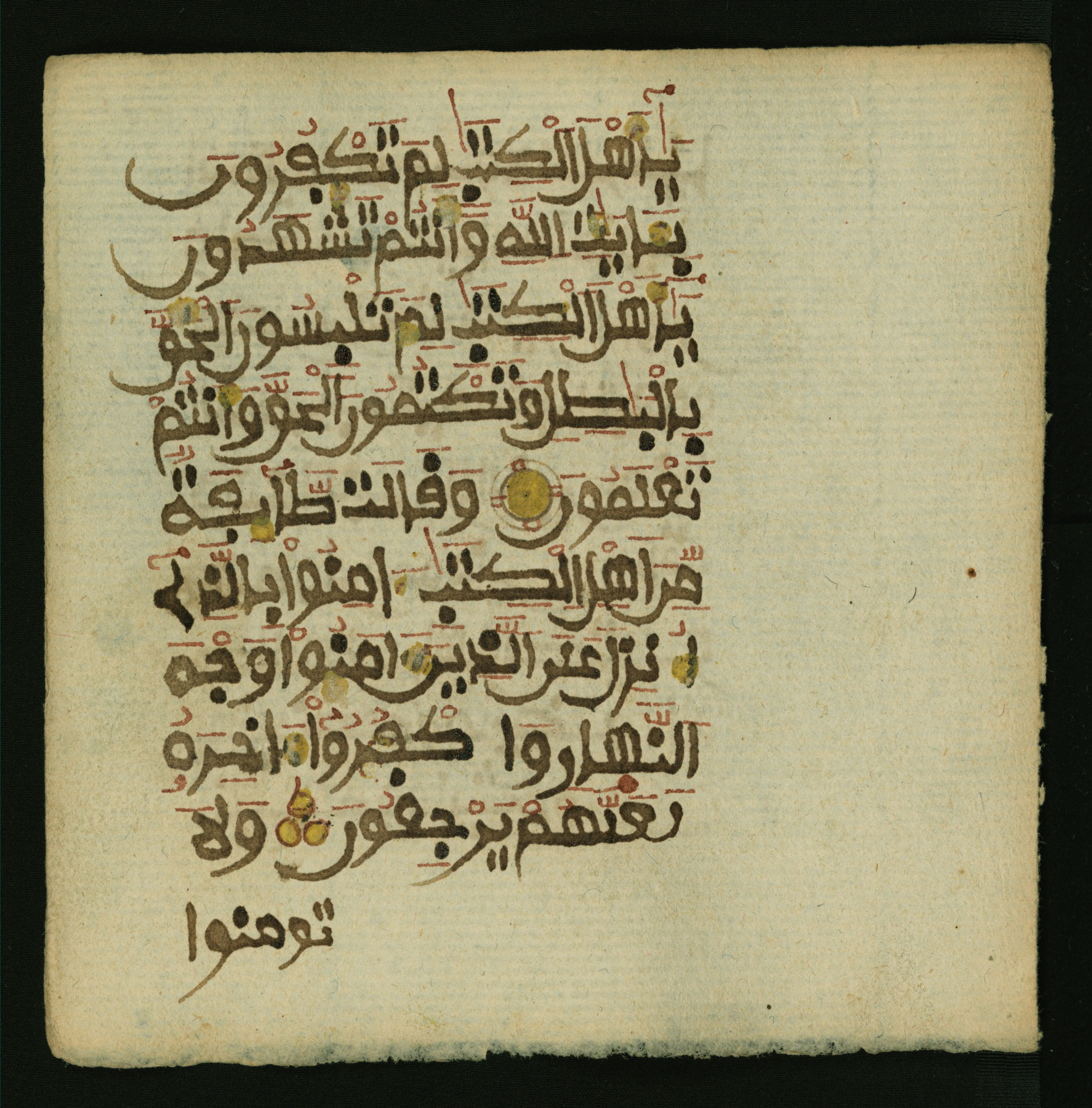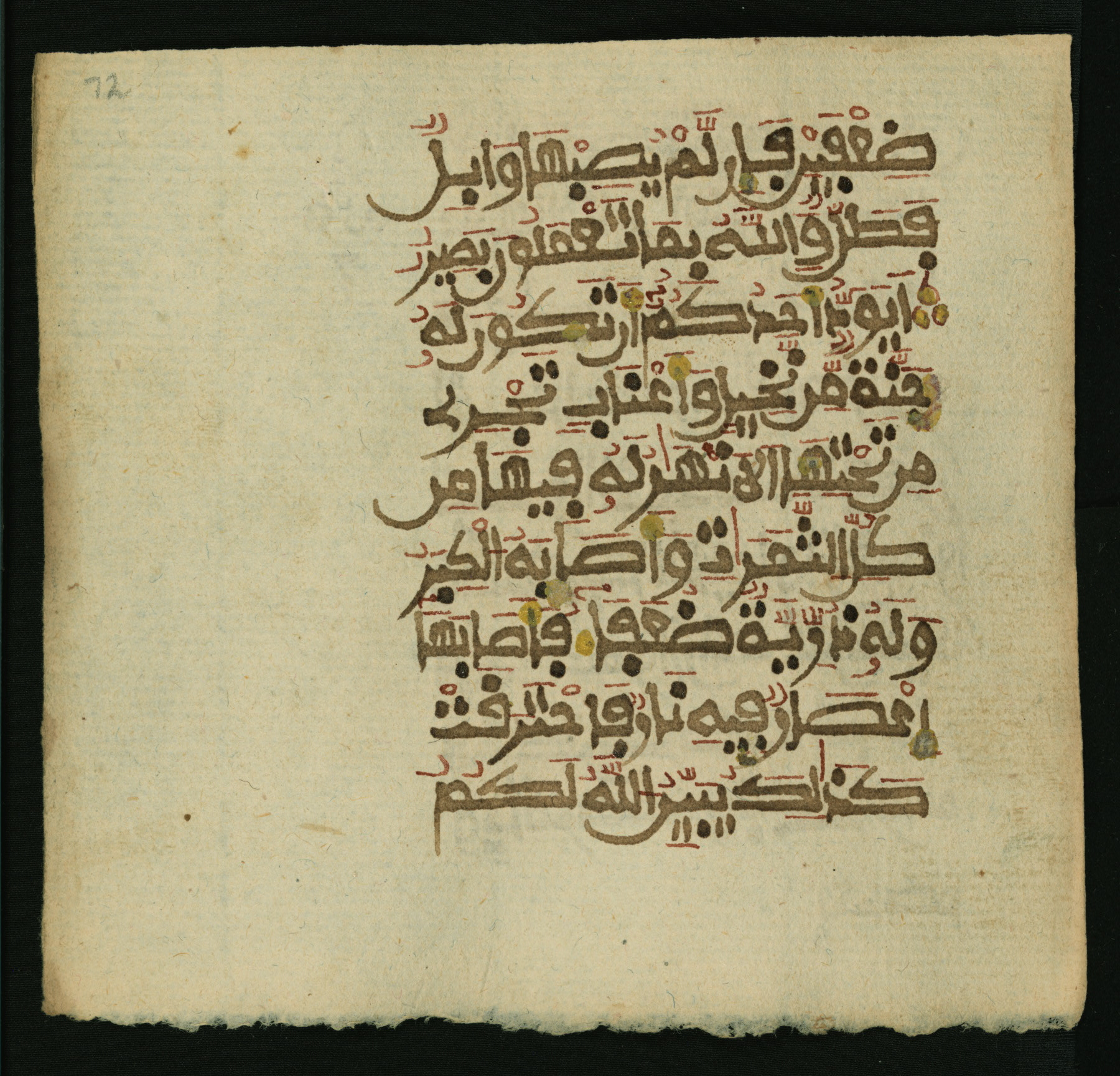 This square-format manuscript is volume 1, containing chapters 1-18 (Sūrat al-fātiḥah through Sūrat al-kahf), of an illuminated two-volume Qur'an produced in Sub-Saharan (West) Africa in the thirteenth century AH / nineteenth CE. The text is written in Sūdānī script in dark brown ink with vocalization in red on loose leaves. Chapter headings are in reddish-brown ink. Three yellow dots outlined in red arranged in a triangular form separate verses. Polychrome circular medallions as well as square and rectangular devices in a variety of patterns and colors mark textual divisions. The leaves of the text are organized between two decorated boards with geometric compositions. The pages and boards are housed in a leather pouch (satchel).