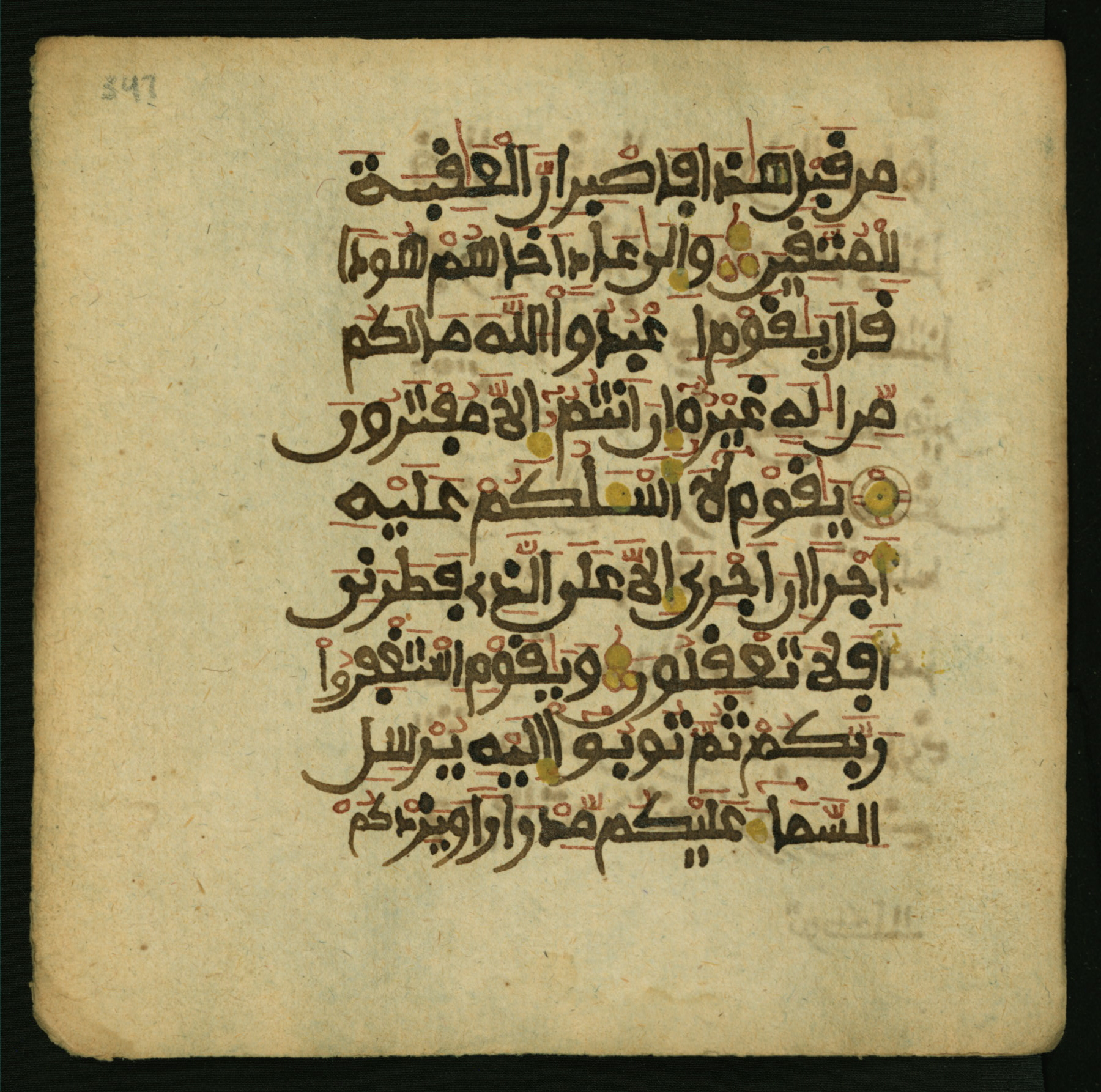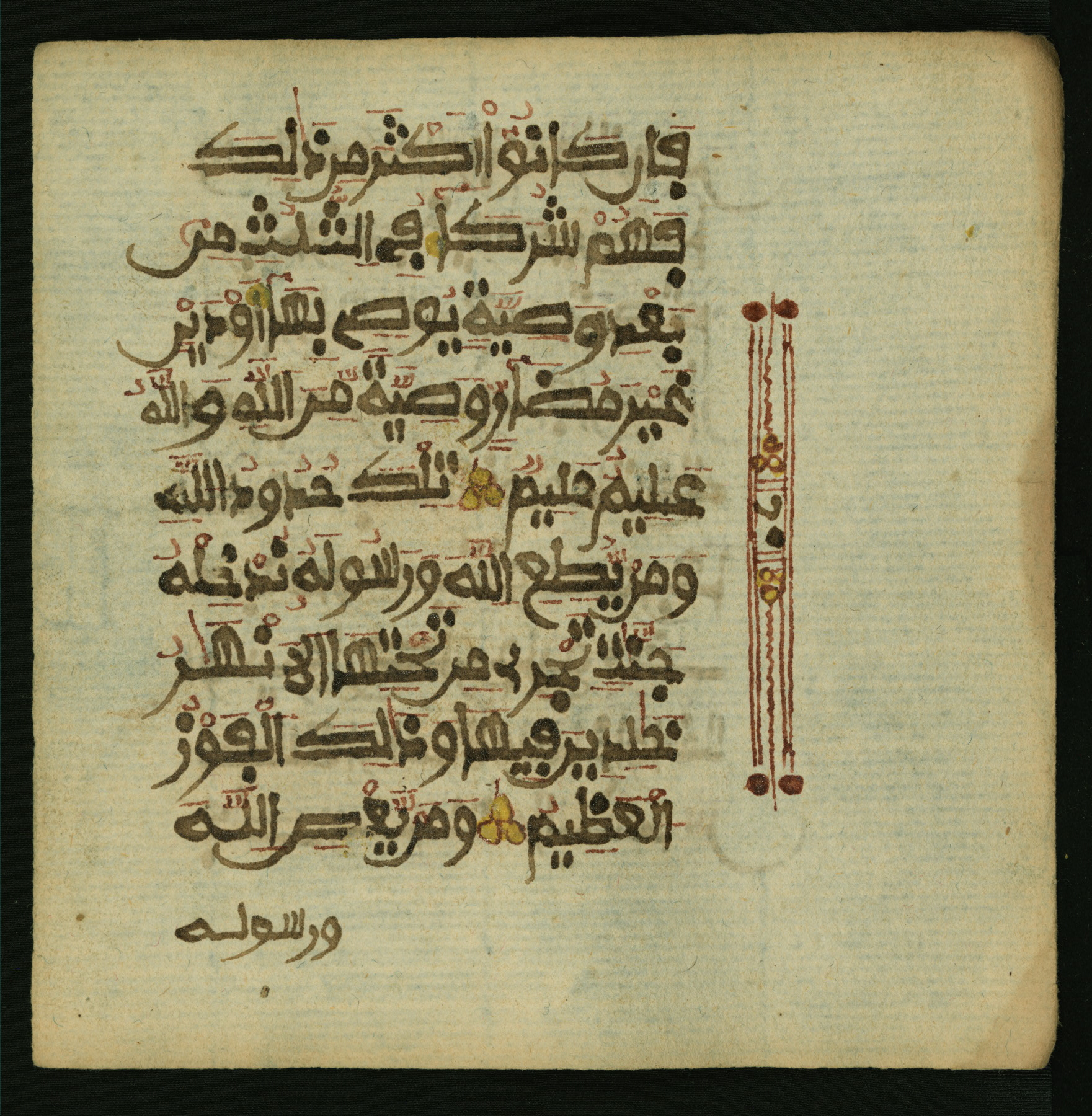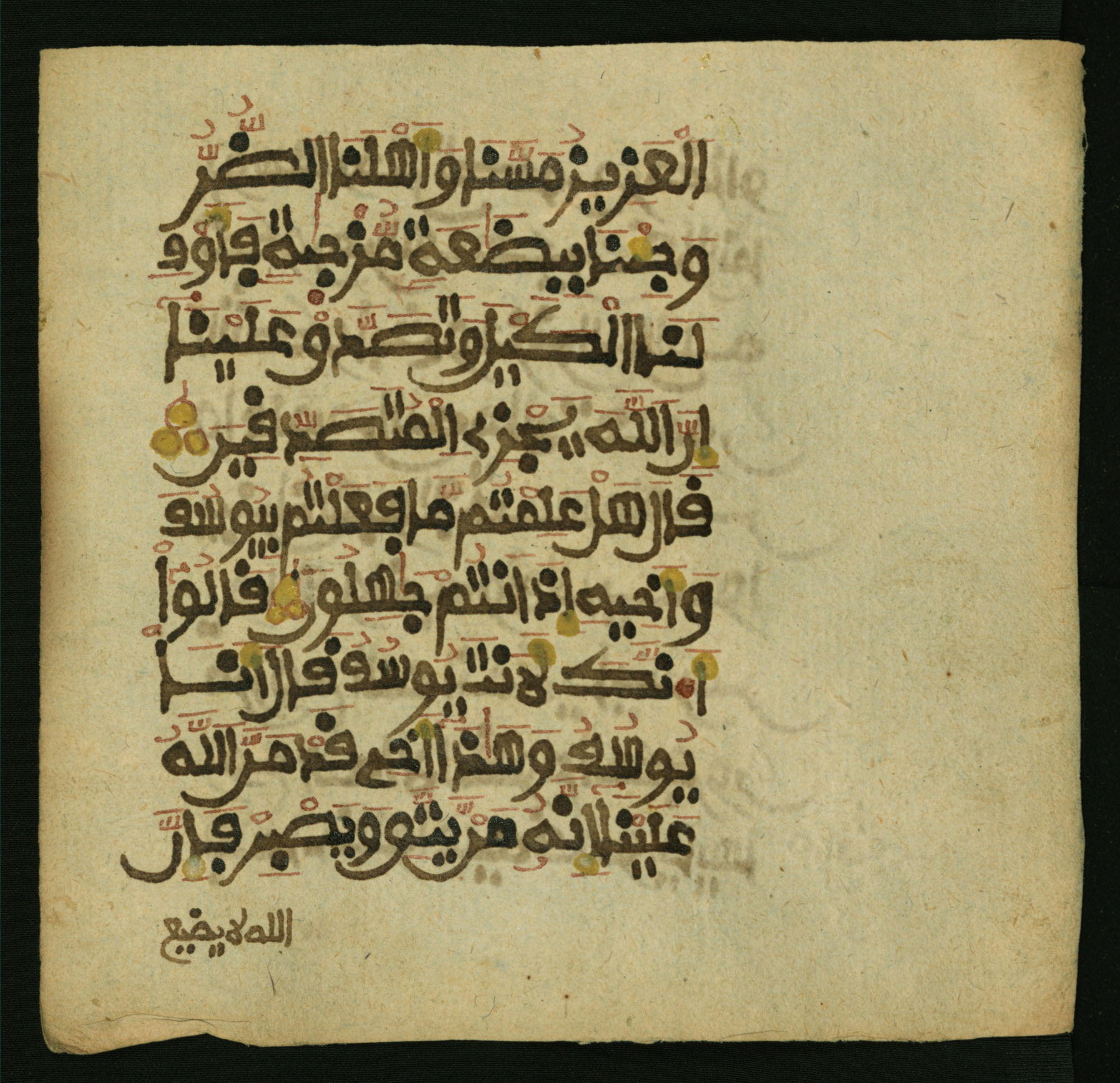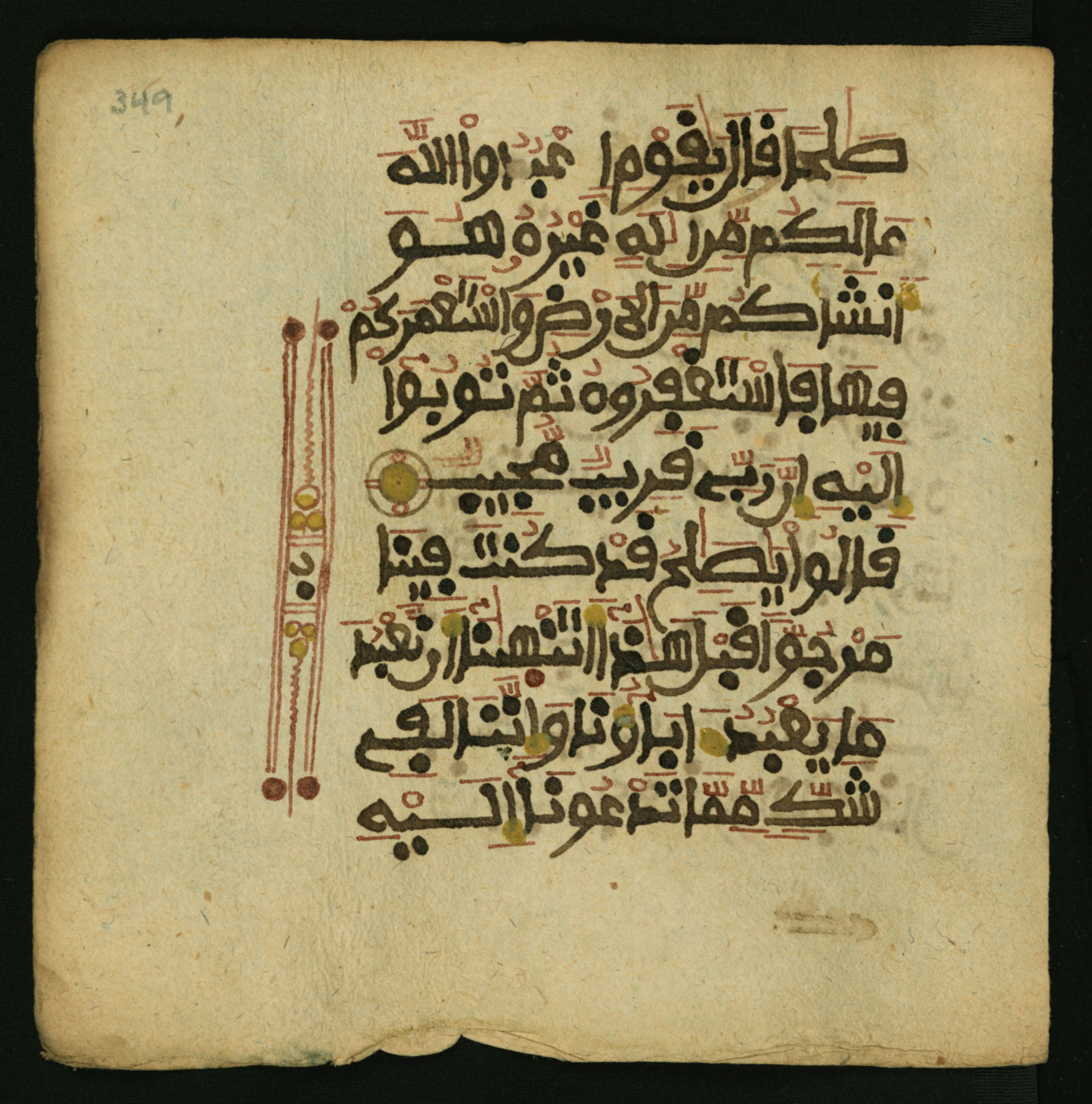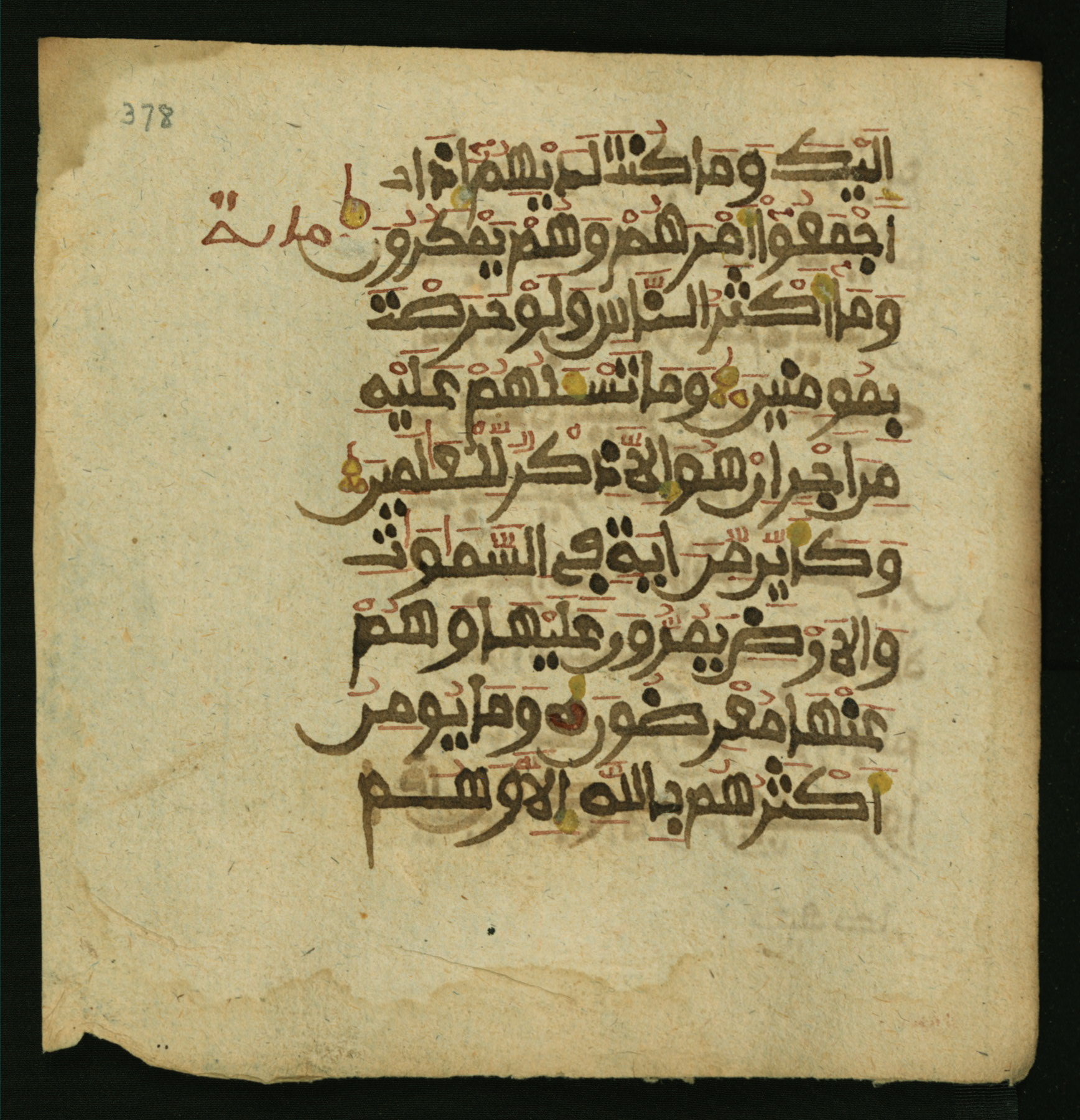 This square-format manuscript is volume 1, containing chapters 1-18 (Sūrat al-fātiḥah through Sūrat al-kahf), of an illuminated two-volume Qur'an produced in Sub-Saharan (West) Africa in the thirteenth century AH / nineteenth CE. The text is written in Sūdānī script in dark brown ink with vocalization in red on loose leaves. Chapter headings are in reddish-brown ink. Three yellow dots outlined in red arranged in a triangular form separate verses. Polychrome circular medallions as well as square and rectangular devices in a variety of patterns and colors mark textual divisions. The leaves of the text are organized between two decorated boards with geometric compositions. The pages and boards are housed in a leather pouch (satchel).