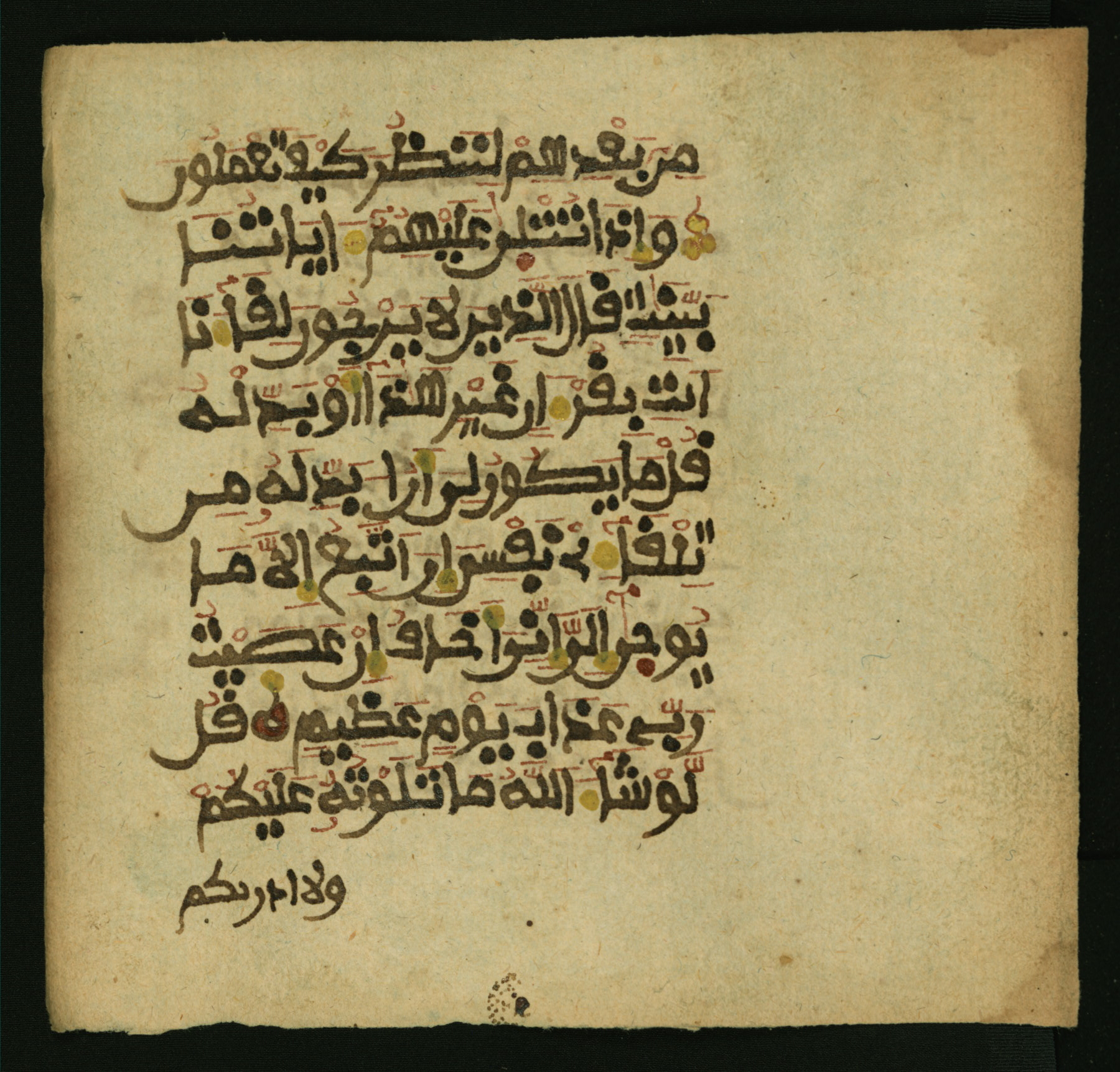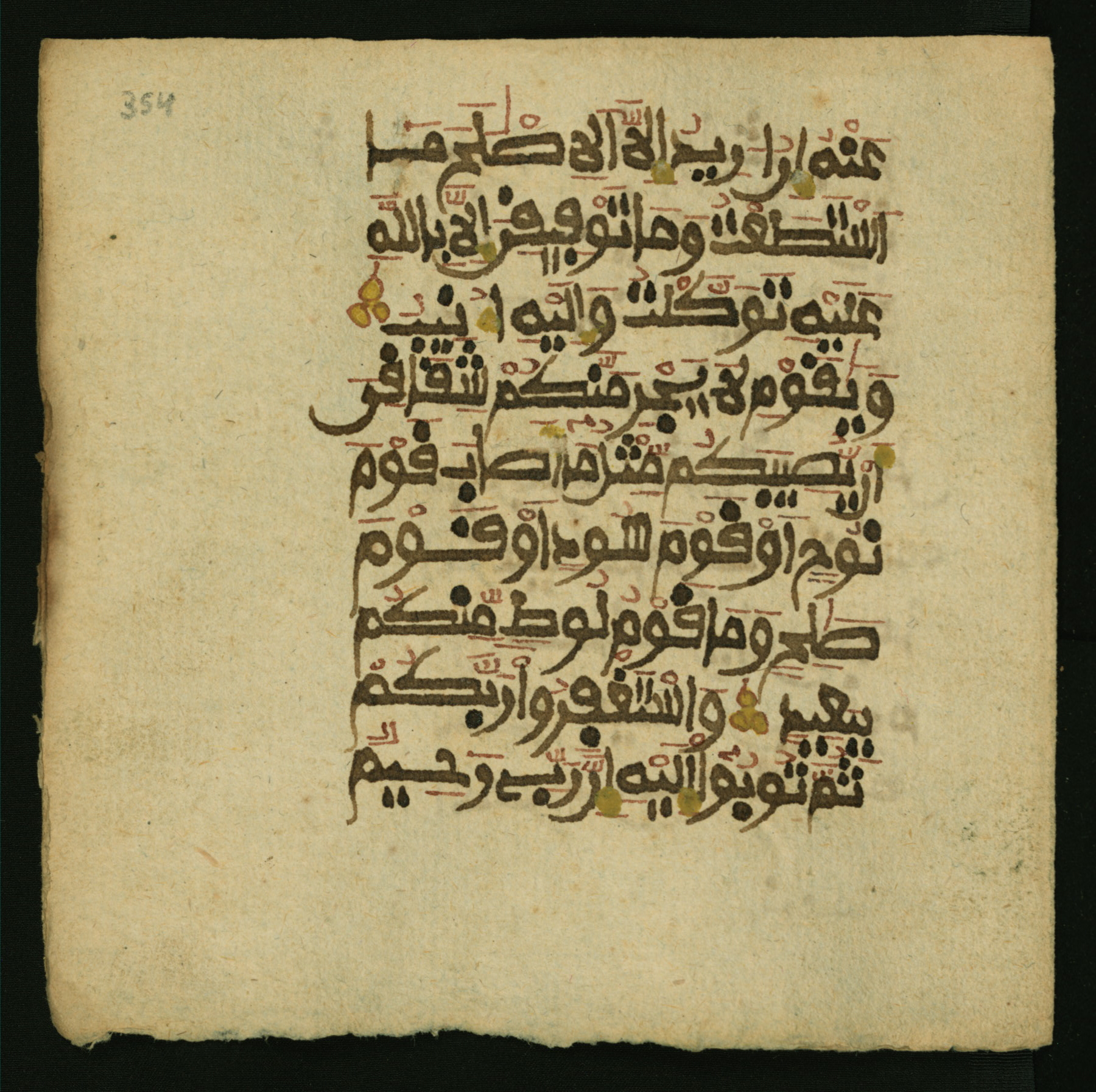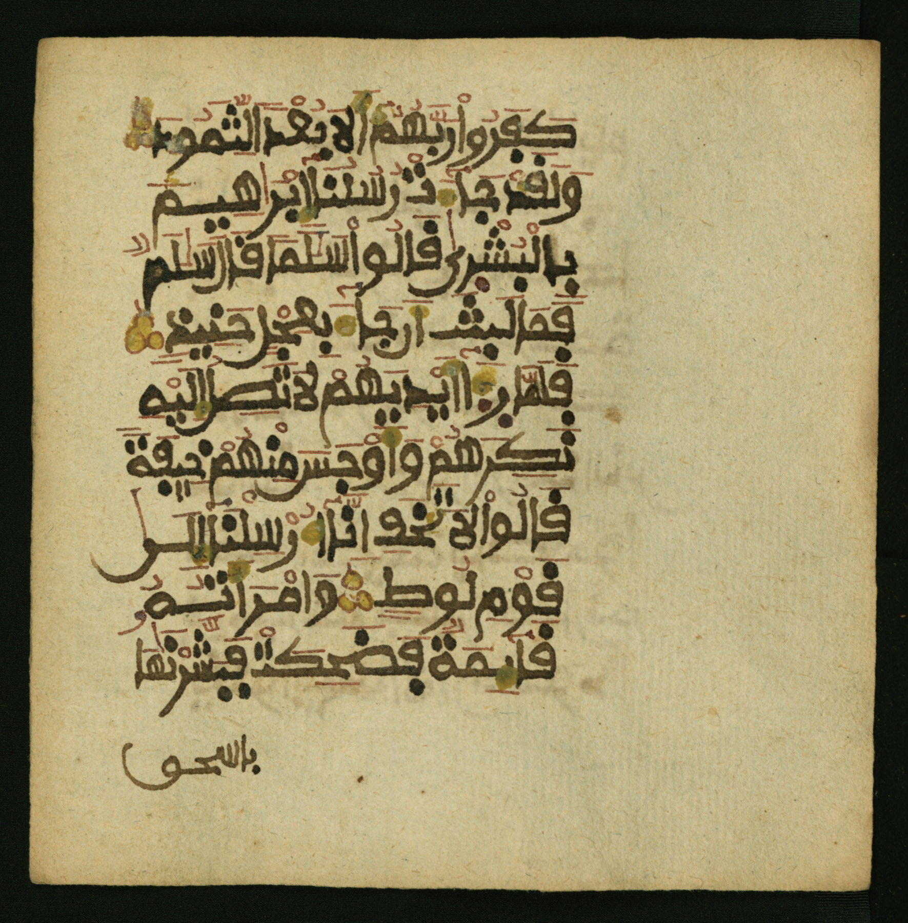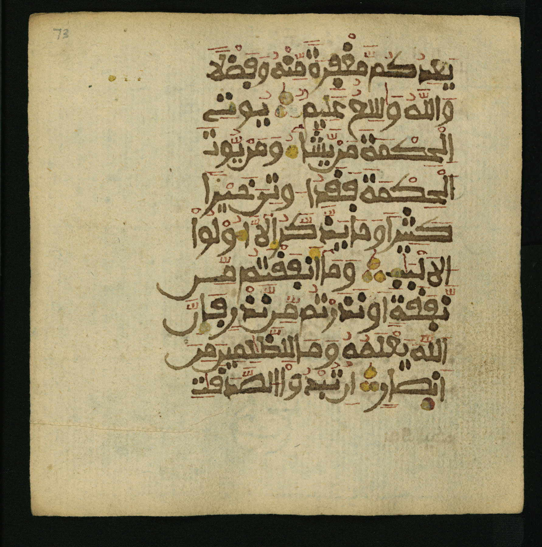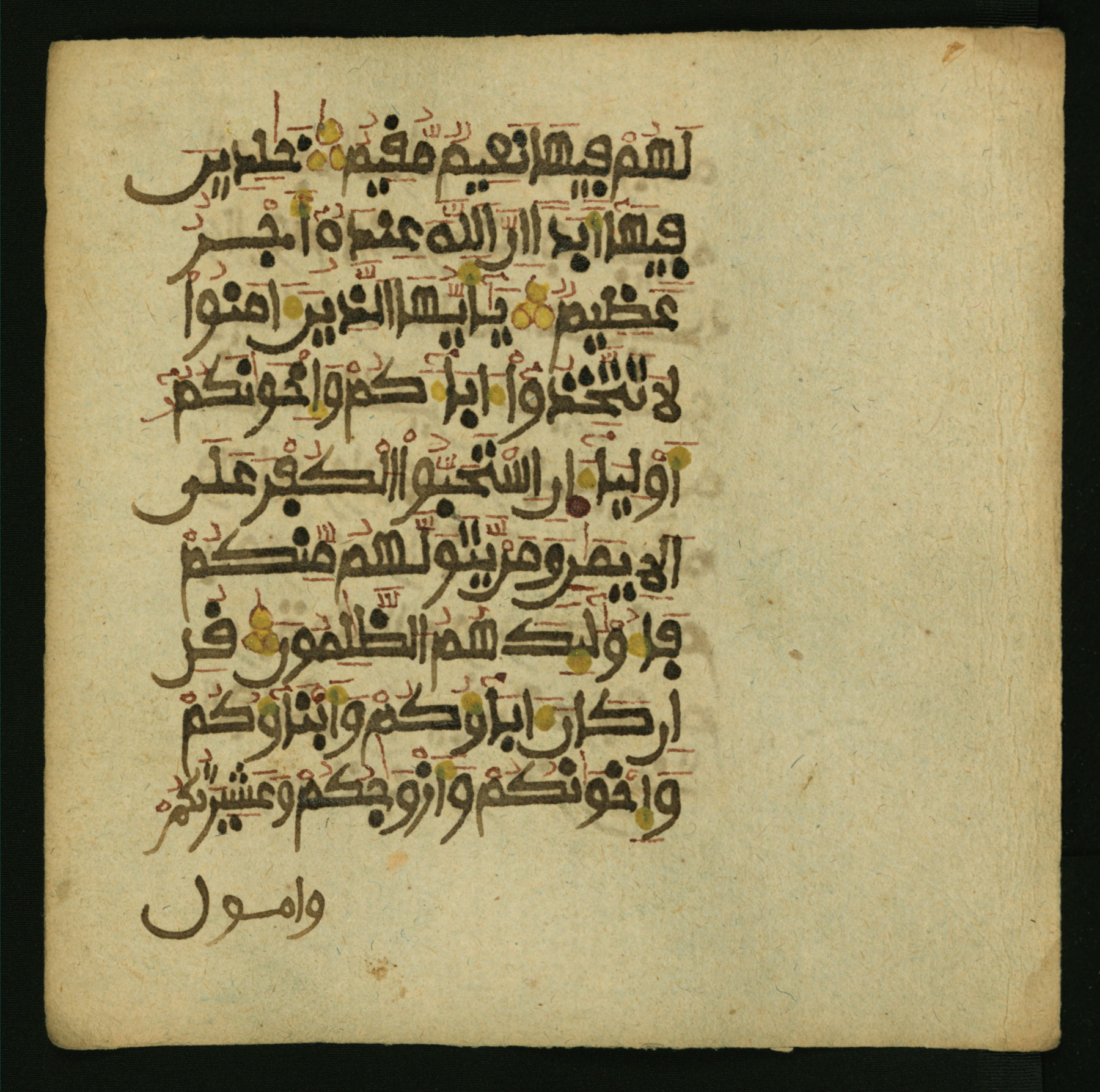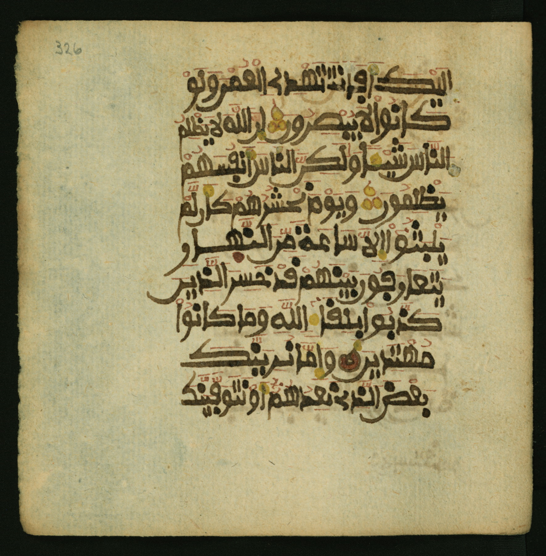 This square-format manuscript is volume 1, containing chapters 1-18 (Sūrat al-fātiḥah through Sūrat al-kahf), of an illuminated two-volume Qur'an produced in Sub-Saharan (West) Africa in the thirteenth century AH / nineteenth CE. The text is written in Sūdānī script in dark brown ink with vocalization in red on loose leaves. Chapter headings are in reddish-brown ink. Three yellow dots outlined in red arranged in a triangular form separate verses. Polychrome circular medallions as well as square and rectangular devices in a variety of patterns and colors mark textual divisions. The leaves of the text are organized between two decorated boards with geometric compositions. The pages and boards are housed in a leather pouch (satchel).