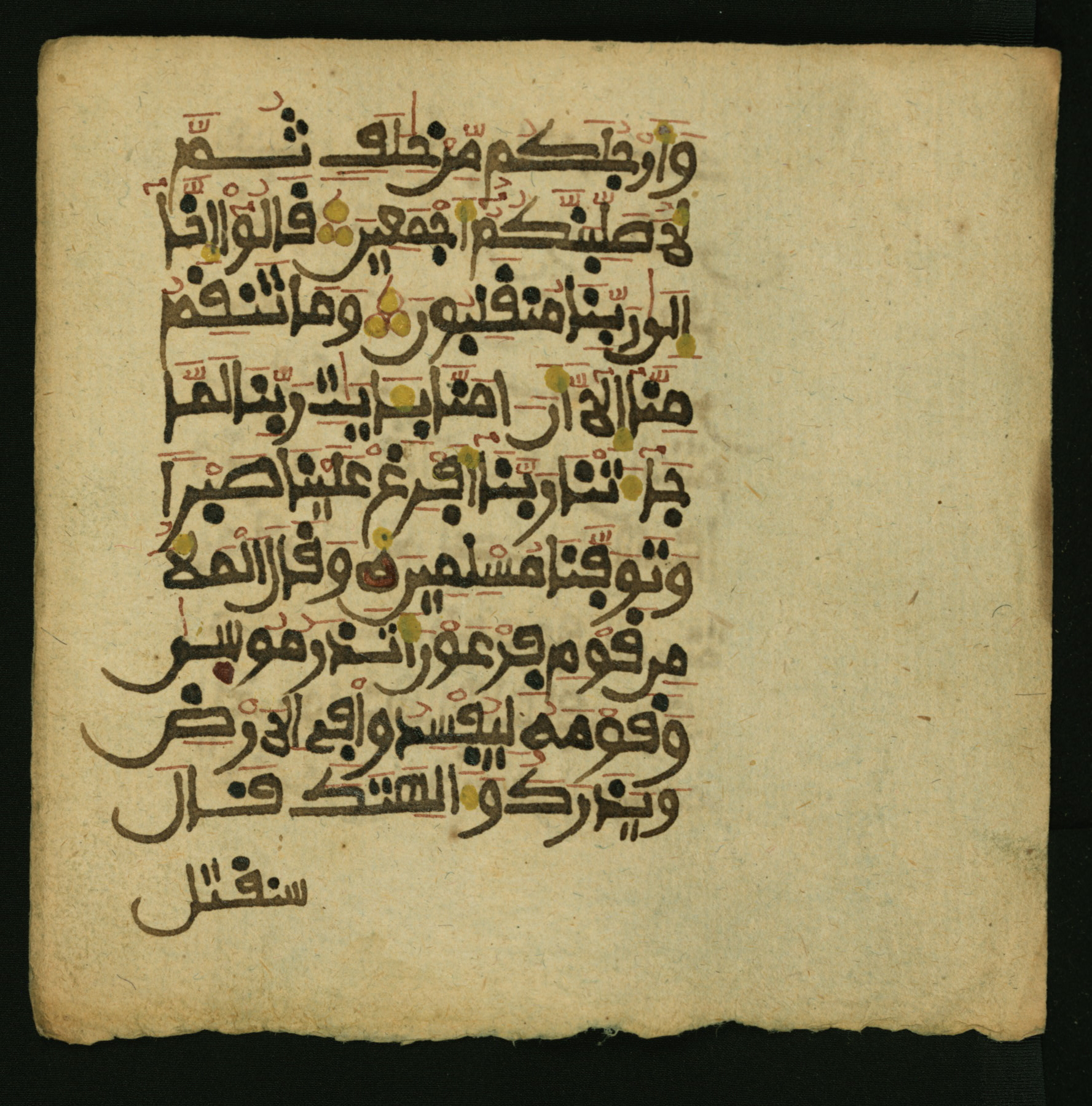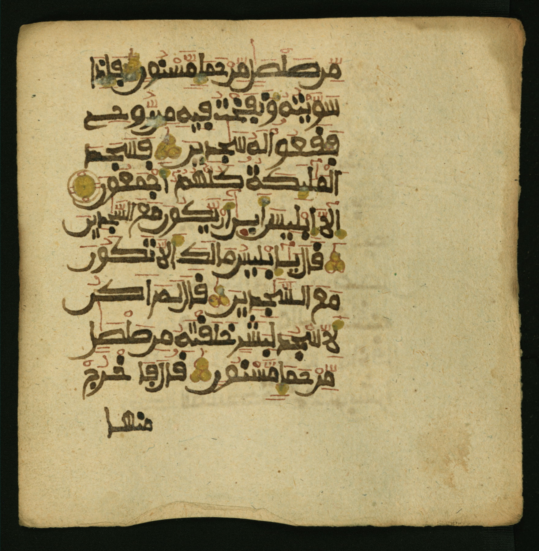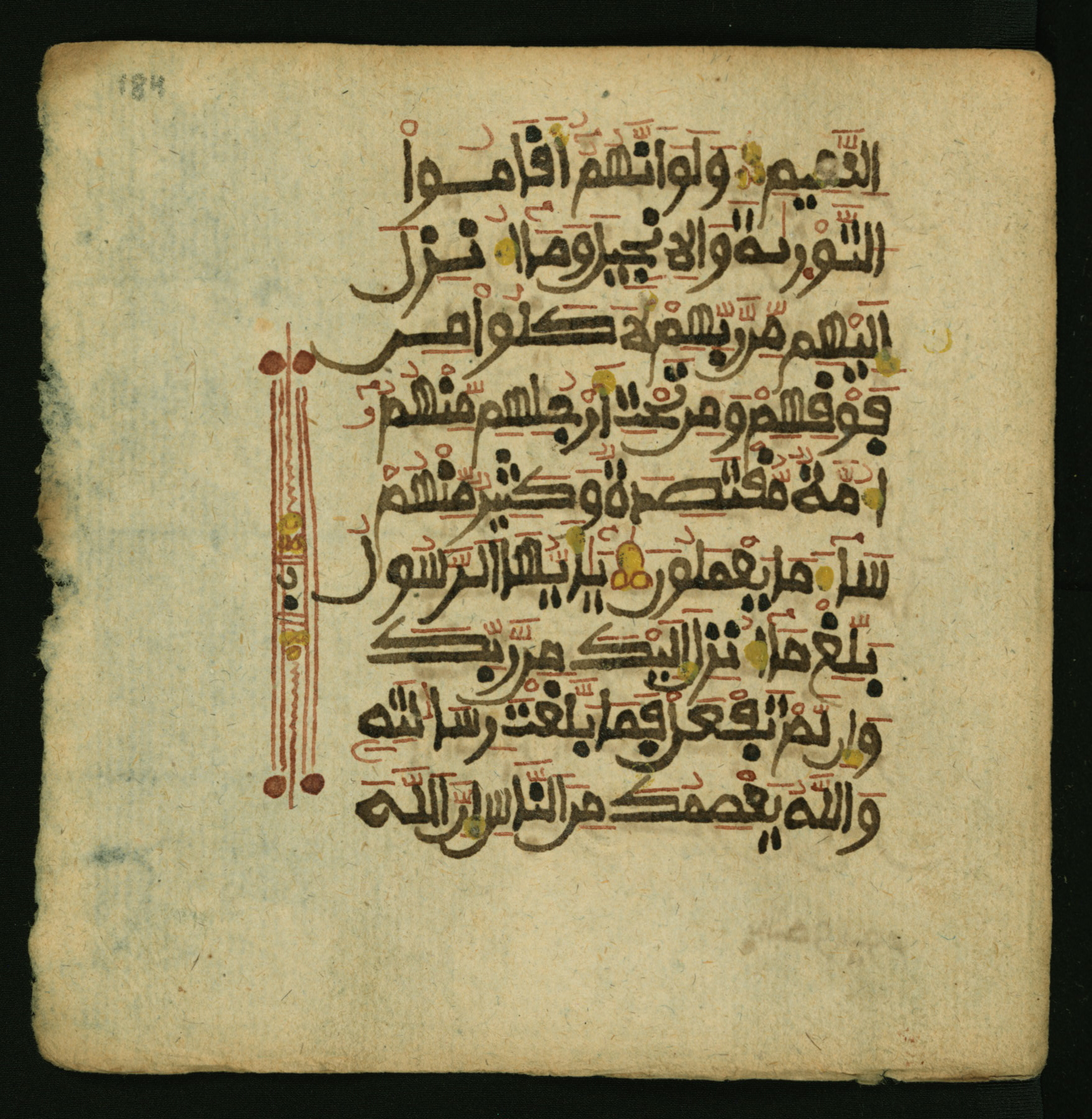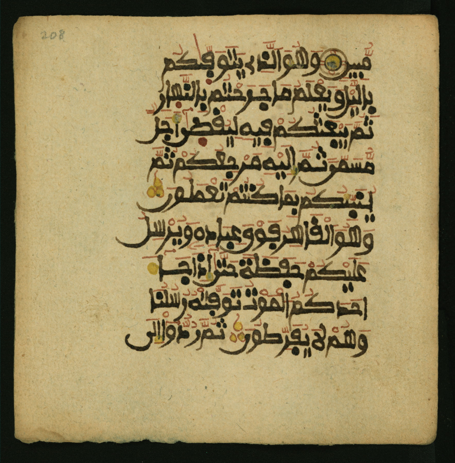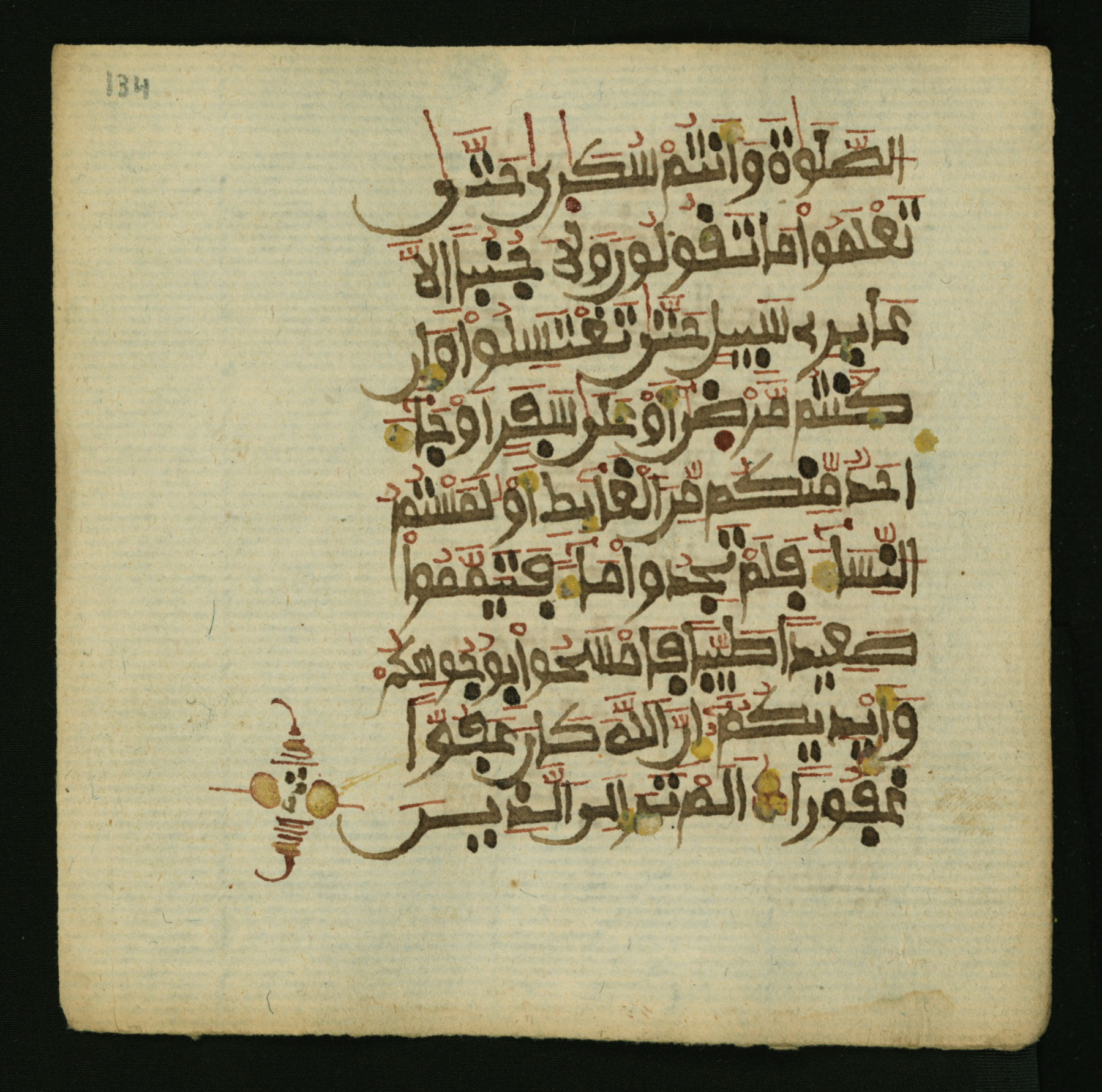 This square-format manuscript is volume 1, containing chapters 1-18 (Sūrat al-fātiḥah through Sūrat al-kahf), of an illuminated two-volume Qur'an produced in Sub-Saharan (West) Africa in the thirteenth century AH / nineteenth CE. The text is written in Sūdānī script in dark brown ink with vocalization in red on loose leaves. Chapter headings are in reddish-brown ink. Three yellow dots outlined in red arranged in a triangular form separate verses. Polychrome circular medallions as well as square and rectangular devices in a variety of patterns and colors mark textual divisions. The leaves of the text are organized between two decorated boards with geometric compositions. The pages and boards are housed in a leather pouch (satchel).