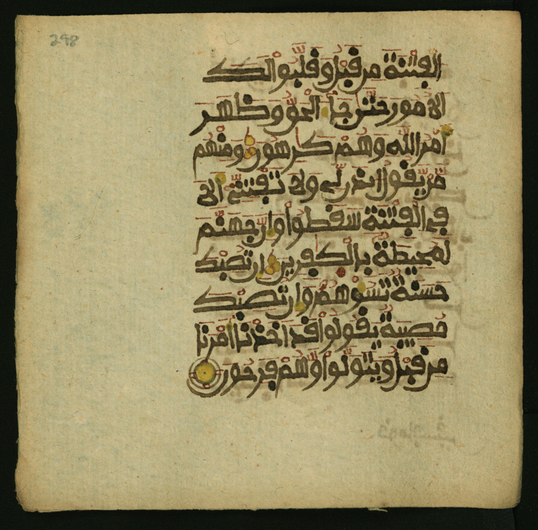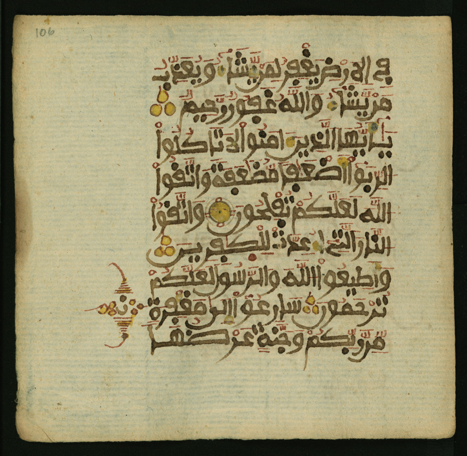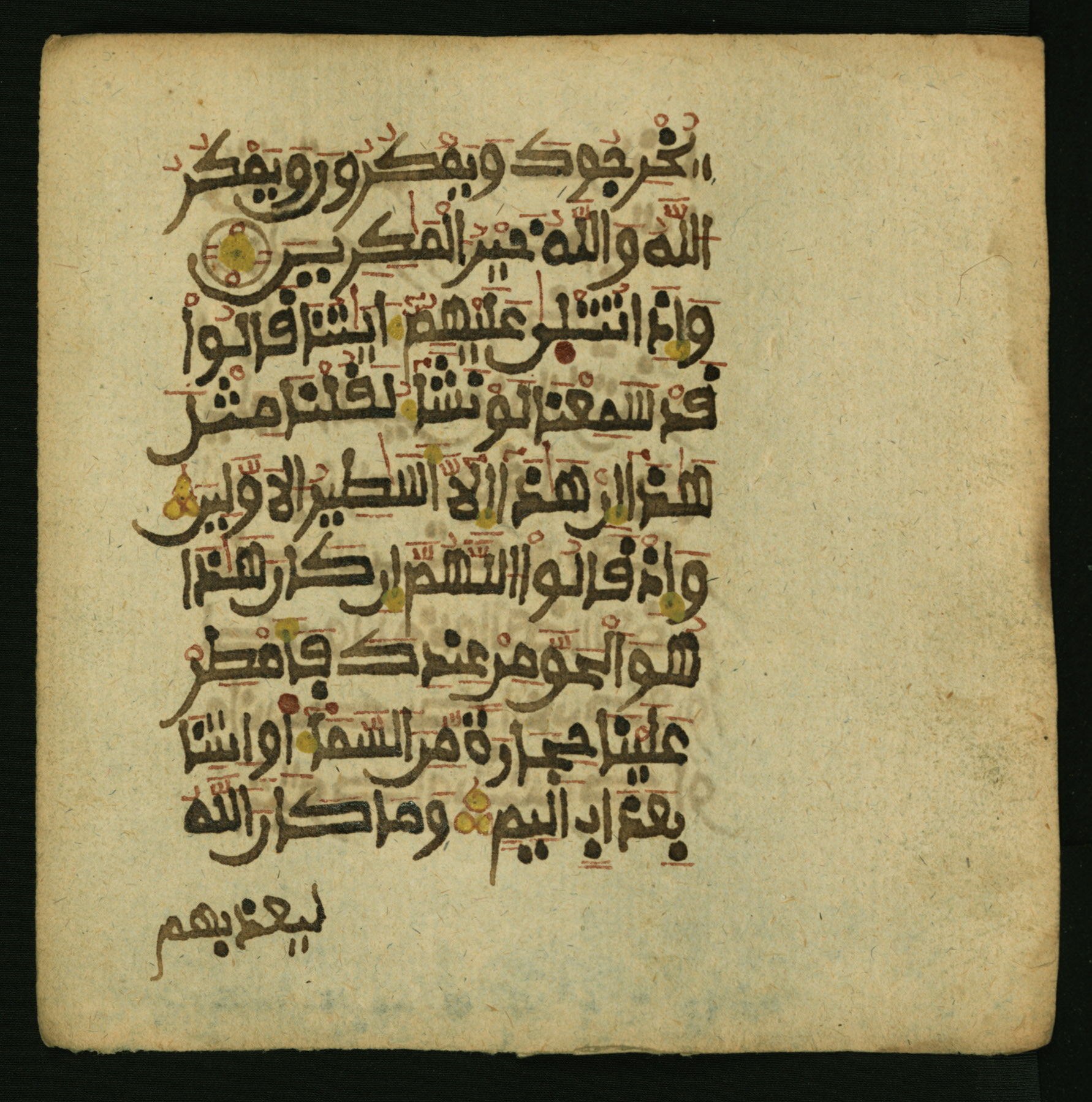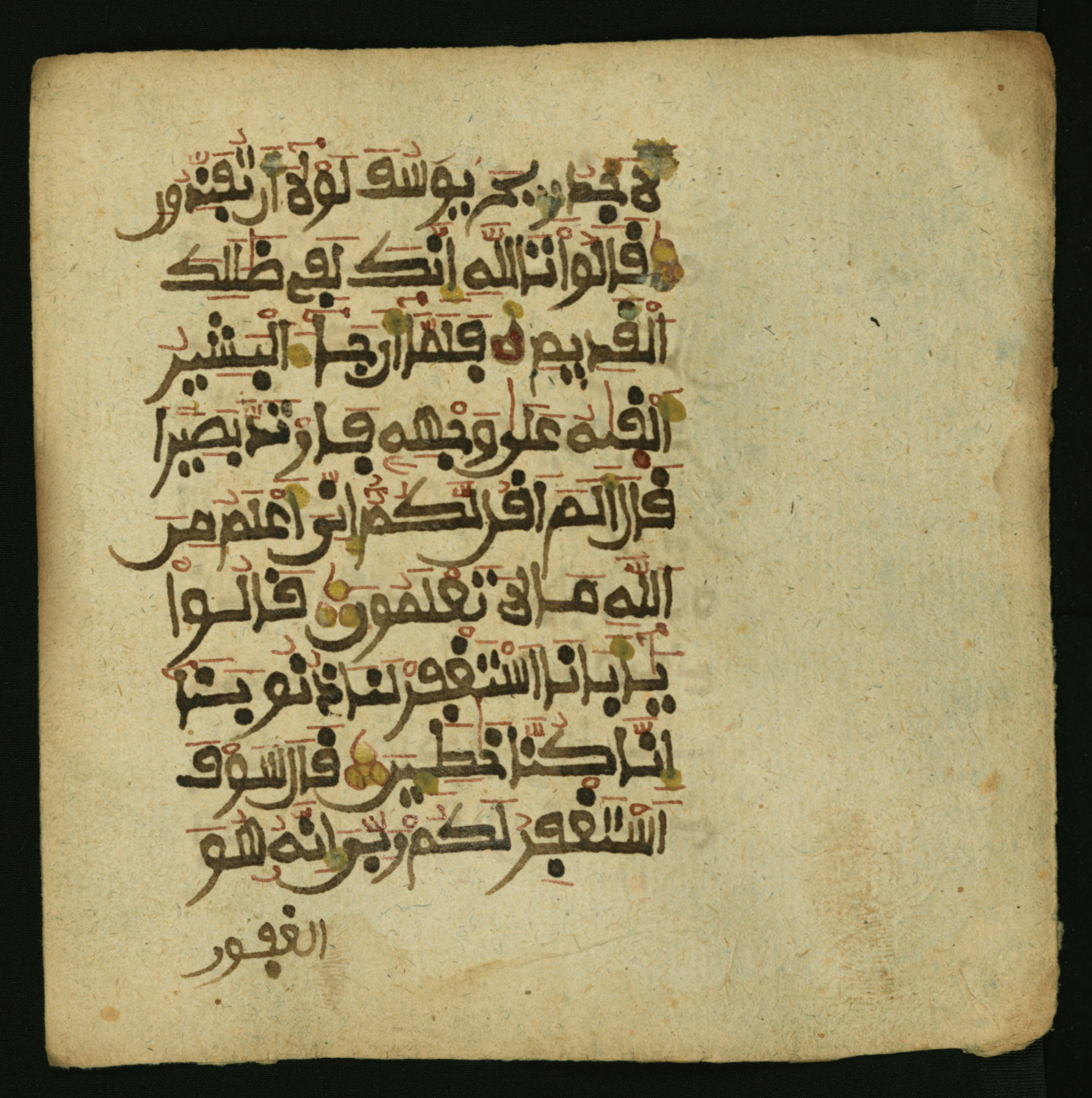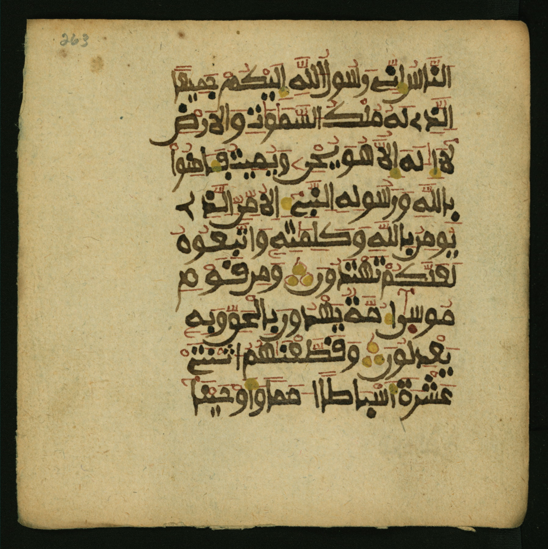 This square-format manuscript is volume 1, containing chapters 1-18 (Sūrat al-fātiḥah through Sūrat al-kahf), of an illuminated two-volume Qur'an produced in Sub-Saharan (West) Africa in the thirteenth century AH / nineteenth CE. The text is written in Sūdānī script in dark brown ink with vocalization in red on loose leaves. Chapter headings are in reddish-brown ink. Three yellow dots outlined in red arranged in a triangular form separate verses. Polychrome circular medallions as well as square and rectangular devices in a variety of patterns and colors mark textual divisions. The leaves of the text are organized between two decorated boards with geometric compositions. The pages and boards are housed in a leather pouch (satchel).