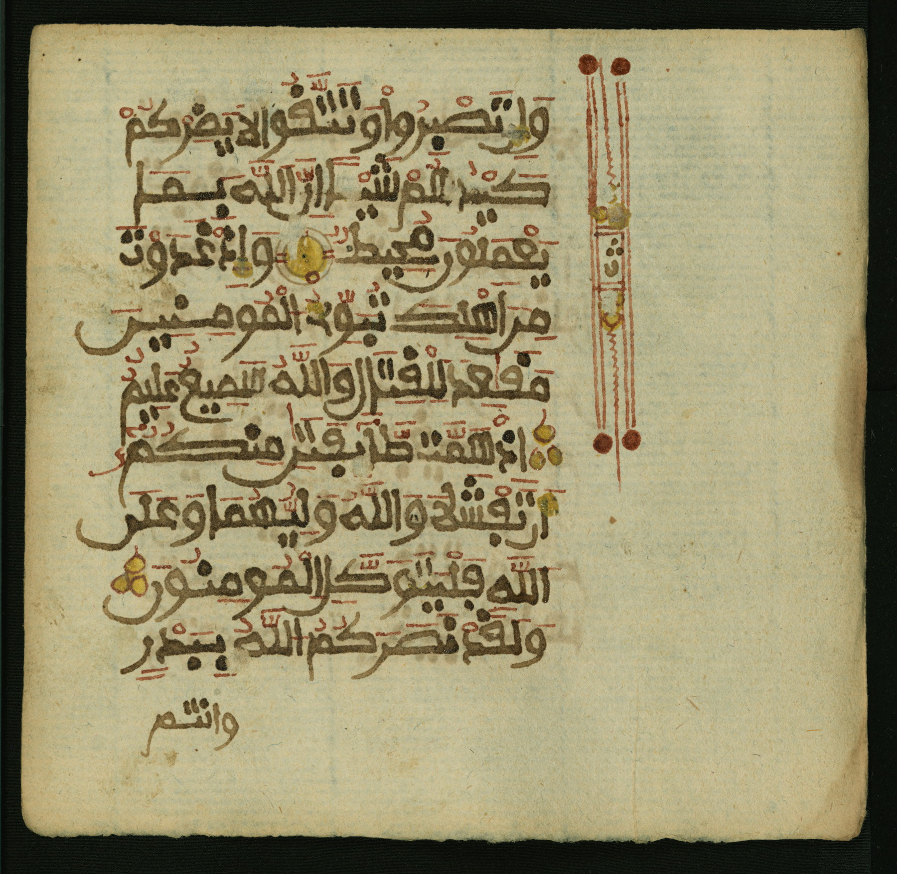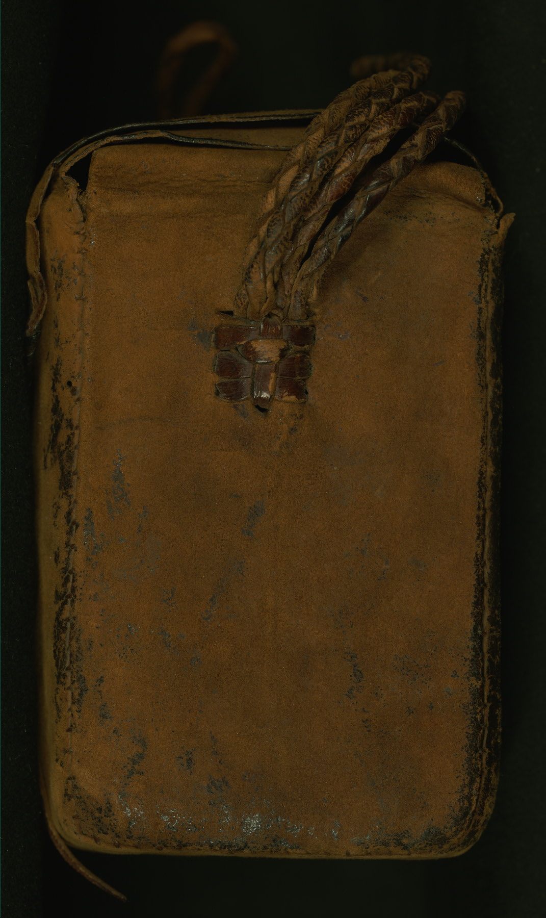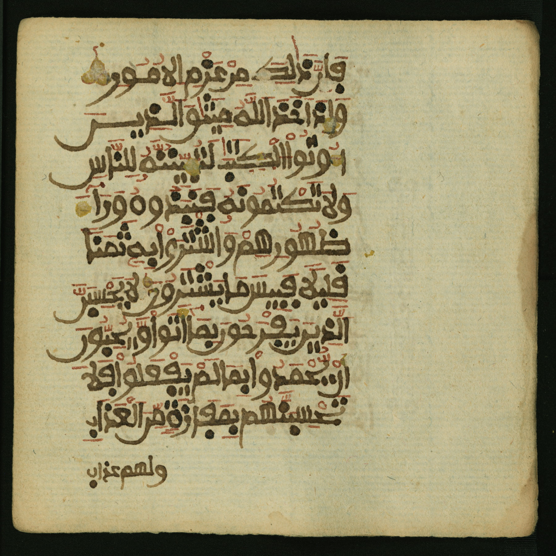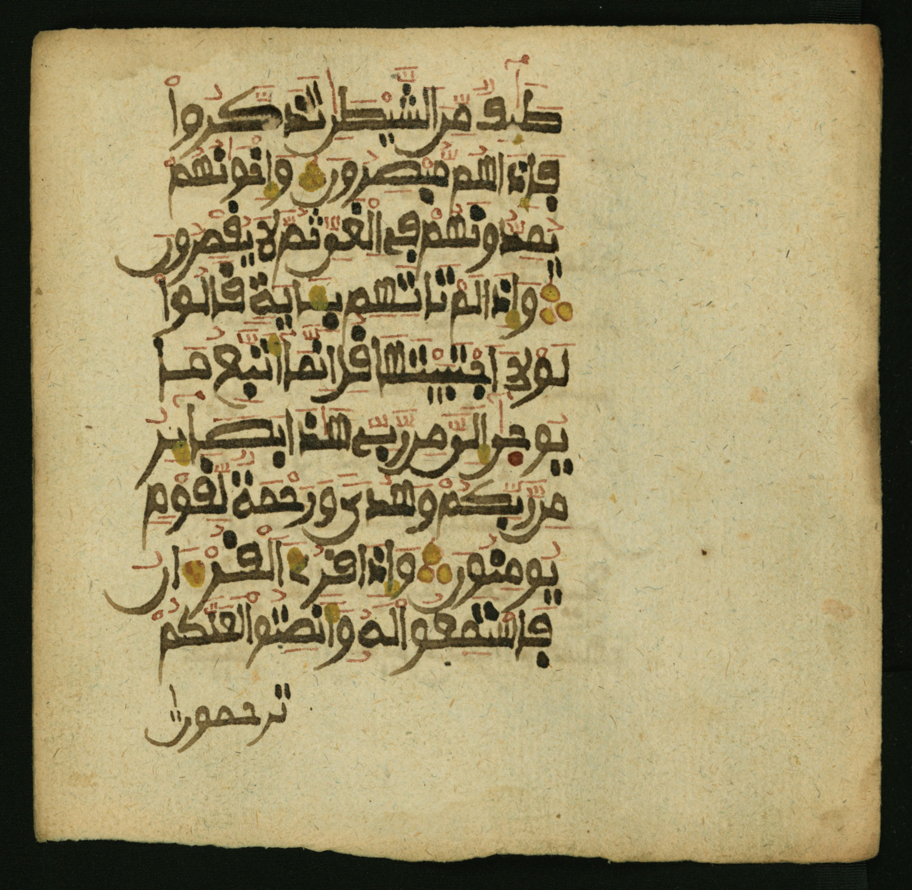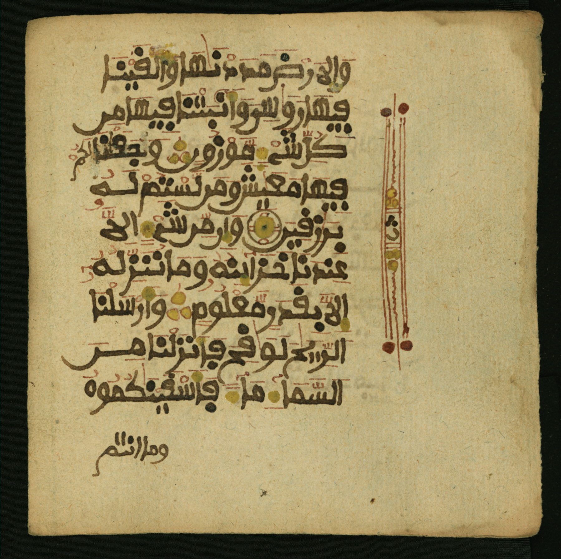 This square-format manuscript is volume 1, containing chapters 1-18 (Sūrat al-fātiḥah through Sūrat al-kahf), of an illuminated two-volume Qur'an produced in Sub-Saharan (West) Africa in the thirteenth century AH / nineteenth CE. The text is written in Sūdānī script in dark brown ink with vocalization in red on loose leaves. Chapter headings are in reddish-brown ink. Three yellow dots outlined in red arranged in a triangular form separate verses. Polychrome circular medallions as well as square and rectangular devices in a variety of patterns and colors mark textual divisions. The leaves of the text are organized between two decorated boards with geometric compositions. The pages and boards are housed in a leather pouch (satchel).