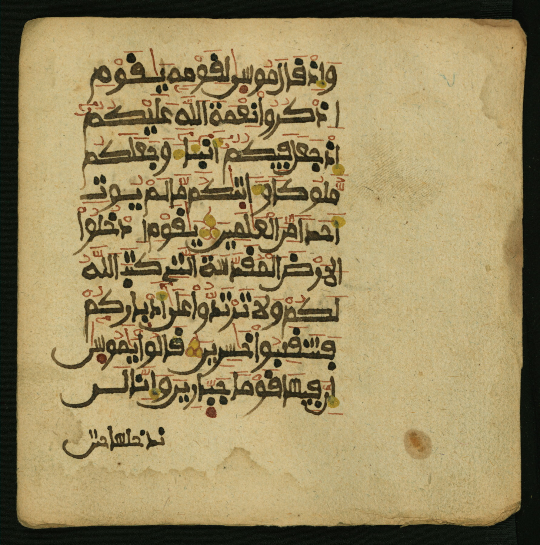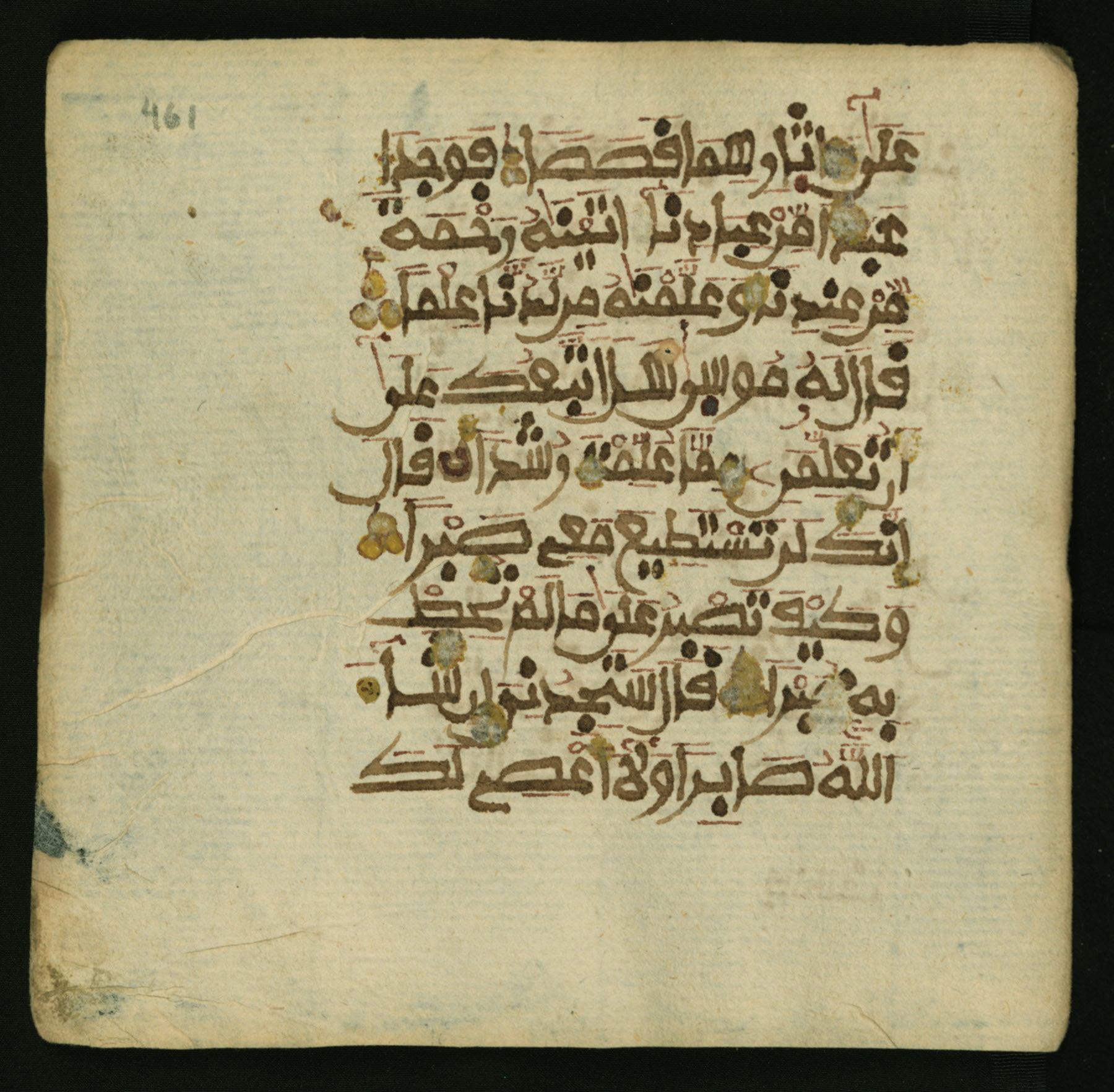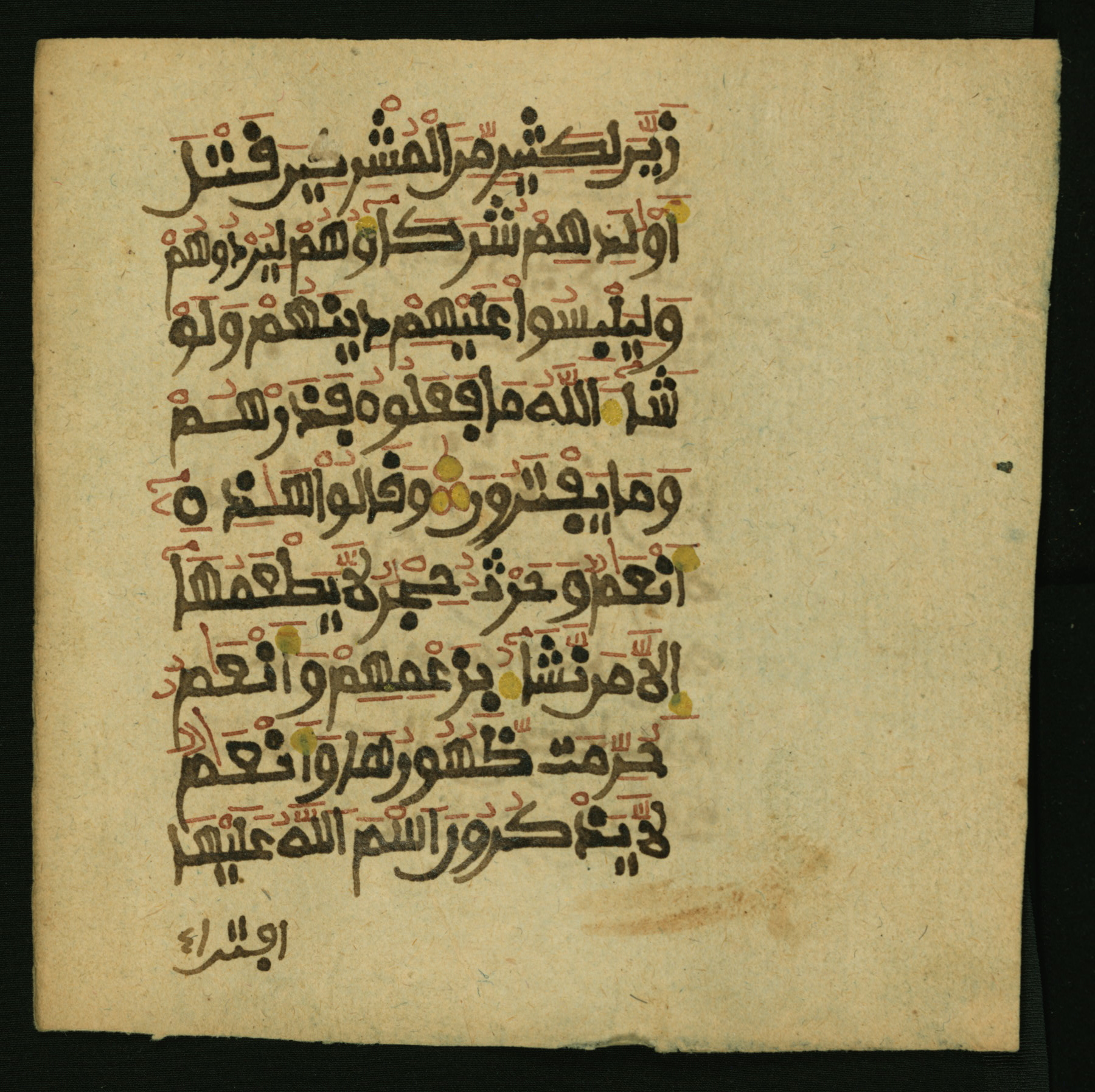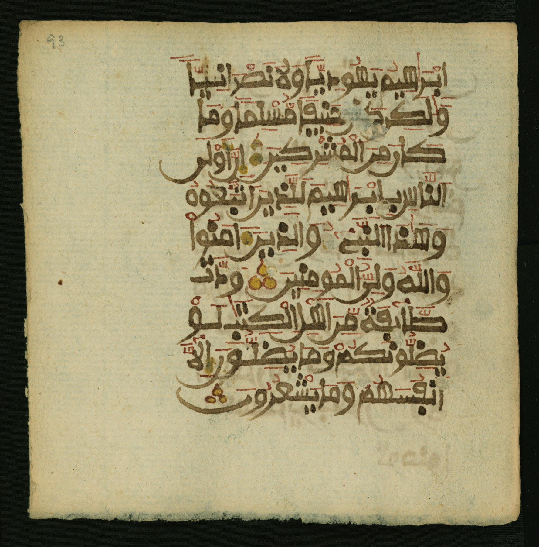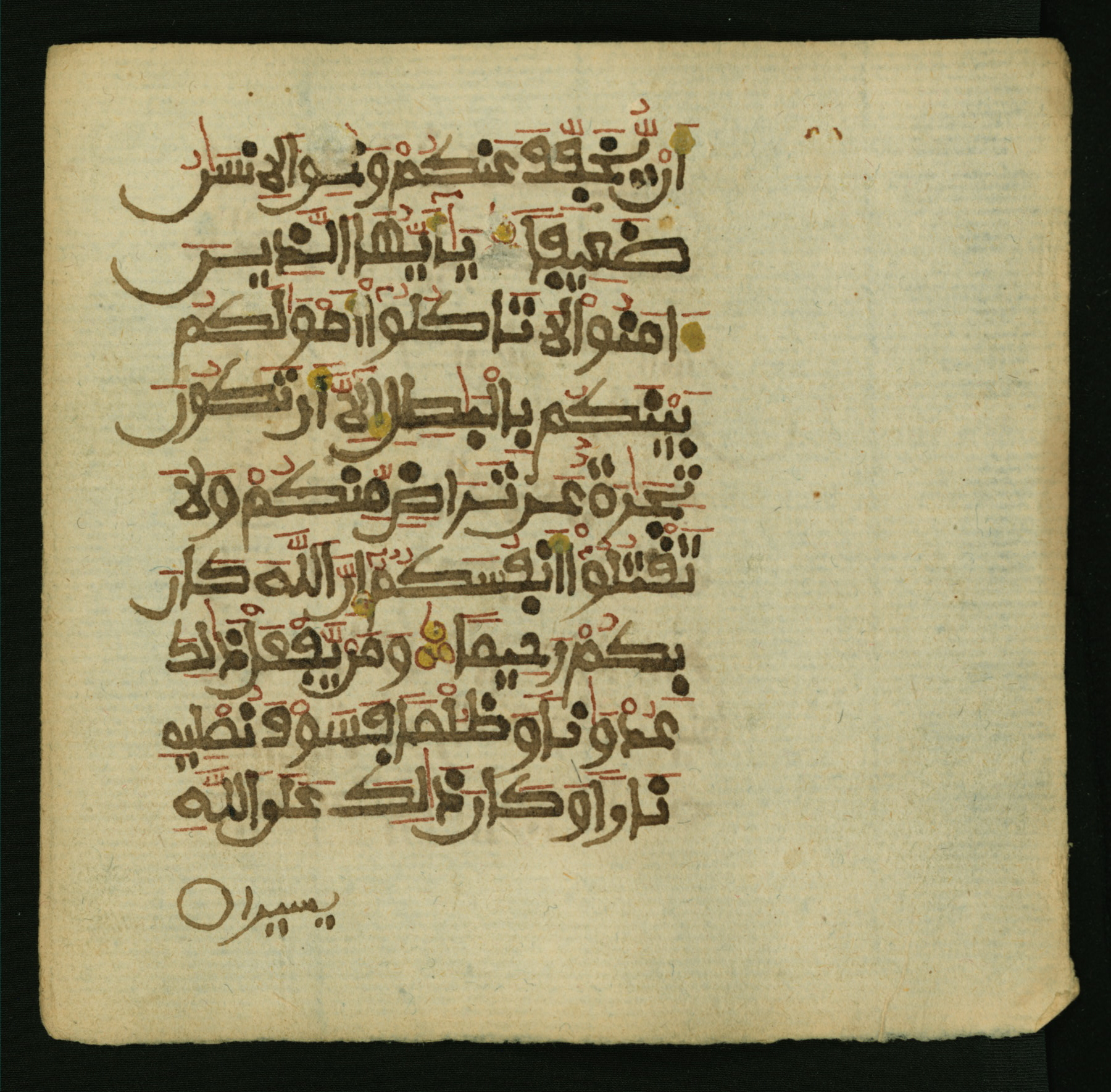 This square-format manuscript is volume 1, containing chapters 1-18 (Sūrat al-fātiḥah through Sūrat al-kahf), of an illuminated two-volume Qur'an produced in Sub-Saharan (West) Africa in the thirteenth century AH / nineteenth CE. The text is written in Sūdānī script in dark brown ink with vocalization in red on loose leaves. Chapter headings are in reddish-brown ink. Three yellow dots outlined in red arranged in a triangular form separate verses. Polychrome circular medallions as well as square and rectangular devices in a variety of patterns and colors mark textual divisions. The leaves of the text are organized between two decorated boards with geometric compositions. The pages and boards are housed in a leather pouch (satchel).