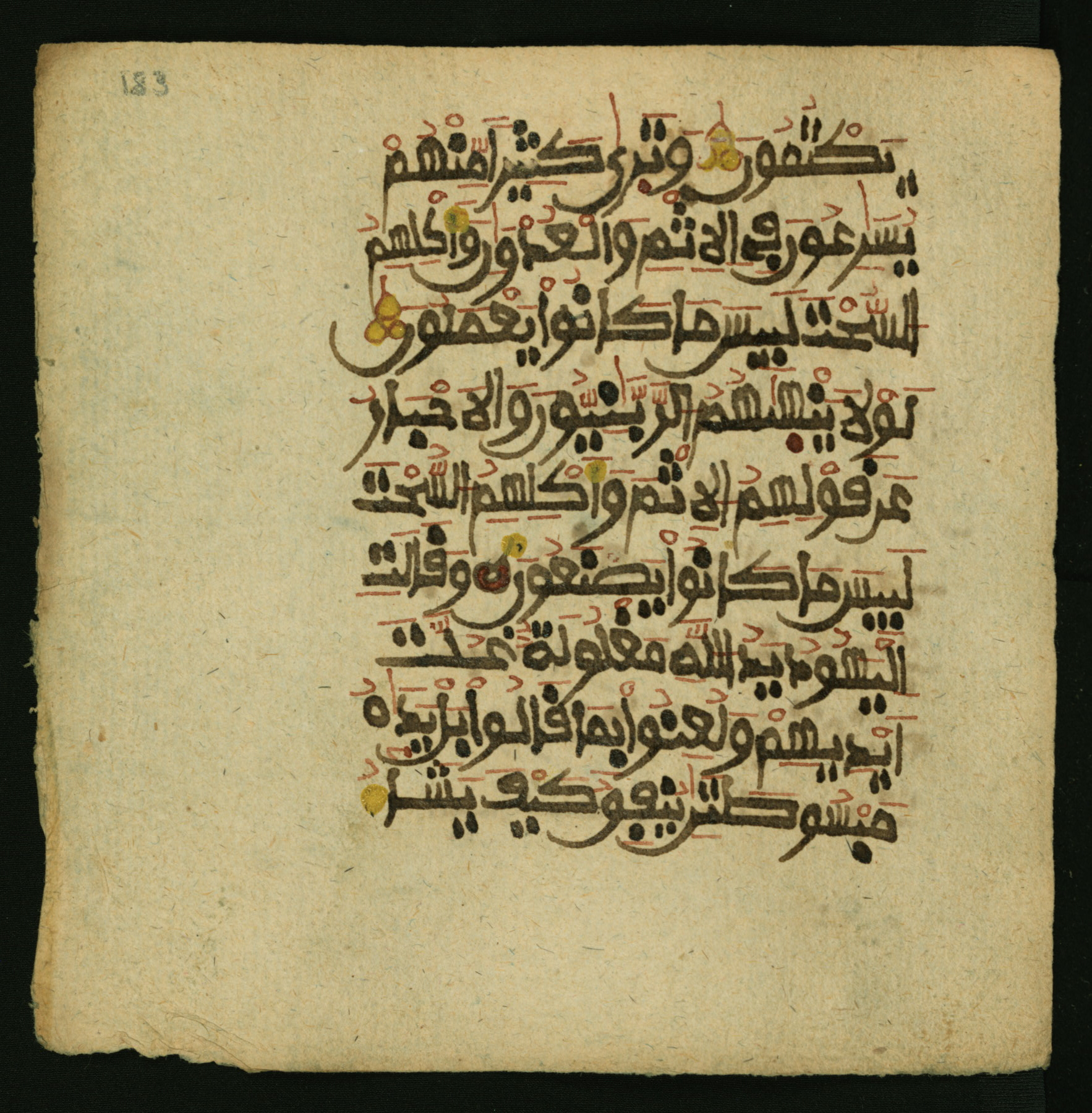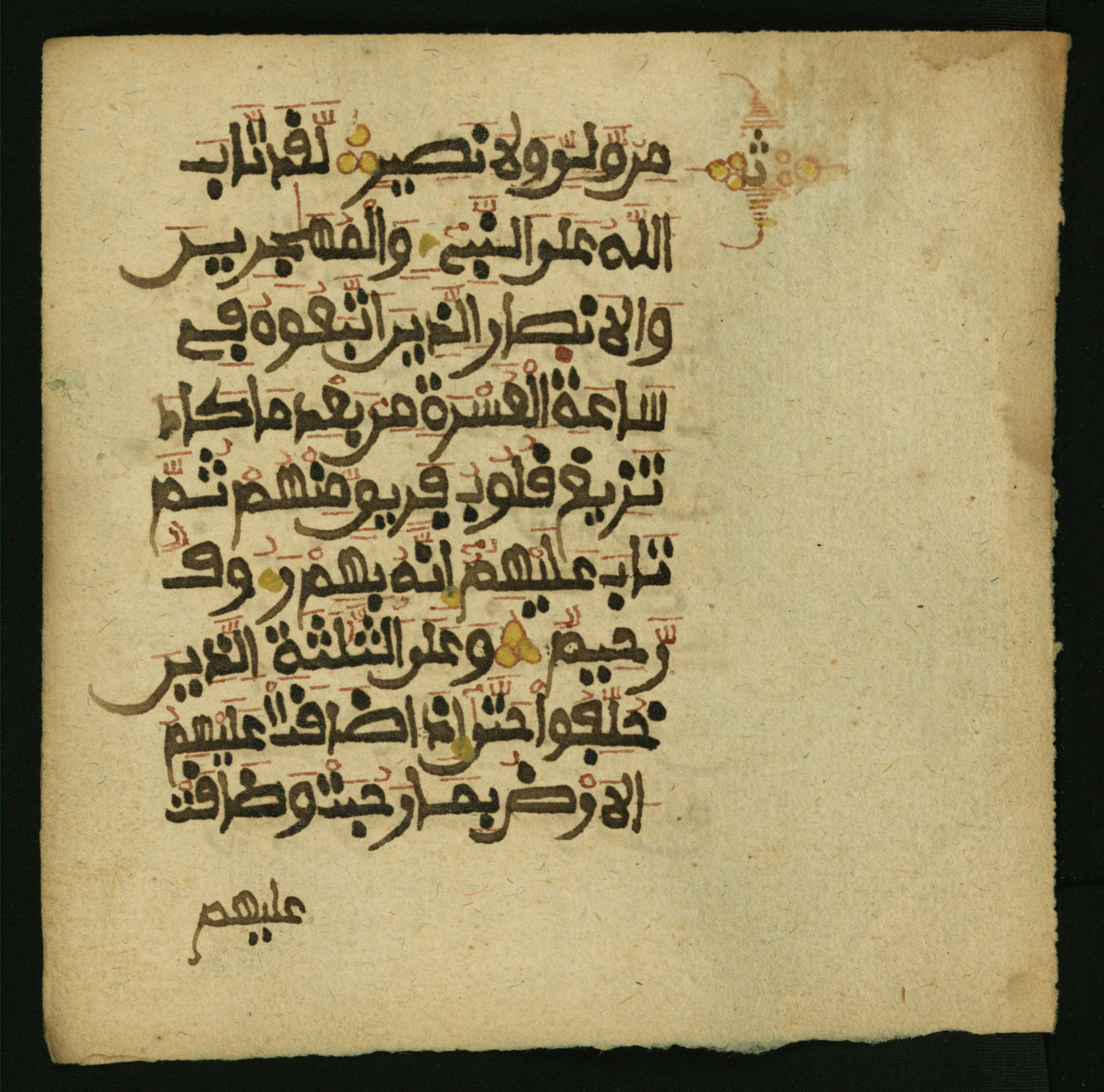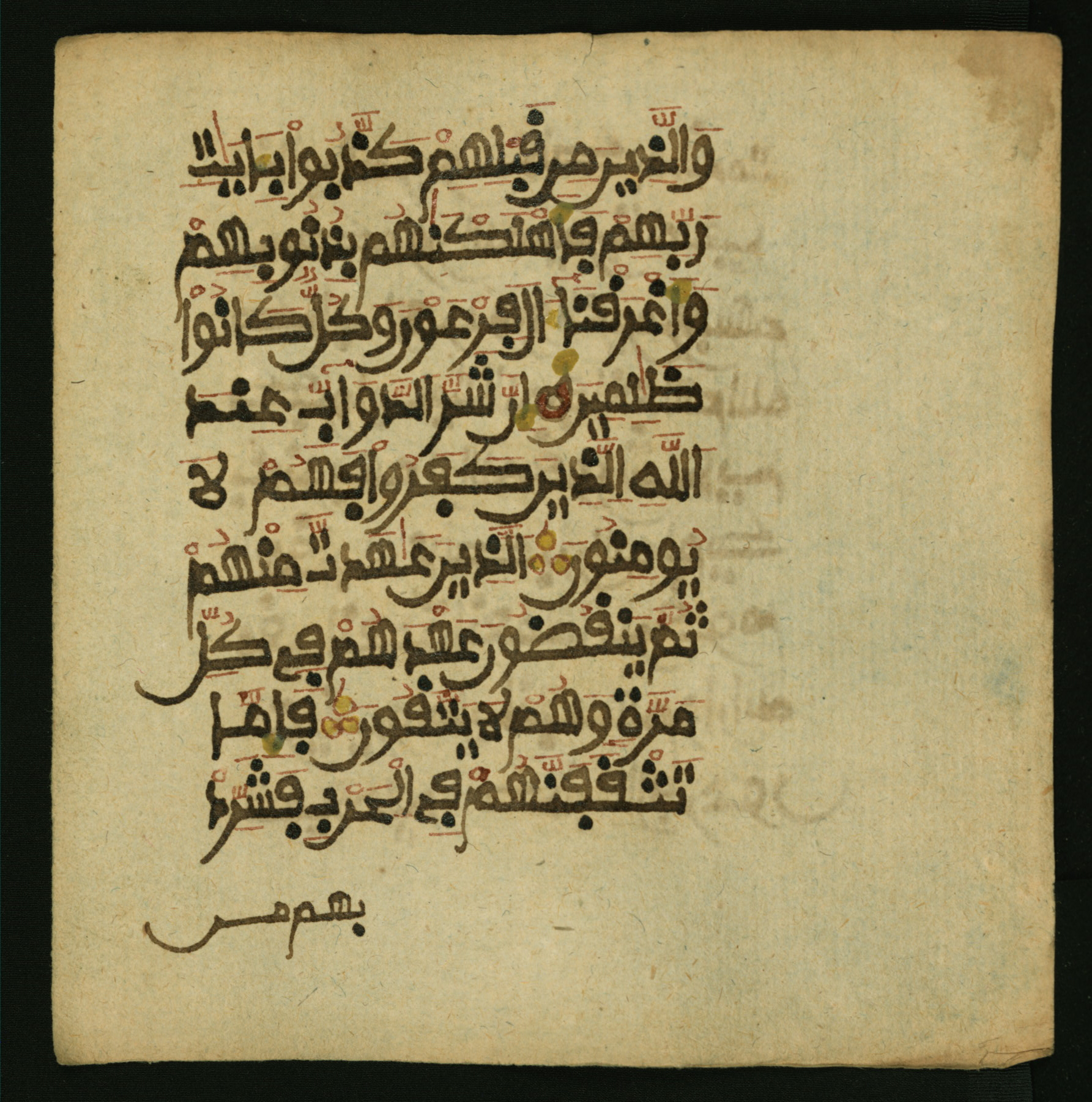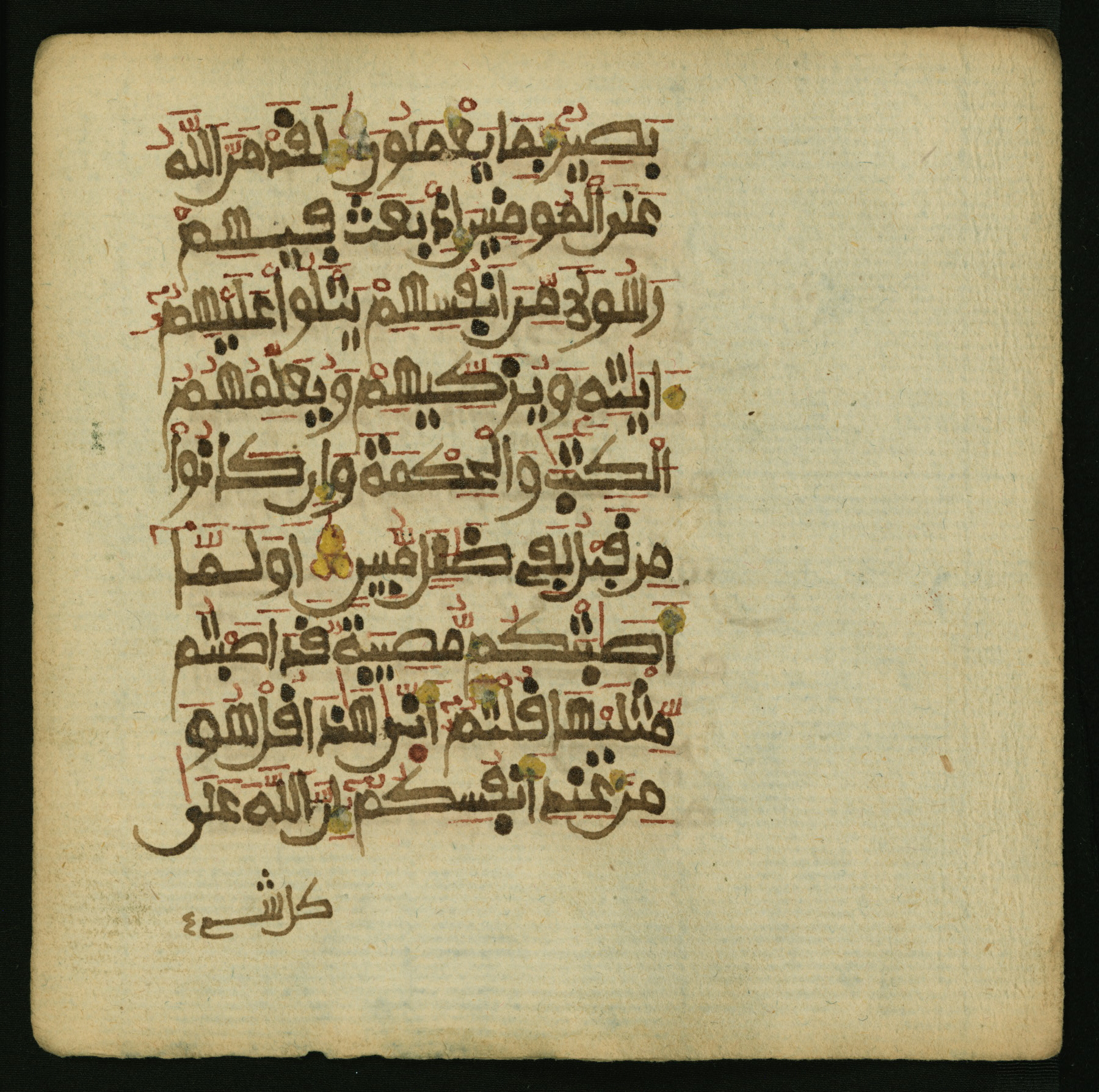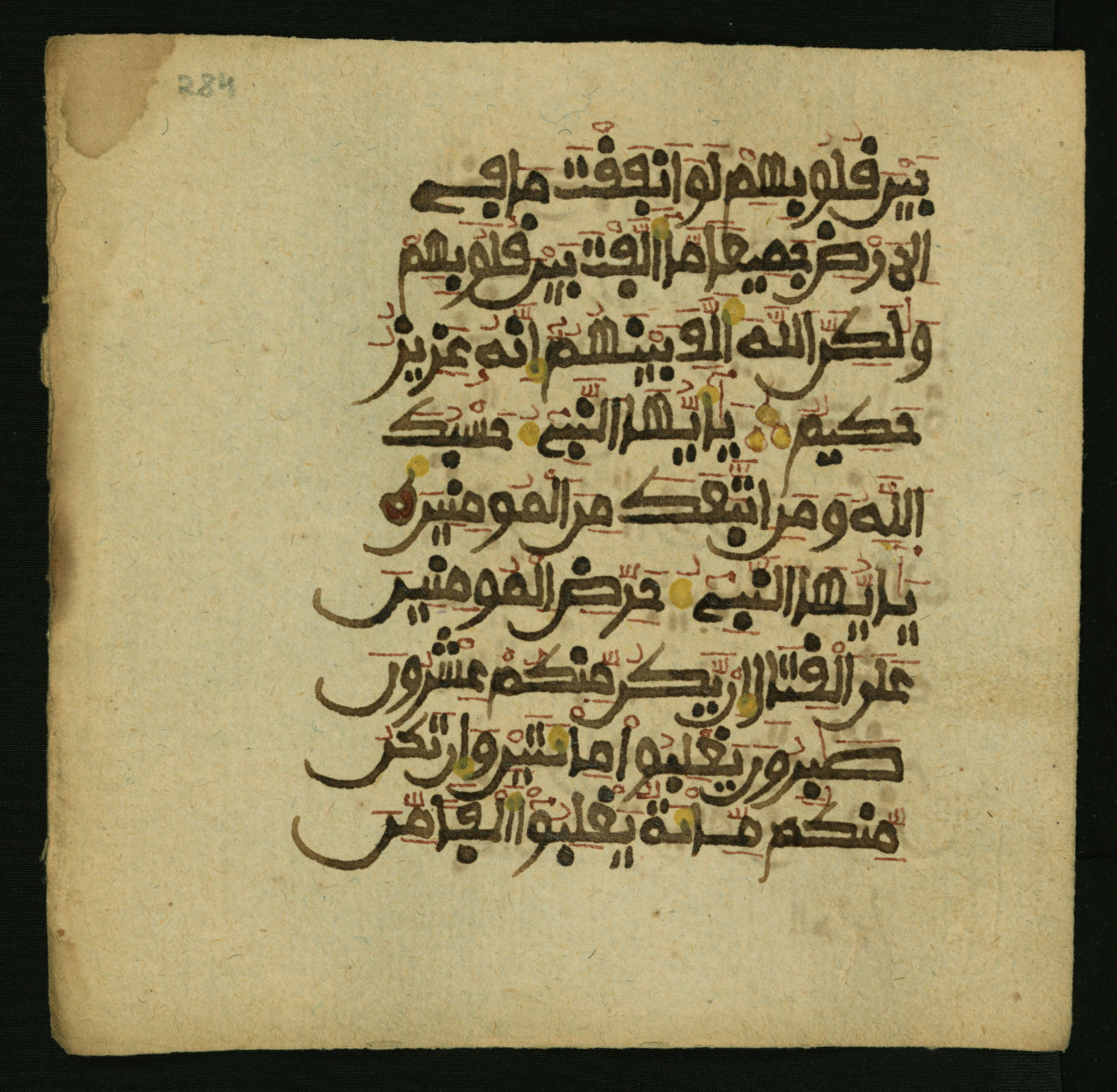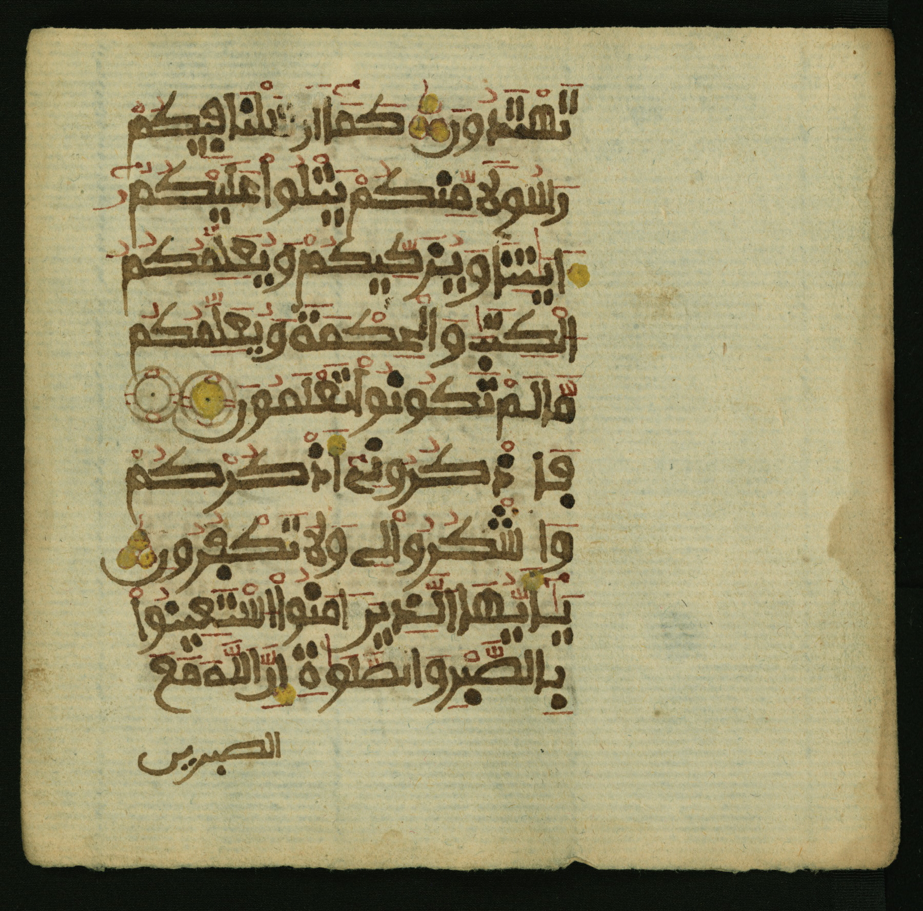 This square-format manuscript is volume 1, containing chapters 1-18 (Sūrat al-fātiḥah through Sūrat al-kahf), of an illuminated two-volume Qur'an produced in Sub-Saharan (West) Africa in the thirteenth century AH / nineteenth CE. The text is written in Sūdānī script in dark brown ink with vocalization in red on loose leaves. Chapter headings are in reddish-brown ink. Three yellow dots outlined in red arranged in a triangular form separate verses. Polychrome circular medallions as well as square and rectangular devices in a variety of patterns and colors mark textual divisions. The leaves of the text are organized between two decorated boards with geometric compositions. The pages and boards are housed in a leather pouch (satchel).