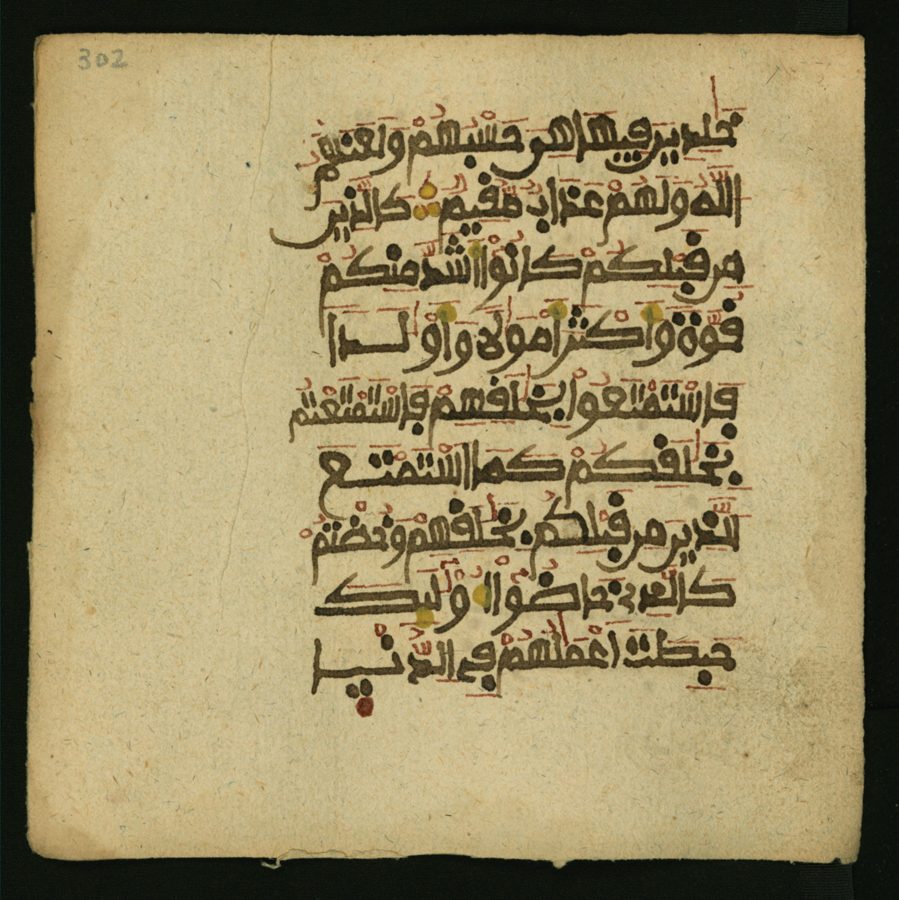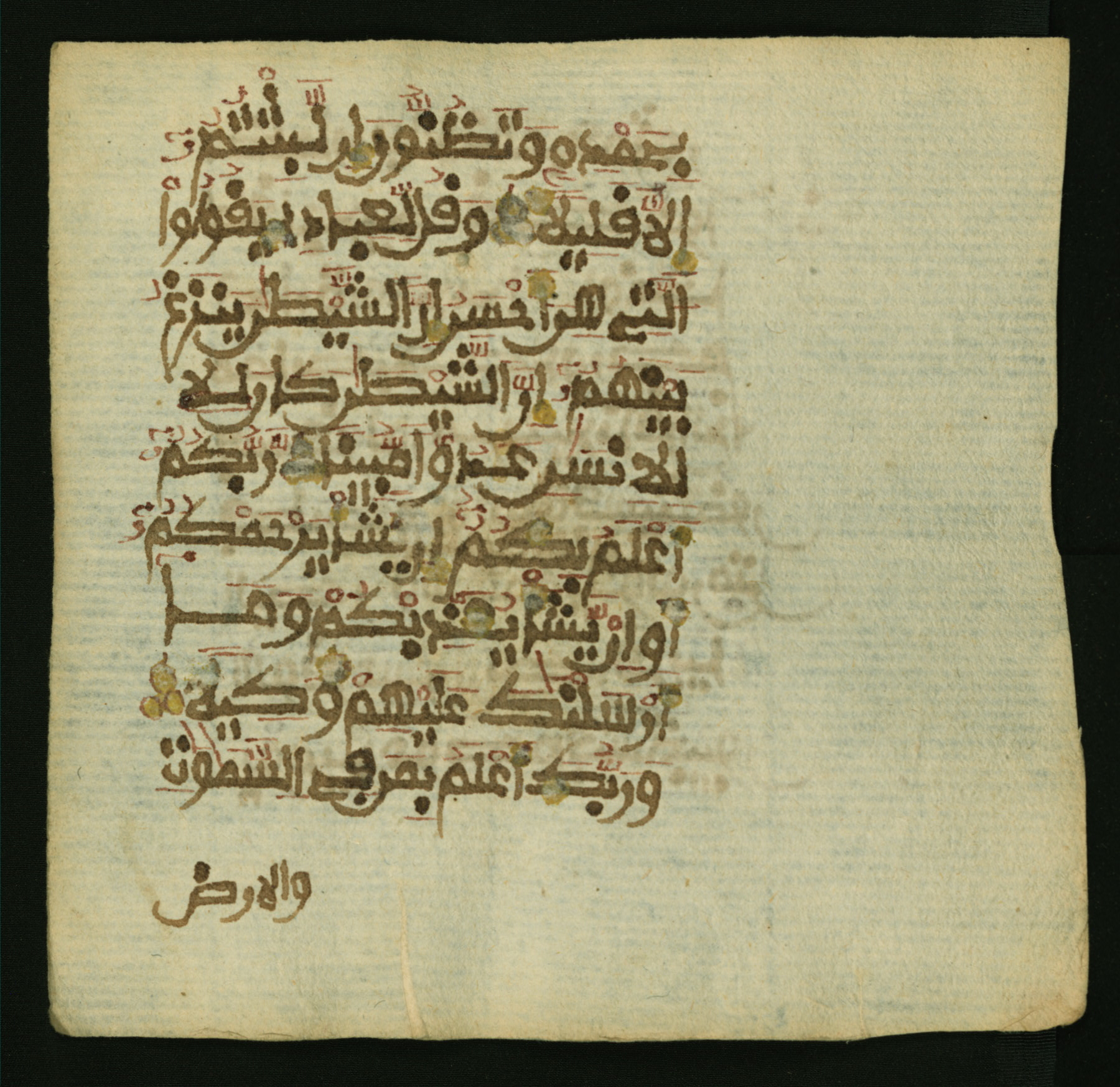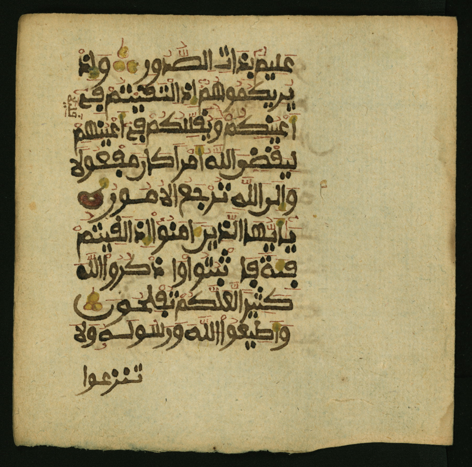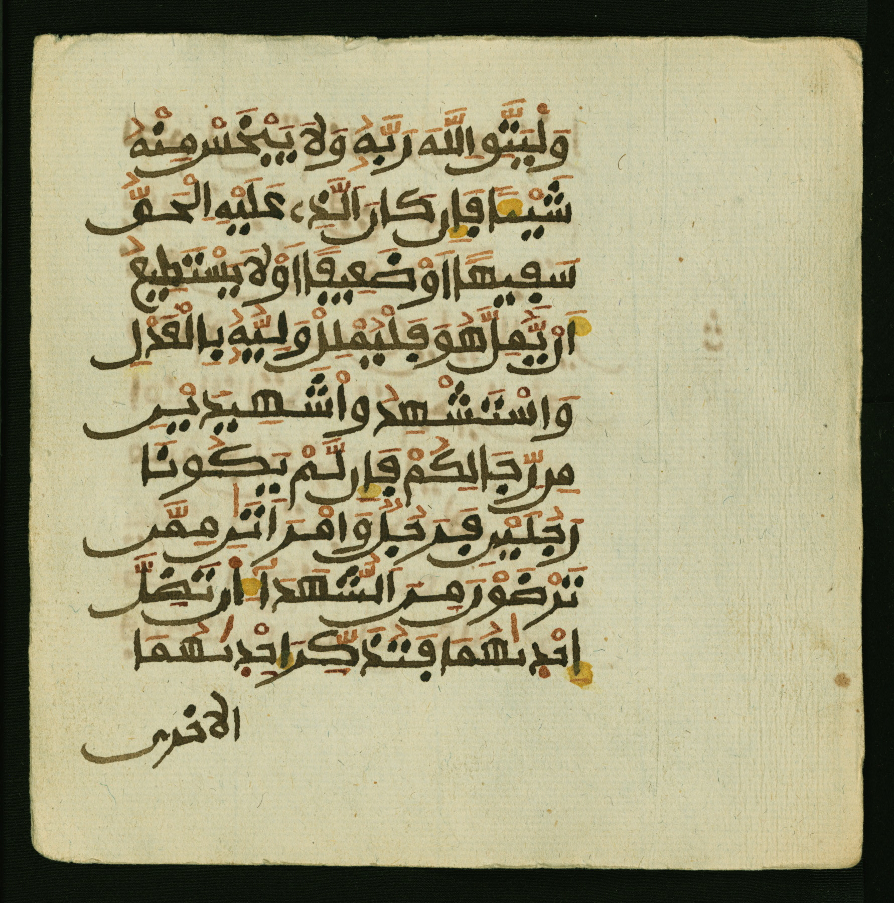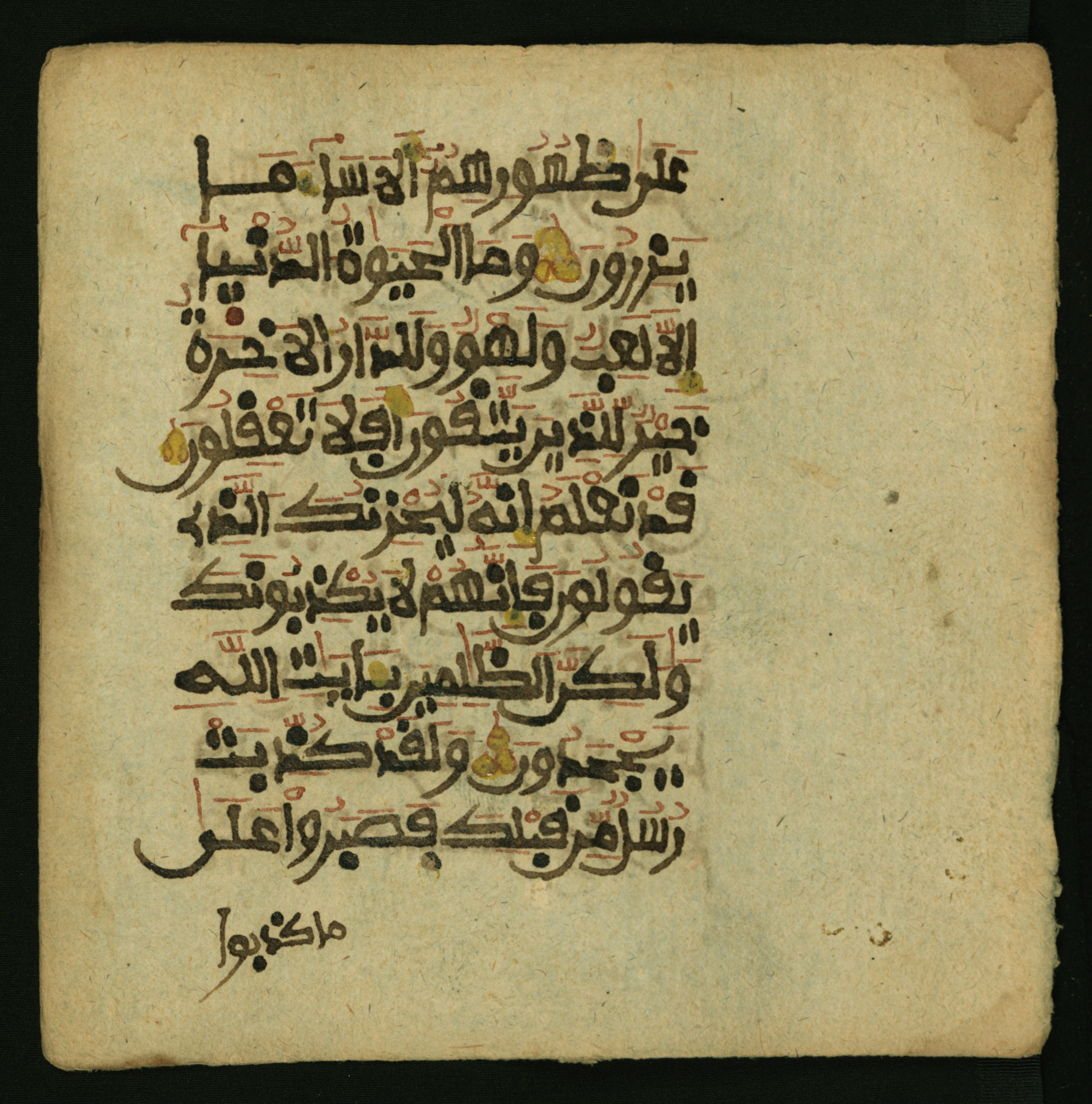 This square-format manuscript is volume 1, containing chapters 1-18 (Sūrat al-fātiḥah through Sūrat al-kahf), of an illuminated two-volume Qur'an produced in Sub-Saharan (West) Africa in the thirteenth century AH / nineteenth CE. The text is written in Sūdānī script in dark brown ink with vocalization in red on loose leaves. Chapter headings are in reddish-brown ink. Three yellow dots outlined in red arranged in a triangular form separate verses. Polychrome circular medallions as well as square and rectangular devices in a variety of patterns and colors mark textual divisions. The leaves of the text are organized between two decorated boards with geometric compositions. The pages and boards are housed in a leather pouch (satchel).