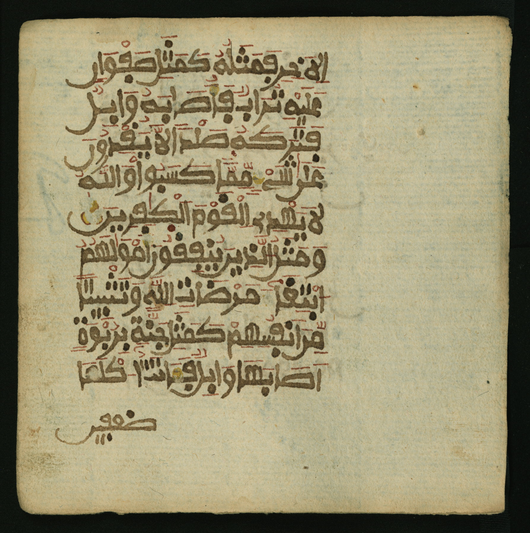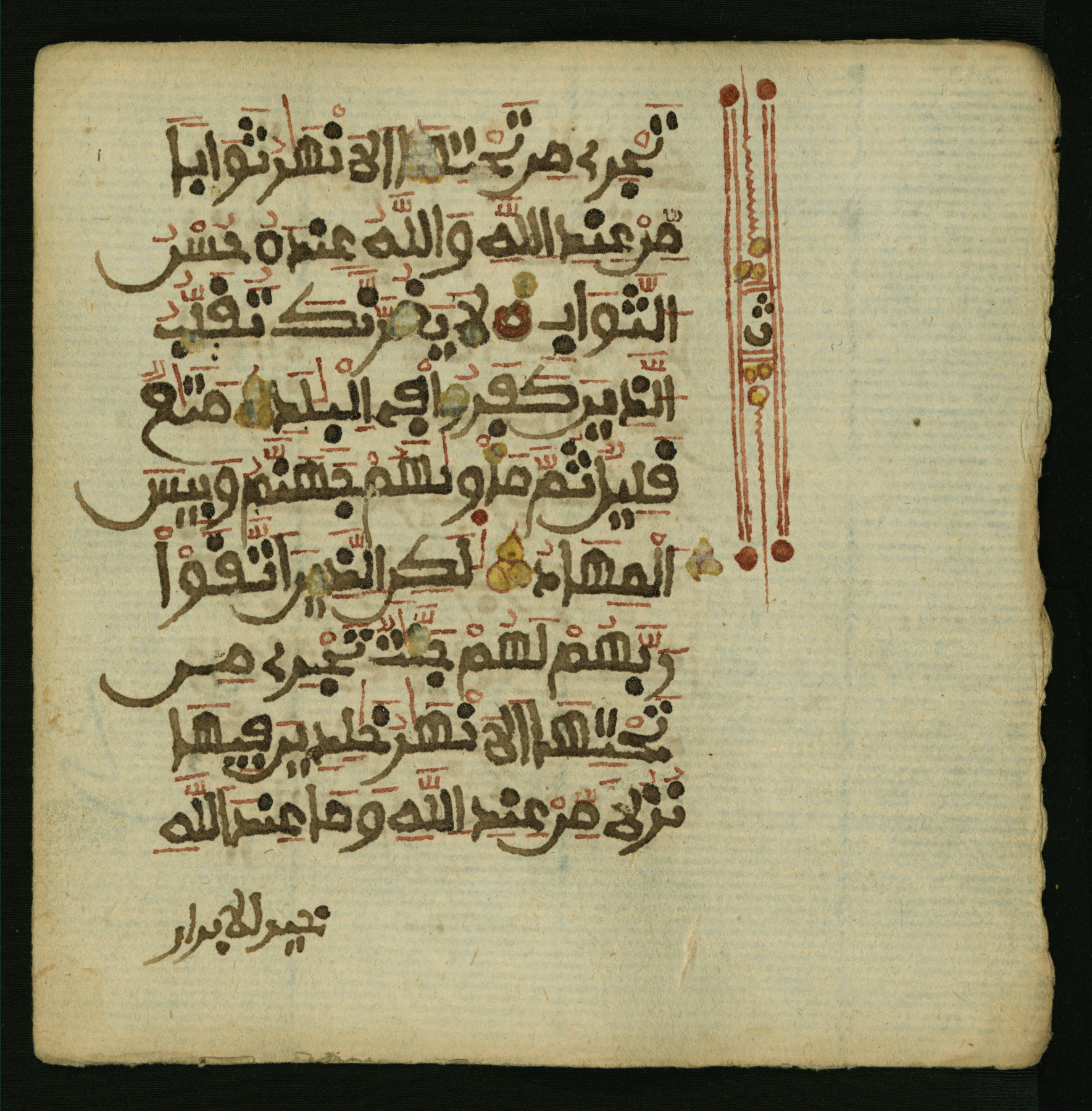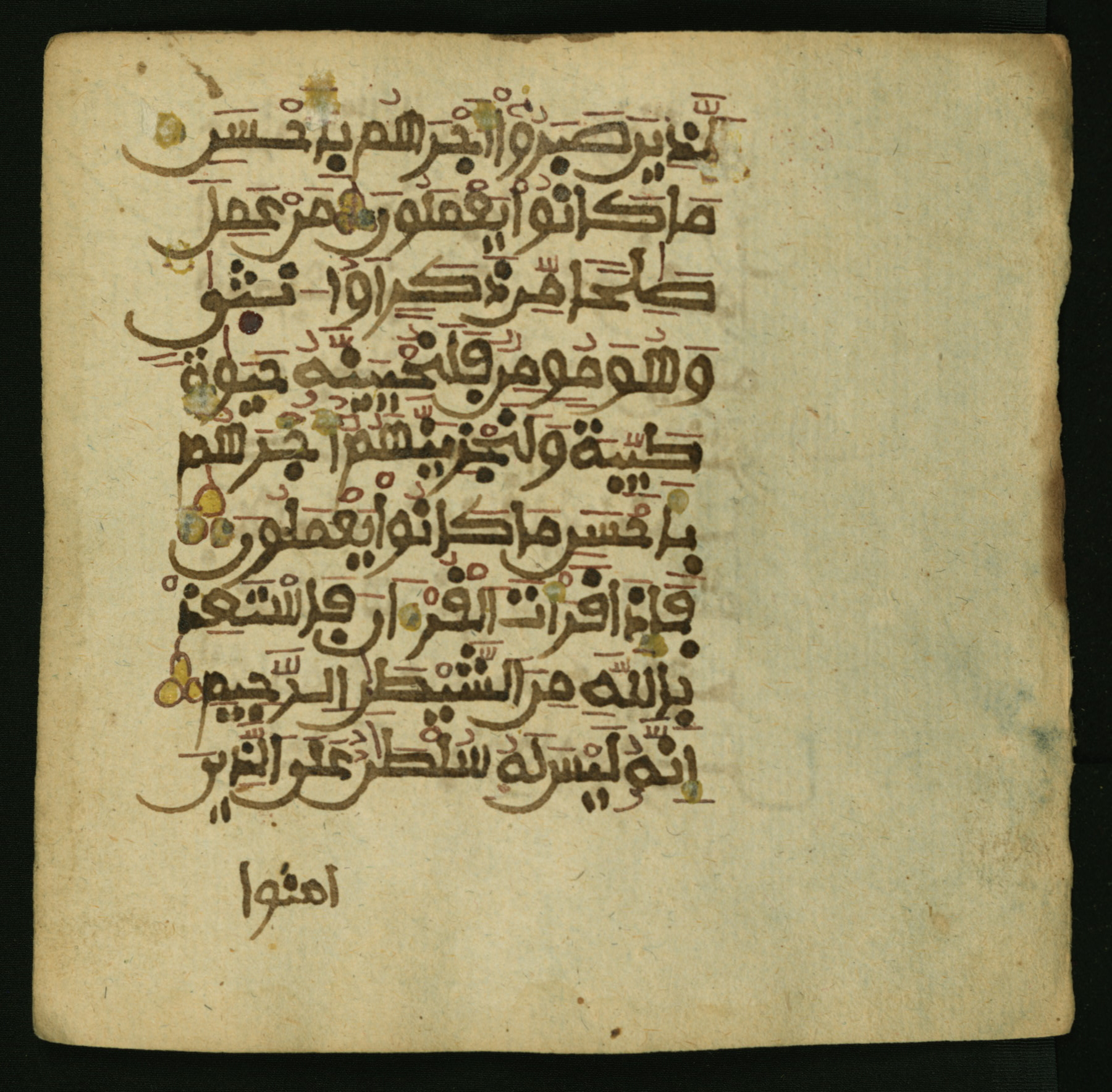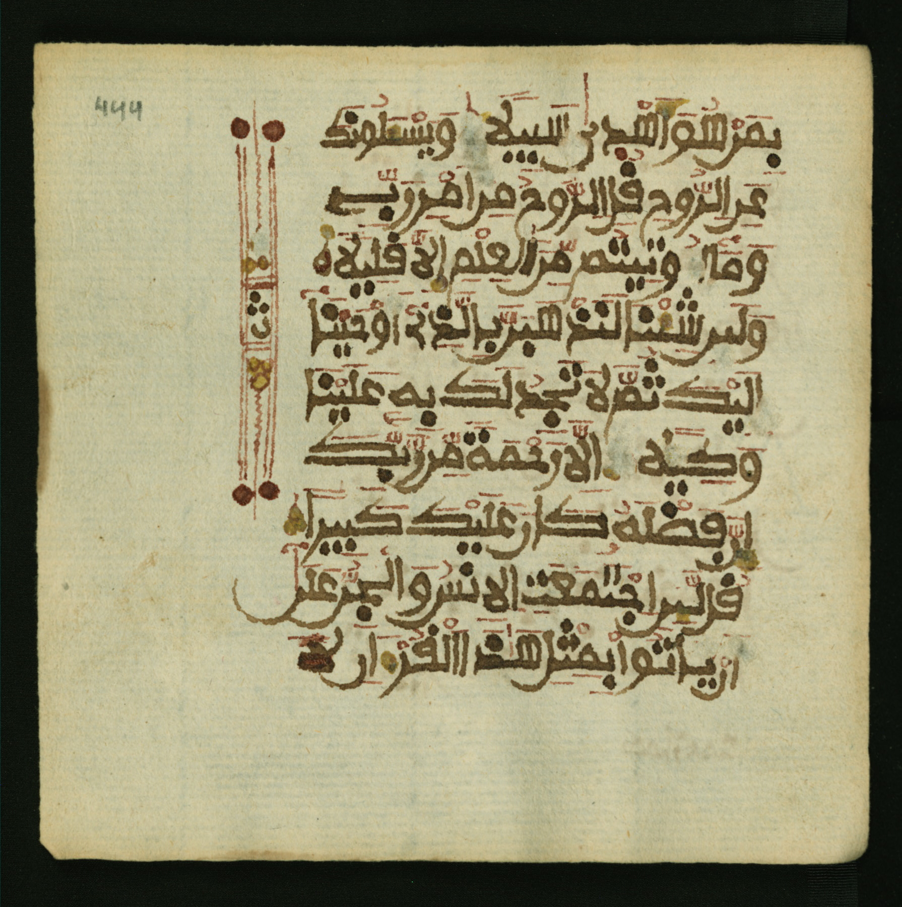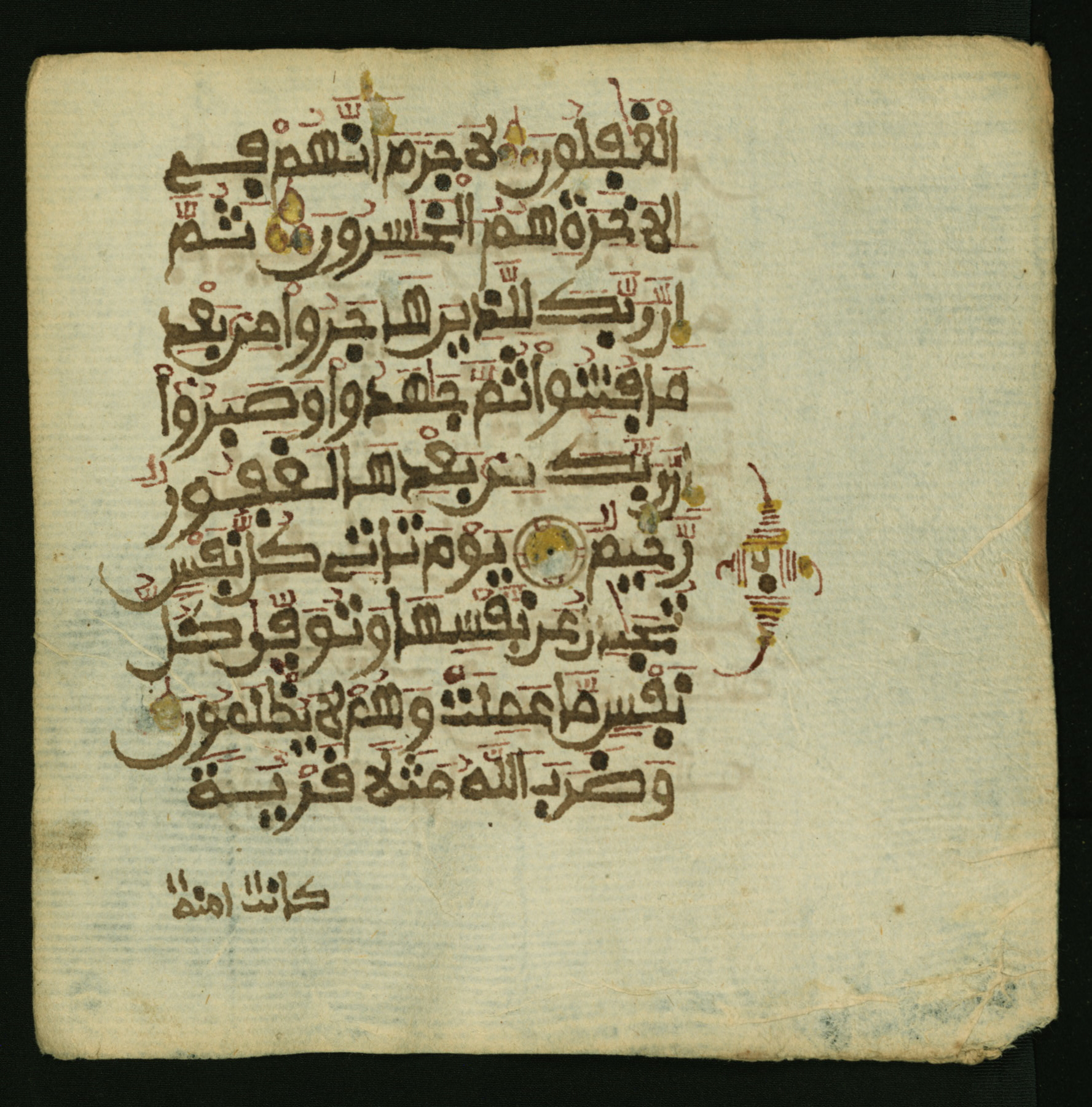 This square-format manuscript is volume 1, containing chapters 1-18 (Sūrat al-fātiḥah through Sūrat al-kahf), of an illuminated two-volume Qur'an produced in Sub-Saharan (West) Africa in the thirteenth century AH / nineteenth CE. The text is written in Sūdānī script in dark brown ink with vocalization in red on loose leaves. Chapter headings are in reddish-brown ink. Three yellow dots outlined in red arranged in a triangular form separate verses. Polychrome circular medallions as well as square and rectangular devices in a variety of patterns and colors mark textual divisions. The leaves of the text are organized between two decorated boards with geometric compositions. The pages and boards are housed in a leather pouch (satchel).