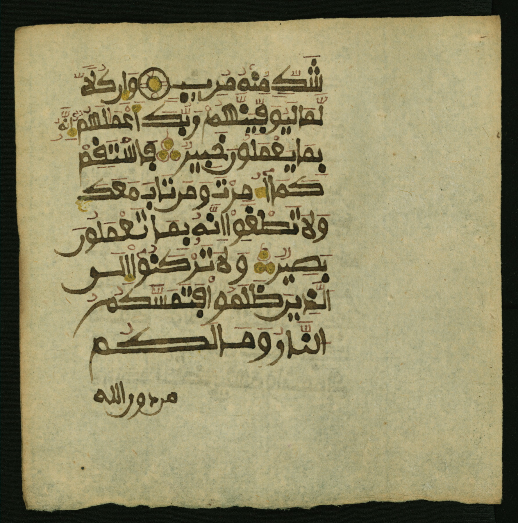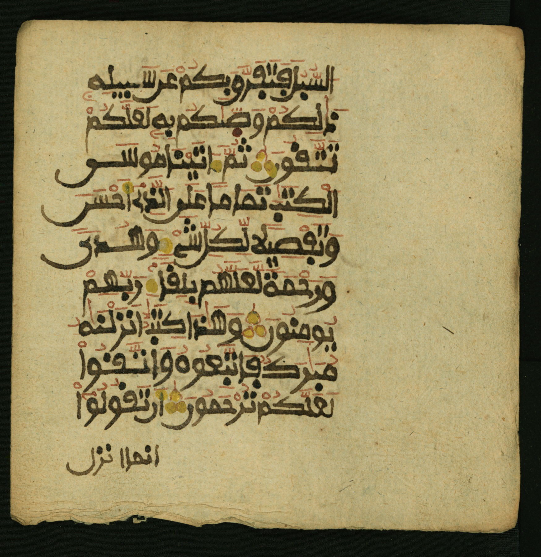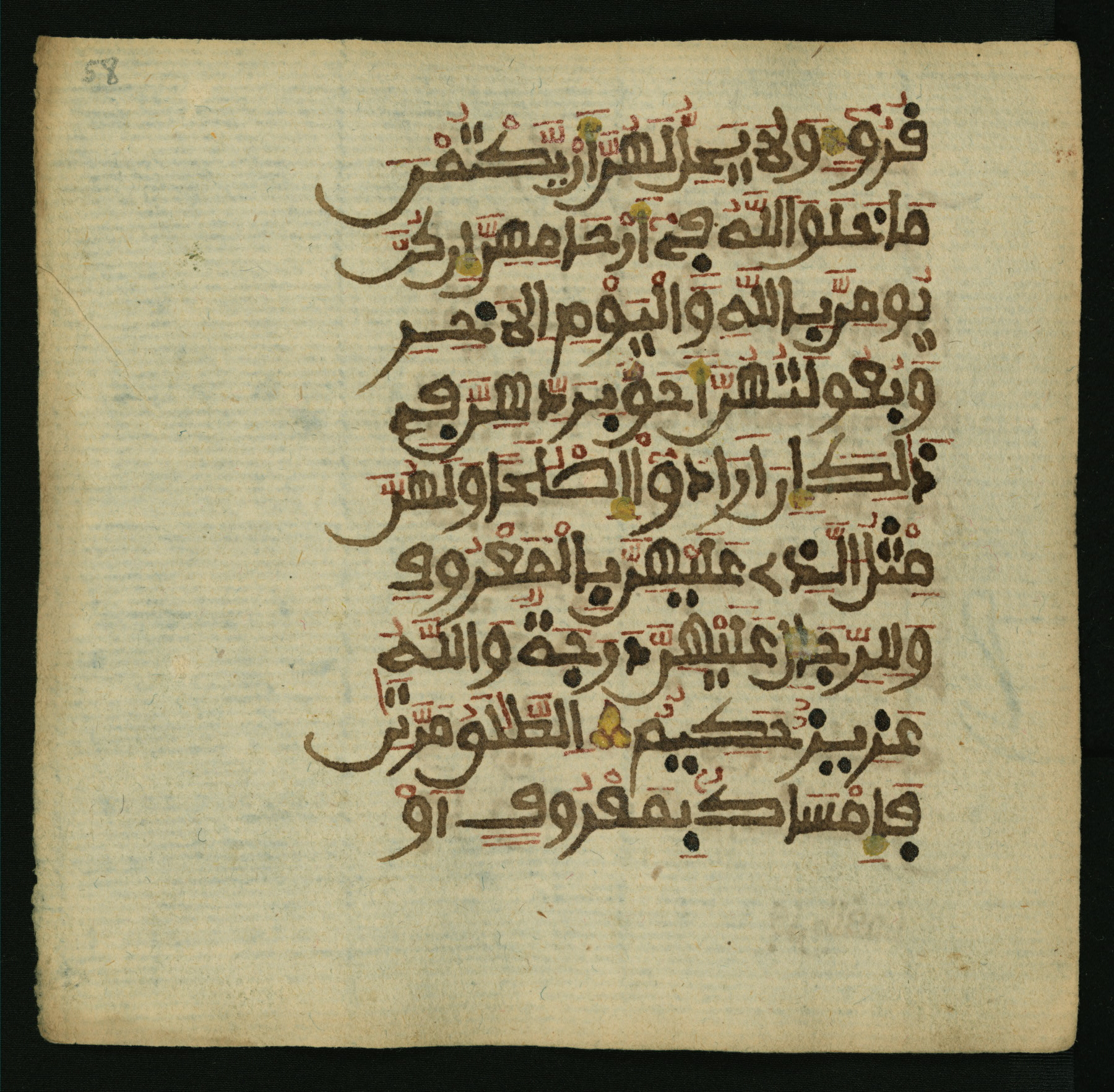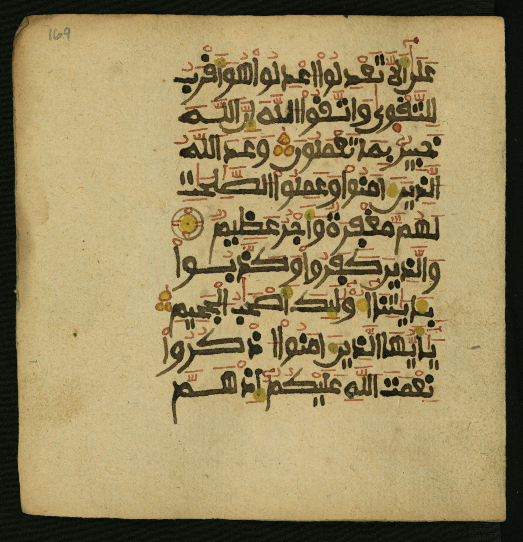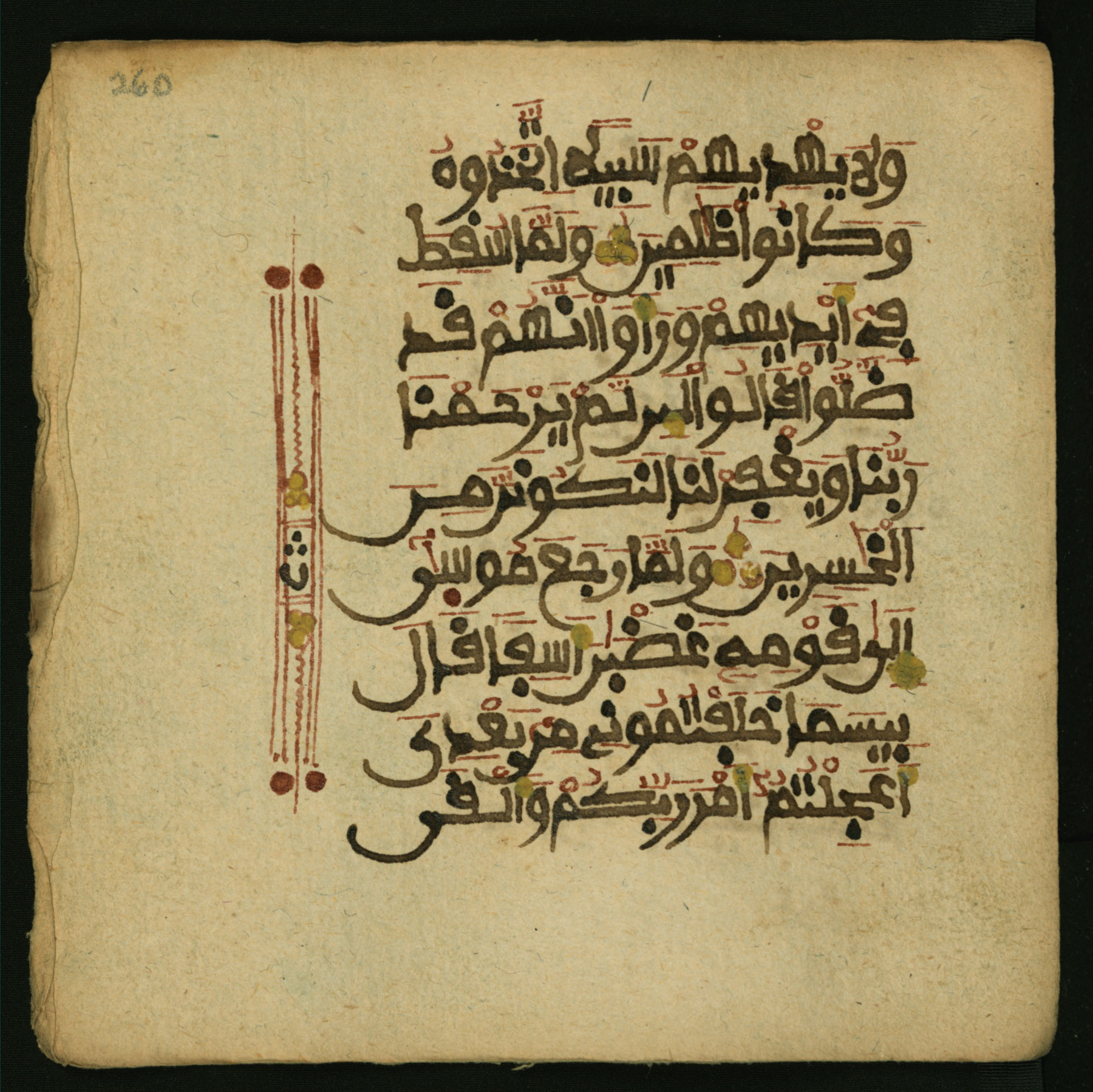 This square-format manuscript is volume 1, containing chapters 1-18 (Sūrat al-fātiḥah through Sūrat al-kahf), of an illuminated two-volume Qur'an produced in Sub-Saharan (West) Africa in the thirteenth century AH / nineteenth CE. The text is written in Sūdānī script in dark brown ink with vocalization in red on loose leaves. Chapter headings are in reddish-brown ink. Three yellow dots outlined in red arranged in a triangular form separate verses. Polychrome circular medallions as well as square and rectangular devices in a variety of patterns and colors mark textual divisions. The leaves of the text are organized between two decorated boards with geometric compositions. The pages and boards are housed in a leather pouch (satchel).