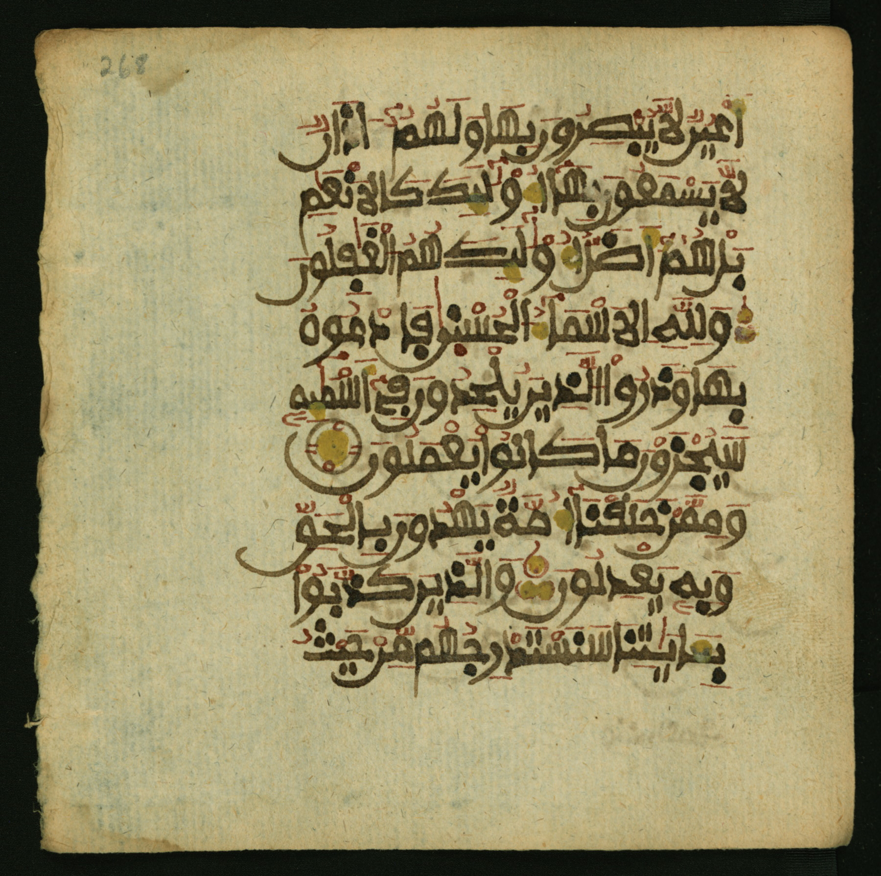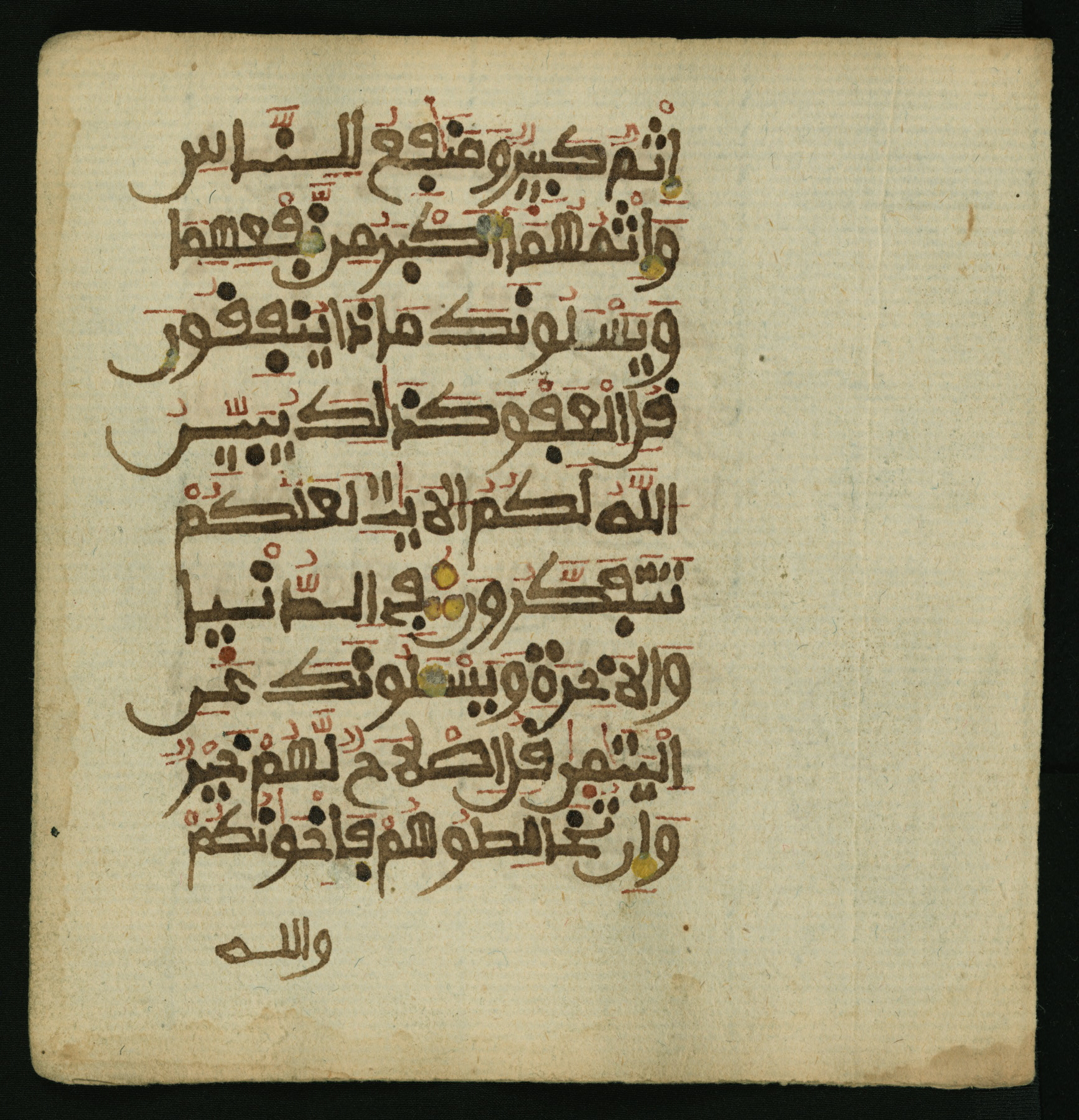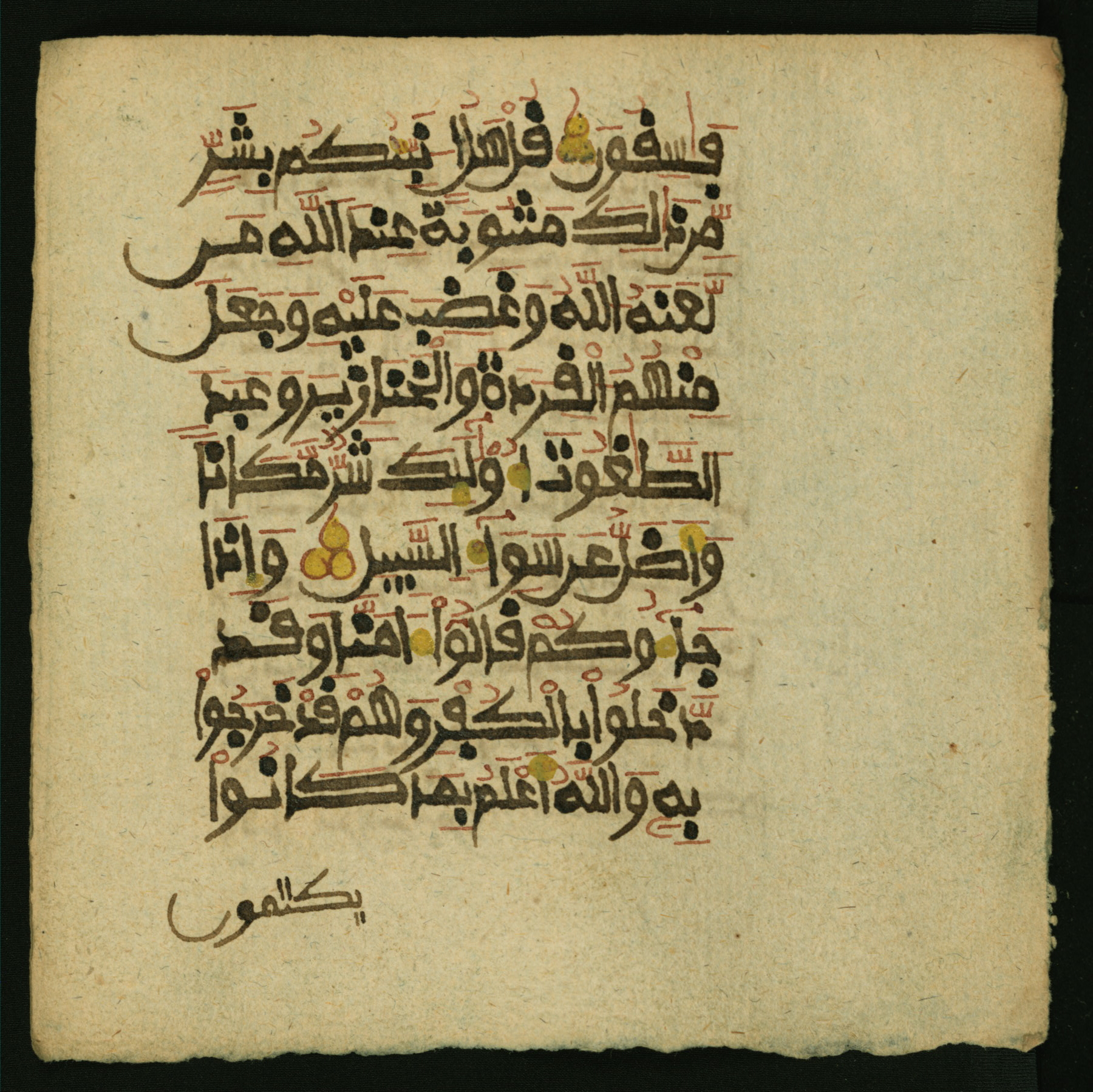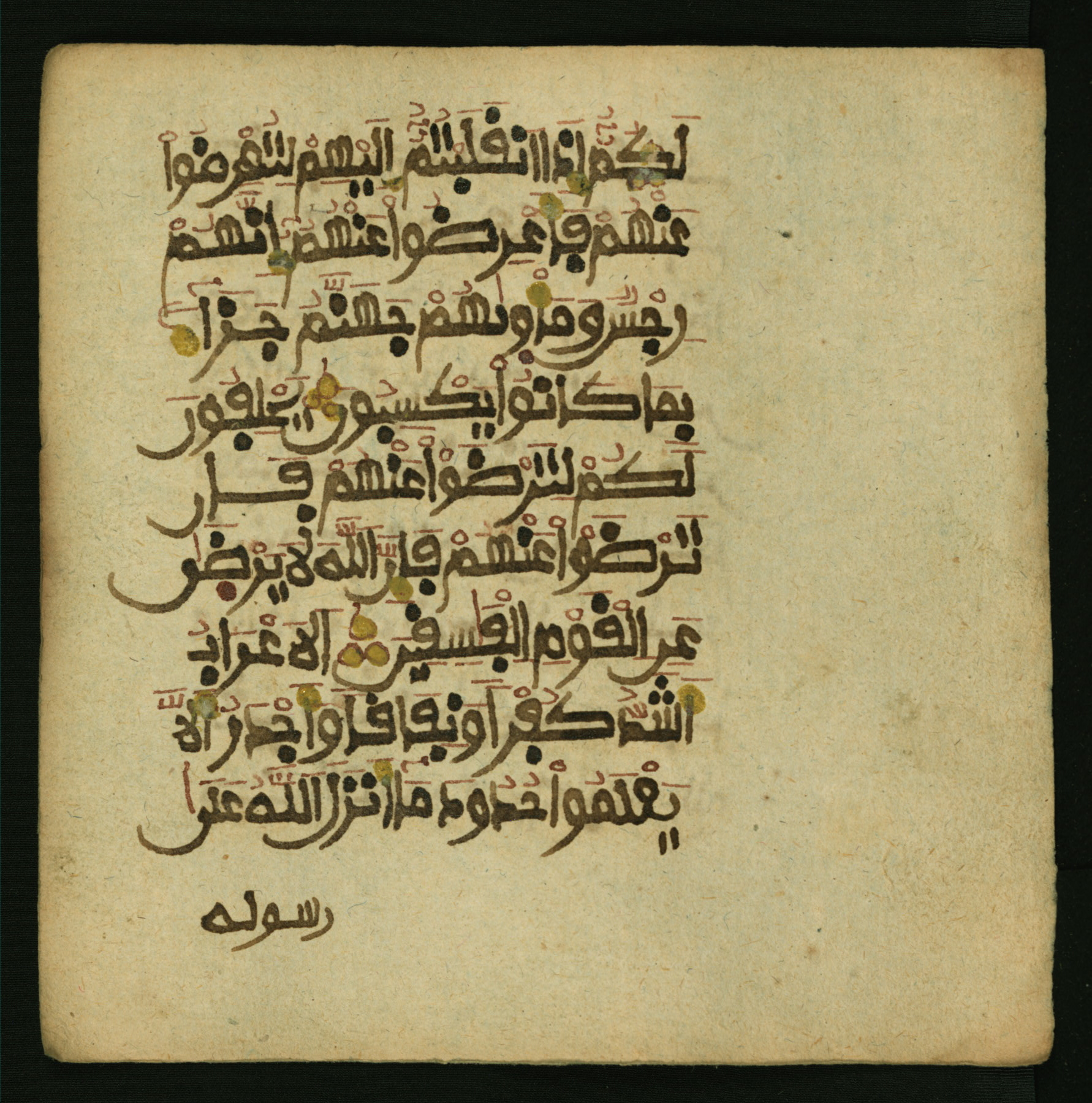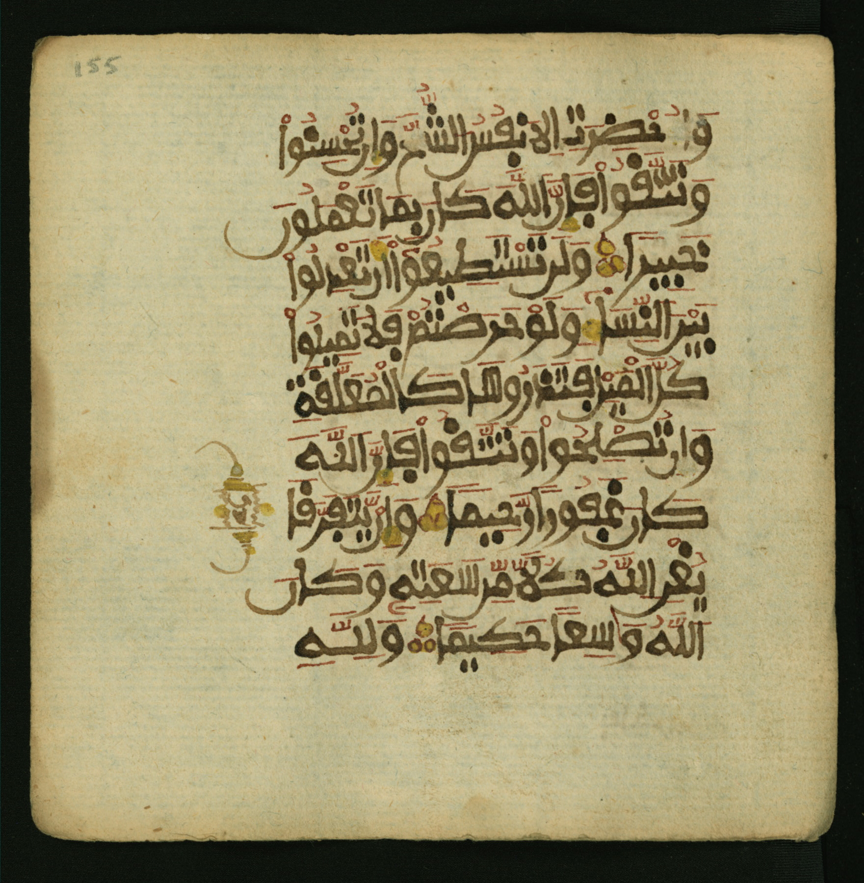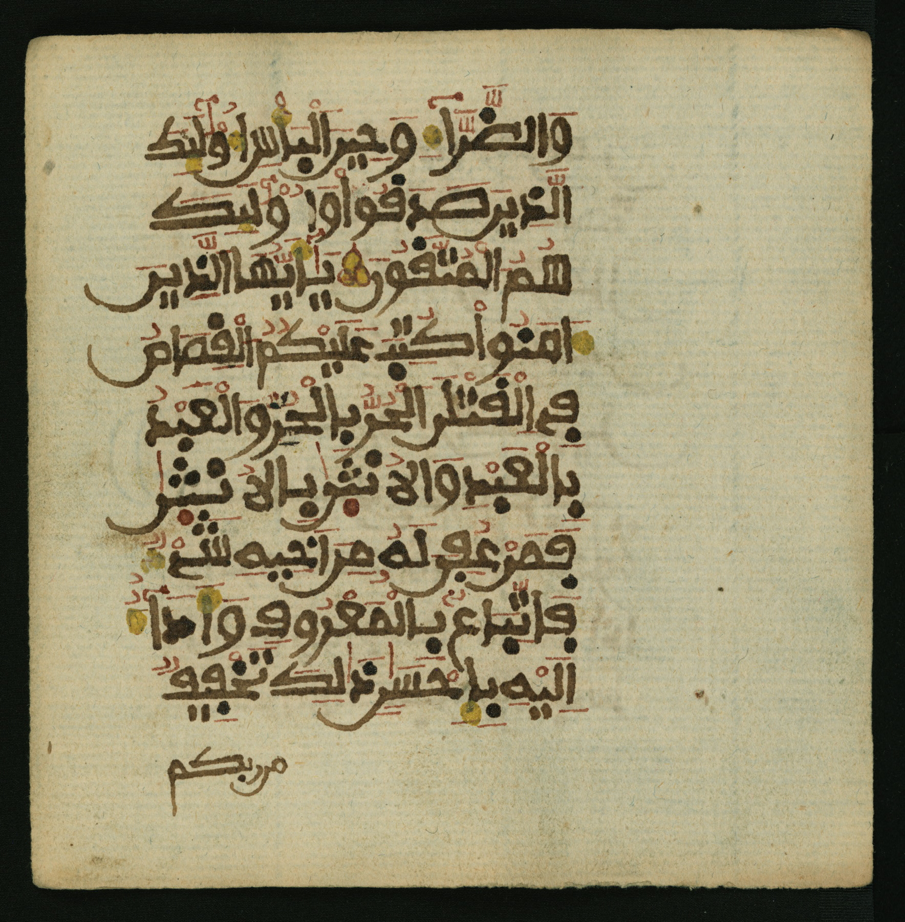 This square-format manuscript is volume 1, containing chapters 1-18 (Sūrat al-fātiḥah through Sūrat al-kahf), of an illuminated two-volume Qur'an produced in Sub-Saharan (West) Africa in the thirteenth century AH / nineteenth CE. The text is written in Sūdānī script in dark brown ink with vocalization in red on loose leaves. Chapter headings are in reddish-brown ink. Three yellow dots outlined in red arranged in a triangular form separate verses. Polychrome circular medallions as well as square and rectangular devices in a variety of patterns and colors mark textual divisions. The leaves of the text are organized between two decorated boards with geometric compositions. The pages and boards are housed in a leather pouch (satchel).