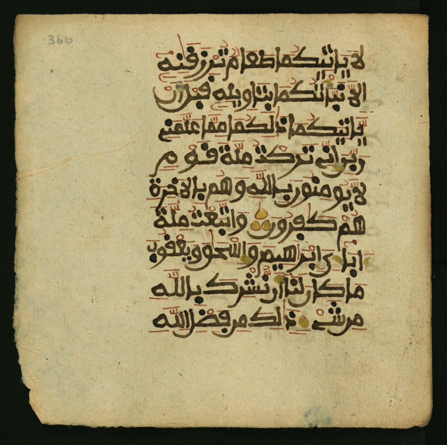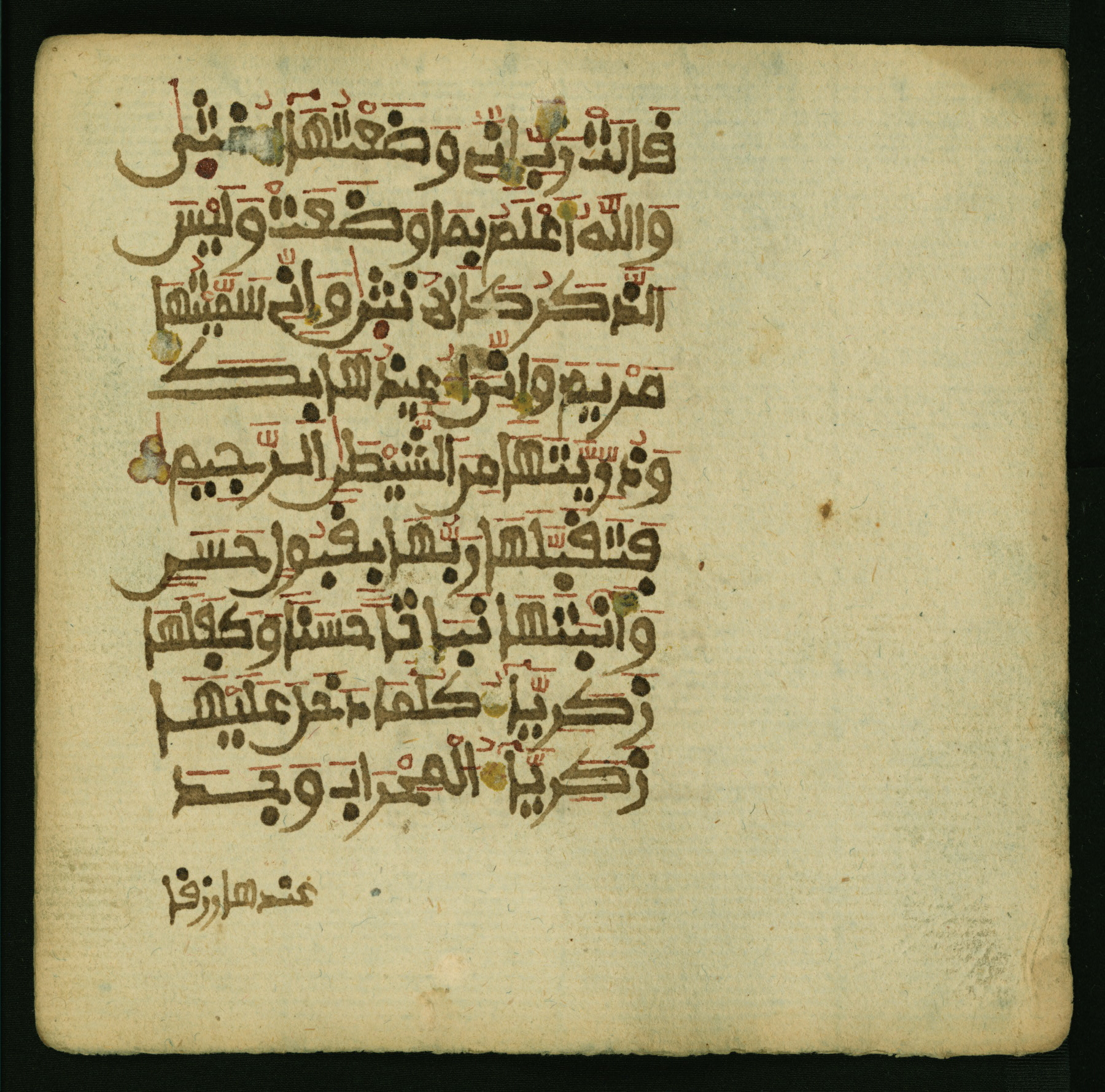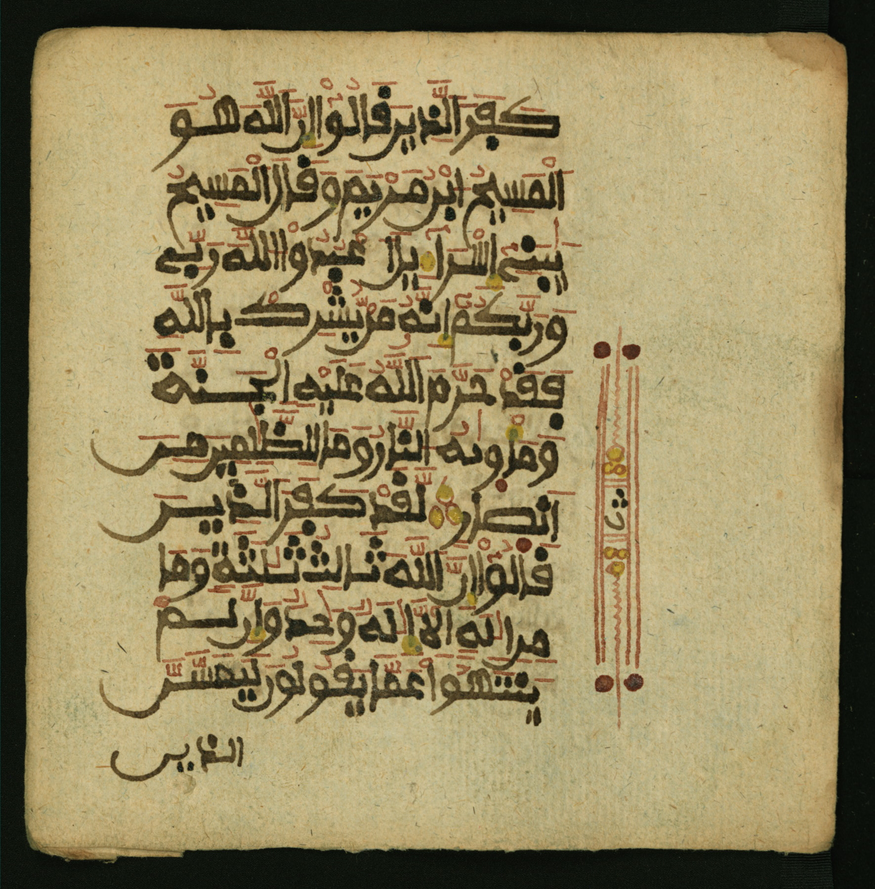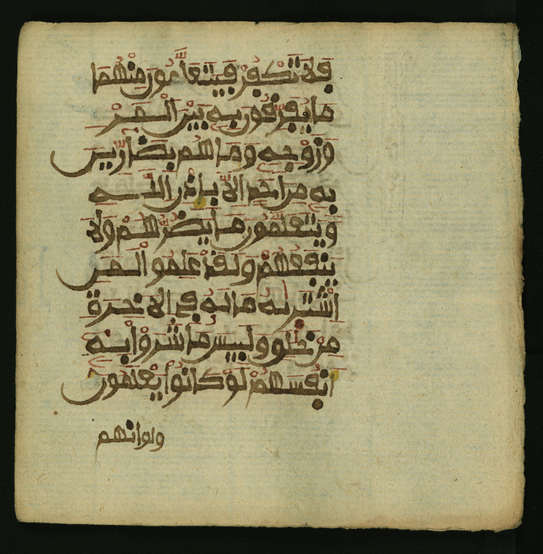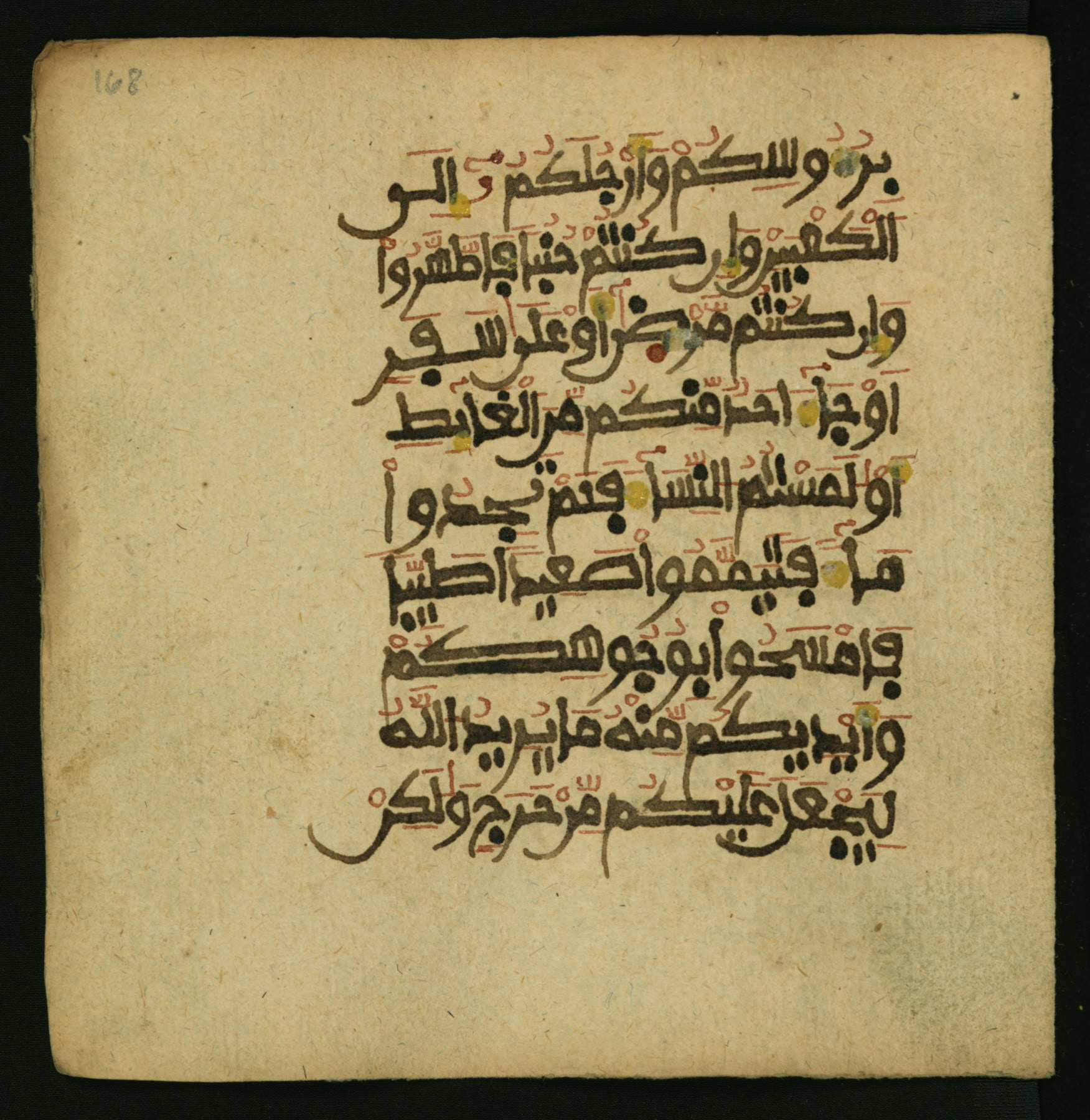 This square-format manuscript is volume 1, containing chapters 1-18 (Sūrat al-fātiḥah through Sūrat al-kahf), of an illuminated two-volume Qur'an produced in Sub-Saharan (West) Africa in the thirteenth century AH / nineteenth CE. The text is written in Sūdānī script in dark brown ink with vocalization in red on loose leaves. Chapter headings are in reddish-brown ink. Three yellow dots outlined in red arranged in a triangular form separate verses. Polychrome circular medallions as well as square and rectangular devices in a variety of patterns and colors mark textual divisions. The leaves of the text are organized between two decorated boards with geometric compositions. The pages and boards are housed in a leather pouch (satchel).