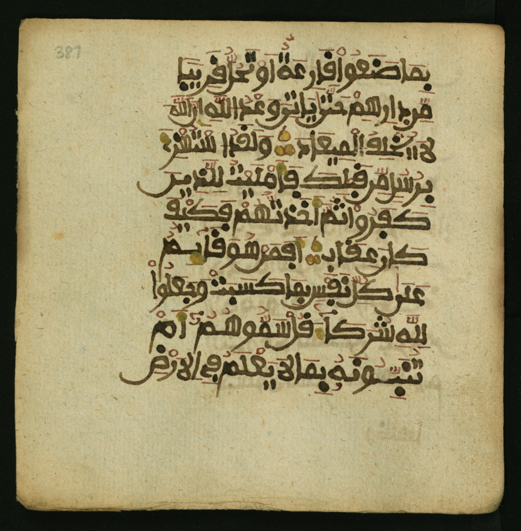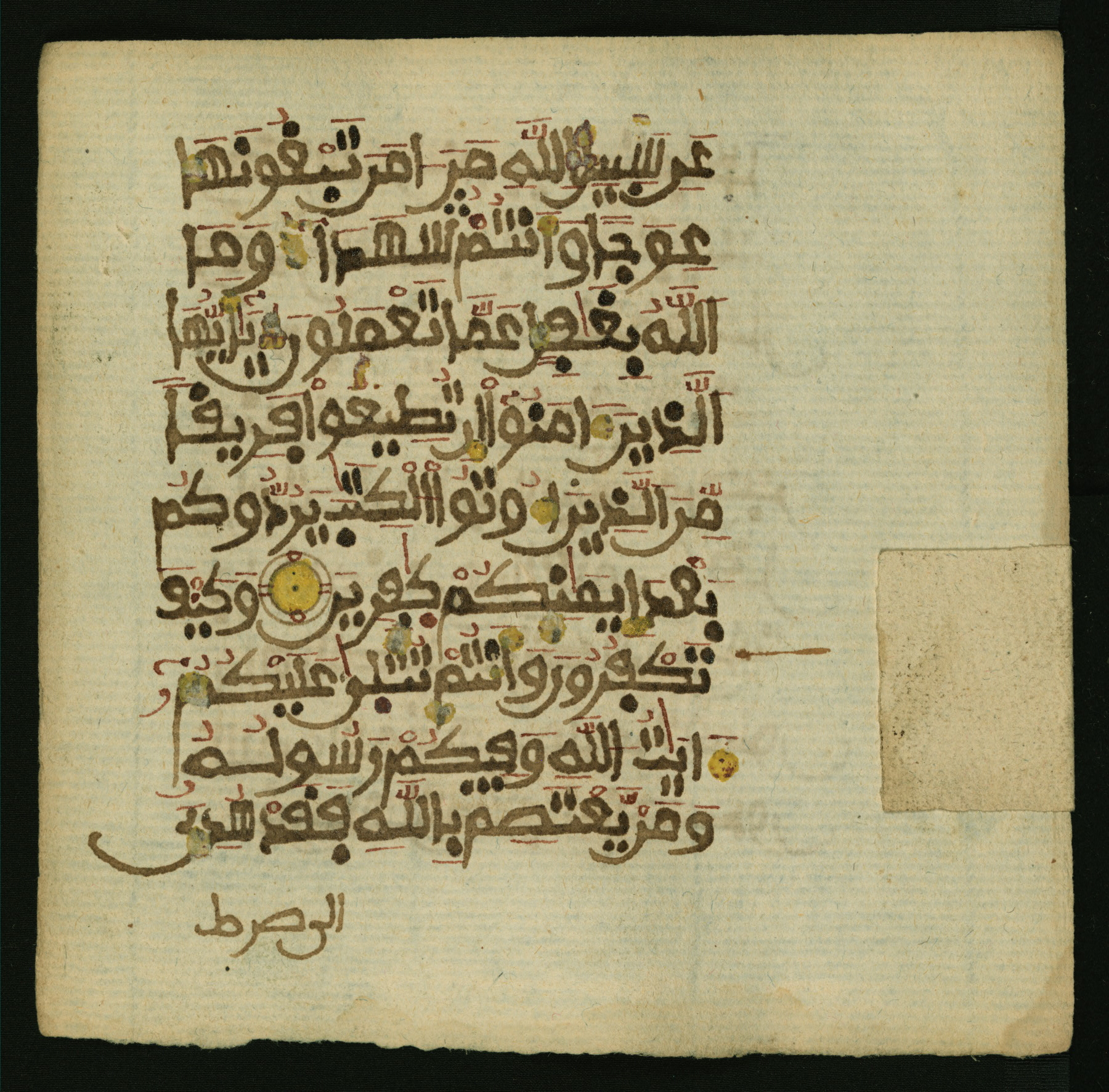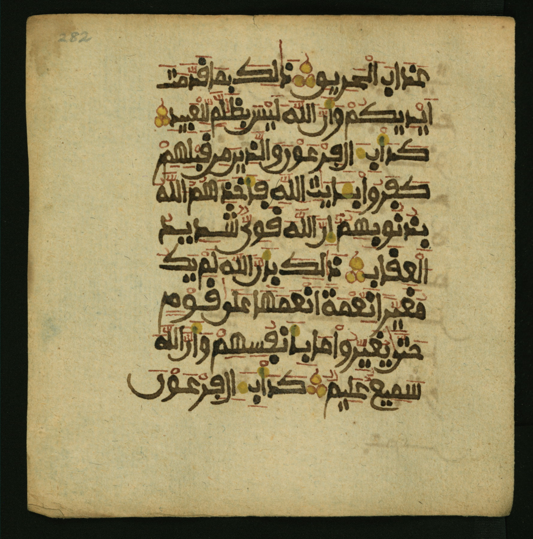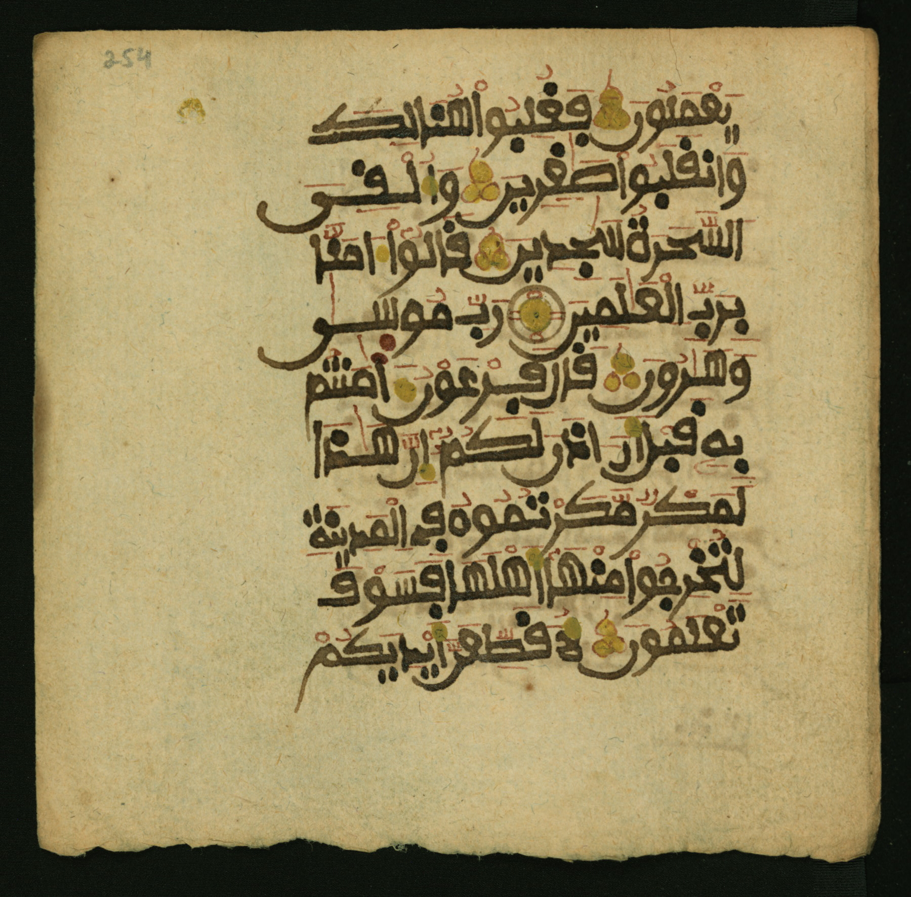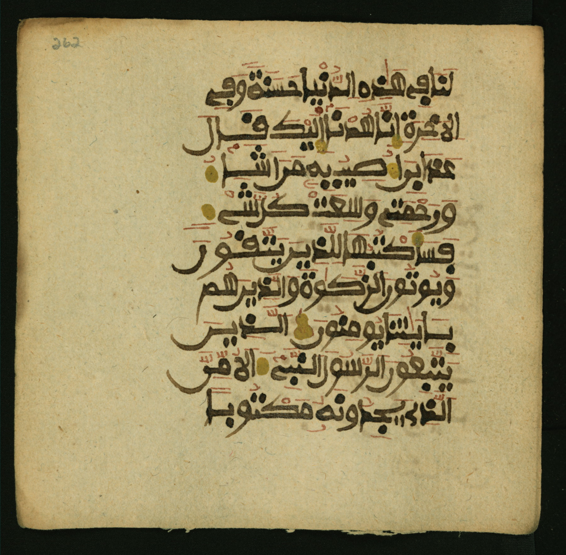 This square-format manuscript is volume 1, containing chapters 1-18 (Sūrat al-fātiḥah through Sūrat al-kahf), of an illuminated two-volume Qur'an produced in Sub-Saharan (West) Africa in the thirteenth century AH / nineteenth CE. The text is written in Sūdānī script in dark brown ink with vocalization in red on loose leaves. Chapter headings are in reddish-brown ink. Three yellow dots outlined in red arranged in a triangular form separate verses. Polychrome circular medallions as well as square and rectangular devices in a variety of patterns and colors mark textual divisions. The leaves of the text are organized between two decorated boards with geometric compositions. The pages and boards are housed in a leather pouch (satchel).