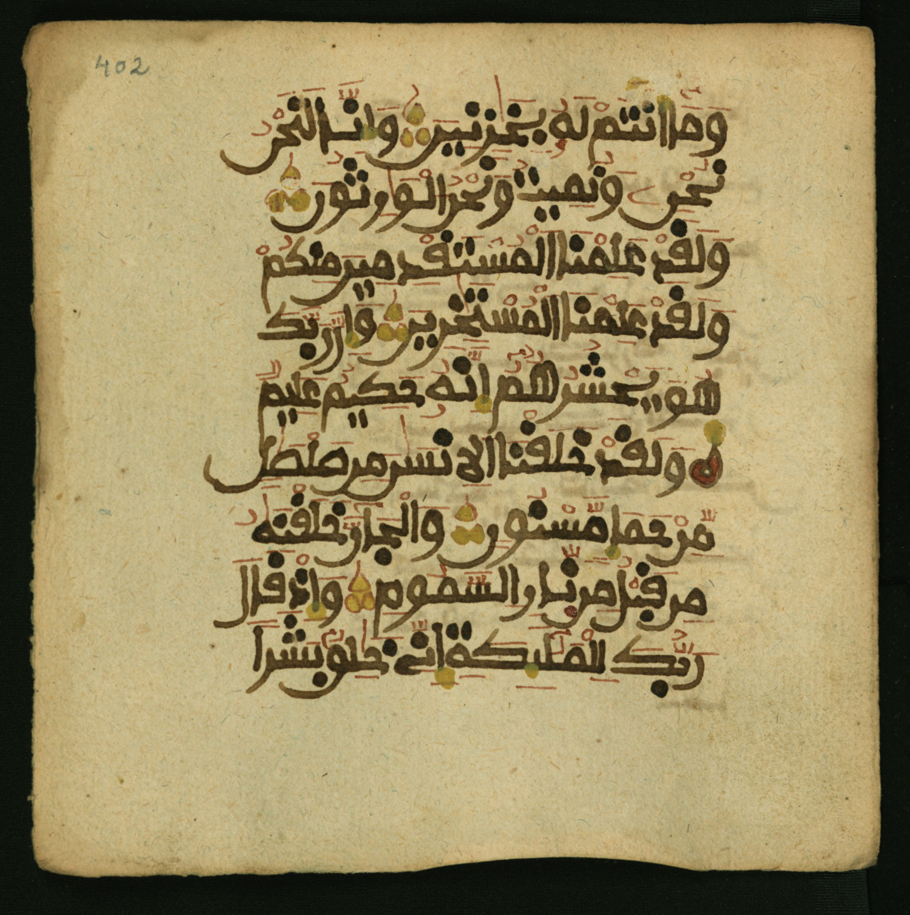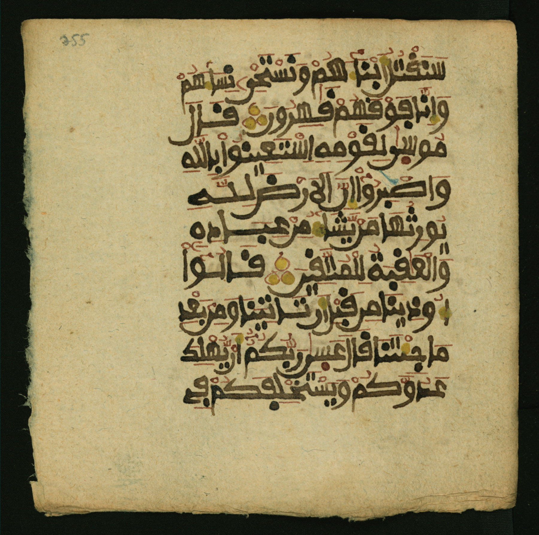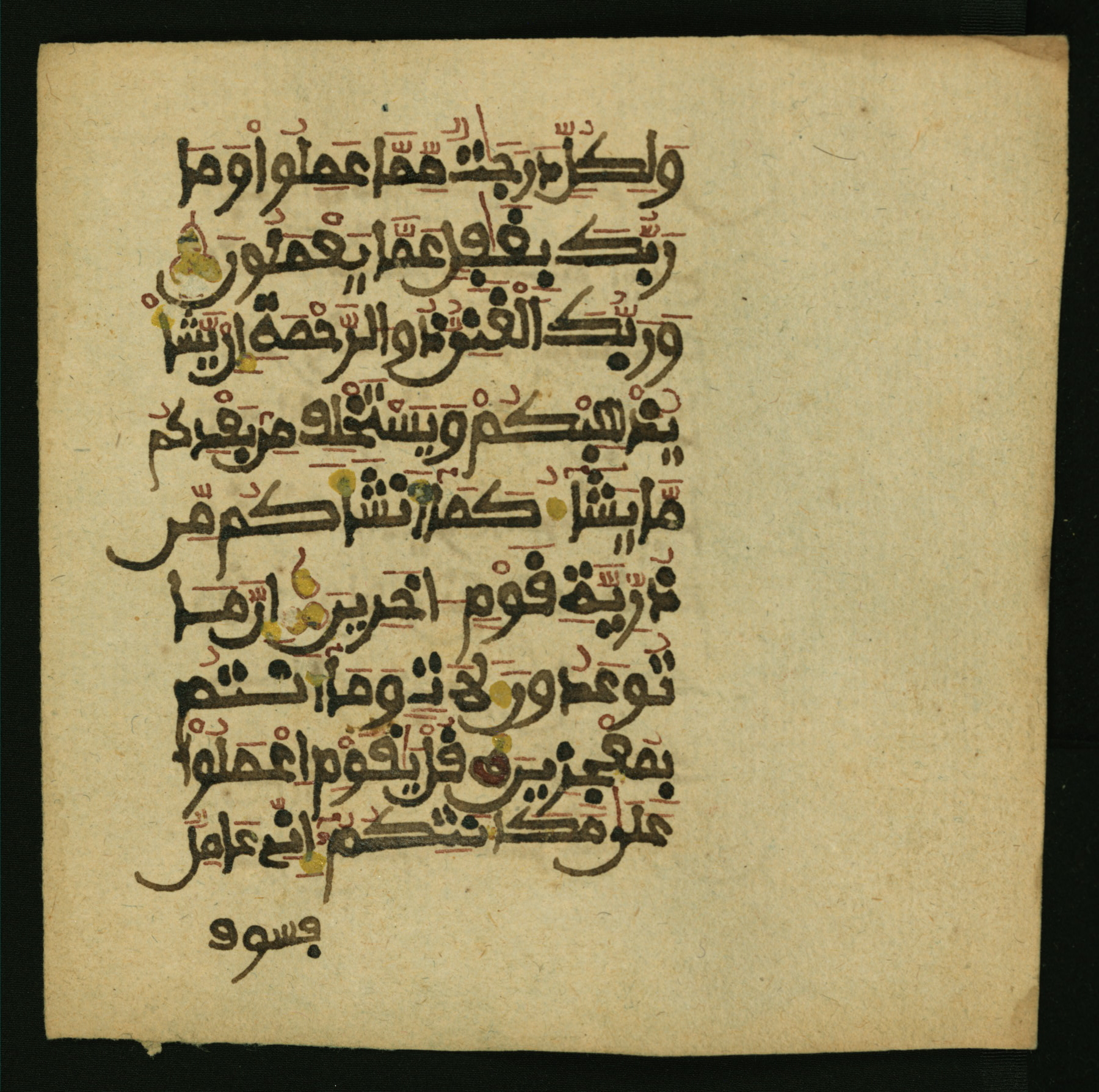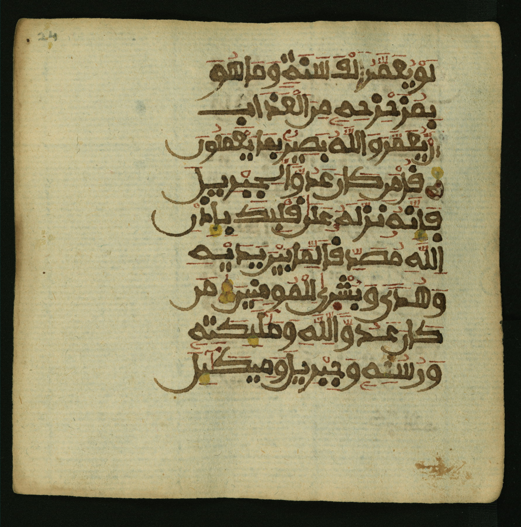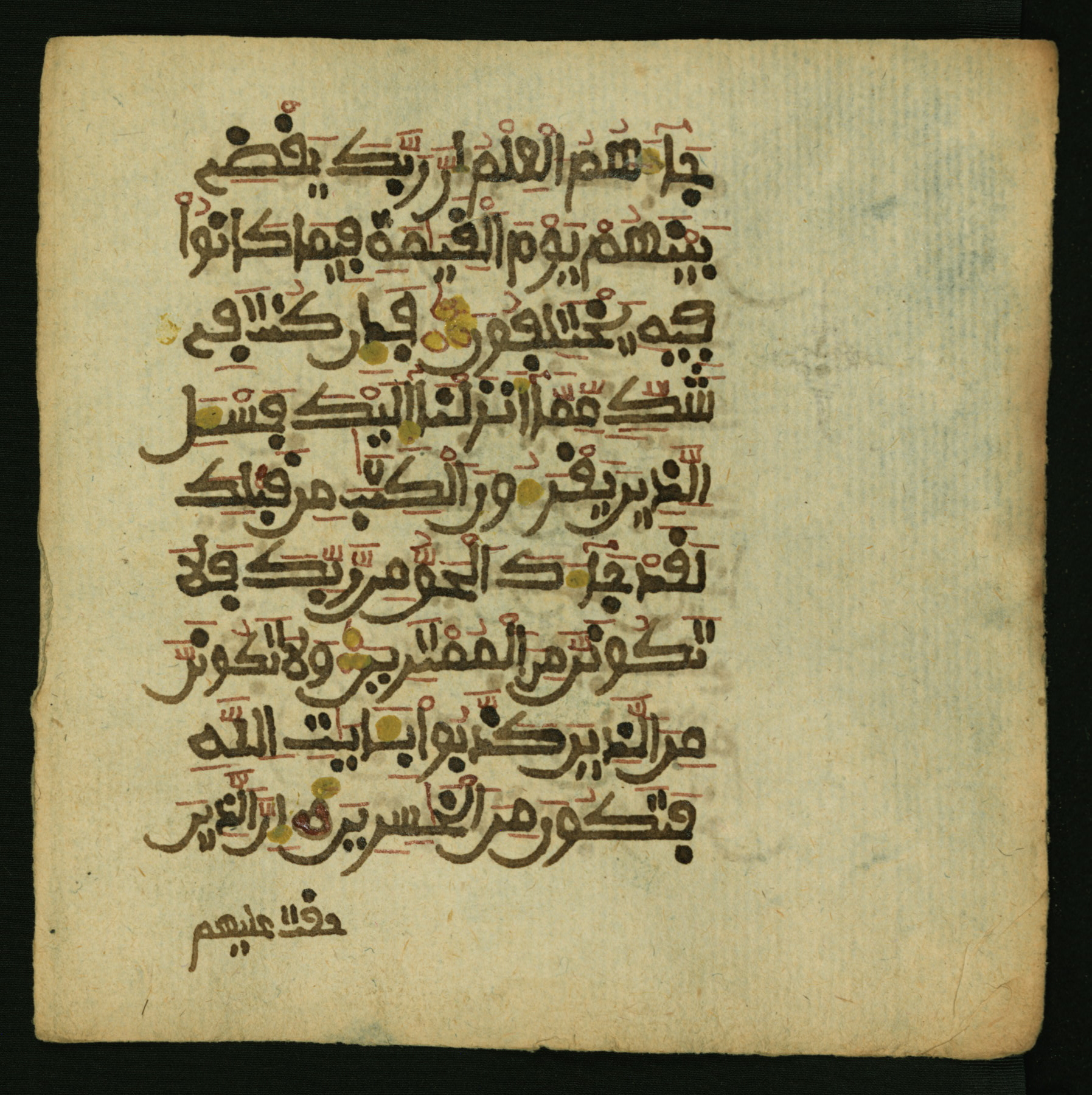 This square-format manuscript is volume 1, containing chapters 1-18 (Sūrat al-fātiḥah through Sūrat al-kahf), of an illuminated two-volume Qur'an produced in Sub-Saharan (West) Africa in the thirteenth century AH / nineteenth CE. The text is written in Sūdānī script in dark brown ink with vocalization in red on loose leaves. Chapter headings are in reddish-brown ink. Three yellow dots outlined in red arranged in a triangular form separate verses. Polychrome circular medallions as well as square and rectangular devices in a variety of patterns and colors mark textual divisions. The leaves of the text are organized between two decorated boards with geometric compositions. The pages and boards are housed in a leather pouch (satchel).