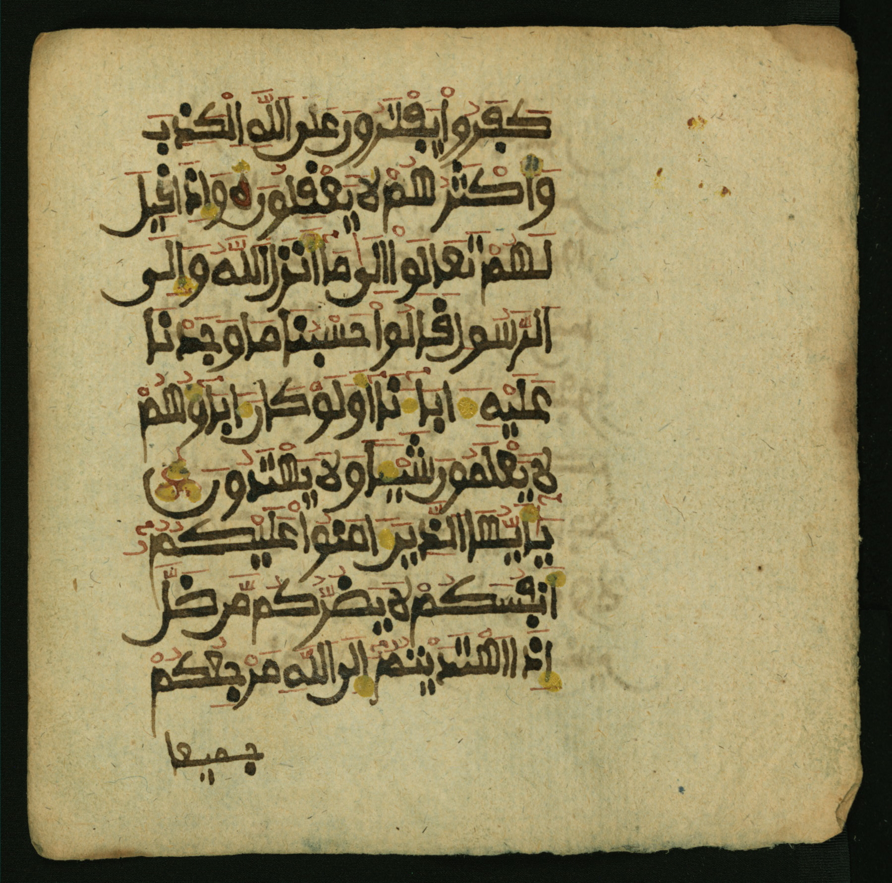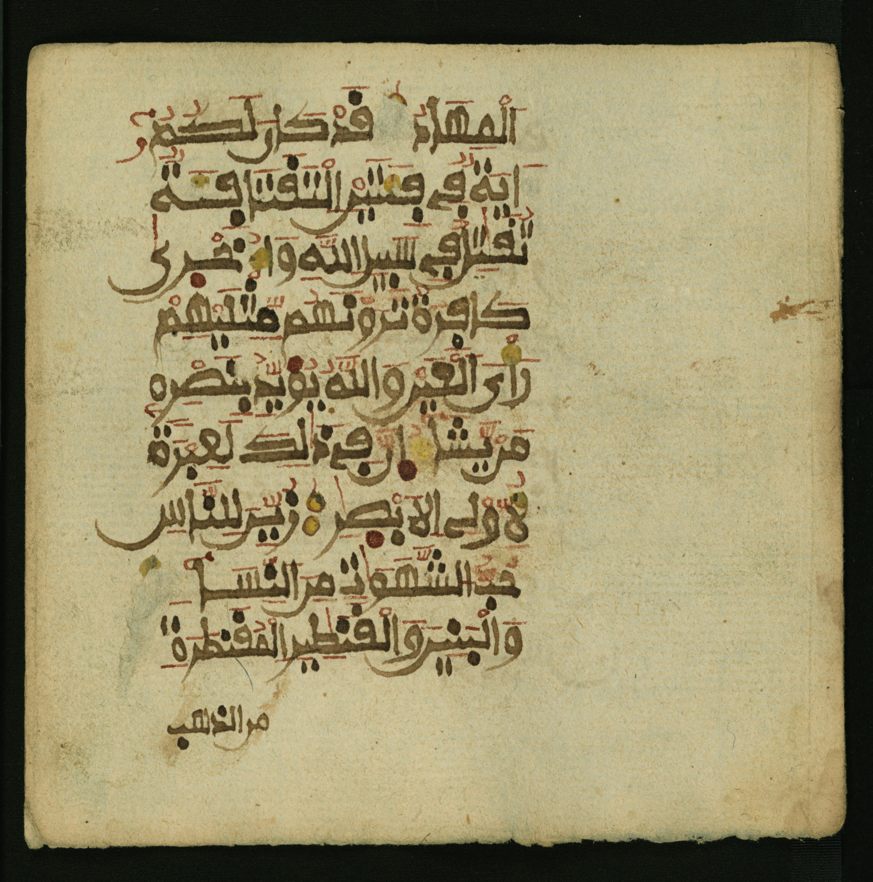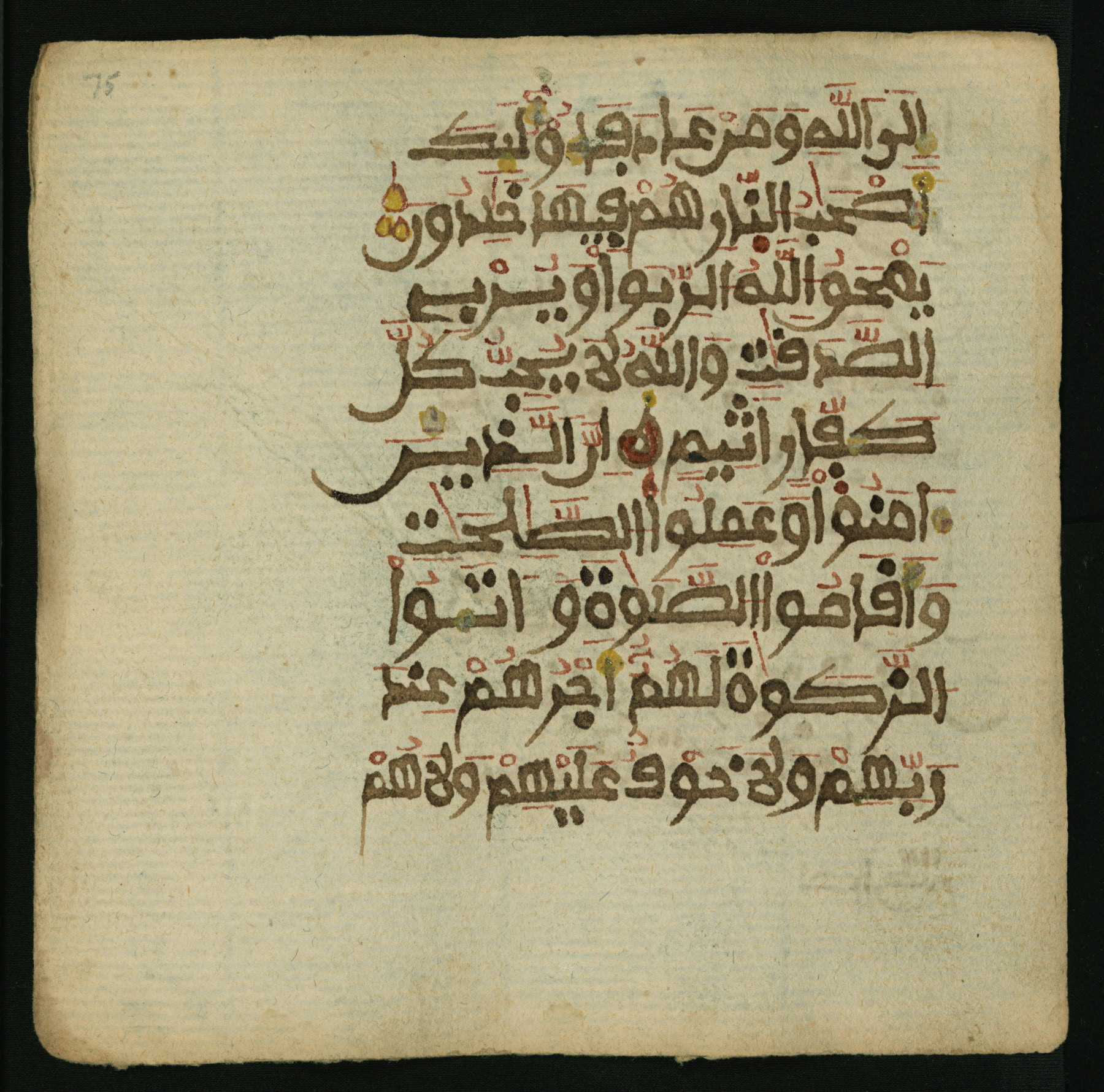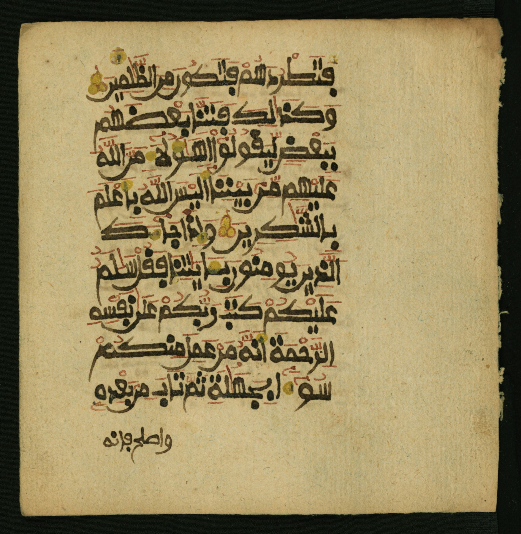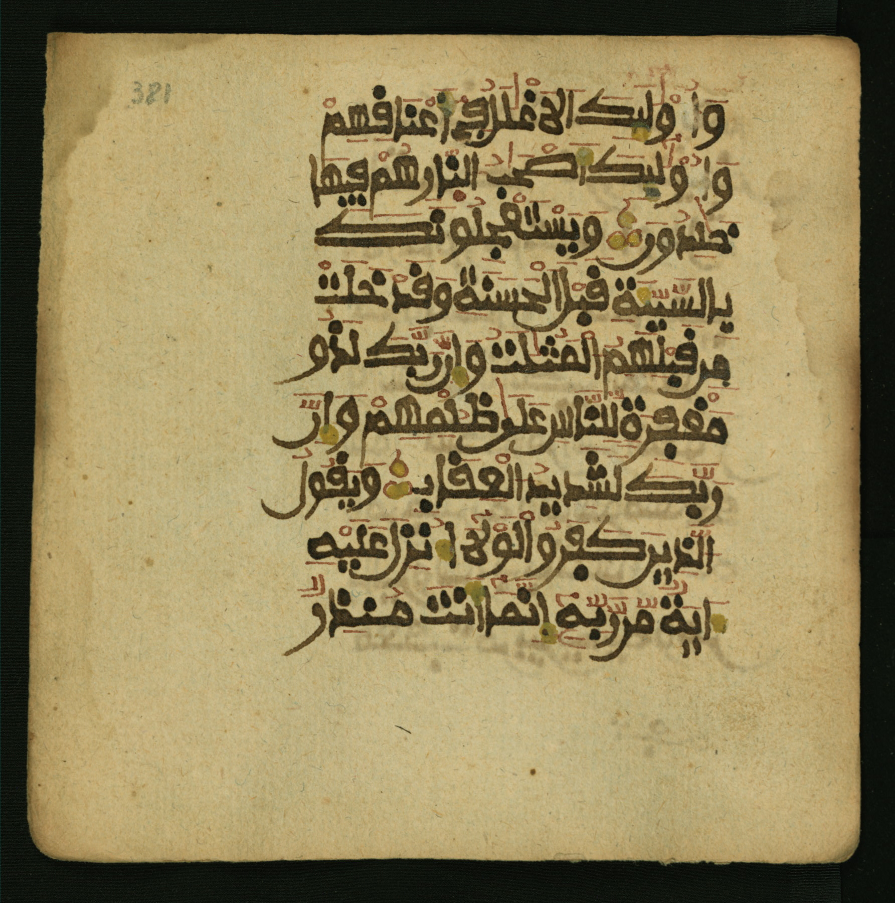 This square-format manuscript is volume 1, containing chapters 1-18 (Sūrat al-fātiḥah through Sūrat al-kahf), of an illuminated two-volume Qur'an produced in Sub-Saharan (West) Africa in the thirteenth century AH / nineteenth CE. The text is written in Sūdānī script in dark brown ink with vocalization in red on loose leaves. Chapter headings are in reddish-brown ink. Three yellow dots outlined in red arranged in a triangular form separate verses. Polychrome circular medallions as well as square and rectangular devices in a variety of patterns and colors mark textual divisions. The leaves of the text are organized between two decorated boards with geometric compositions. The pages and boards are housed in a leather pouch (satchel).