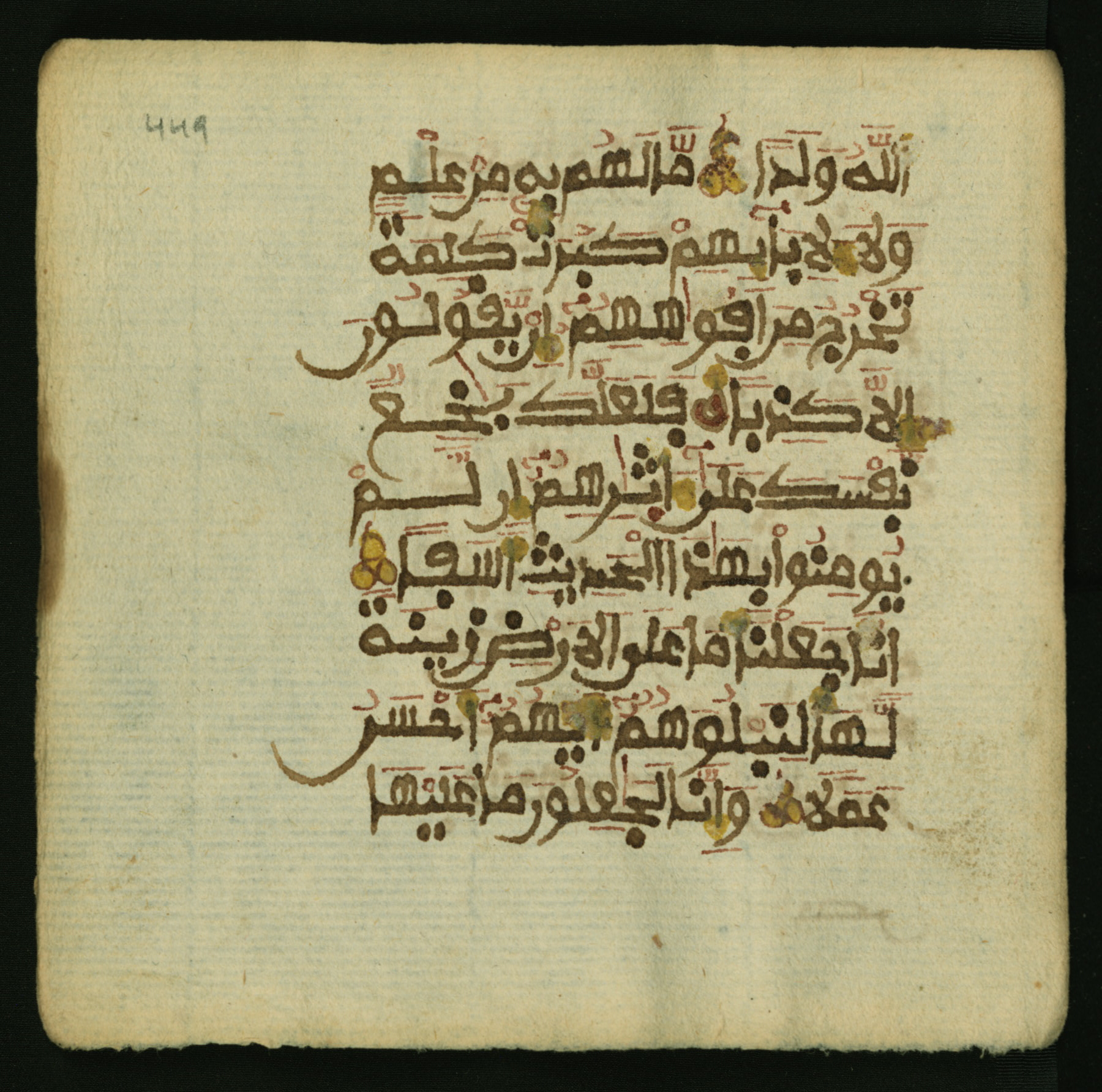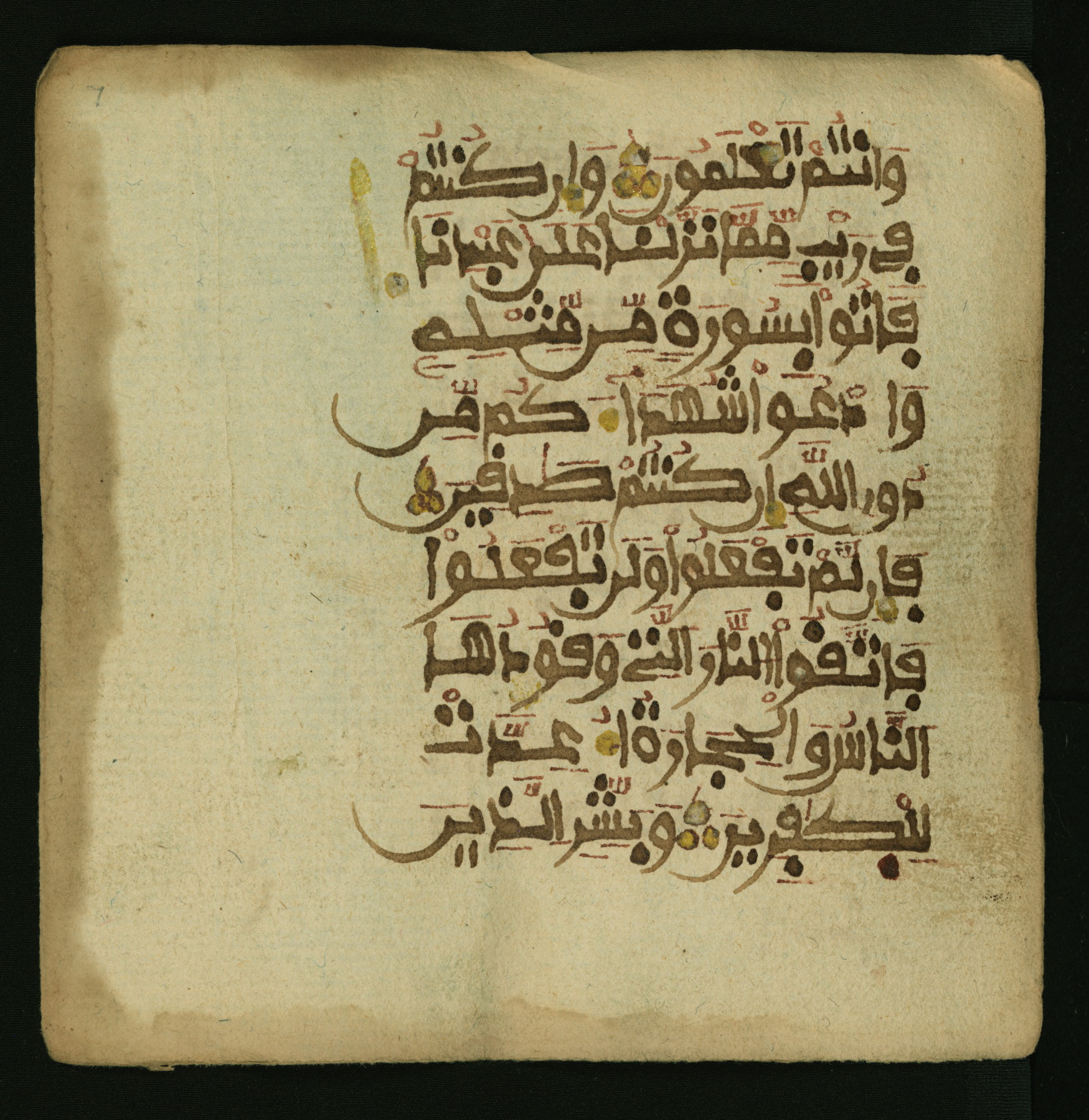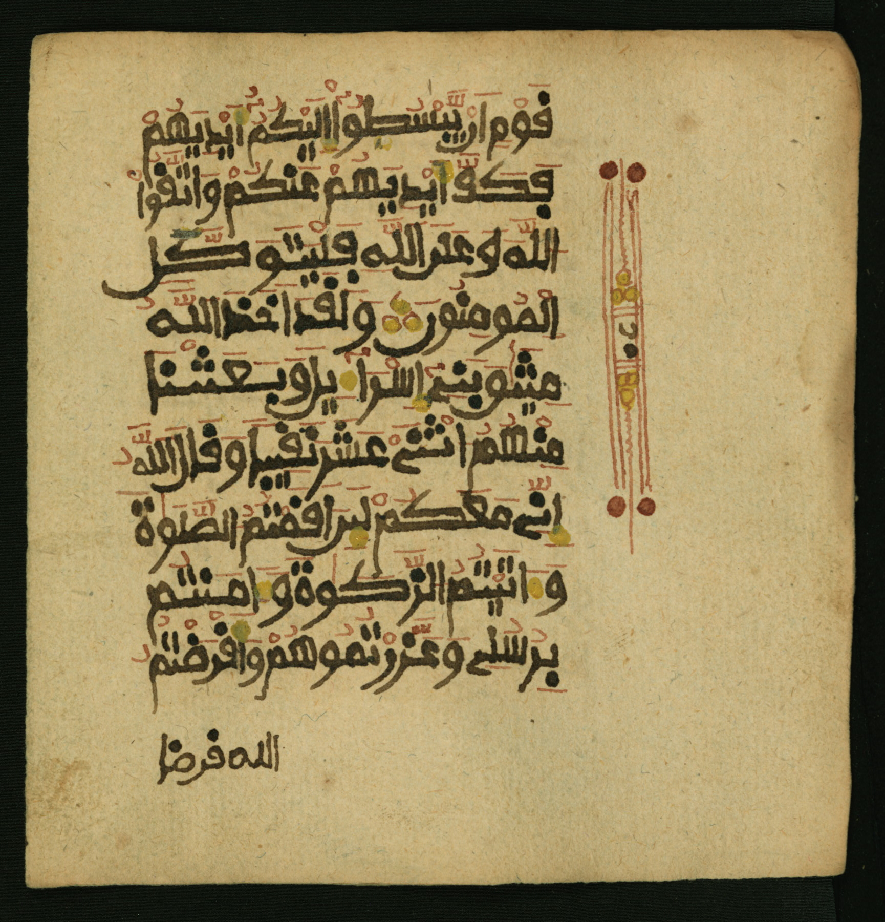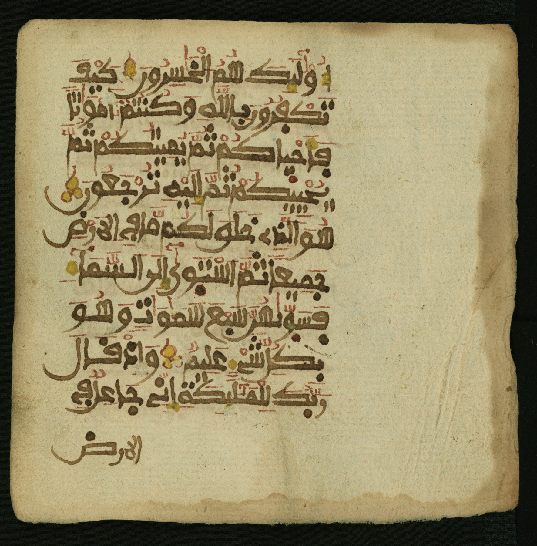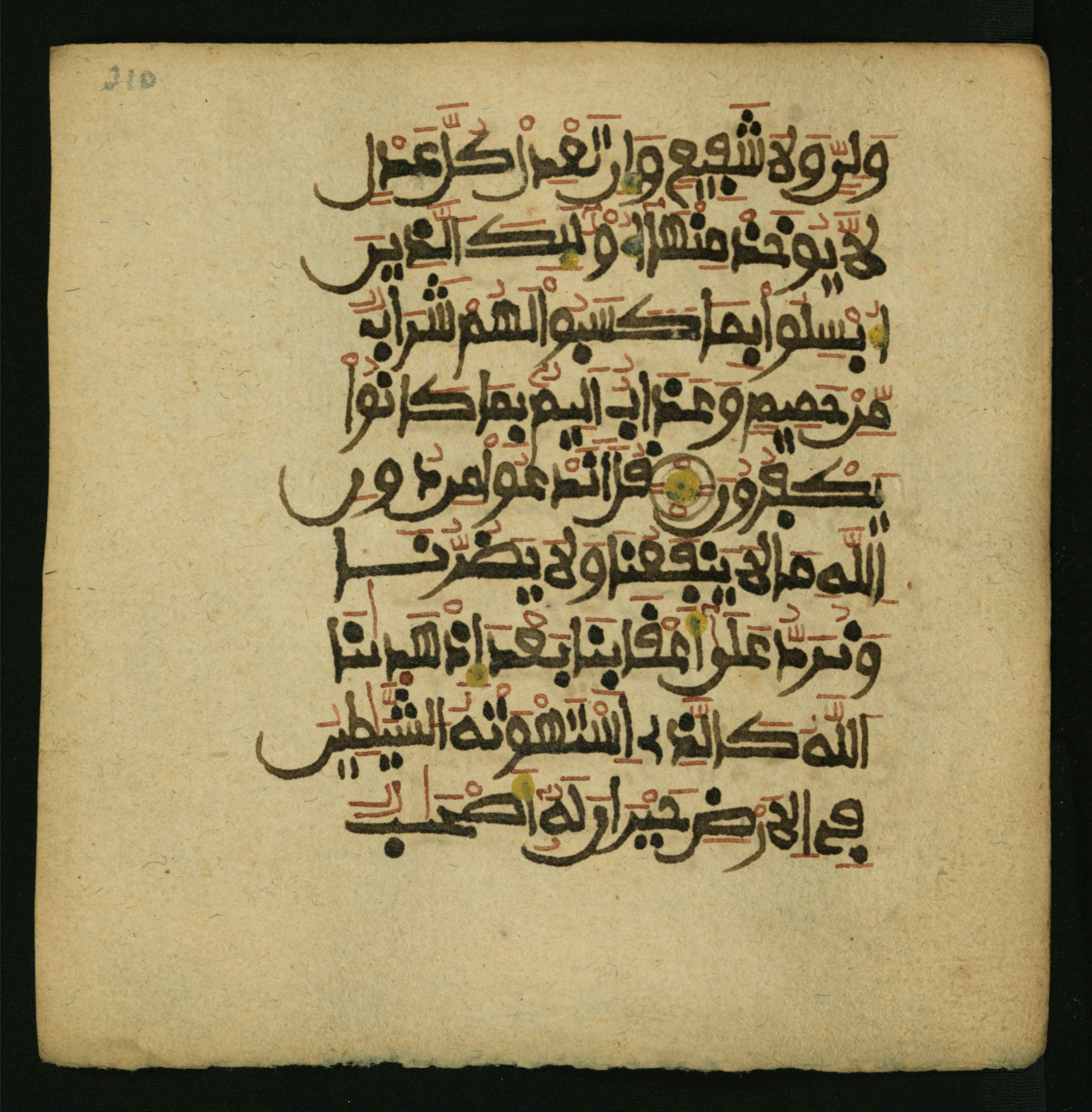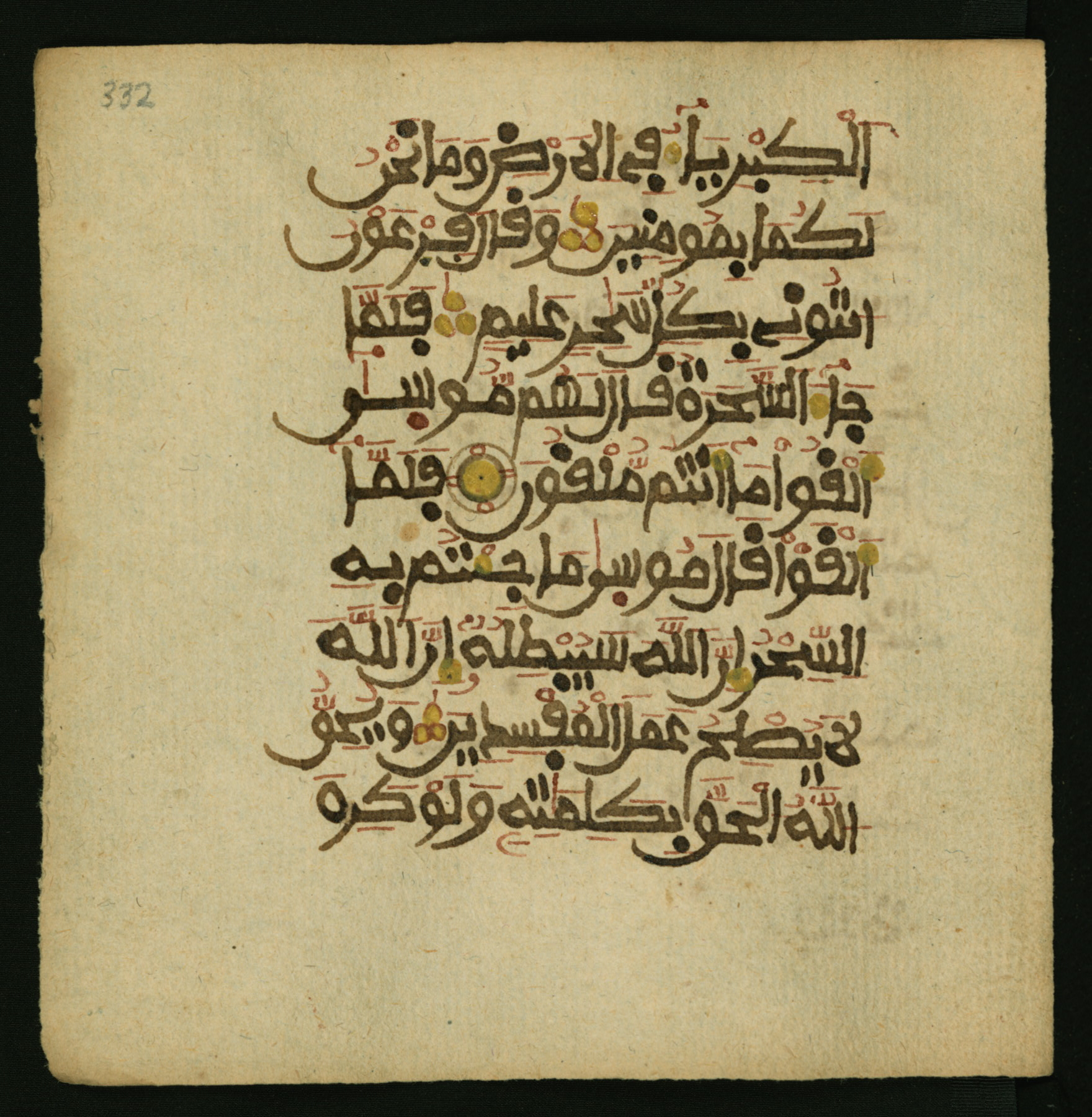 This square-format manuscript is volume 1, containing chapters 1-18 (Sūrat al-fātiḥah through Sūrat al-kahf), of an illuminated two-volume Qur'an produced in Sub-Saharan (West) Africa in the thirteenth century AH / nineteenth CE. The text is written in Sūdānī script in dark brown ink with vocalization in red on loose leaves. Chapter headings are in reddish-brown ink. Three yellow dots outlined in red arranged in a triangular form separate verses. Polychrome circular medallions as well as square and rectangular devices in a variety of patterns and colors mark textual divisions. The leaves of the text are organized between two decorated boards with geometric compositions. The pages and boards are housed in a leather pouch (satchel).