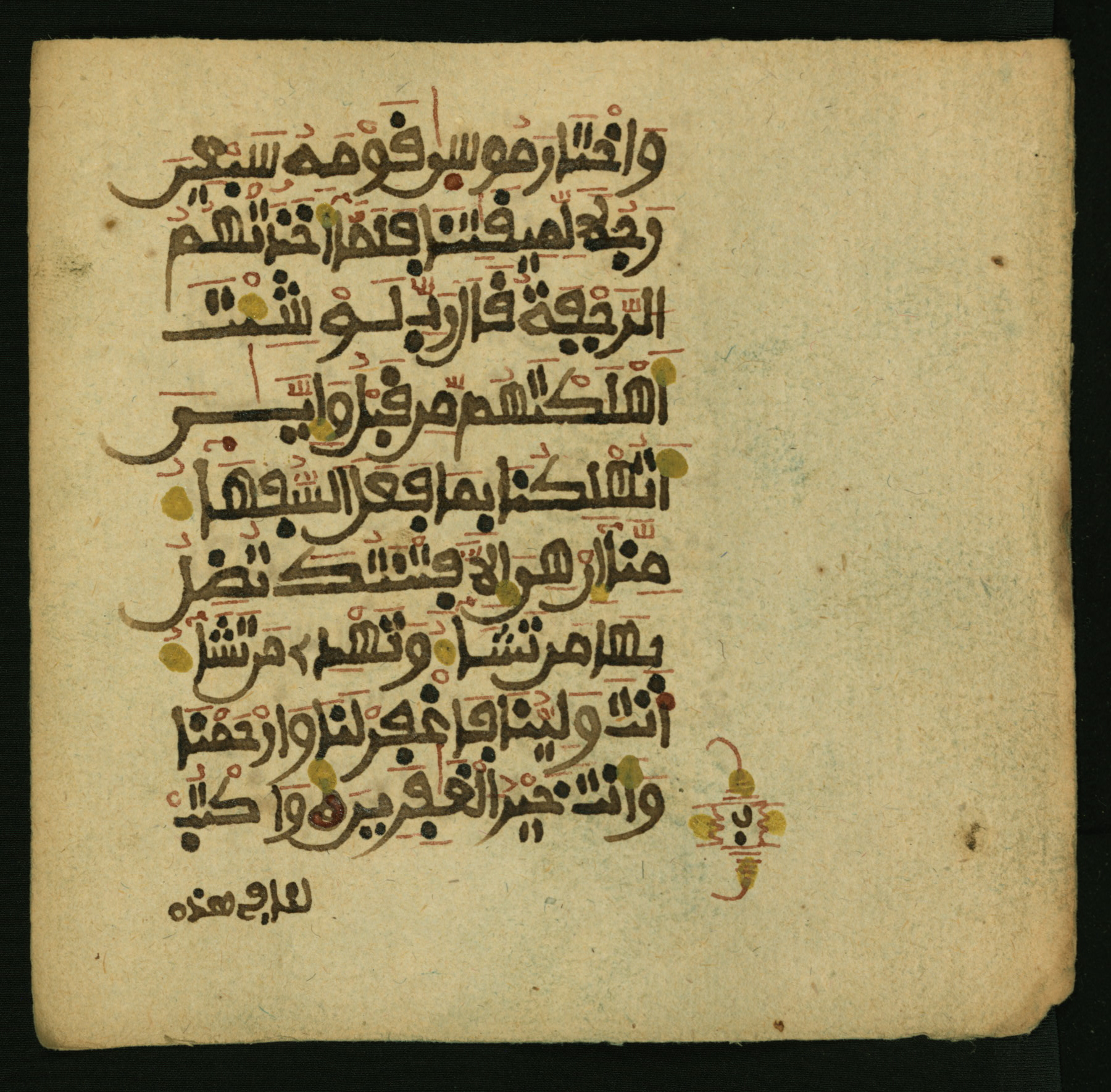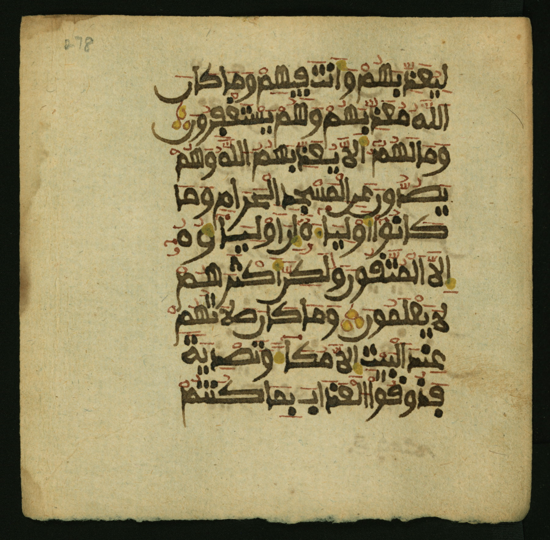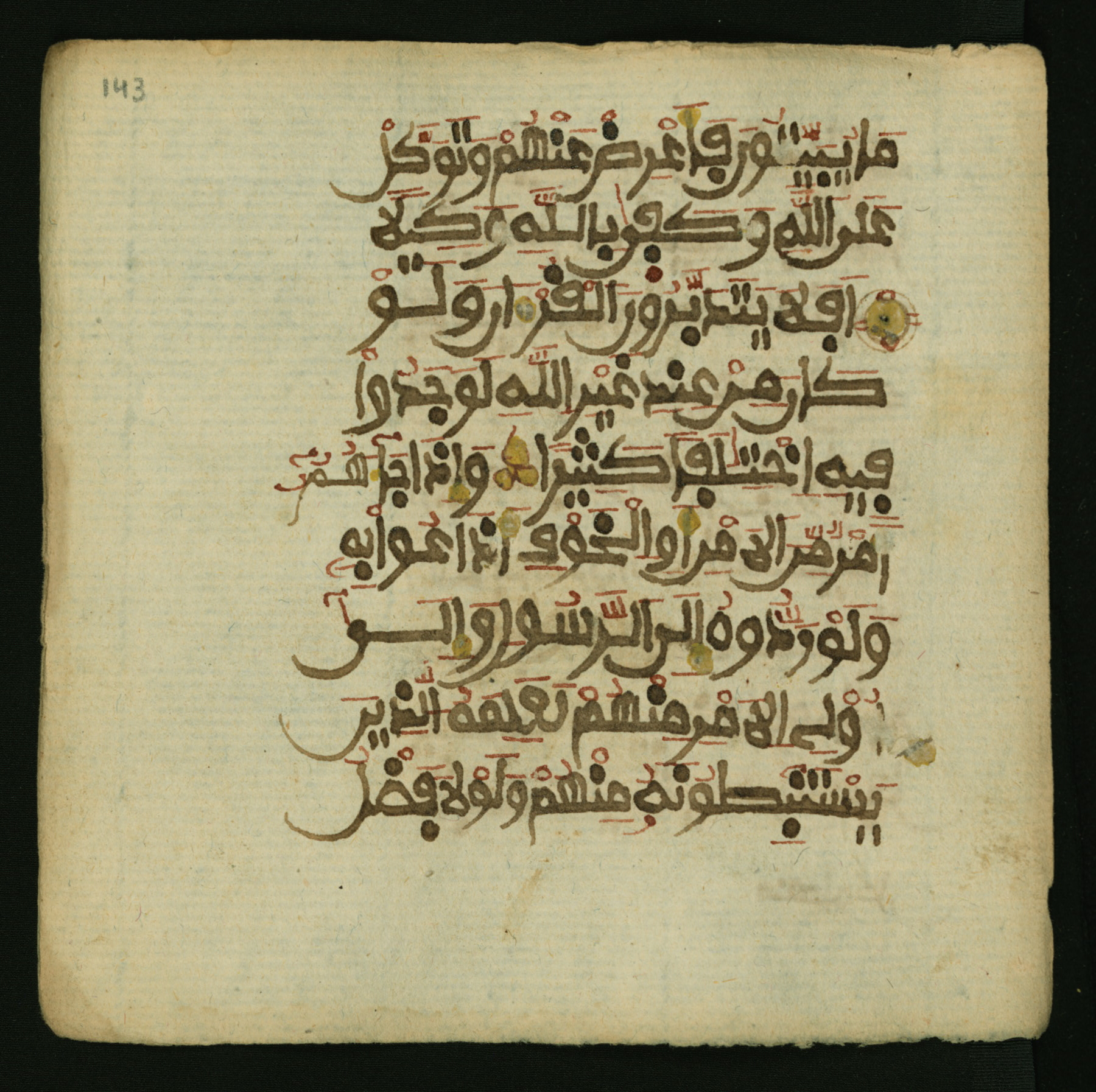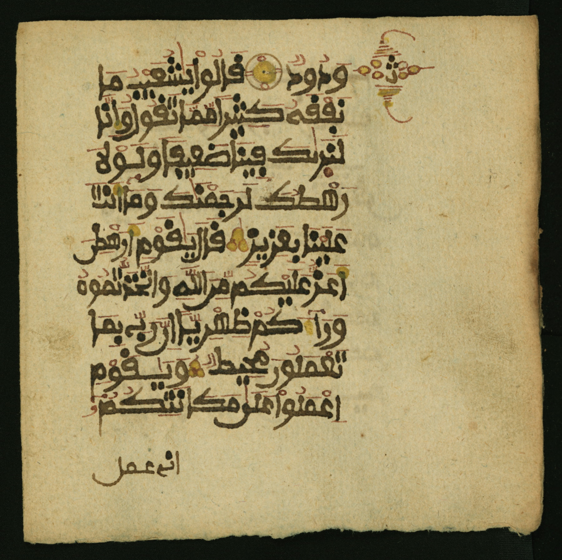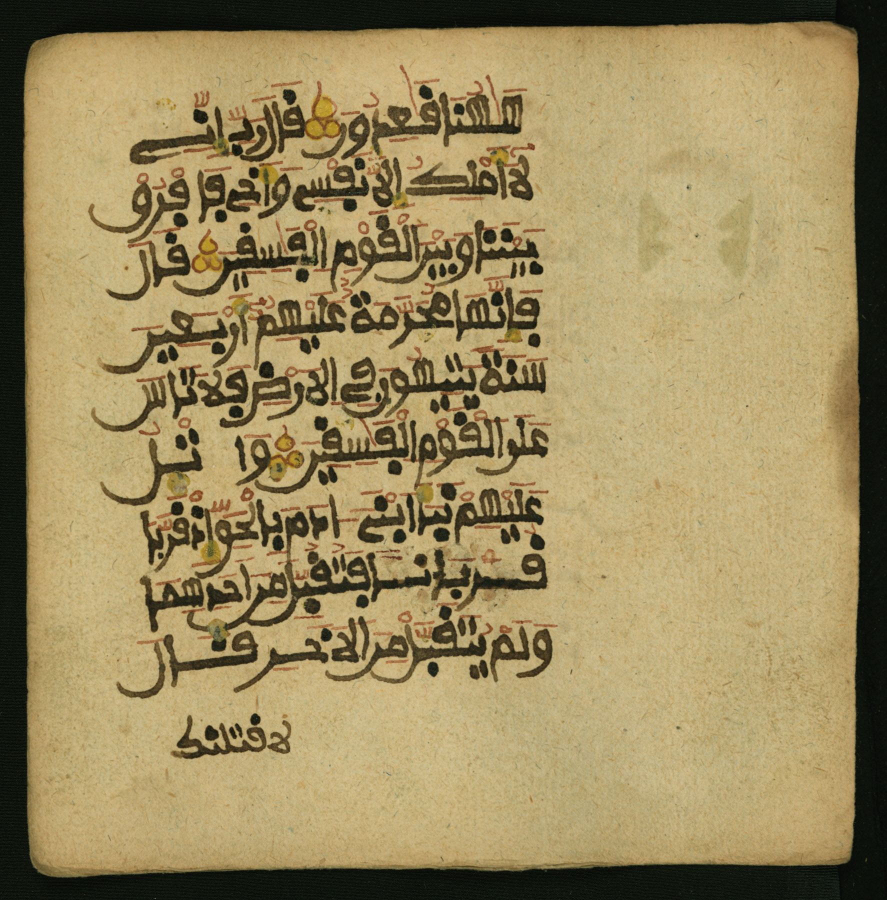 This square-format manuscript is volume 1, containing chapters 1-18 (Sūrat al-fātiḥah through Sūrat al-kahf), of an illuminated two-volume Qur'an produced in Sub-Saharan (West) Africa in the thirteenth century AH / nineteenth CE. The text is written in Sūdānī script in dark brown ink with vocalization in red on loose leaves. Chapter headings are in reddish-brown ink. Three yellow dots outlined in red arranged in a triangular form separate verses. Polychrome circular medallions as well as square and rectangular devices in a variety of patterns and colors mark textual divisions. The leaves of the text are organized between two decorated boards with geometric compositions. The pages and boards are housed in a leather pouch (satchel).