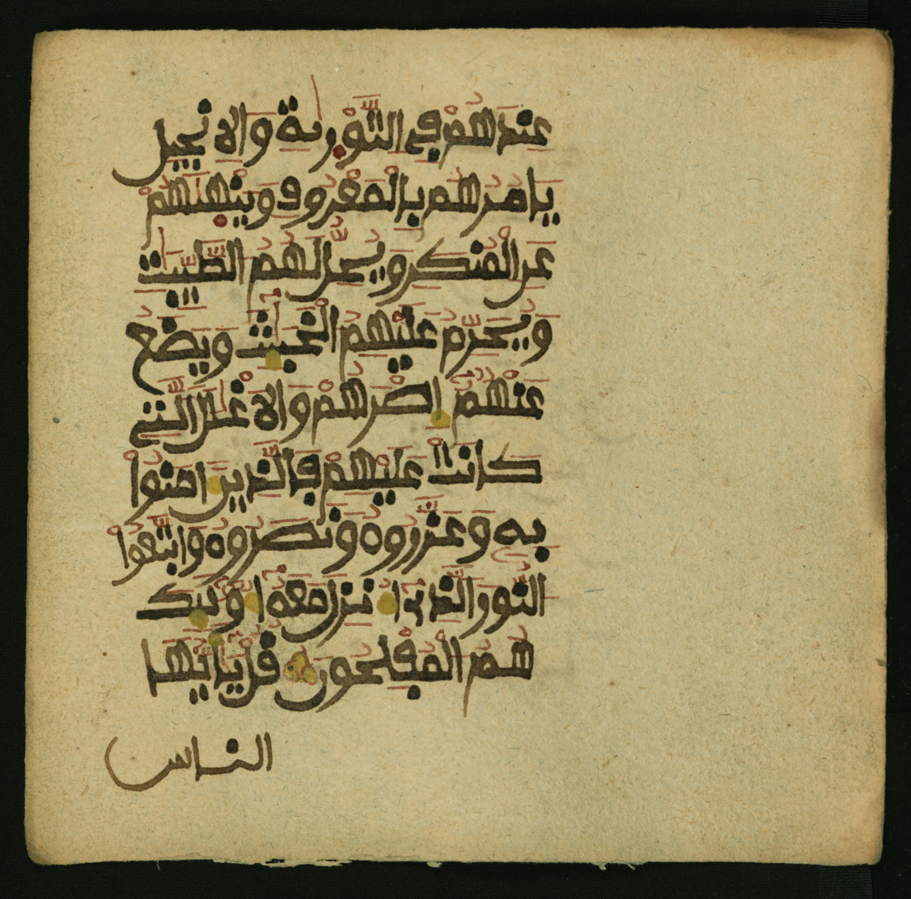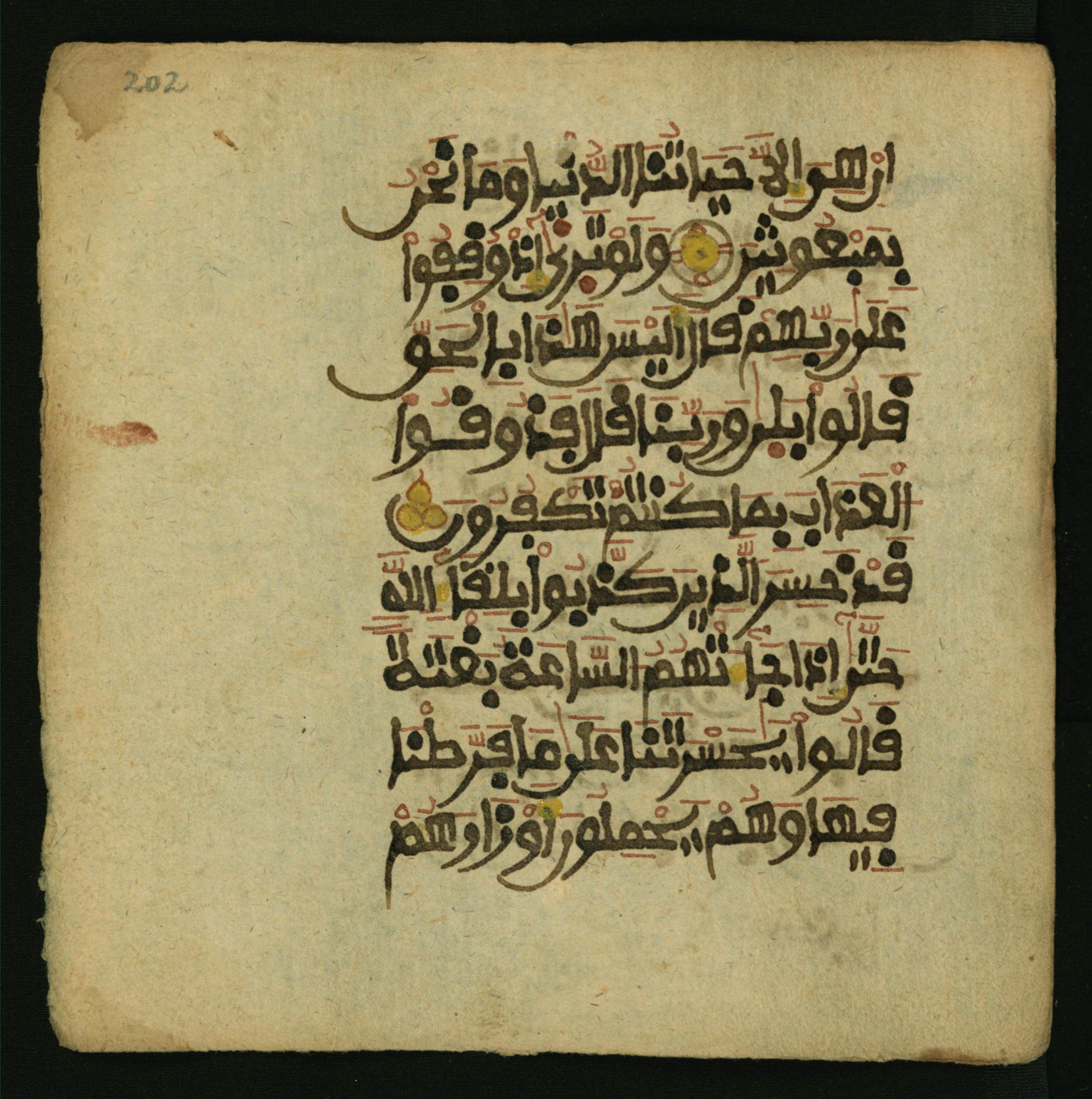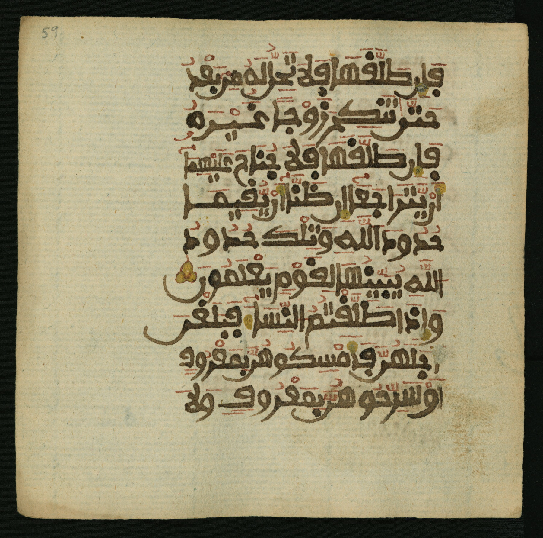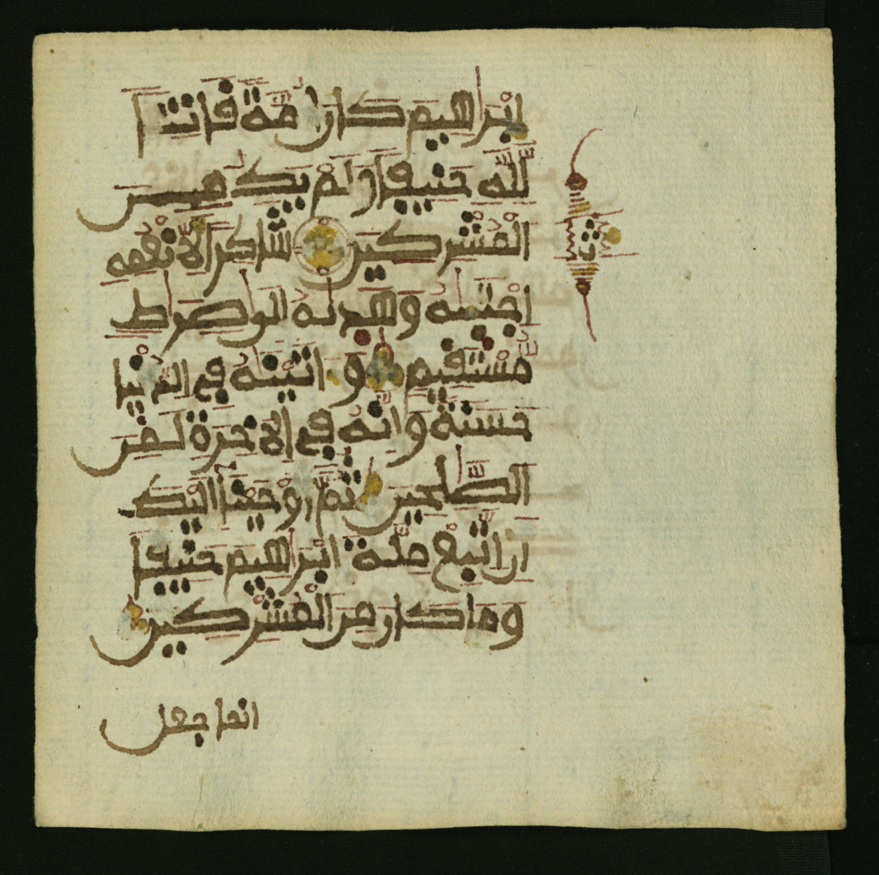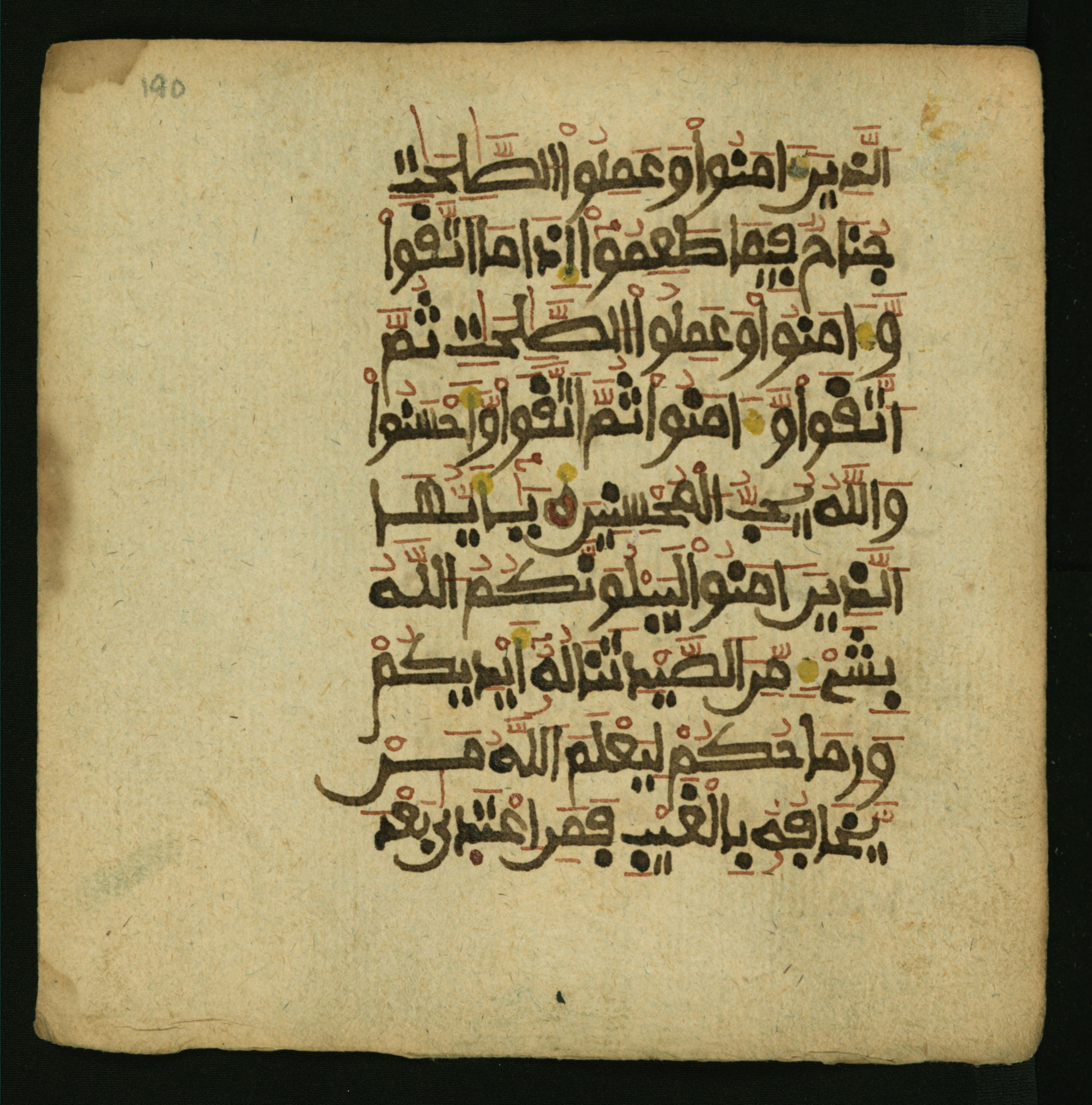 This square-format manuscript is volume 1, containing chapters 1-18 (Sūrat al-fātiḥah through Sūrat al-kahf), of an illuminated two-volume Qur'an produced in Sub-Saharan (West) Africa in the thirteenth century AH / nineteenth CE. The text is written in Sūdānī script in dark brown ink with vocalization in red on loose leaves. Chapter headings are in reddish-brown ink. Three yellow dots outlined in red arranged in a triangular form separate verses. Polychrome circular medallions as well as square and rectangular devices in a variety of patterns and colors mark textual divisions. The leaves of the text are organized between two decorated boards with geometric compositions. The pages and boards are housed in a leather pouch (satchel).