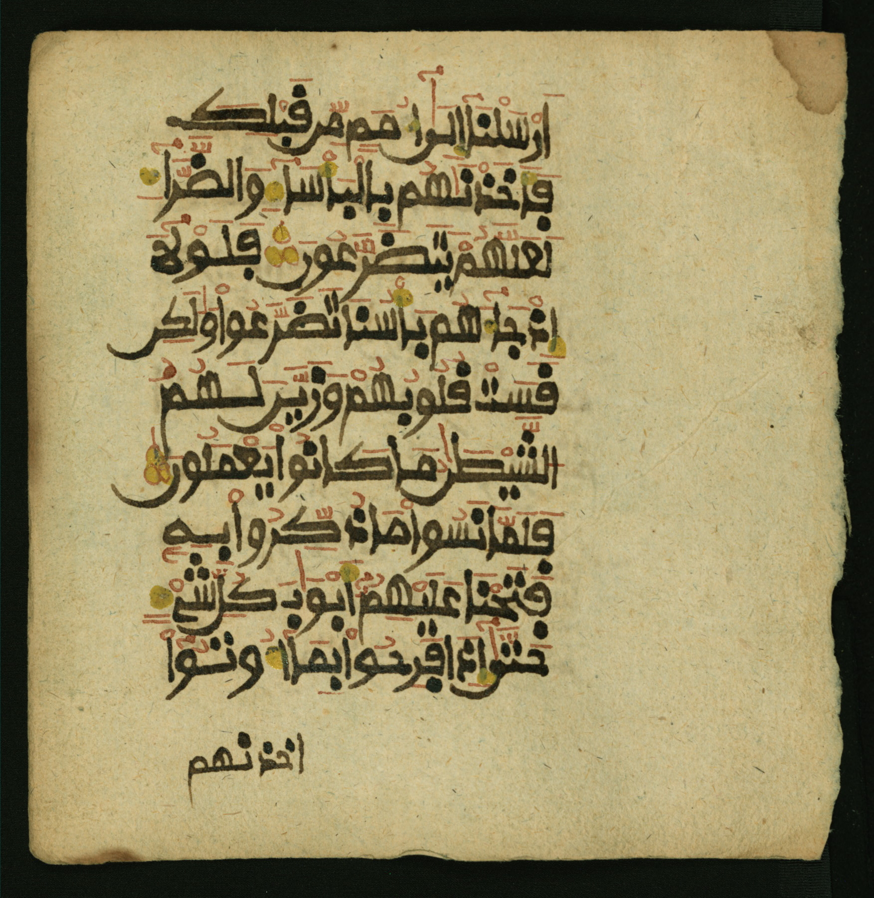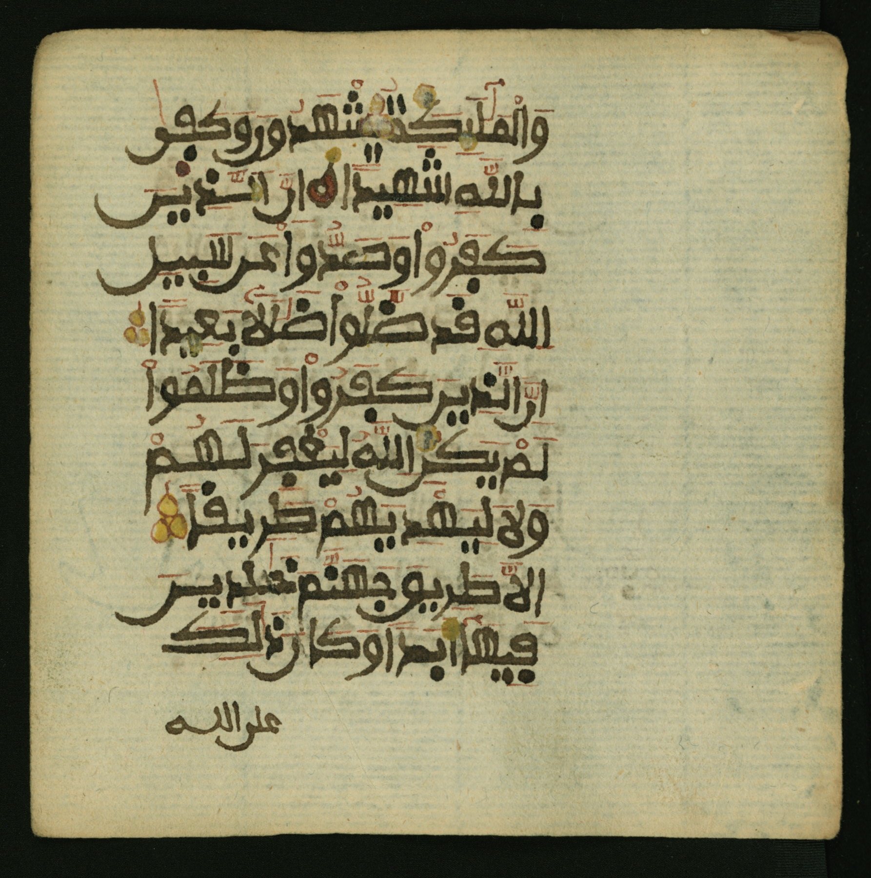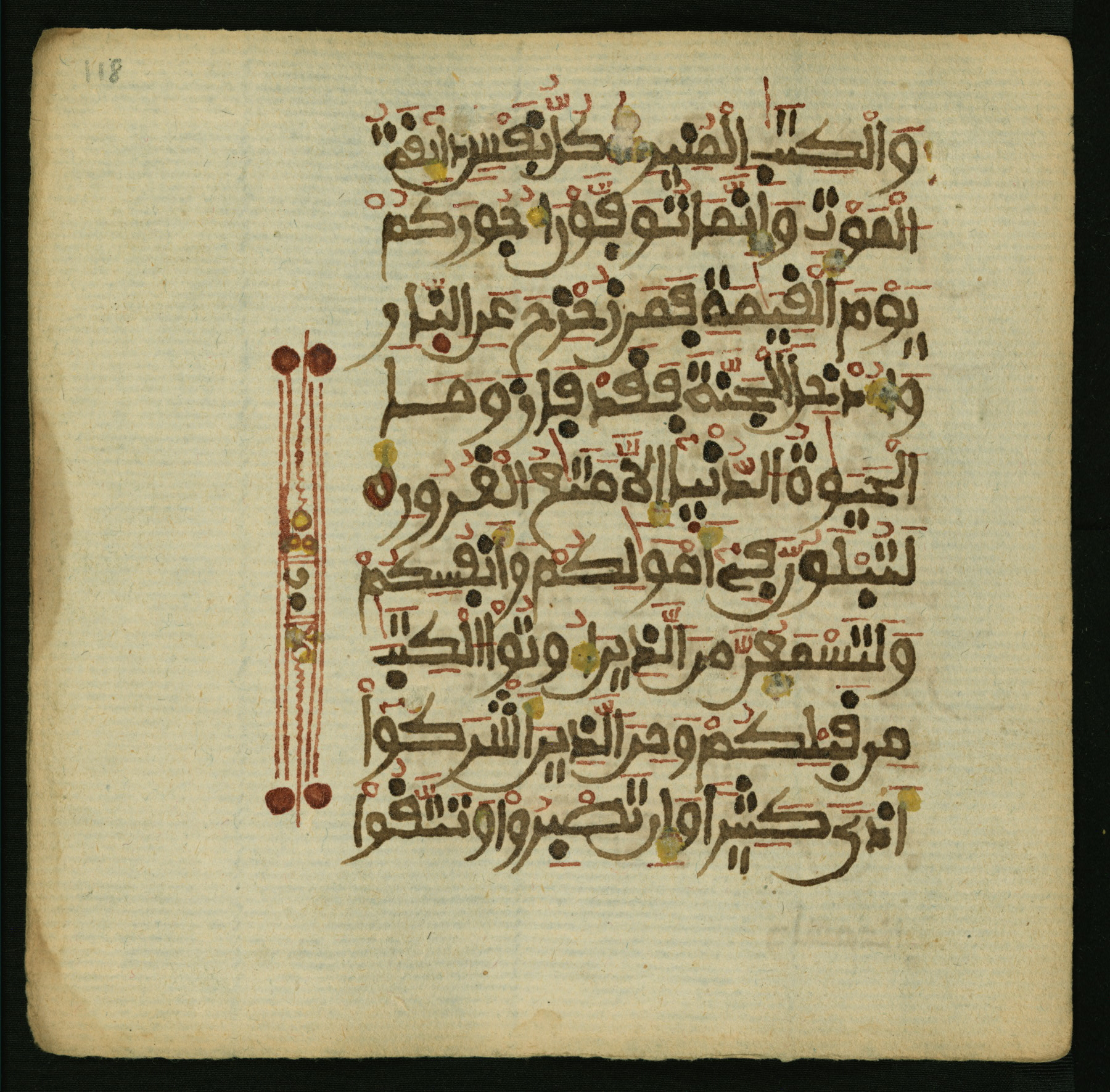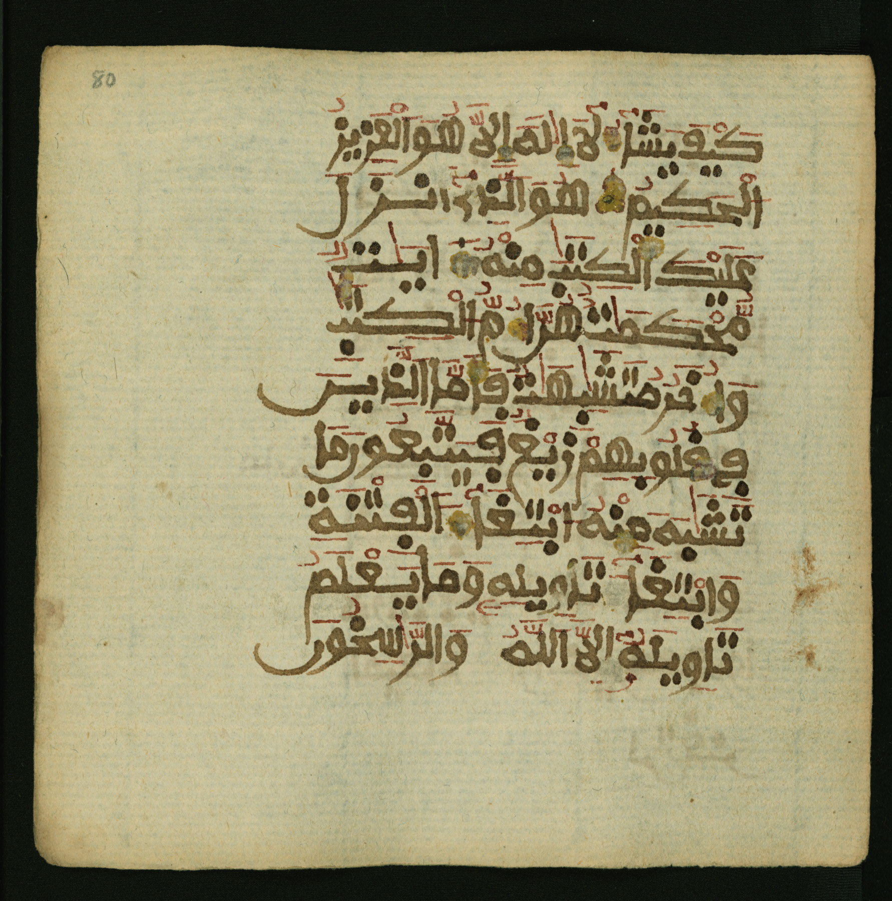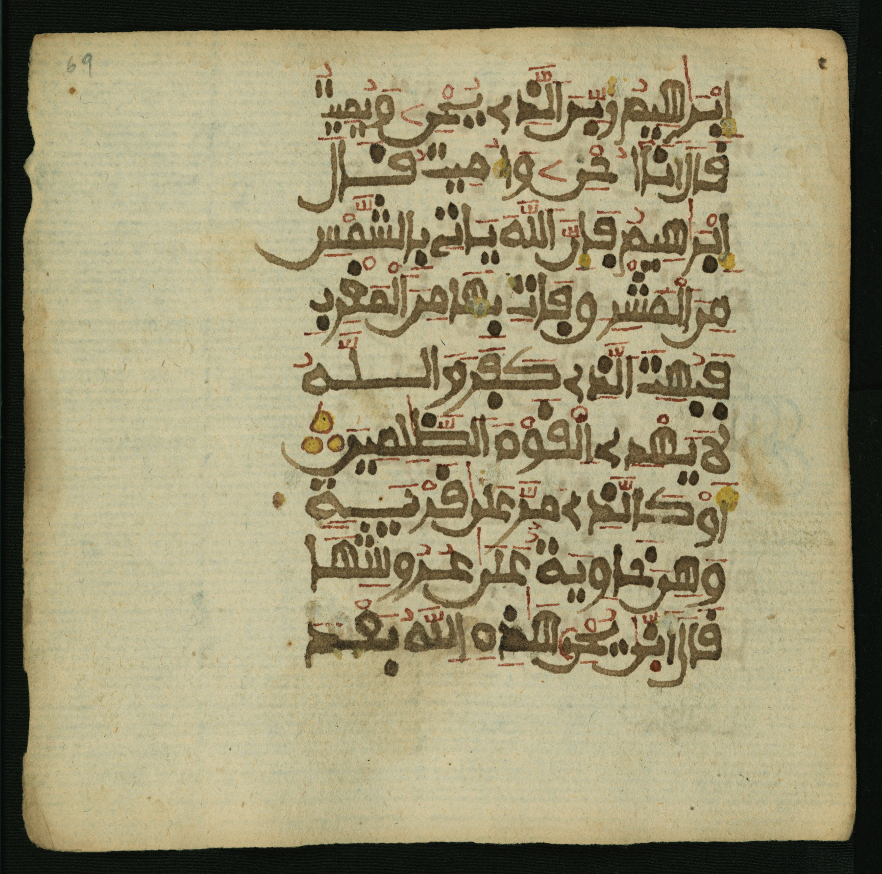 This square-format manuscript is volume 1, containing chapters 1-18 (Sūrat al-fātiḥah through Sūrat al-kahf), of an illuminated two-volume Qur'an produced in Sub-Saharan (West) Africa in the thirteenth century AH / nineteenth CE. The text is written in Sūdānī script in dark brown ink with vocalization in red on loose leaves. Chapter headings are in reddish-brown ink. Three yellow dots outlined in red arranged in a triangular form separate verses. Polychrome circular medallions as well as square and rectangular devices in a variety of patterns and colors mark textual divisions. The leaves of the text are organized between two decorated boards with geometric compositions. The pages and boards are housed in a leather pouch (satchel).