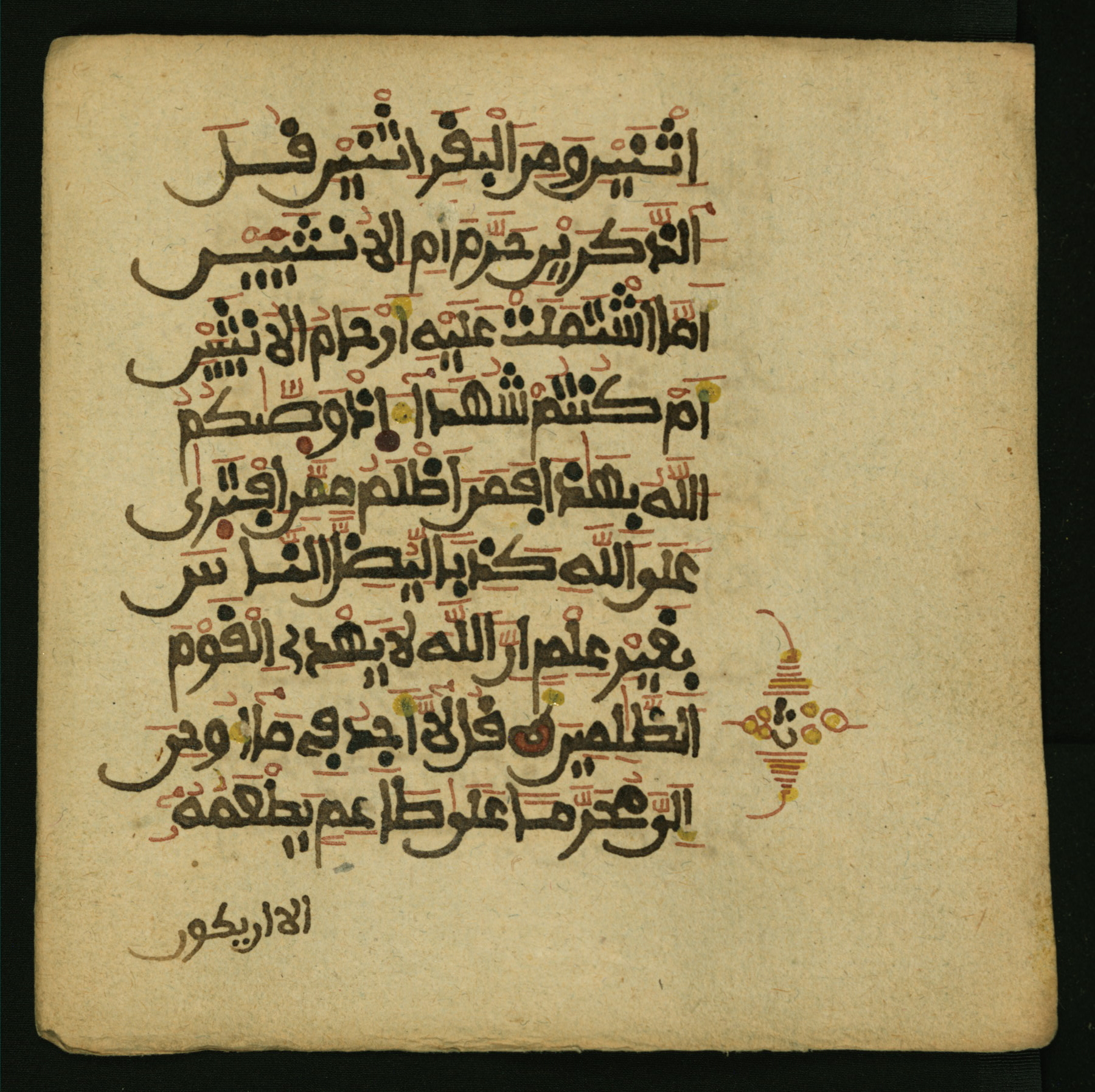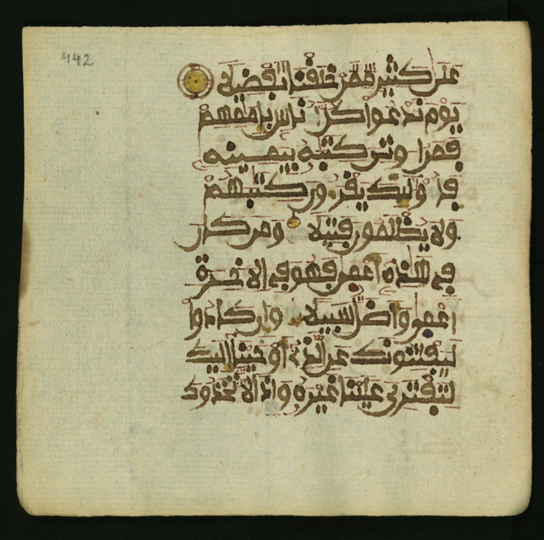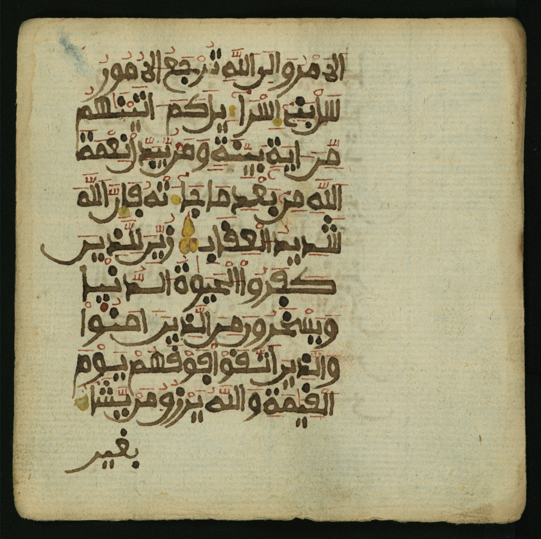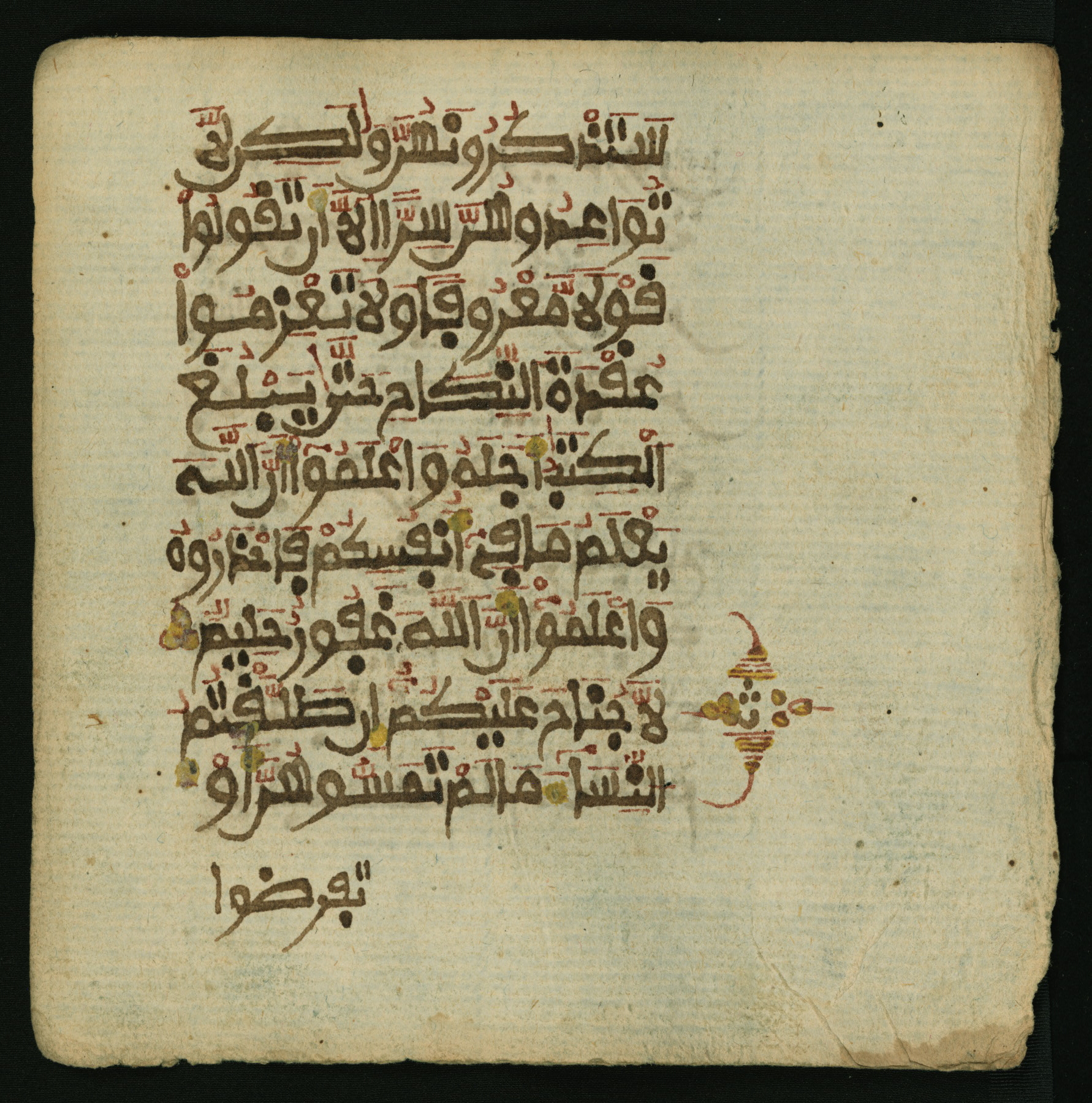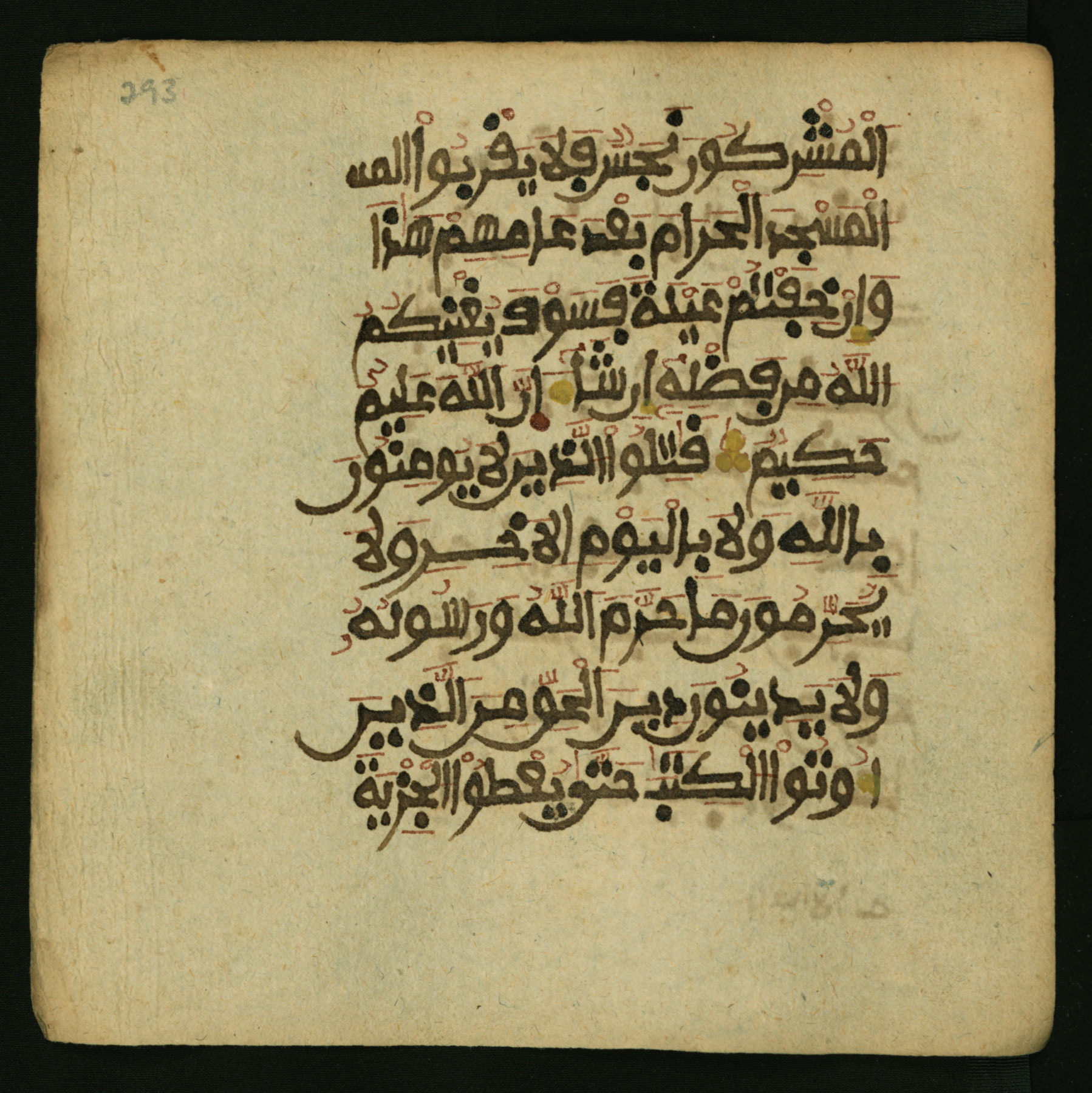 This square-format manuscript is volume 1, containing chapters 1-18 (Sūrat al-fātiḥah through Sūrat al-kahf), of an illuminated two-volume Qur'an produced in Sub-Saharan (West) Africa in the thirteenth century AH / nineteenth CE. The text is written in Sūdānī script in dark brown ink with vocalization in red on loose leaves. Chapter headings are in reddish-brown ink. Three yellow dots outlined in red arranged in a triangular form separate verses. Polychrome circular medallions as well as square and rectangular devices in a variety of patterns and colors mark textual divisions. The leaves of the text are organized between two decorated boards with geometric compositions. The pages and boards are housed in a leather pouch (satchel).