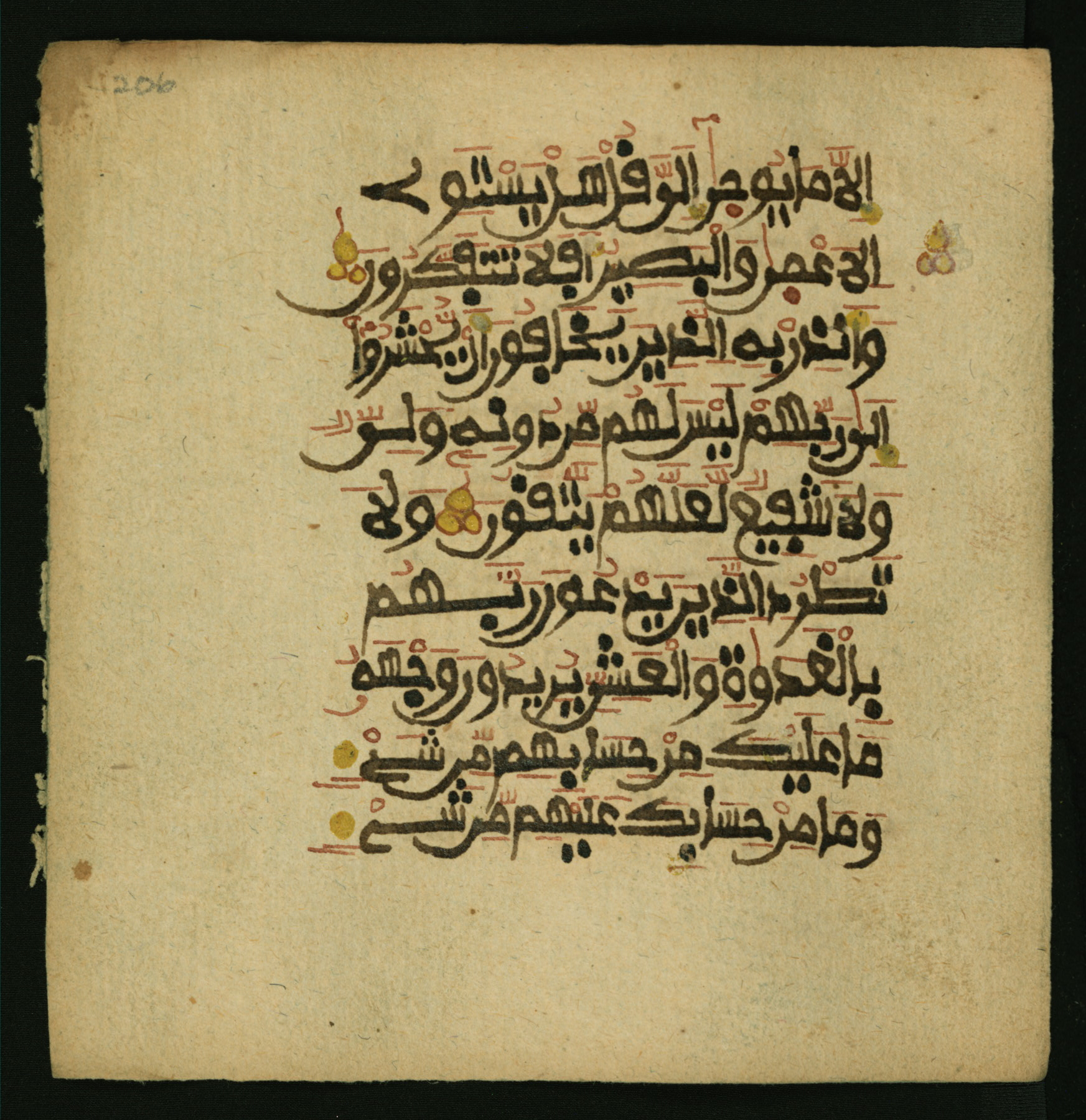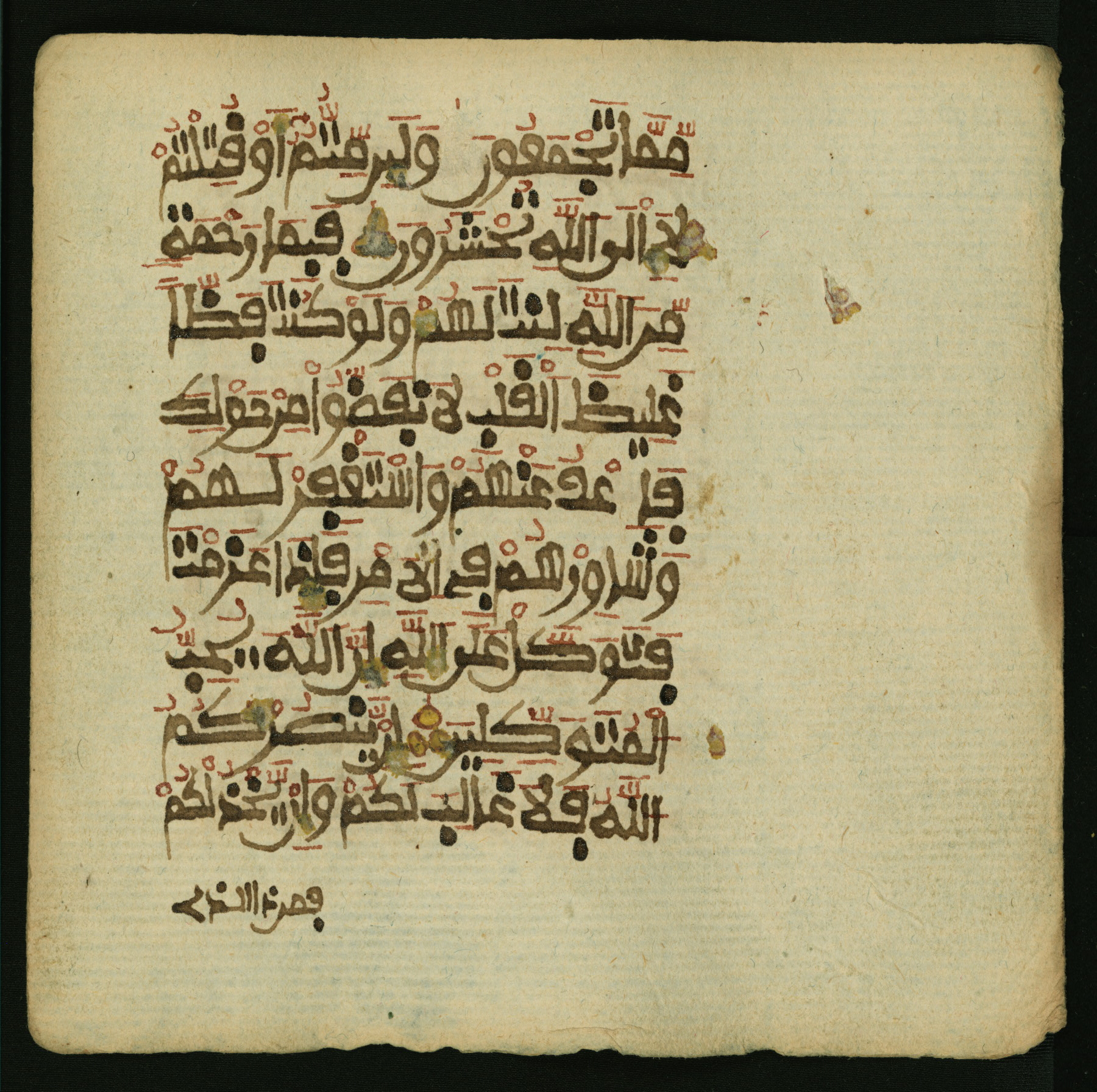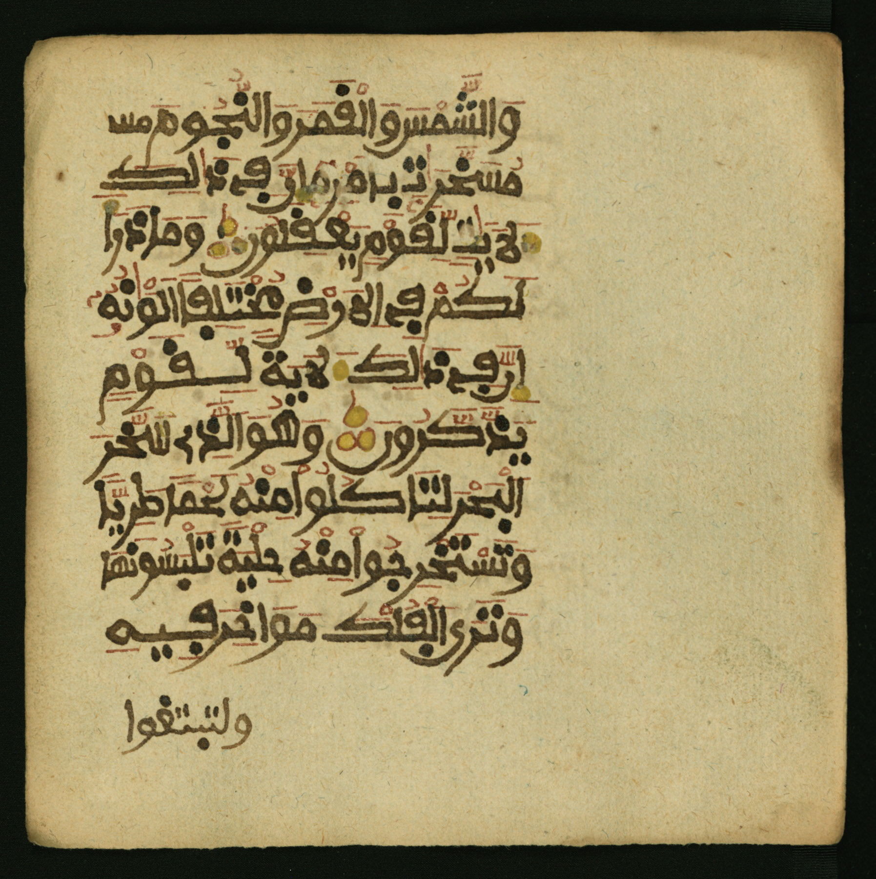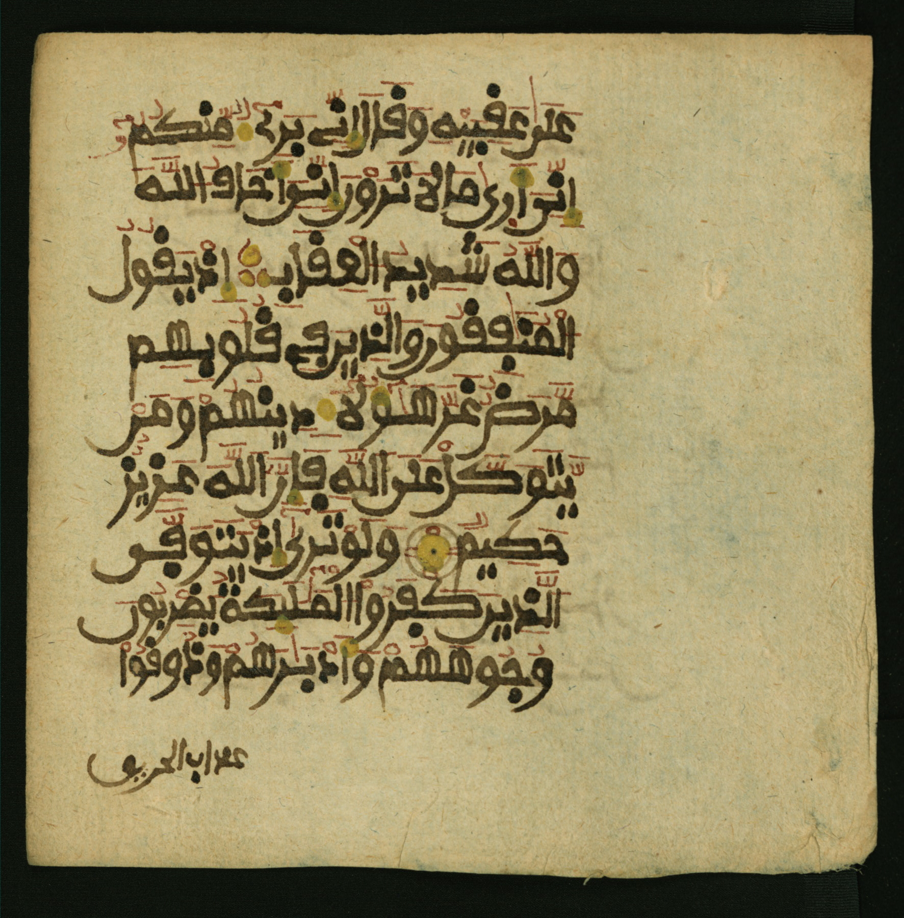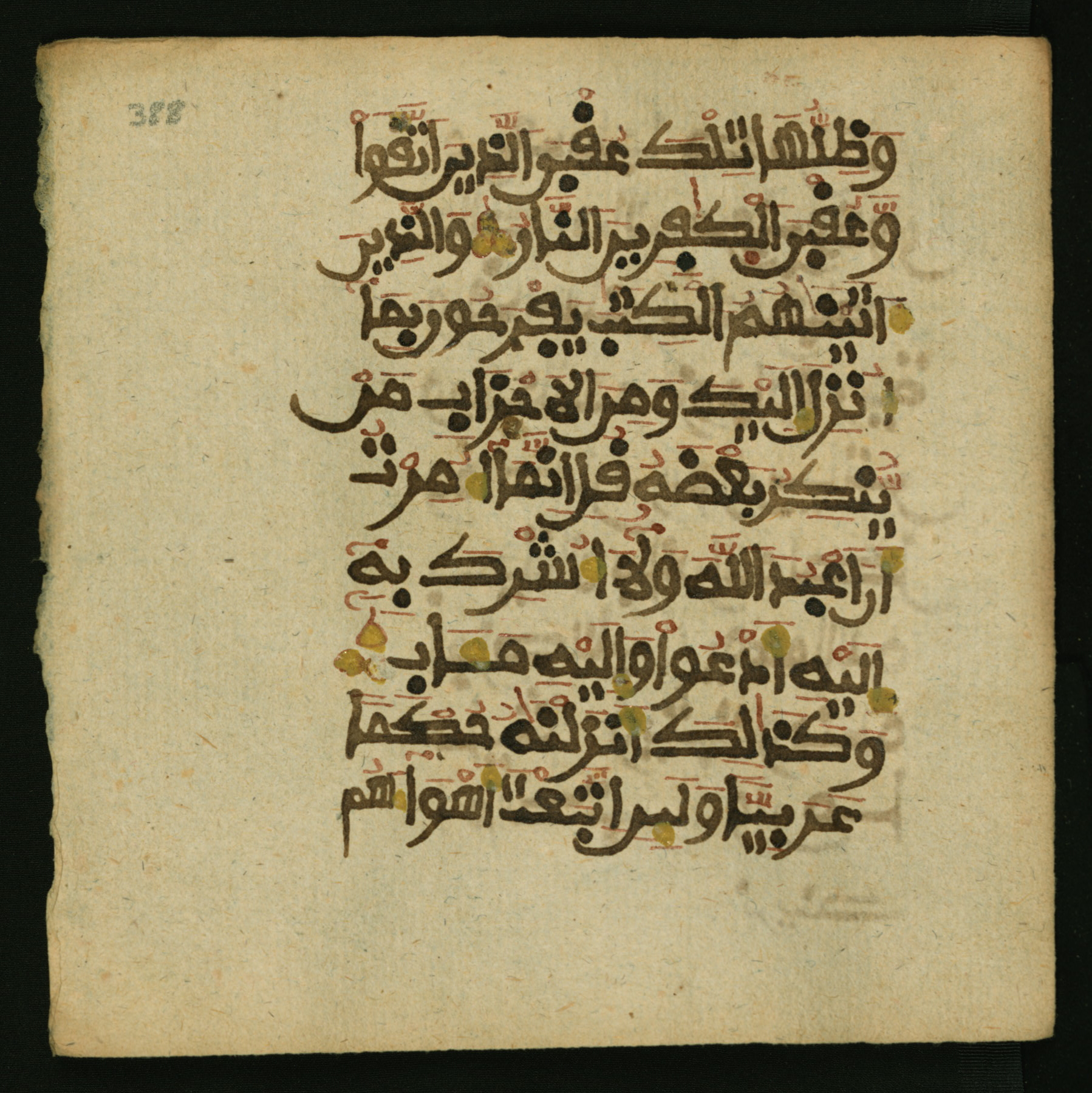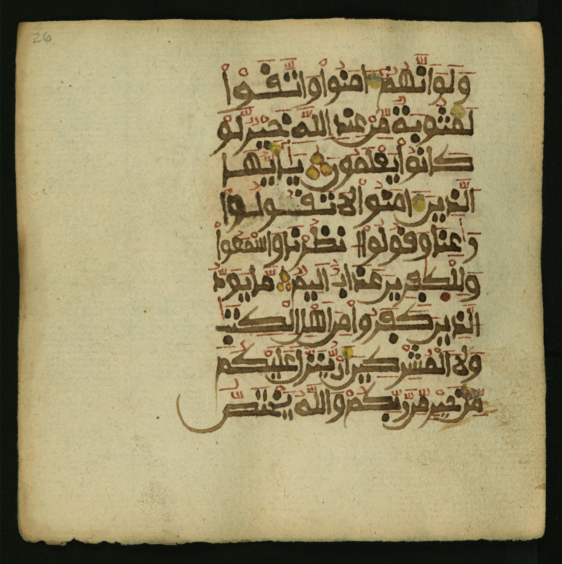 This square-format manuscript is volume 1, containing chapters 1-18 (Sūrat al-fātiḥah through Sūrat al-kahf), of an illuminated two-volume Qur'an produced in Sub-Saharan (West) Africa in the thirteenth century AH / nineteenth CE. The text is written in Sūdānī script in dark brown ink with vocalization in red on loose leaves. Chapter headings are in reddish-brown ink. Three yellow dots outlined in red arranged in a triangular form separate verses. Polychrome circular medallions as well as square and rectangular devices in a variety of patterns and colors mark textual divisions. The leaves of the text are organized between two decorated boards with geometric compositions. The pages and boards are housed in a leather pouch (satchel).