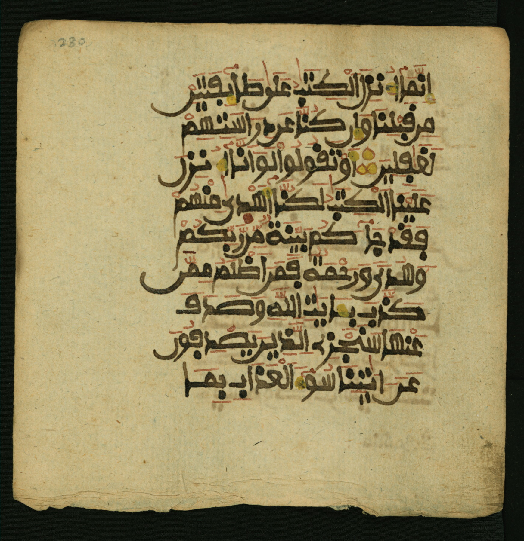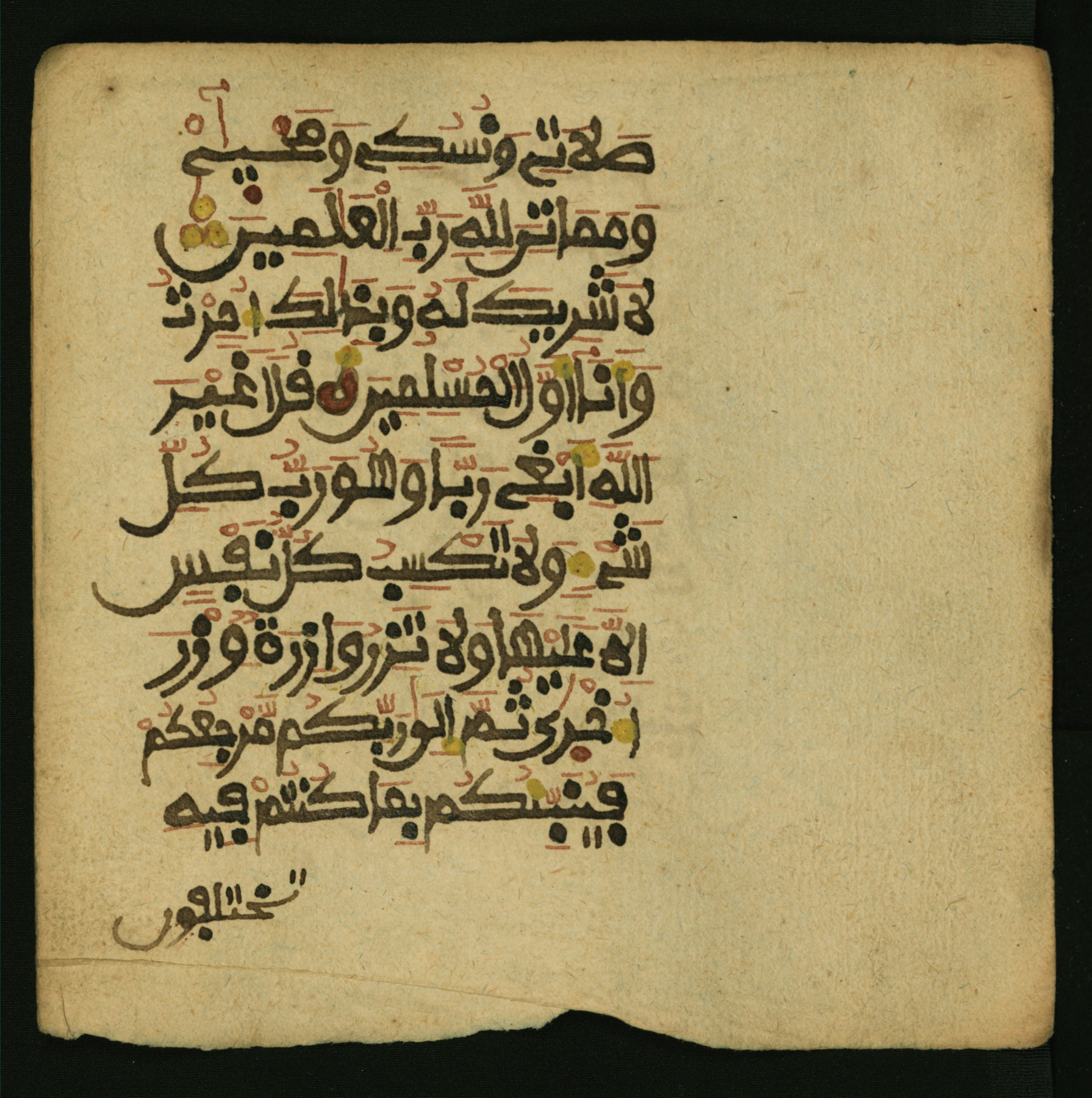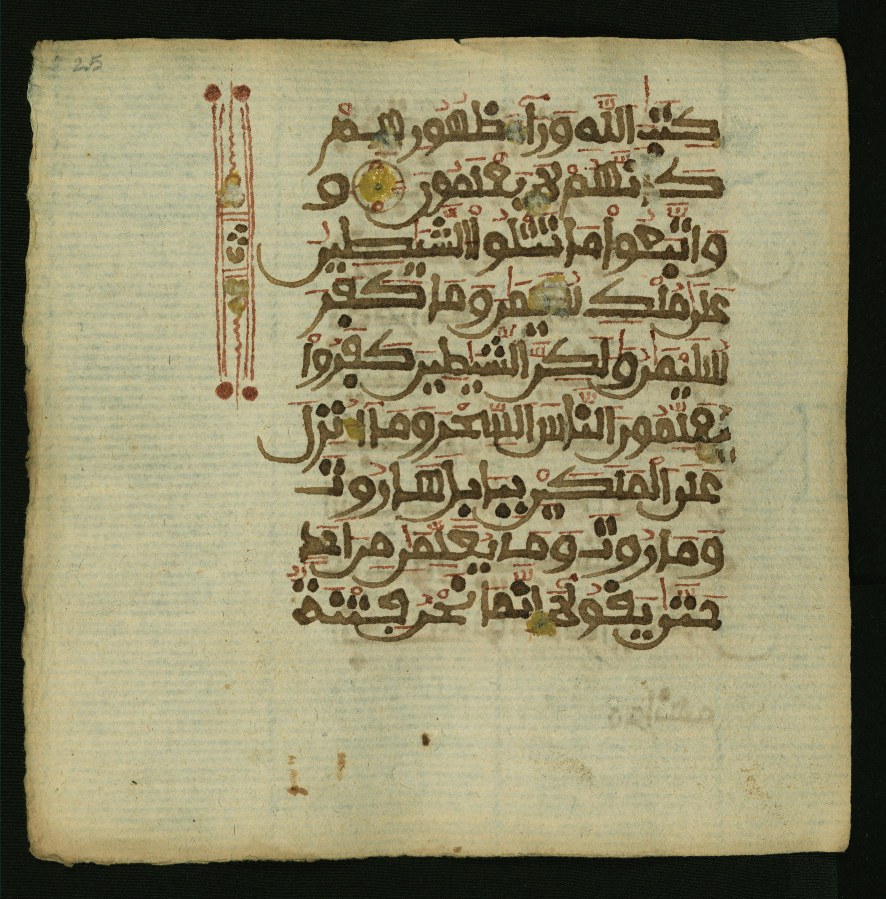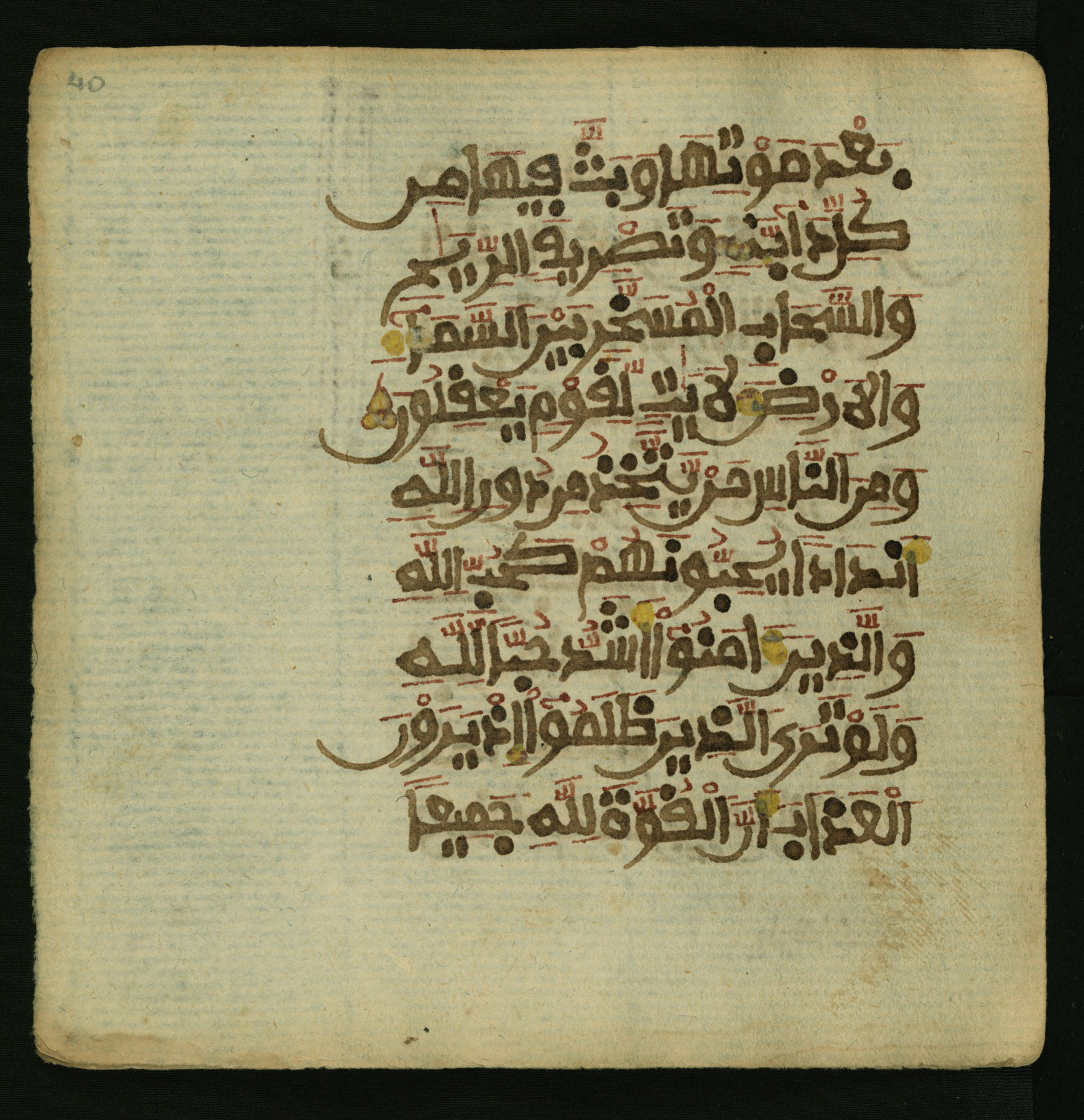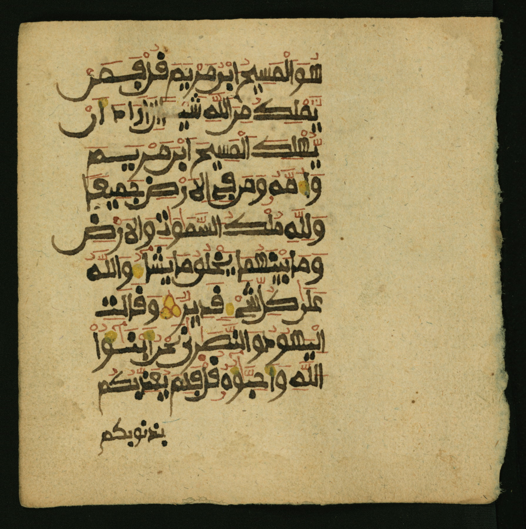 This square-format manuscript is volume 1, containing chapters 1-18 (Sūrat al-fātiḥah through Sūrat al-kahf), of an illuminated two-volume Qur'an produced in Sub-Saharan (West) Africa in the thirteenth century AH / nineteenth CE. The text is written in Sūdānī script in dark brown ink with vocalization in red on loose leaves. Chapter headings are in reddish-brown ink. Three yellow dots outlined in red arranged in a triangular form separate verses. Polychrome circular medallions as well as square and rectangular devices in a variety of patterns and colors mark textual divisions. The leaves of the text are organized between two decorated boards with geometric compositions. The pages and boards are housed in a leather pouch (satchel).