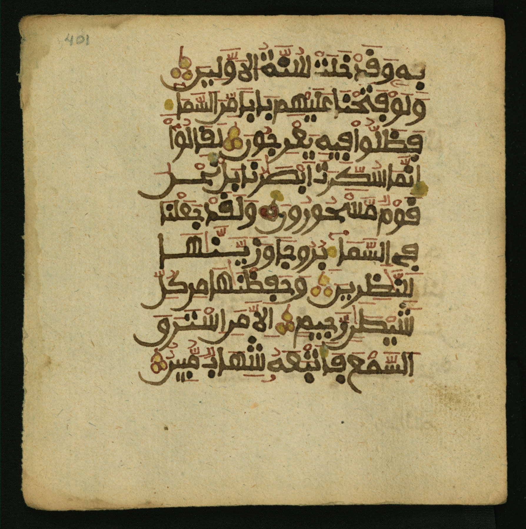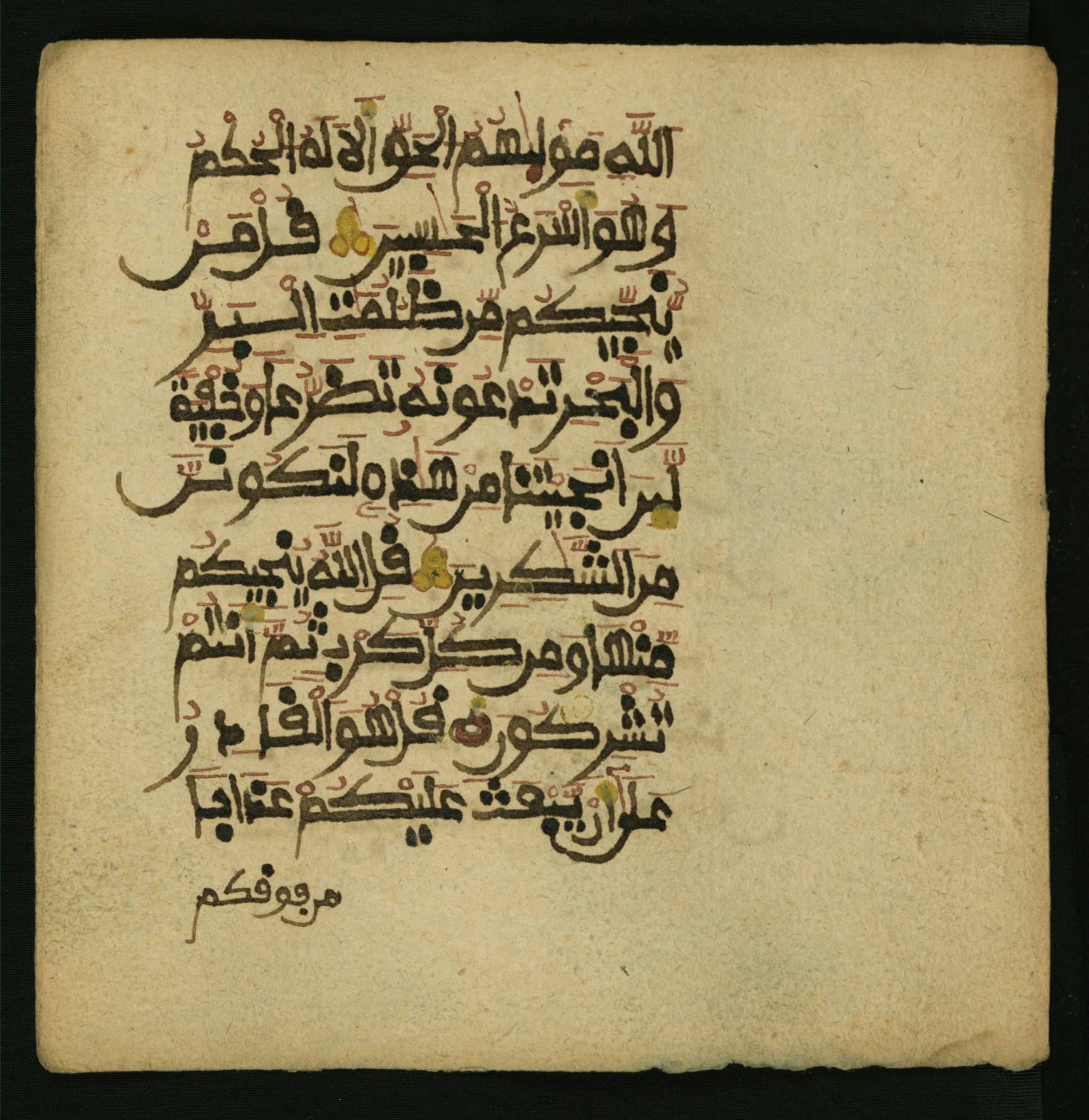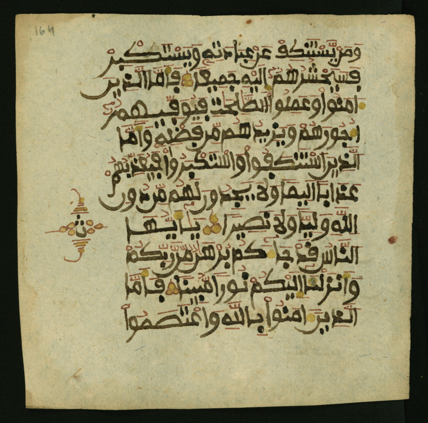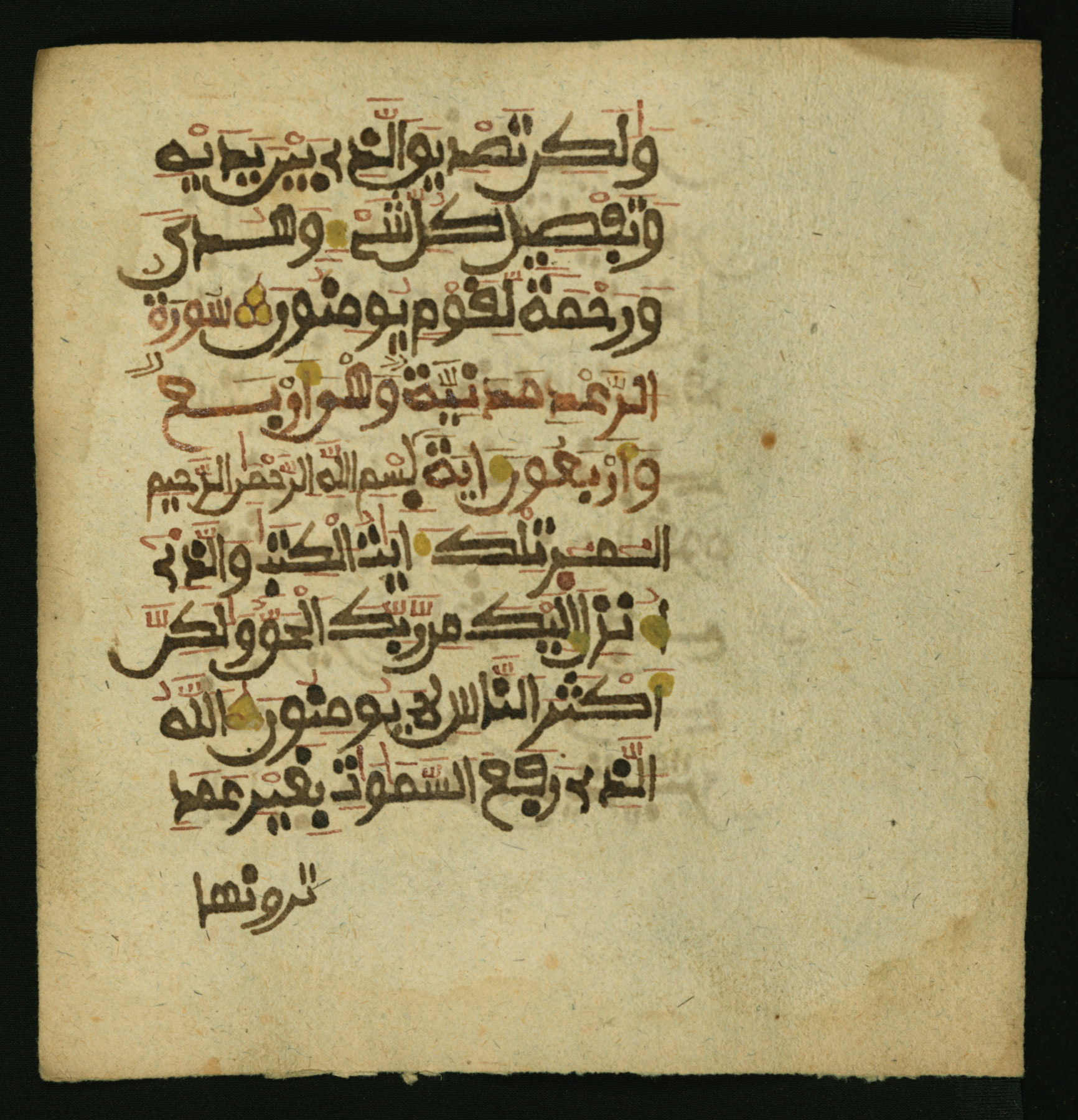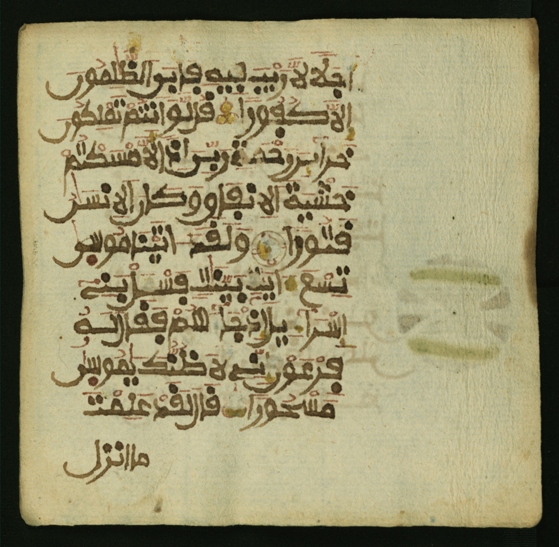 This square-format manuscript is volume 1, containing chapters 1-18 (Sūrat al-fātiḥah through Sūrat al-kahf), of an illuminated two-volume Qur'an produced in Sub-Saharan (West) Africa in the thirteenth century AH / nineteenth CE. The text is written in Sūdānī script in dark brown ink with vocalization in red on loose leaves. Chapter headings are in reddish-brown ink. Three yellow dots outlined in red arranged in a triangular form separate verses. Polychrome circular medallions as well as square and rectangular devices in a variety of patterns and colors mark textual divisions. The leaves of the text are organized between two decorated boards with geometric compositions. The pages and boards are housed in a leather pouch (satchel).