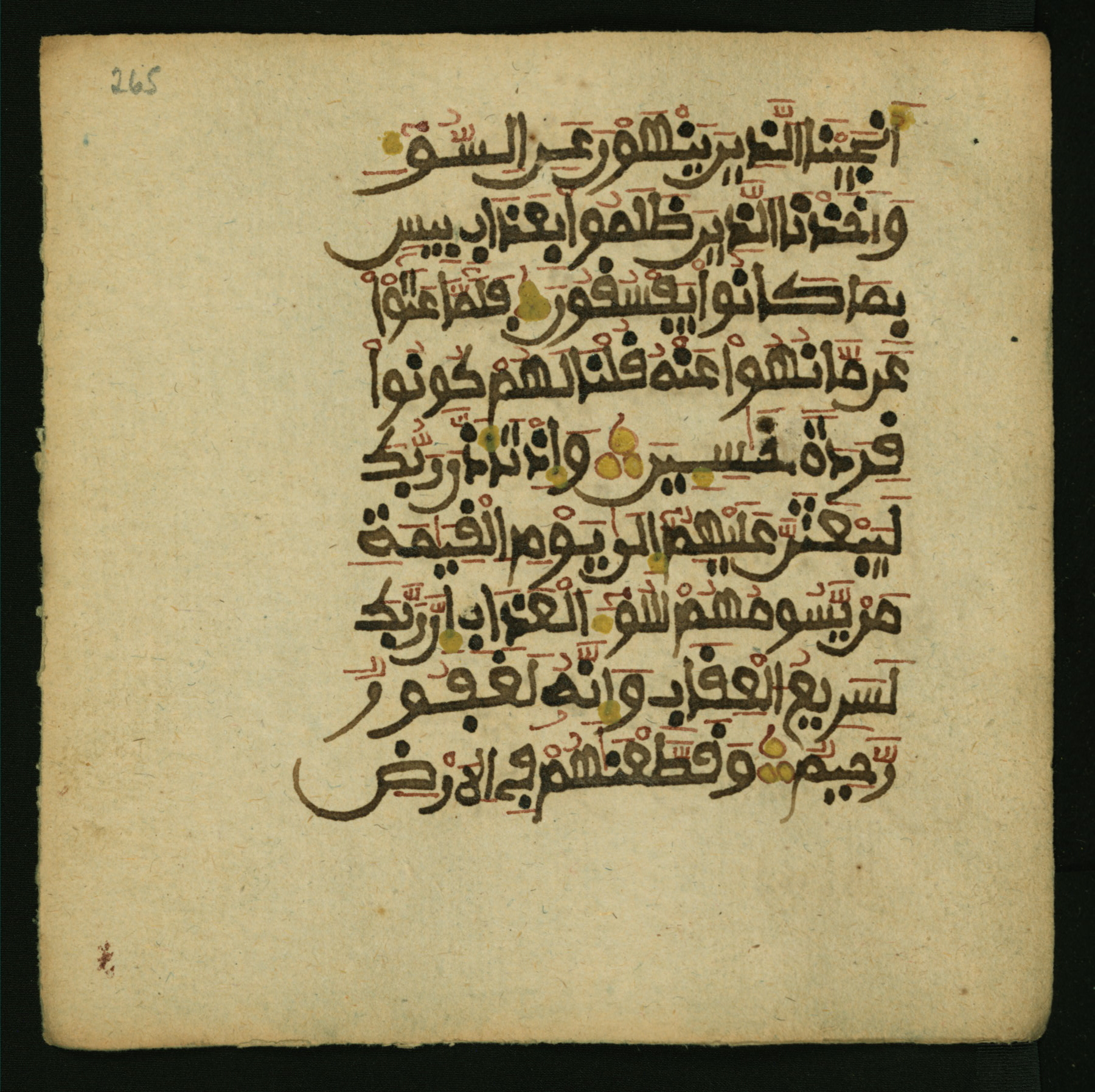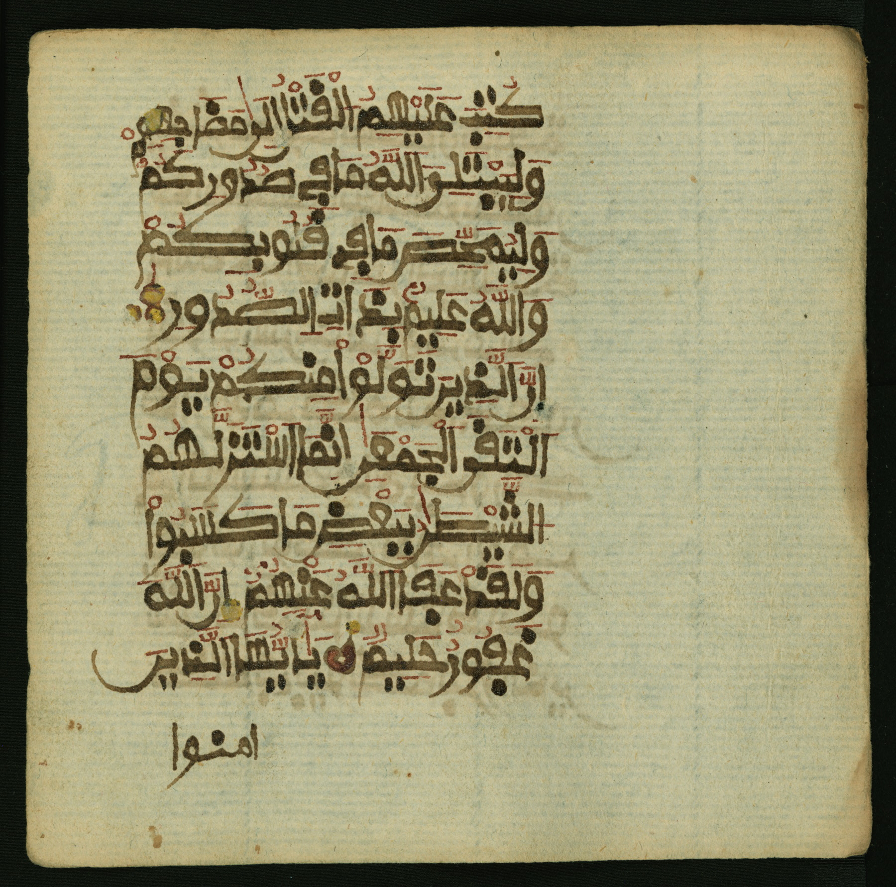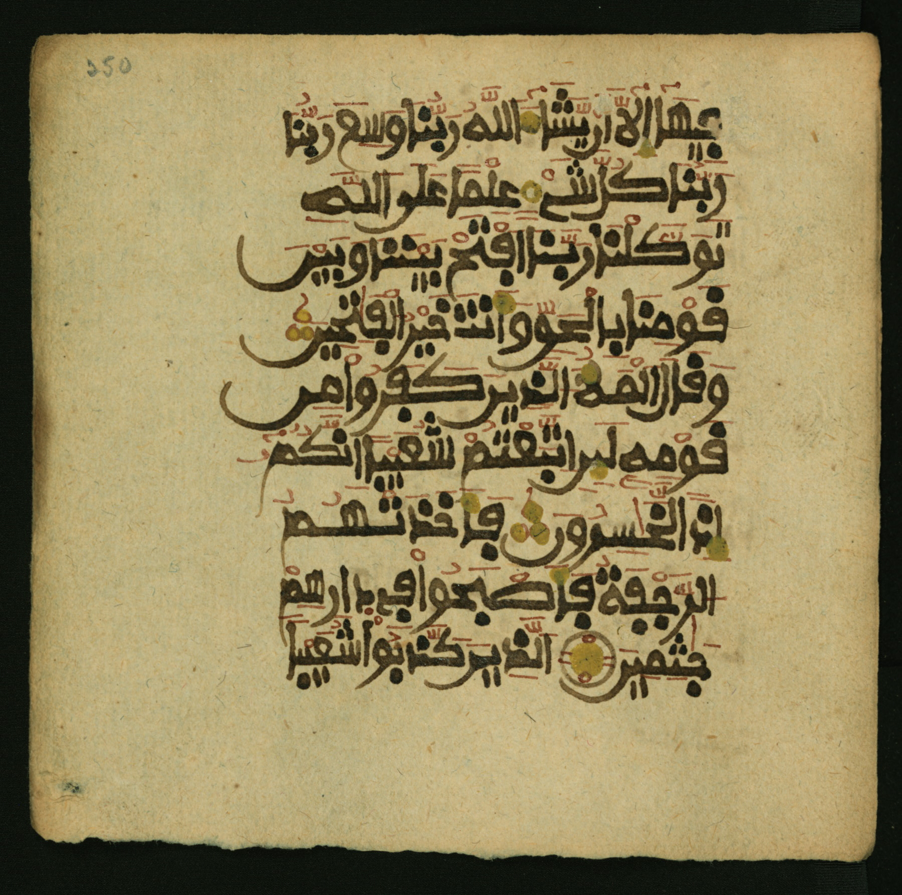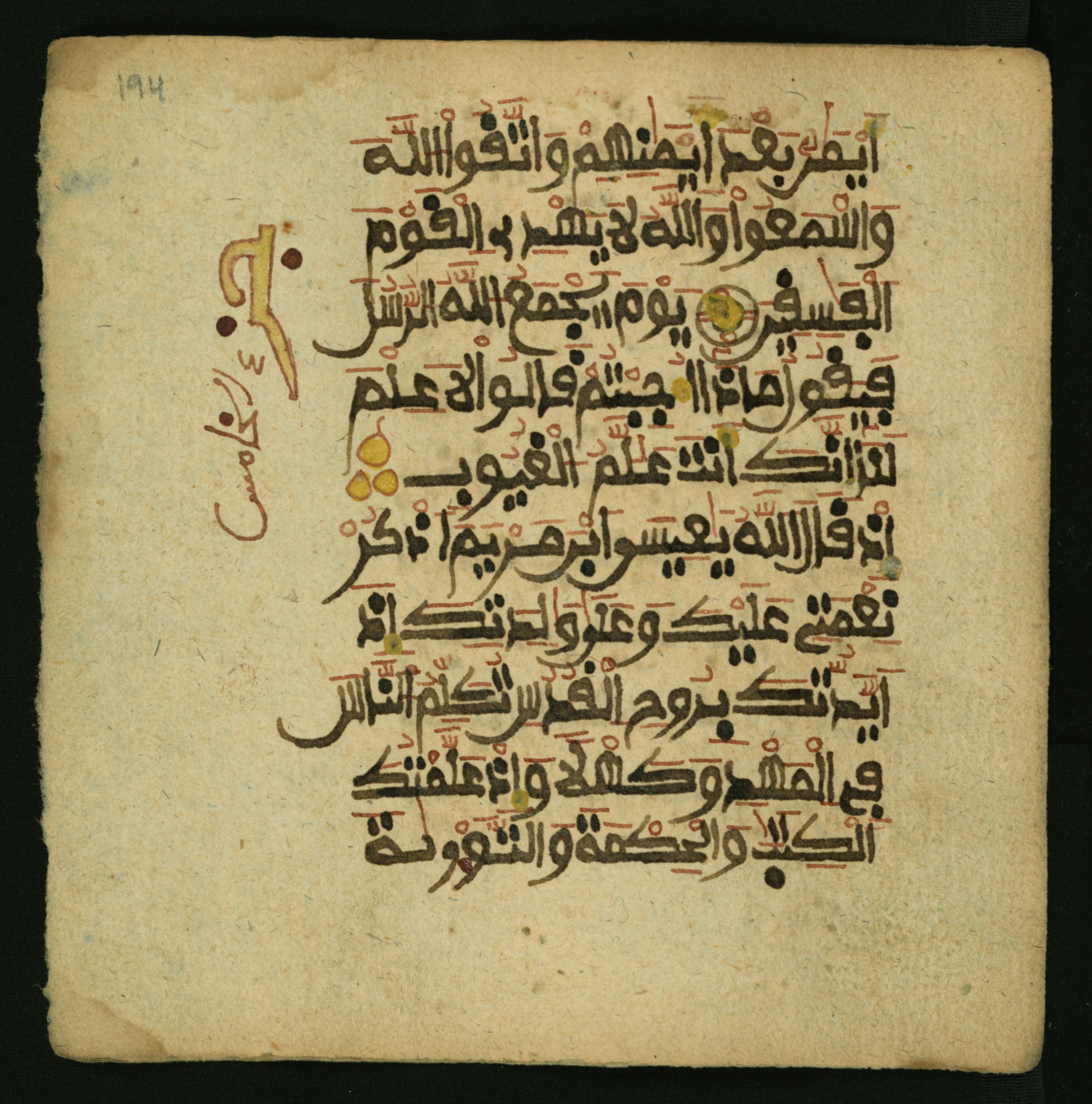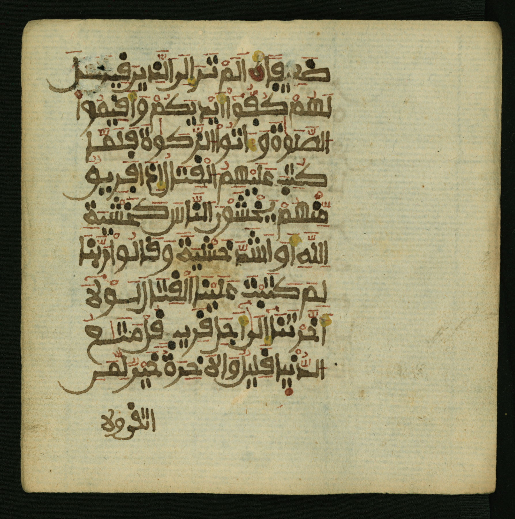 This square-format manuscript is volume 1, containing chapters 1-18 (Sūrat al-fātiḥah through Sūrat al-kahf), of an illuminated two-volume Qur'an produced in Sub-Saharan (West) Africa in the thirteenth century AH / nineteenth CE. The text is written in Sūdānī script in dark brown ink with vocalization in red on loose leaves. Chapter headings are in reddish-brown ink. Three yellow dots outlined in red arranged in a triangular form separate verses. Polychrome circular medallions as well as square and rectangular devices in a variety of patterns and colors mark textual divisions. The leaves of the text are organized between two decorated boards with geometric compositions. The pages and boards are housed in a leather pouch (satchel).