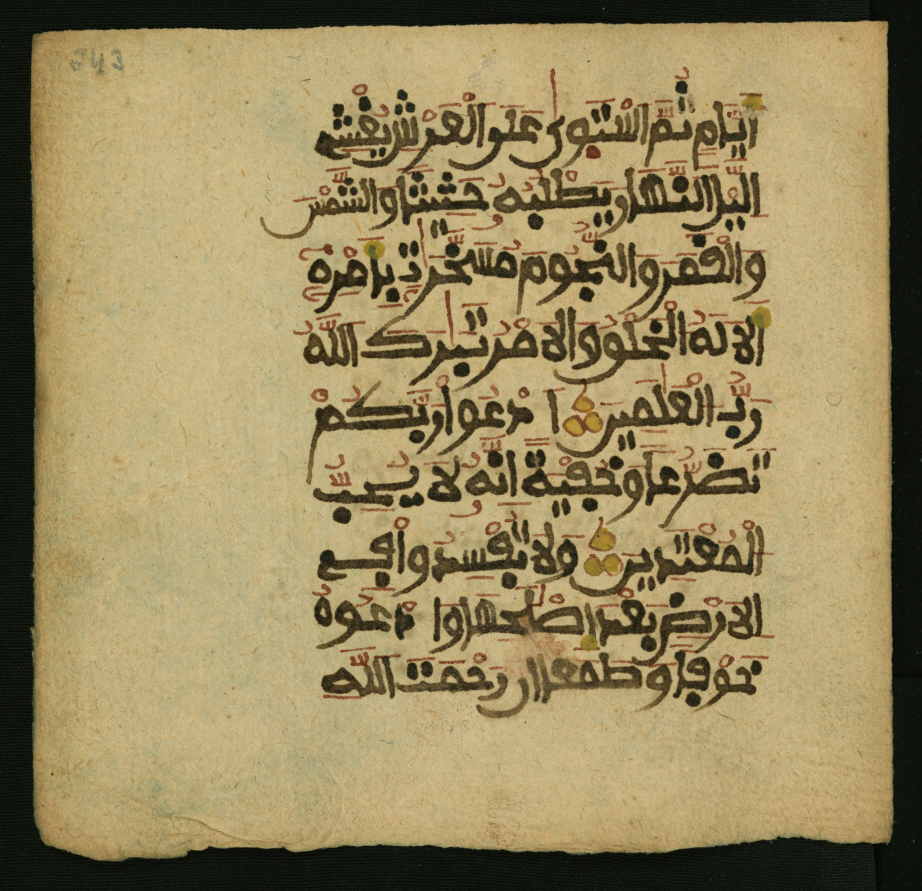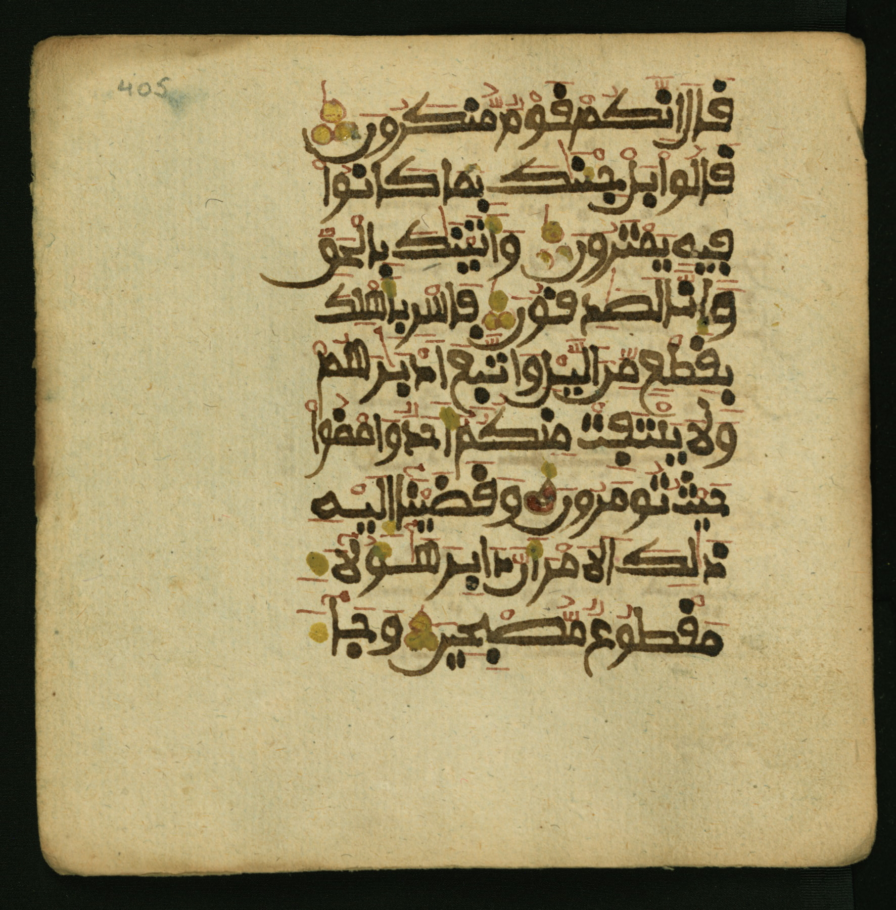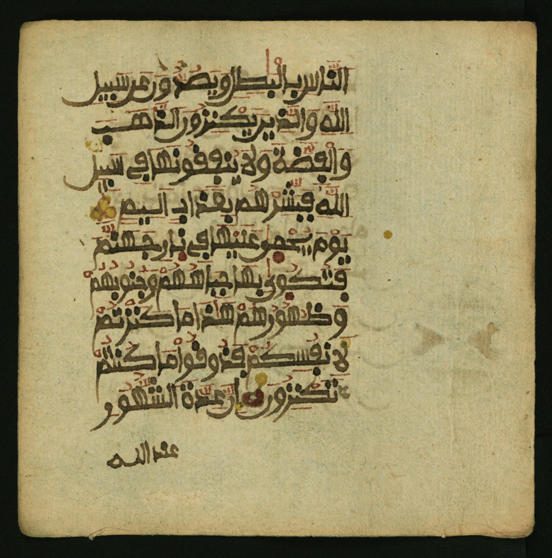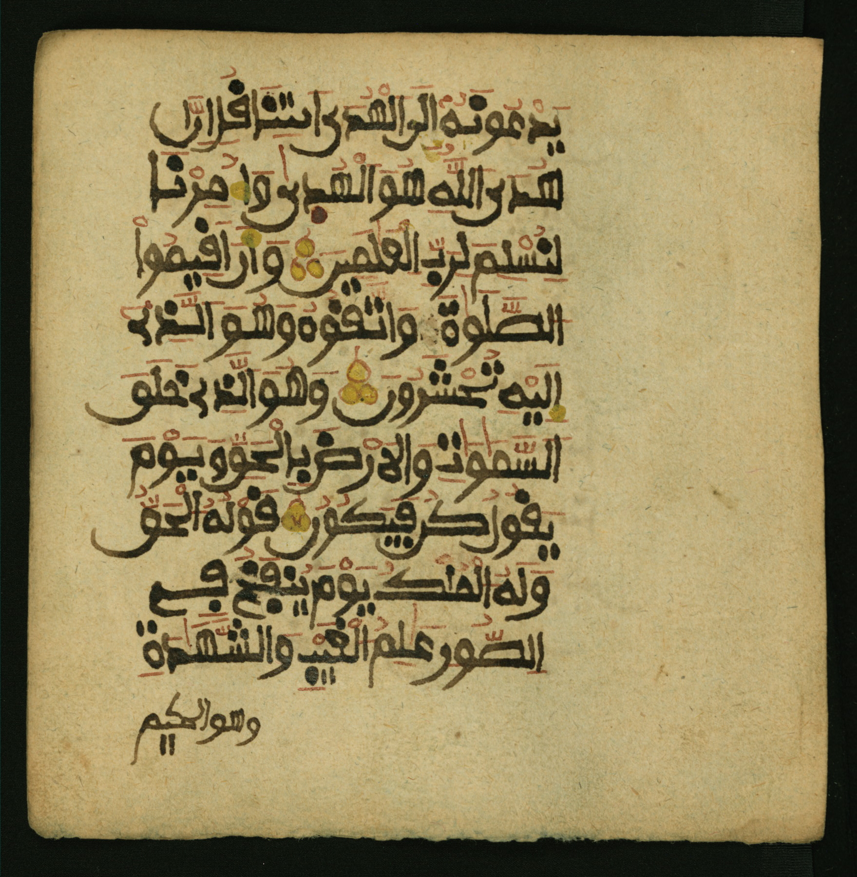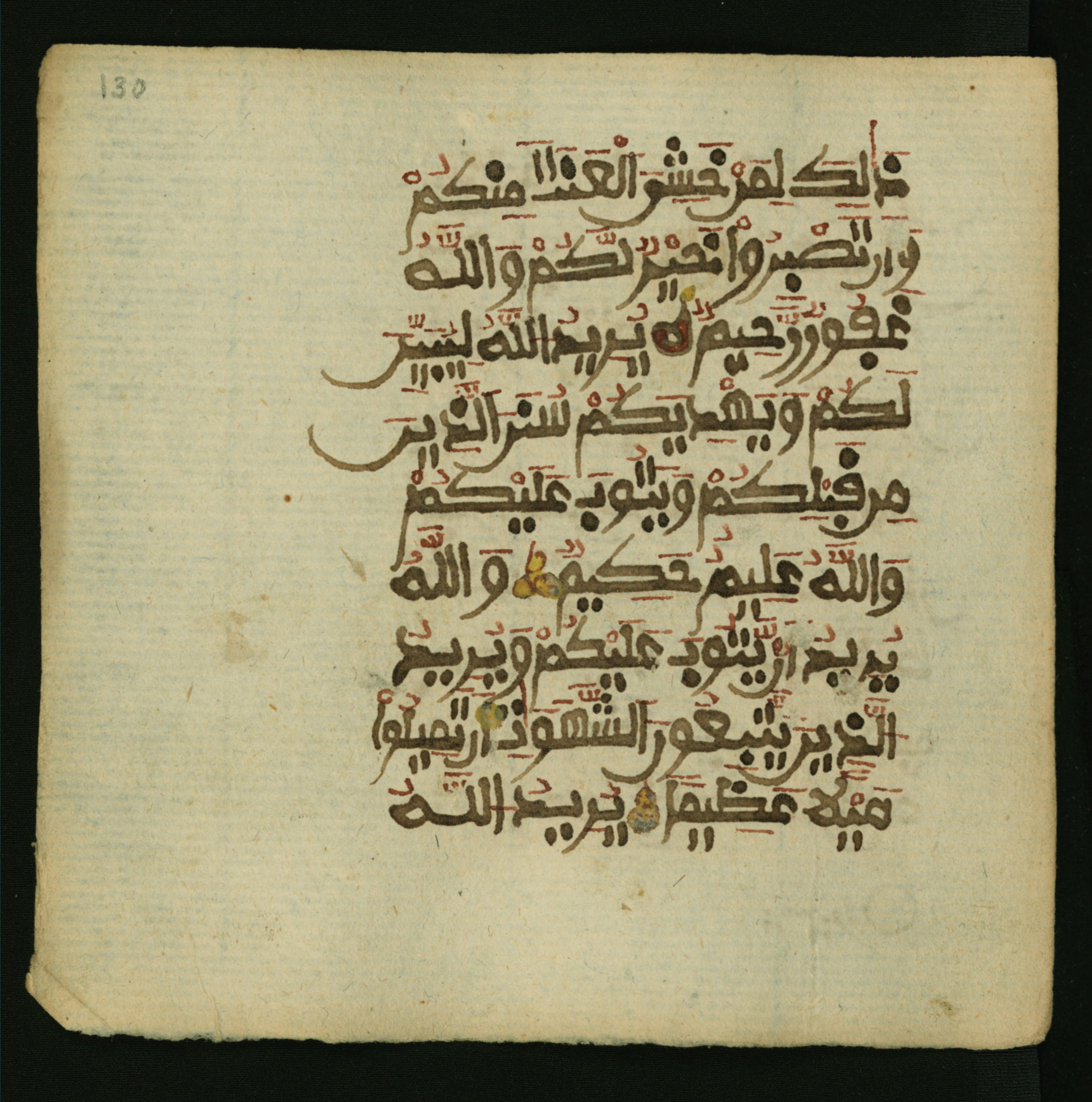 This square-format manuscript is volume 1, containing chapters 1-18 (Sūrat al-fātiḥah through Sūrat al-kahf), of an illuminated two-volume Qur'an produced in Sub-Saharan (West) Africa in the thirteenth century AH / nineteenth CE. The text is written in Sūdānī script in dark brown ink with vocalization in red on loose leaves. Chapter headings are in reddish-brown ink. Three yellow dots outlined in red arranged in a triangular form separate verses. Polychrome circular medallions as well as square and rectangular devices in a variety of patterns and colors mark textual divisions. The leaves of the text are organized between two decorated boards with geometric compositions. The pages and boards are housed in a leather pouch (satchel).