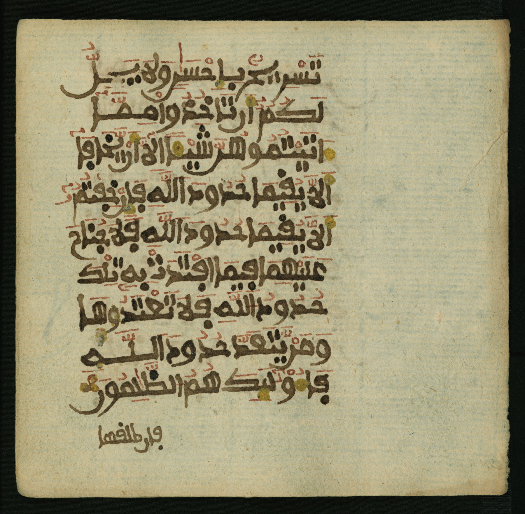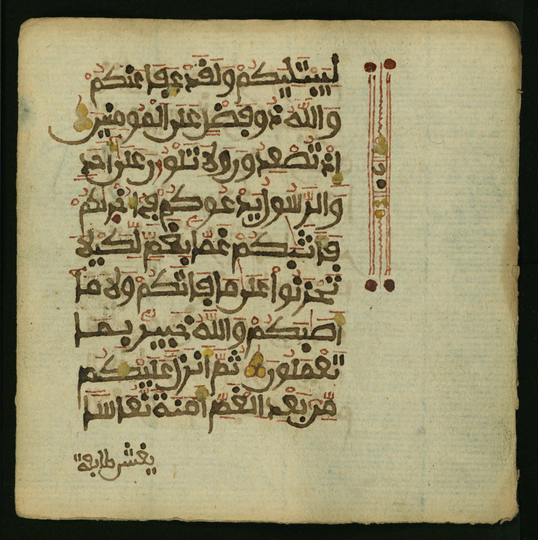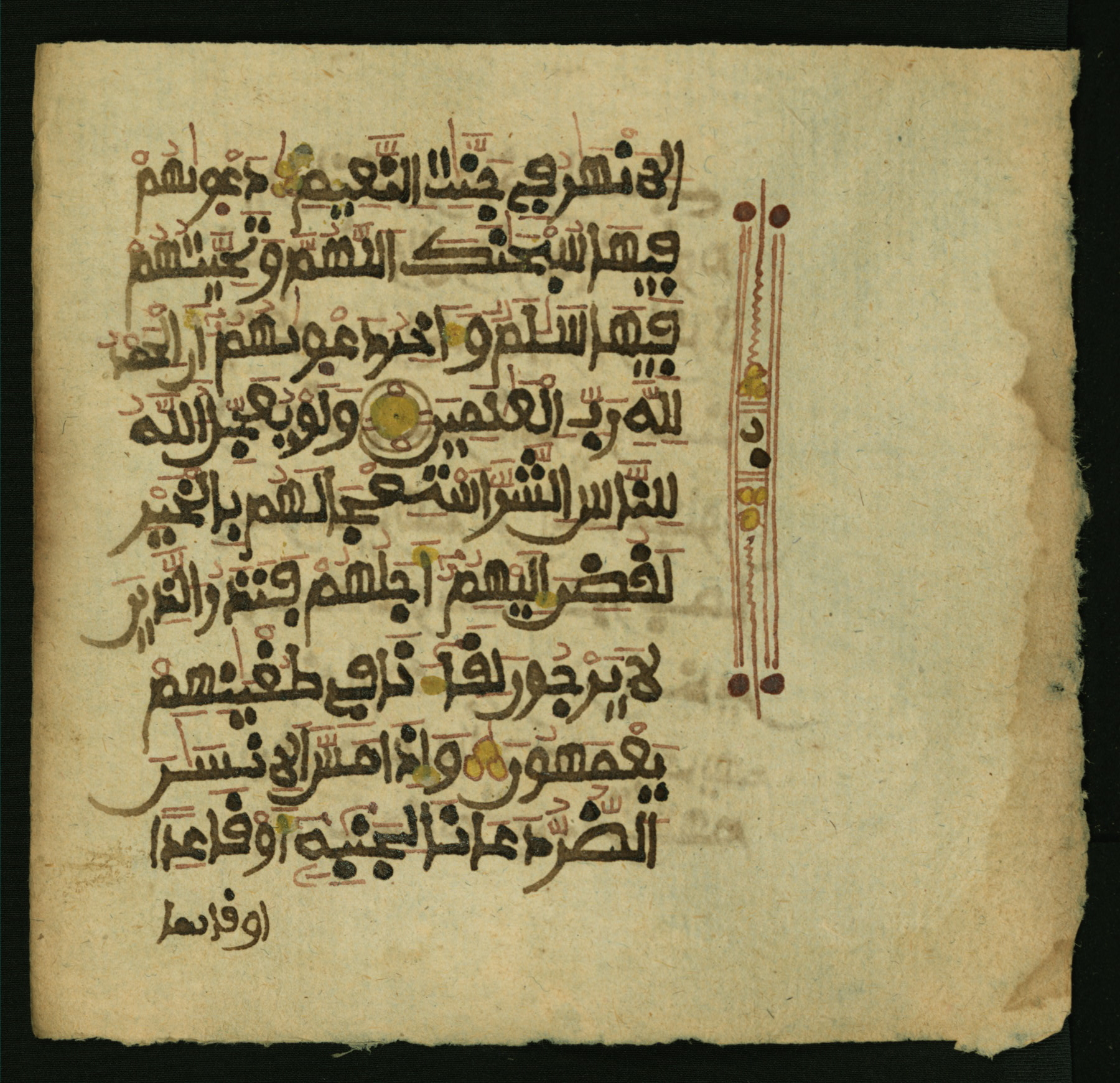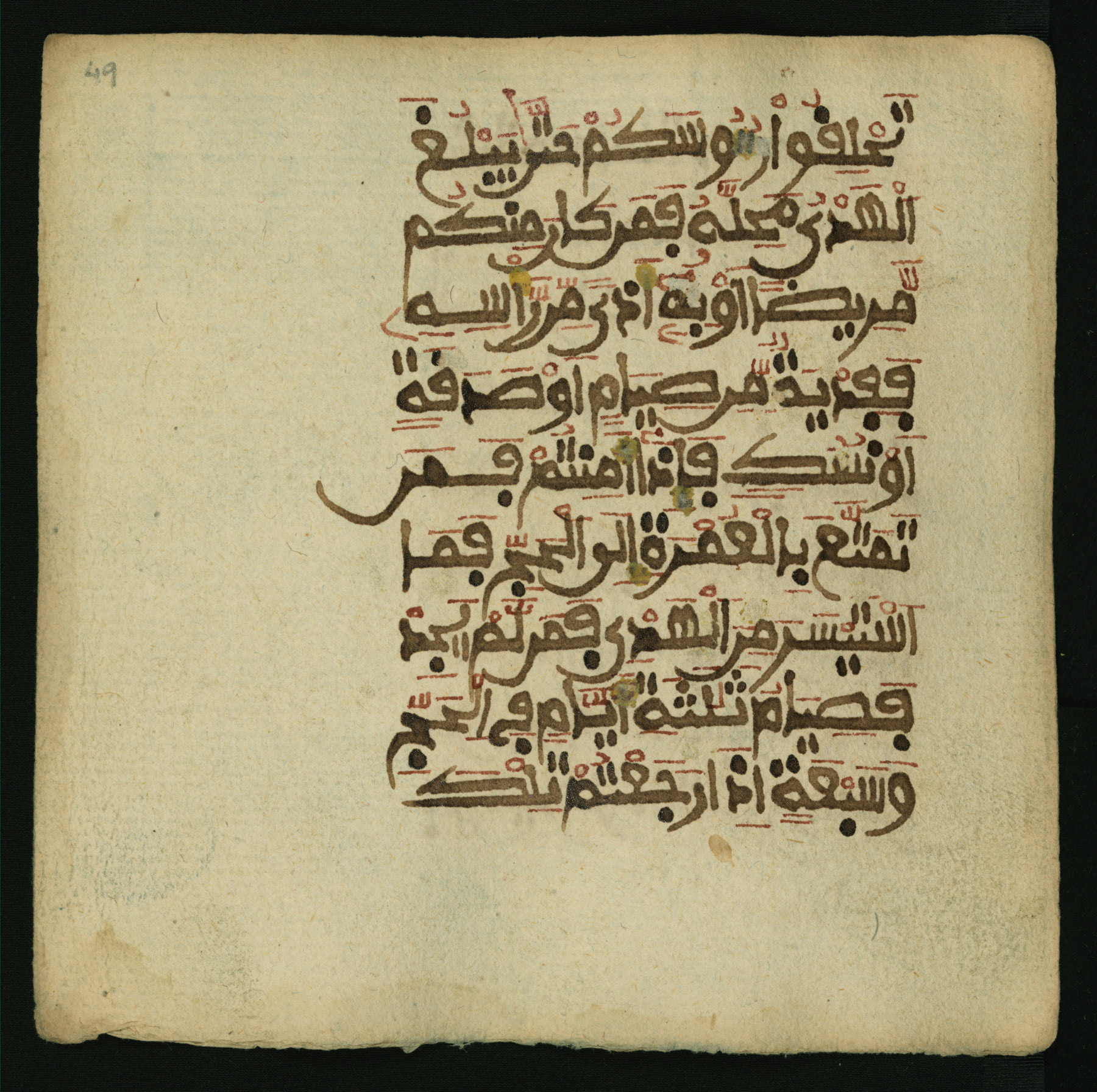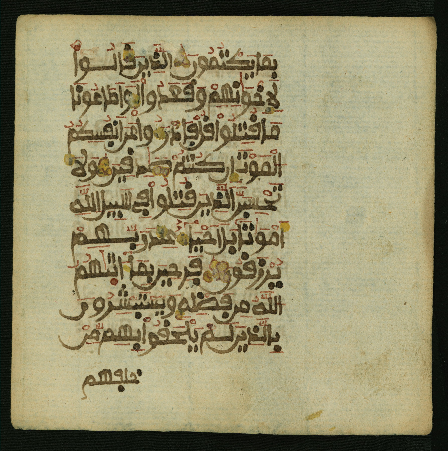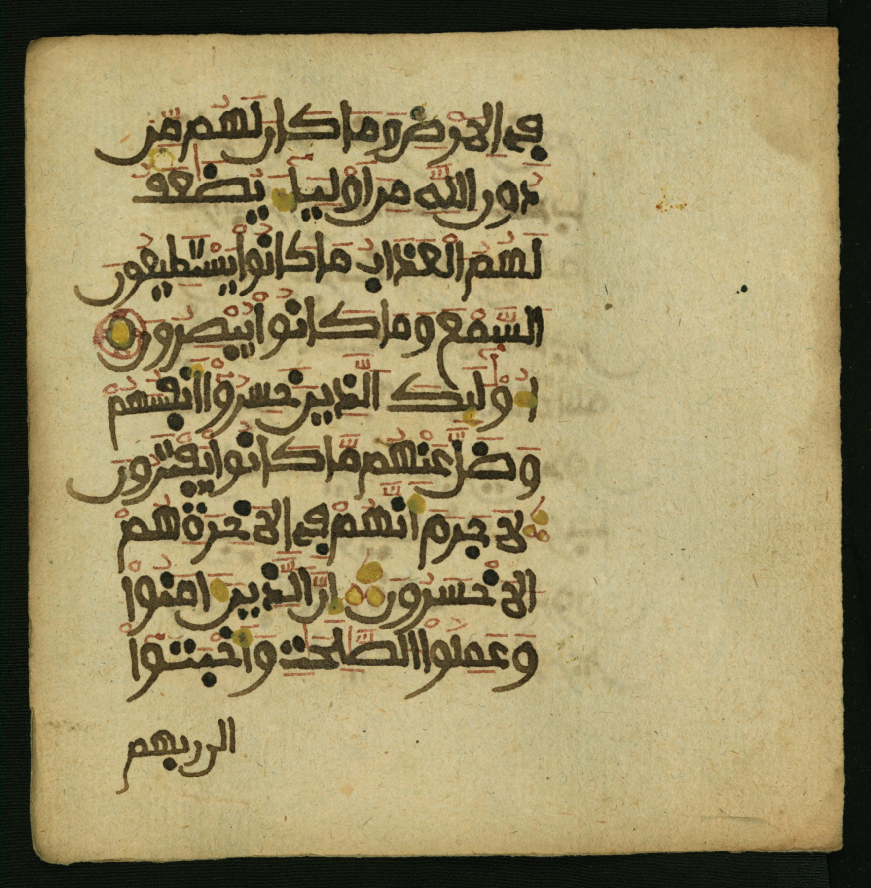 This square-format manuscript is volume 1, containing chapters 1-18 (Sūrat al-fātiḥah through Sūrat al-kahf), of an illuminated two-volume Qur'an produced in Sub-Saharan (West) Africa in the thirteenth century AH / nineteenth CE. The text is written in Sūdānī script in dark brown ink with vocalization in red on loose leaves. Chapter headings are in reddish-brown ink. Three yellow dots outlined in red arranged in a triangular form separate verses. Polychrome circular medallions as well as square and rectangular devices in a variety of patterns and colors mark textual divisions. The leaves of the text are organized between two decorated boards with geometric compositions. The pages and boards are housed in a leather pouch (satchel).