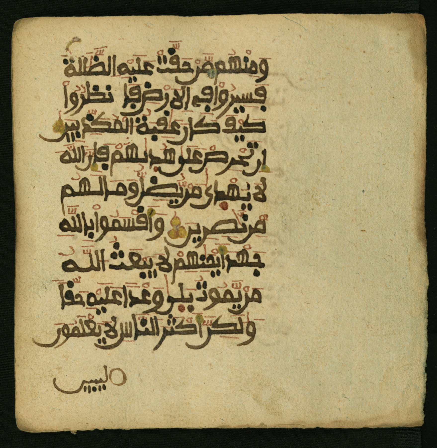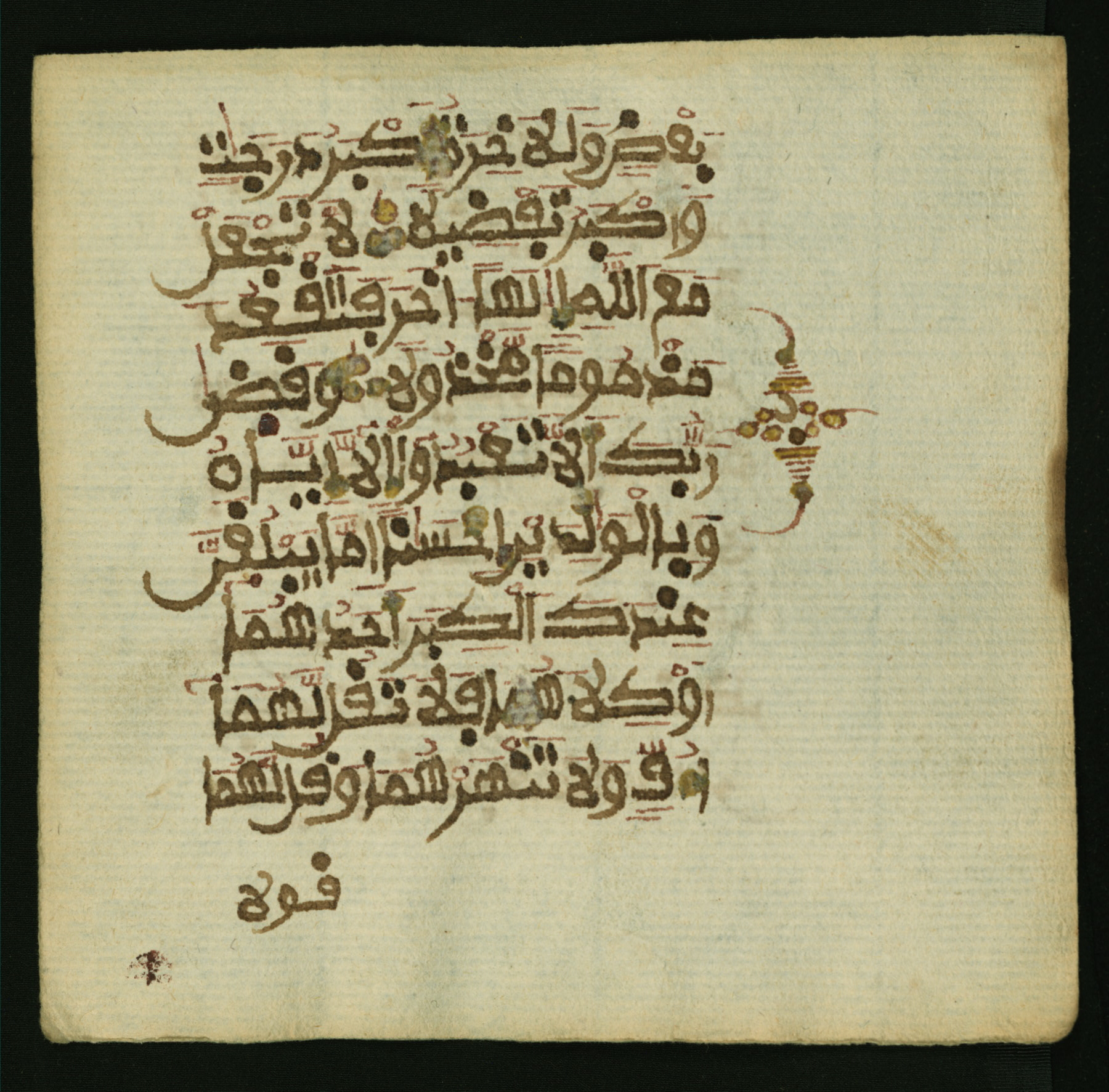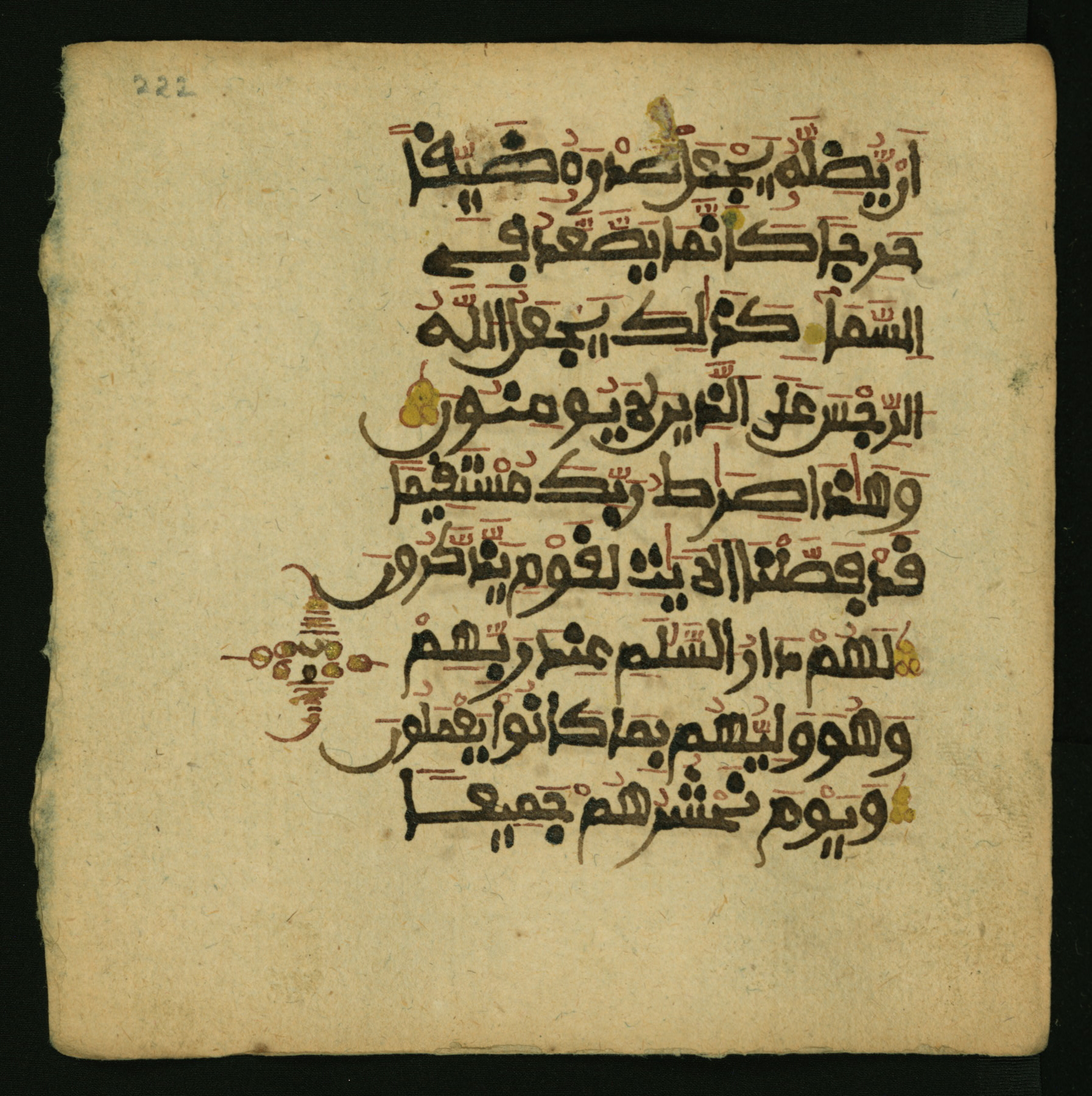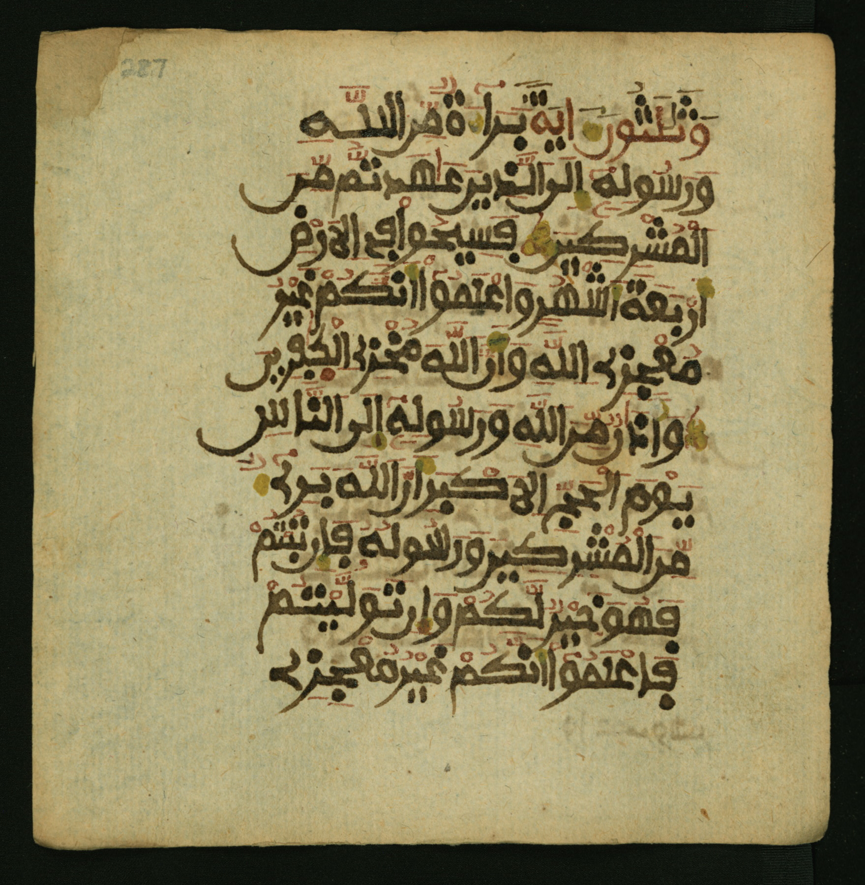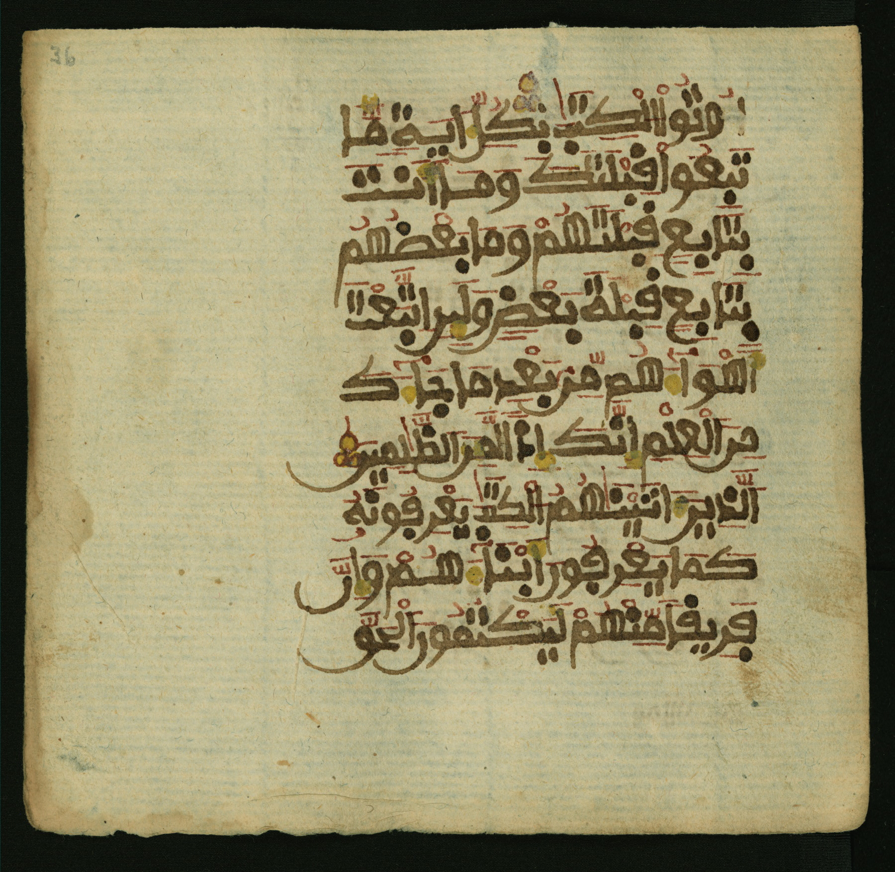 This square-format manuscript is volume 1, containing chapters 1-18 (Sūrat al-fātiḥah through Sūrat al-kahf), of an illuminated two-volume Qur'an produced in Sub-Saharan (West) Africa in the thirteenth century AH / nineteenth CE. The text is written in Sūdānī script in dark brown ink with vocalization in red on loose leaves. Chapter headings are in reddish-brown ink. Three yellow dots outlined in red arranged in a triangular form separate verses. Polychrome circular medallions as well as square and rectangular devices in a variety of patterns and colors mark textual divisions. The leaves of the text are organized between two decorated boards with geometric compositions. The pages and boards are housed in a leather pouch (satchel).